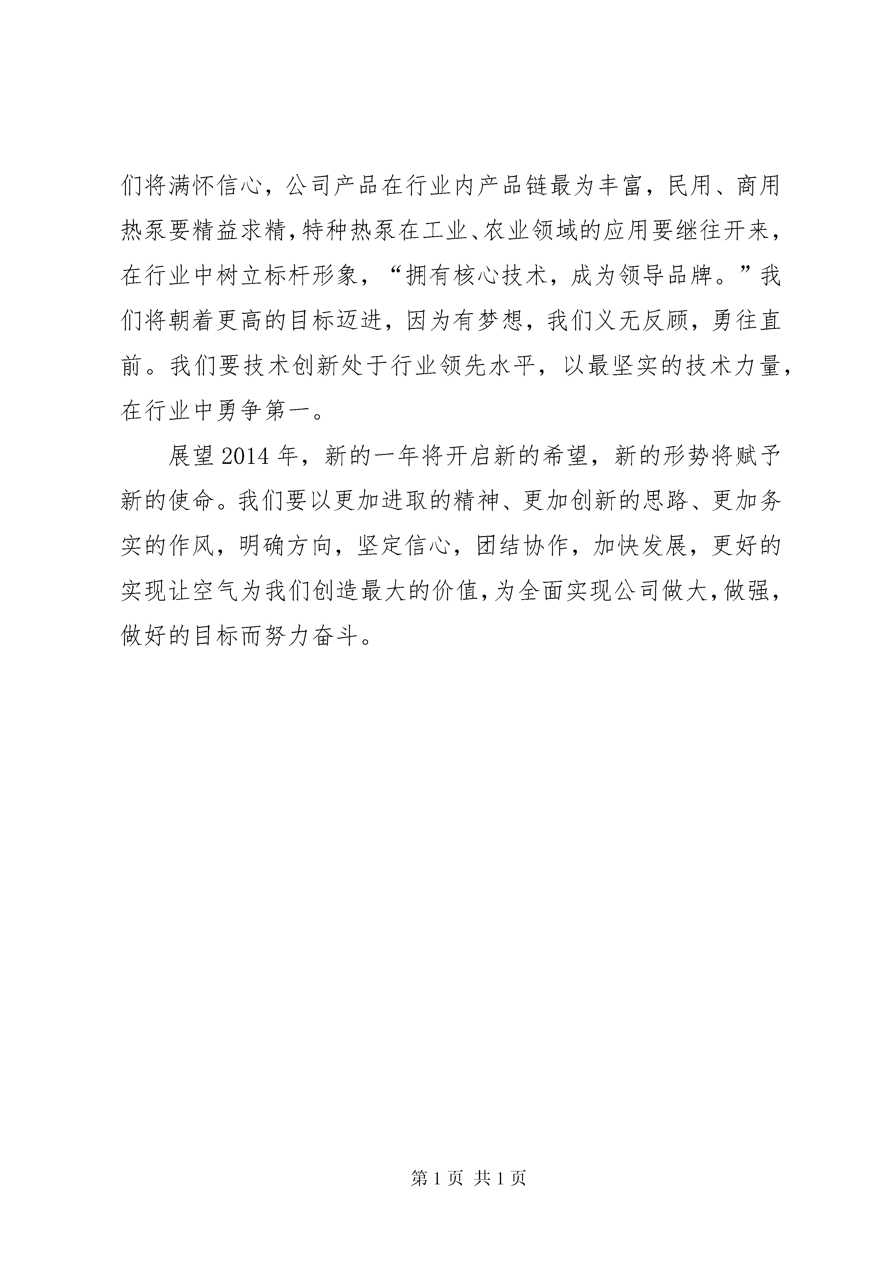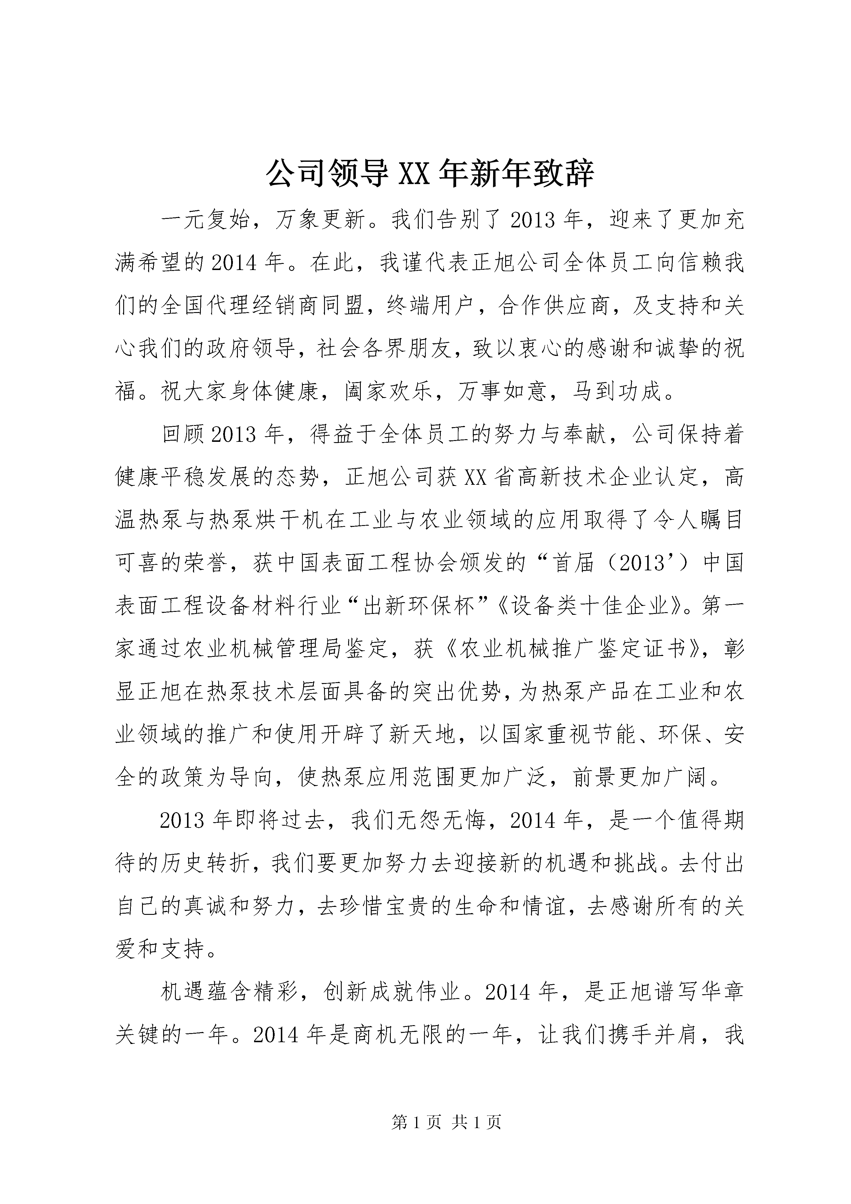 公司领导XX年新年致辞一元复始,万象更新。我们告别了2013年,迎来了更加充满希望的2014年。在此,我谨代表正旭公司全体员工向信赖我们的全国代理经销商同盟,终端用户,合作供应商,及支持和关心我们的政府领导,社会各界朋友,致以衷心的感谢和诚挚的祝福。祝大家身体健康,阖家欢乐,万事如意,马到功成。回顾2013年,得益于全体员工的努力与奉献,公司保持着健康平稳发展的态势,正旭公司获XX省高新技术企业认定,高温热泵与热泵烘干机在工业与农业领域的应用取得了令人瞩目可喜的荣誉,获中国表面工程协会颁发的“首届(2013’)中国表面工程设备材料行业“出新环保杯”《设备类十佳企业》。第一家通过农业机械管理局鉴定,获《农业机械推广鉴定证书》,彰显正旭在热泵技术层面具备的突出优势,为热泵产品在工业和农业领域的推广和使用开辟了新天地,以国家重视节能、环保、安全的政策为导向,使热泵应用范围更加广泛,前景更加广阔。2013年即将过去,我们无怨无悔,2014年,是一个值得期待的历史转折,我们要更加努力去迎接新的机遇和挑战。去付出自己的真诚和努力,去珍惜宝贵的生命和情谊,去感谢所有的关爱和支持。机遇蕴含精彩,创新成就伟业。2014年,是正旭谱写华章关键的一年。2014年是商机无限的一年,让我们携手并肩,我们将满怀信心,公司产品在行业内产品链最为丰富,民用、商用热泵要精益求精,特种热泵在工业、农业领域的应用要继往开来,在行业中树立标杆形象,“拥有核心技术,成为领导品牌。”我们将朝着更高的目标迈进,因为有梦想,我们义无反顾,勇往直前。我们要技术创新处于行业领先水平,以最坚实的技术力量,在行业中勇争第一。展望2014年,新的一年将开启新的希望,新的形势将赋予新的使命。我们要以更加进取的精神、更加创新的思路、更加务实的作风,明确方向,坚定信心,团结协作,加快发展,更好的实现让空气为我们创造最大的价值,为全面实现公司做大,做强,做好的目标而努力奋斗。