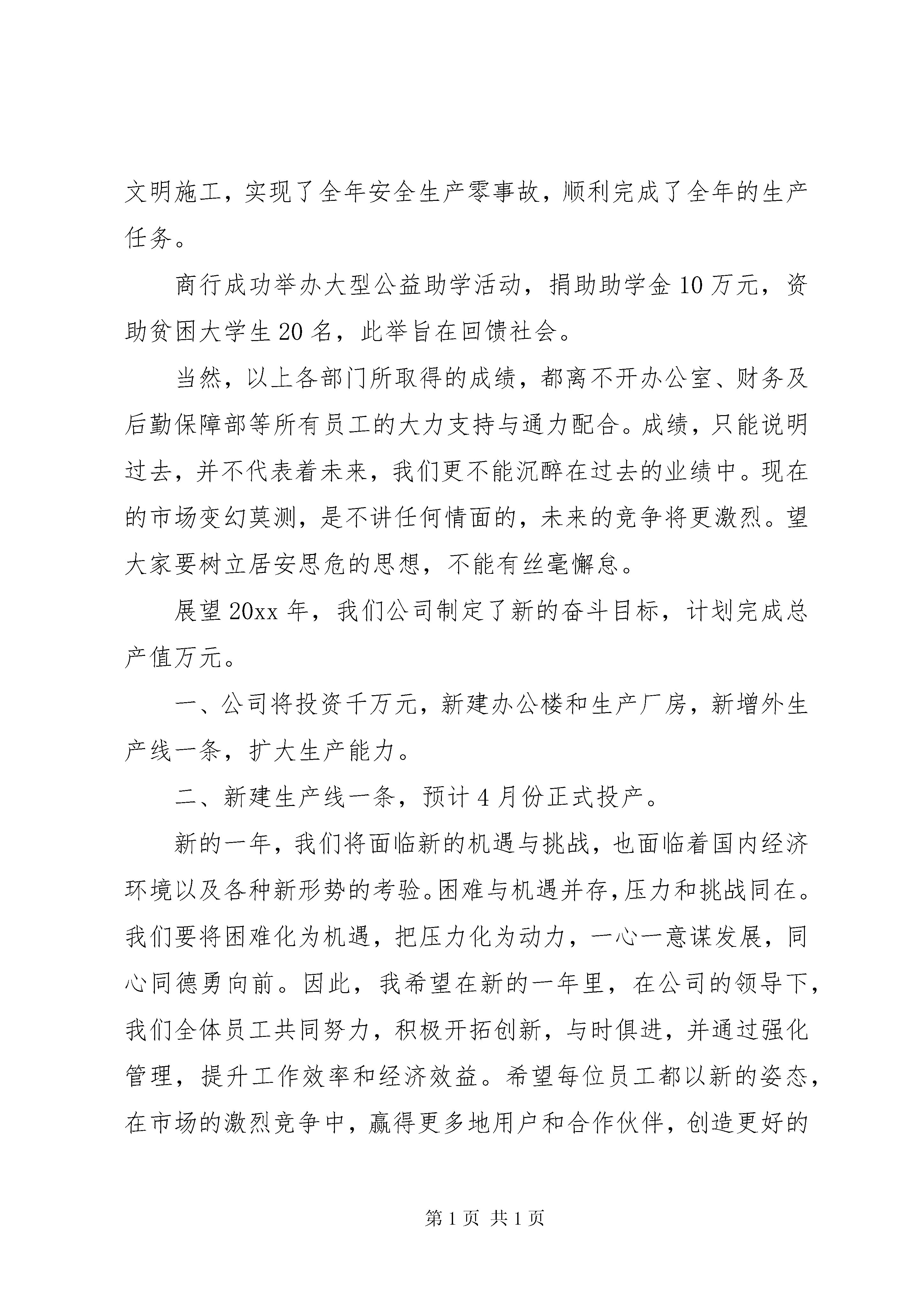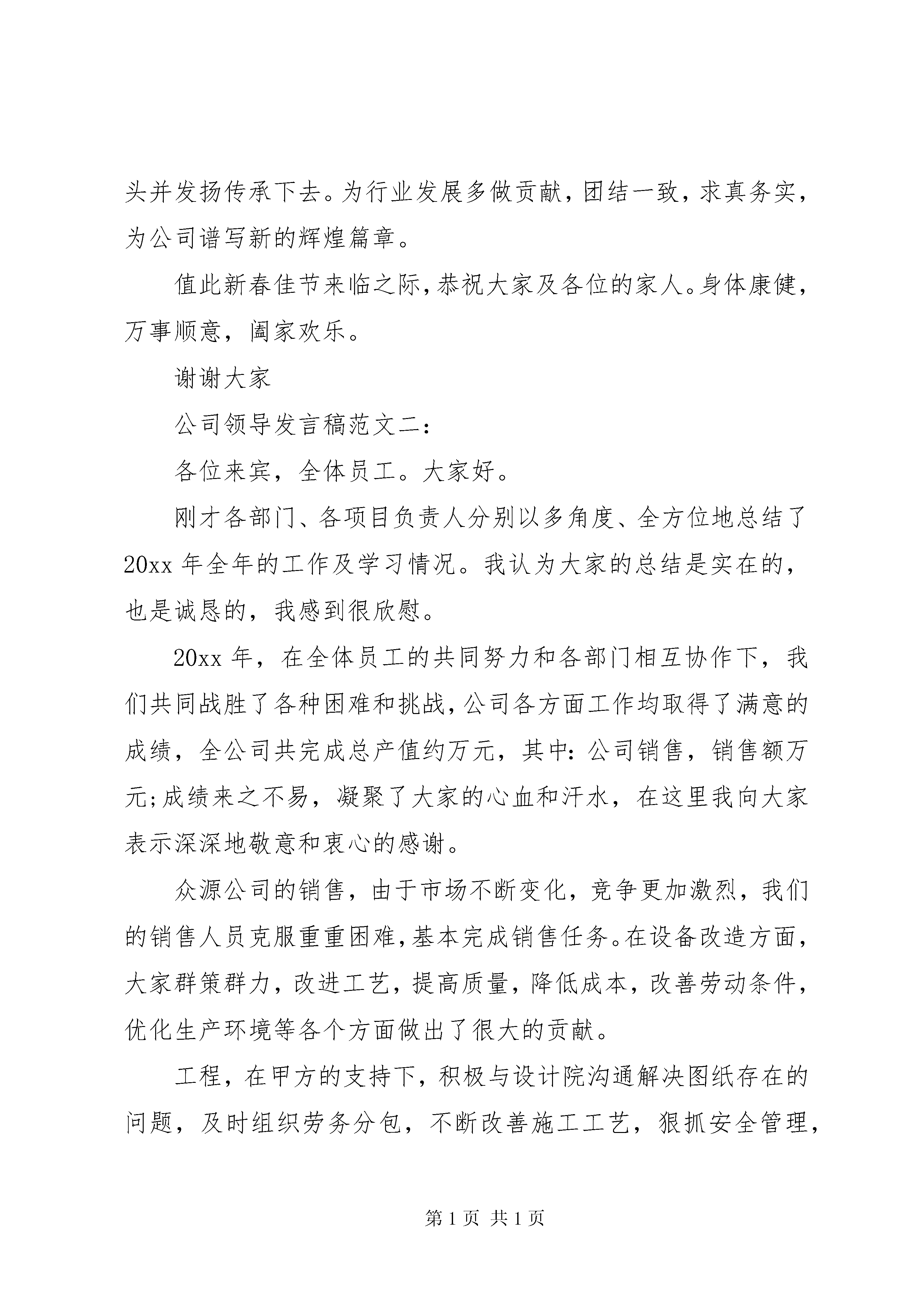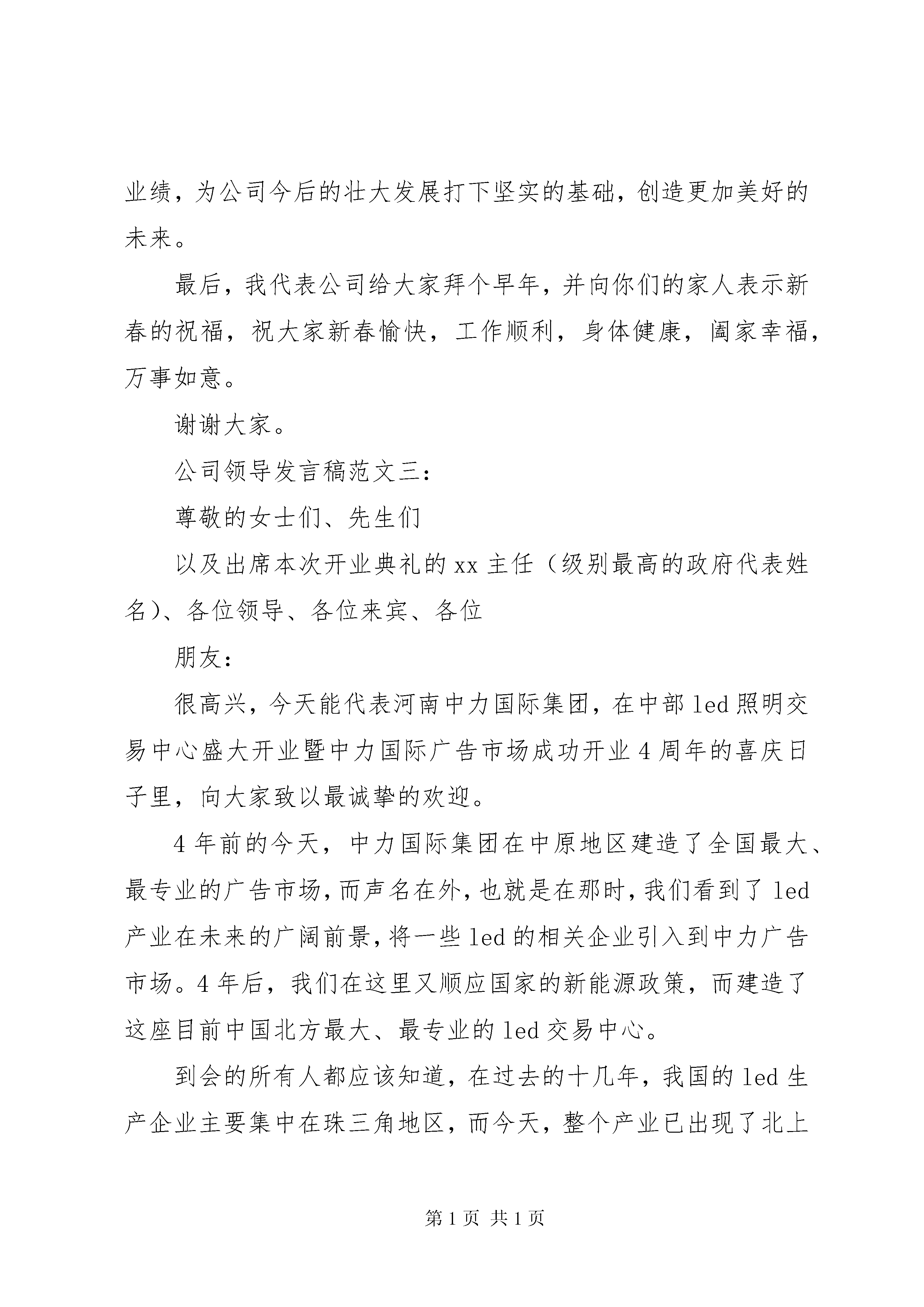 公司领导发言稿范文3篇作为公司的领导为本次的会议作发言致辞,本文是公司领导的发言稿范文,仅供参考。公司领导发言稿范文一:各位领导、同志们:今天,我们欢聚一堂,共庆新年,召开了xxxx公司xxxx年度总结暨表彰大会。在此,我代表公司领导班子向百忙之中出席会议的上级司领导、各位来宾、及员工同志们致以最诚挚的问候和最衷心的感谢。在过去的xxxx年,公司持续稳定发展,发展后劲不断增强,企业物质文明和精神文明建设在和谐稳定中不断取得新成就,各项工作都呈现出良好的发展态势,可以说,一年来,我们付出了心血和汗水,也收获了丰硕的成果,全年总收入突破xxxx万元。所有成绩的取得,是我们大家齐心协力,团结务实的结果。在这里,我们更要感谢上级公司领导和广大业主对xxxx公司工作的关心和支持,使我们企业在发展过程中少走弯路,不走弯路,让我们牢记肩负的企业使命和社会责任,脚踏实地、诚信服务,从而取得长足的进步和稳健的发展。展望xxxx,我们信心满怀、激情澎湃,勇敢迎接新的机遇和挑战。希望我们所有员工在今后的工作当中,继续保持良好势头并发扬传承下去。为行业发展多做贡献,团结一致,求真务实,为公司谱写新的辉煌篇章。值此新春佳节来临之际,恭祝大家及各位的家人。身体康健,万事顺意,阖家欢乐。谢谢大家公司领导发言稿范文二:各位来宾,全体员工。大家好。刚才各部门、各项目负责人分别以多角度、全方位地总结了20xx年全年的工作及学习情况。我认为大家的总结是实在的,也是诚恳的,我感到很欣慰。20xx年,在全体员工的共同努力和各部门相互协作下,我们共同战胜了各种困难和挑战,公司各方面工作均取得了满意的成绩,全公司共完成总产值约万元,其中:公司销售,销售额万元;成绩来之不易,凝聚了大家的心血和汗水,在这里我向大家表示深深地敬意和衷心的感谢。众源公司的销售,由于市场不断变化,竞争更加激烈,我们的销售人员克服重重困难,基本完成销售任务。在设备改造方面,大家群策群力,改进工艺,提高质量,降低成本,改善劳动条件,优化生产环境等各个方面做出了很大的贡献。工程,在甲方的支持下,积极与设计院沟通解决图纸存在的问题,及时组织劳务分包,不断改善施工工艺,狠抓安全管理,文明施工,实现了全年安全生产零事故,顺利完成了全年的生产任务。商行成功举办大型公益助学活动,捐助助学金10万元,资助贫困大学生20名,此举旨在回馈社会。当然,以上各部门所取得的成绩,都离不开办公室、财务及后勤保障部等所有员工的大力支持与通力配合。成绩,只能说明过去,并不代表着未来,我们更不能沉醉在过去的业绩中。现在的市场变幻莫测,是不讲任何情面的,未来的竞争将更激烈。望大家要树立居安思危的思想,不能有丝毫懈怠。展望20xx年,我们公司制定了新的奋斗目标,计划完成总产值万元。一、公司将投资千万元,新建办公楼和生产厂房,新增外生产线一条,扩大生产能力。二、新建生产线一条,预计4月份正式投产。新的一年,我们将面临新的机遇与挑战,也面临着国内经济环境以及各种新形势的考验。困难与机遇并存,压力和挑战同在。我们要将困难化为机遇,把压力化为动力,一心一意谋发展,同心同德勇向前。因此,我希望在新的一年里,在公司的领导下,我们全体员工共同努力,积极开拓创新,与时俱进,并通过强化管理,提升工作效率和经济效益。希望每位员工都以新的姿态,在市场的激烈竞争中,赢得更多地用户和合作伙伴,创造更好的业绩,为公司今后的壮大发展打下坚实的基础,创造更加美好的未来。最后,我代表公司给大家拜个早年,并向你们的家人表示新春的祝福,祝大家新春愉快,工作顺利,身体健康,阖家幸福,万事如意。谢谢大家。公司领导发言稿范文三:尊敬的女士们、先生们以及出席本次开业典礼的xx主任(级别最高的政府代表姓名)、各位领导、各位来宾、各位朋友:很高兴,今天能代表河南中力国际集团,在中部led照明交易中心盛大开业暨中力国际广告市场成功开业4周年的喜庆日子里,向大家致以最诚挚的欢迎。4年前的今天,中力国际集团在中原地区建造了全国最大、最专业的广告市场,而声名在外,也就是在那时,我们看到了led产业在未来的广阔前景,将一些led的相关企业引入到中力广告市场。4年后,我们在这里又顺应国家的新能源政策,而建造了这座目前中国北方最大、最专业的led交易中心。到会的所有人都应该知道,在过去的十几年,我国的led生产企业主要集中在珠三角地区,而今天,整个产业已出现了北上西进的新格局,产业版图在不断发展、调整。为此,我们中力国际集团为了响应省委、省政府构建中原经济区的战略规划,贯彻与执行国家十城万盏的节能减排的文件精神,推动并优化我省led产业步入健康、快速地发展,提升我省、市led产业的创新能力和核心竞争力,整合产业资源并拉动我省与外省的产业技术交流及供销需求、填补北方地区无产业