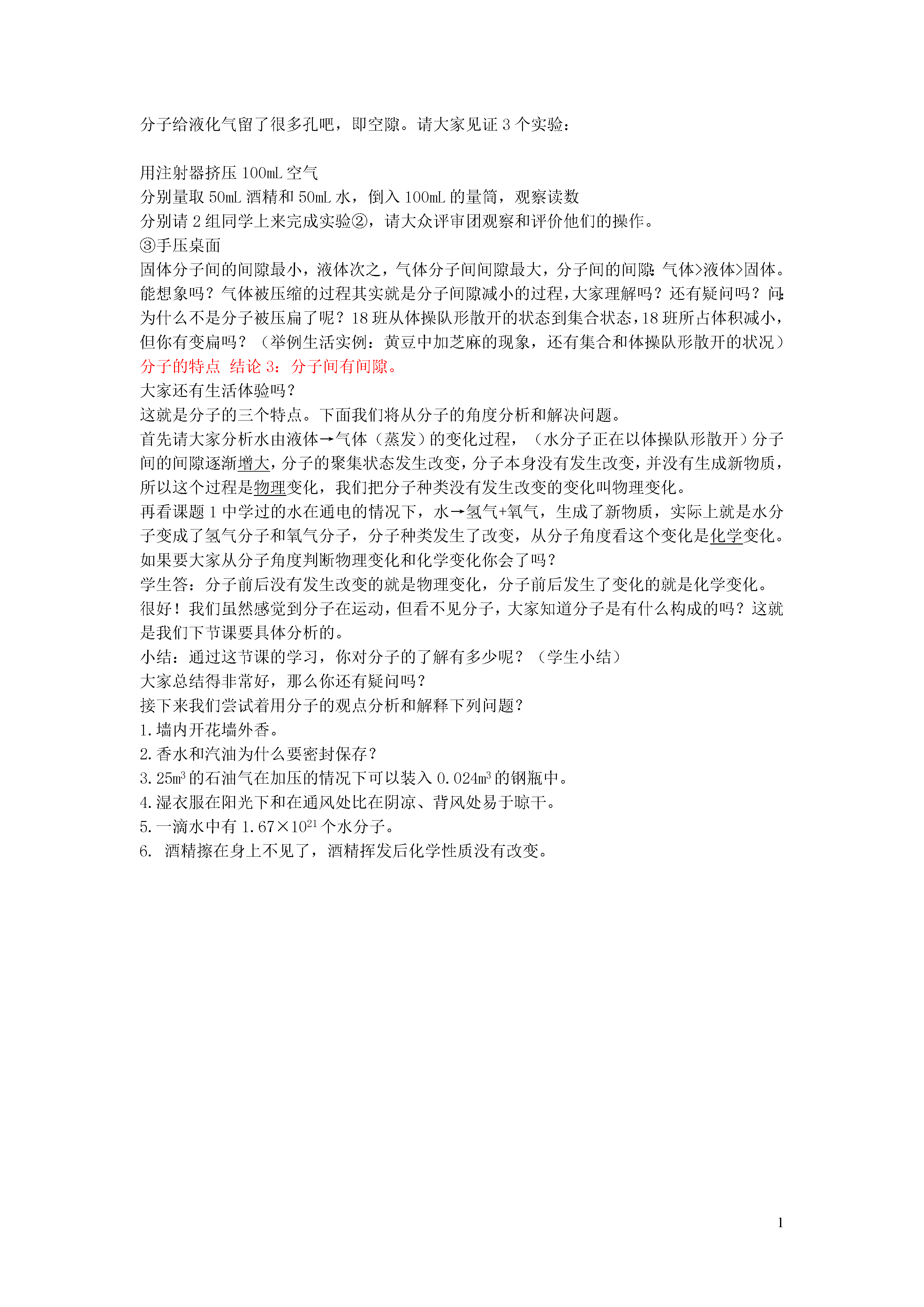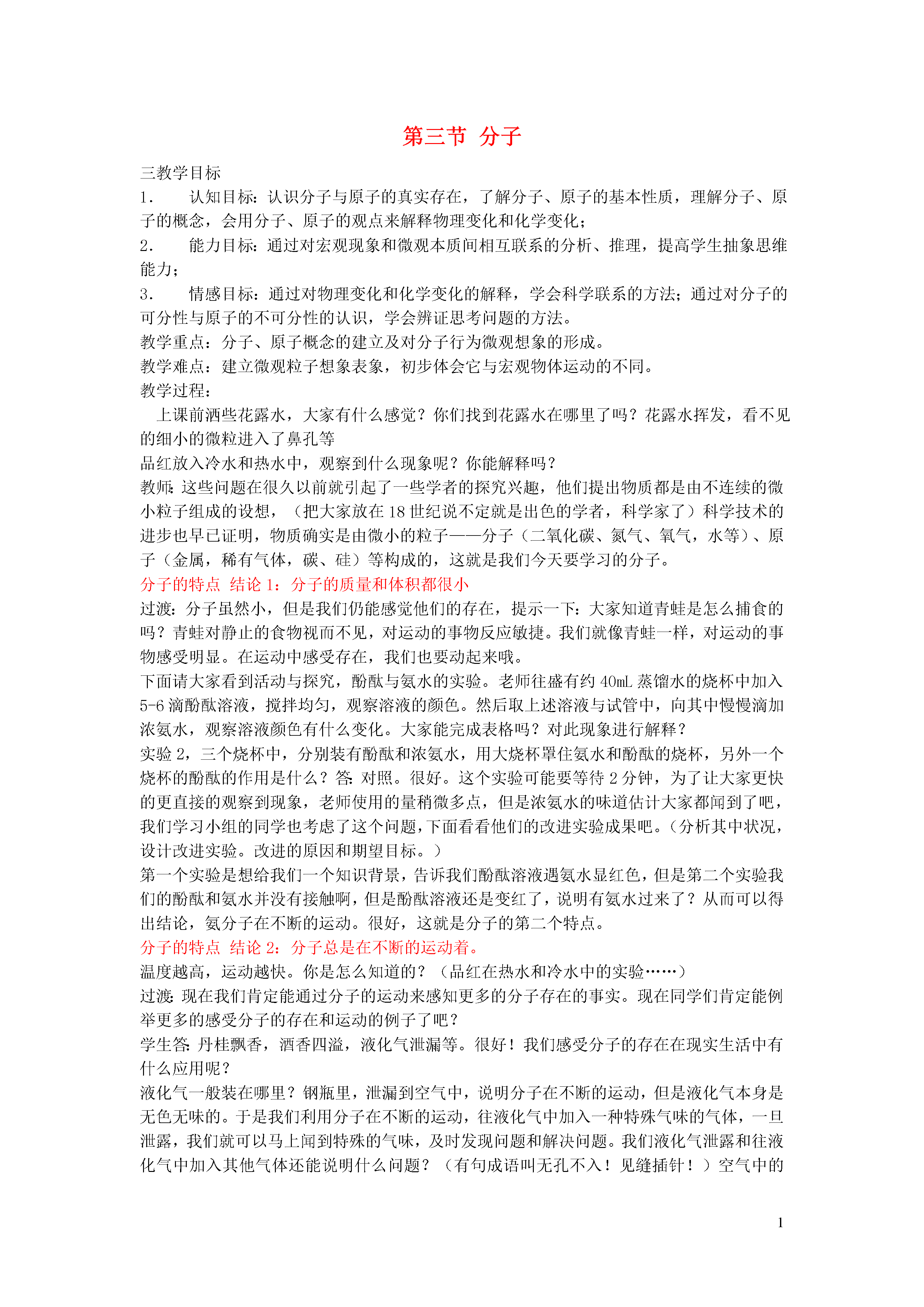 1第三节分子三教学目标1.认知目标:认识分子与原子的真实存在,了解分子、原子的基本性质,理解分子、原子的概念,会用分子、原子的观点来解释物理变化和化学变化;2.能力目标:通过对宏观现象和微观本质间相互联系的分析、推理,提高学生抽象思维能力;3.情感目标:通过对物理变化和化学变化的解释,学会科学联系的方法;通过对分子的可分性与原子的不可分性的认识,学会辨证思考问题的方法。教学重点:分子、原子概念的建立及对分子行为微观想象的形成。教学难点:建立微观粒子想象表象,初步体会它与宏观物体运动的不同。教学过程:上课前洒些花露水,大家有什么感觉?你们找到花露水在哪里了吗?花露水挥发,看不见的细小的微粒进入了鼻孔等品红放入冷水和热水中,观察到什么现象呢?你能解释吗?教师:这些问题在很久以前就引起了一些学者的探究兴趣,他们提出物质都是由不连续的微小粒子组成的设想,(把大家放在18世纪说不定就是出色的学者,科学家了)科学技术的进步也早已证明,物质确实是由微小的粒子——分子(二氧化碳、氮气、氧气,水等)、原子(金属,稀有气体,碳、硅)等构成的,这就是我们今天要学习的分子。分子的特点结论1:分子的质量和体积都很小过渡:分子虽然小,但是我们仍能感觉他们的存在,提示一下:大家知道青蛙是怎么捕食的吗?青蛙对静止的食物视而不见,对运动的事物反应敏捷。我们就像青蛙一样,对运动的事物感受明显。在运动中感受存在,我们也要动起来哦。下面请大家看到活动与探究,酚酞与氨水的实验。老师往盛有约40mL蒸馏水的烧杯中加入5-6滴酚酞溶液,搅拌均匀,观察溶液的颜色。然后取上述溶液与试管中,向其中慢慢滴加浓氨水,观察溶液颜色有什么变化。大家能完成表格吗?对此现象进行解释?实验2,三个烧杯中,分别装有酚酞和浓氨水,用大烧杯罩住氨水和酚酞的烧杯,另外一个烧杯的酚酞的作用是什么?答:对照。很好。这个实验可能要等待2分钟,为了让大家更快的更直接的观察到现象,老师使用的量稍微多点,但是浓氨水的味道估计大家都闻到了吧,我们学习小组的同学也考虑了这个问题,下面看看他们的改进实验成果吧。(分析其中状况,设计改进实验。改进的原因和期望目标。)第一个实验是想给我们一个知识背景,告诉我们酚酞溶液遇氨水显红色,但是第二个实验我们的酚酞和氨水并没有接触啊,但是酚酞溶液还是变红了,说明有氨水过来了?从而可以得出结论,氨分子在不断的运动。很好,这就是分子的第二个特点。分子的特点结论2:分子总是在不断的运动着。温度越高,运动越快。你是怎么知道的?(品红在热水和冷水中的实验……)过渡:现在我们肯定能通过分子的运动来感知更多的分子存在的事实。现在同学们肯定能例举更多的感受分子的存在和运动的例子了吧?学生答:丹桂飘香,酒香四溢,液化气泄漏等。很好!我们感受分子的存在在现实生活中有什么应用呢?液化气一般装在哪里?钢瓶里,泄漏到空气中,说明分子在不断的运动,但是液化气本身是无色无味的。于是我们利用分子在不断的运动,往液化气中加入一种特殊气味的气体,一旦泄露,我们就可以马上闻到特殊的气味,及时发现问题和解决问题。我们液化气泄露和往液化气中加入其他气体还能说明什么问题?(有句成语叫无孔不入!见缝插针!)空气中的分子给液化气留了很多孔吧,即空隙。请大家见证3个实验:用注射器挤压100mL空气分别量取50mL酒精和50mL水,倒入100mL的量筒,观察读数分别请2组同学上来完成实验②,请大众评审团观察和评价他们的操作。③手压桌面固体分子间的间隙最小,液体次之,气体分子间间隙最大,分子间的间隙:气体>液体>固体。能想象吗?气体被压缩的过程其实就是分子间隙减小的过程,大家理解吗?还有疑问吗?问:为什么不是分子被压扁了呢?18班从体操队形散开的状态到集合状态,18班所占体积减小,但你有变扁吗?(举例生活实例:黄豆中加芝麻的现象,还有集合和体操队形散开的状况)分子的特点结论3:分子间有间隙。大家还有生活体验吗?这就是分子的三个特点。下面我们将从分子的角度分析和解决问题。首先请大家分析水由液体→气体(蒸发)的变化过程,(水分子正在以体操队形散开)分子间的间隙逐渐增大,分子的聚集状态发生改变,分子本身没有发生改变,并没有生成新物质,所以这个过程是物理变化,我们把分子种类没有发生改变的变化叫物理变化。再看课题1中学过的水在通电的情况下,水→氢气+氧气,生成了新物质,实际上就是水分子变成了氢气分子和氧气分子,分子种类发生了改变,从分子角度看这个变化是化学变化。如果要大家从分子角度判断物理变化和化学变化你会了吗?学生答:分子前后没有发生改变的就是物理变化,分子前后发生了变化的就是化学变化。很好!我们虽然感觉到分子在运动,但看不见分子,大家知道分子是有什么构