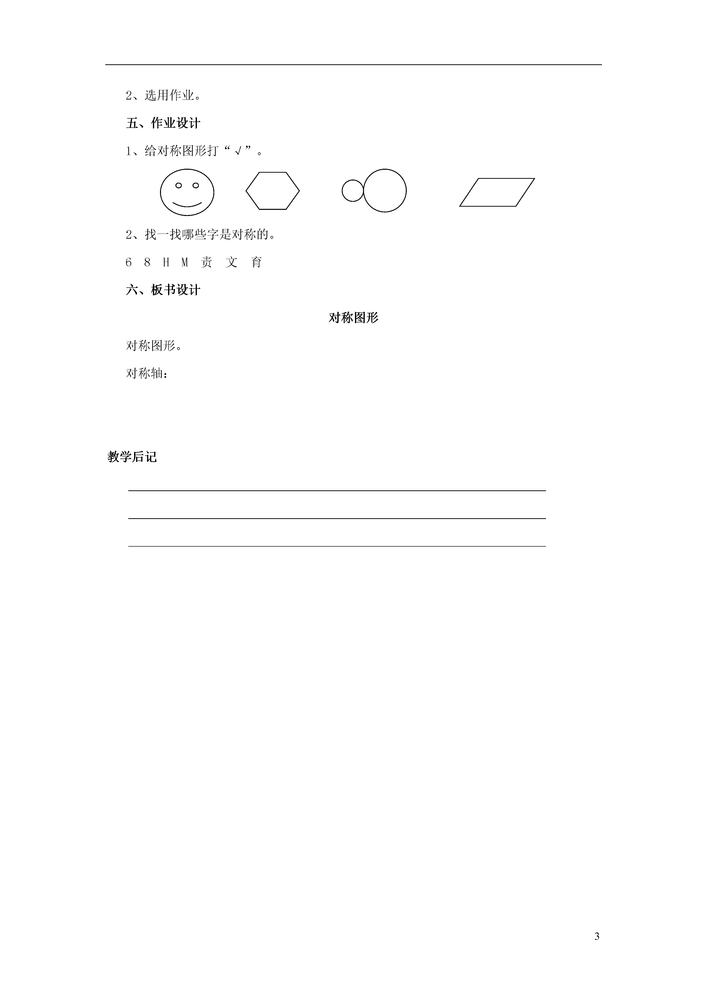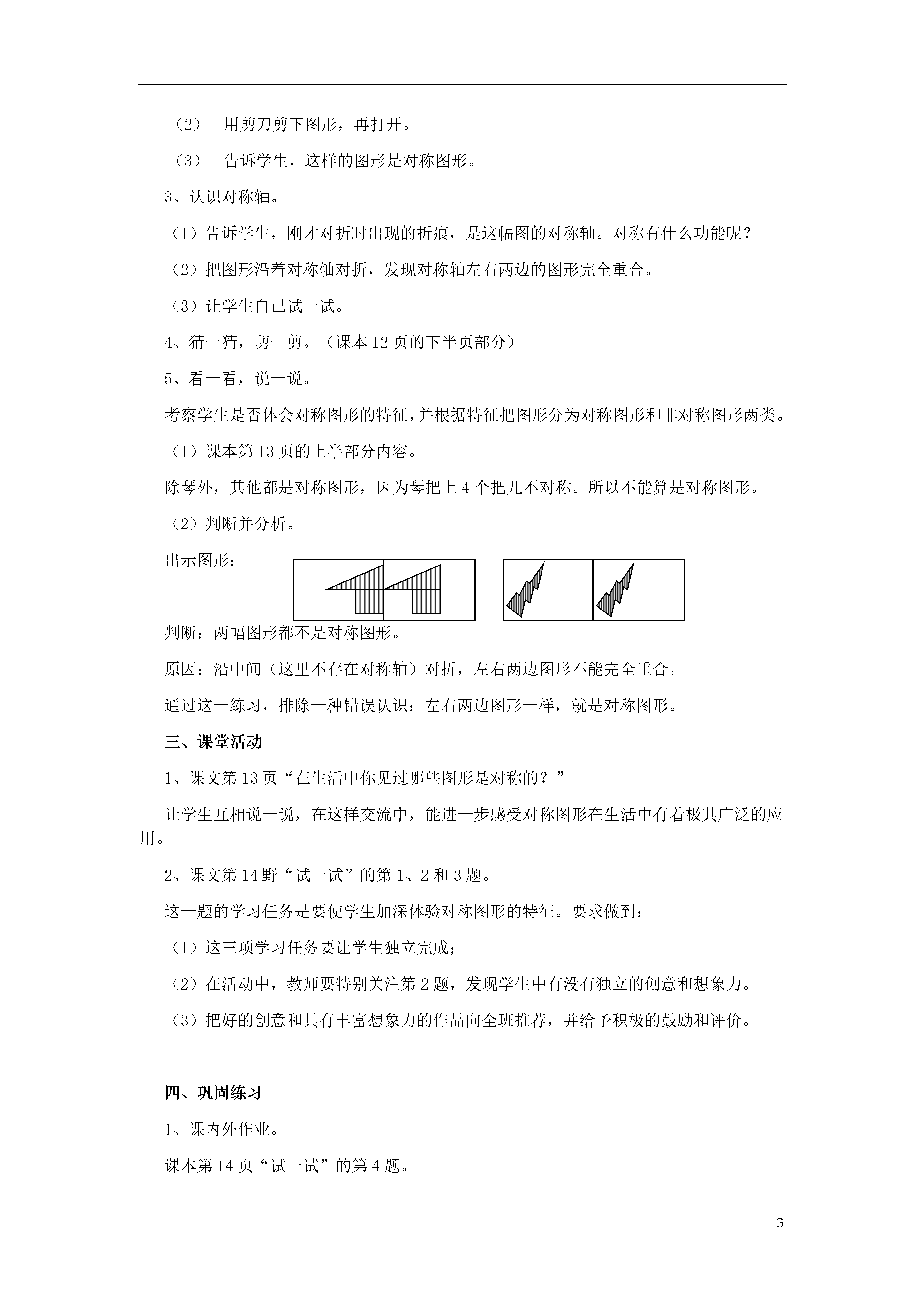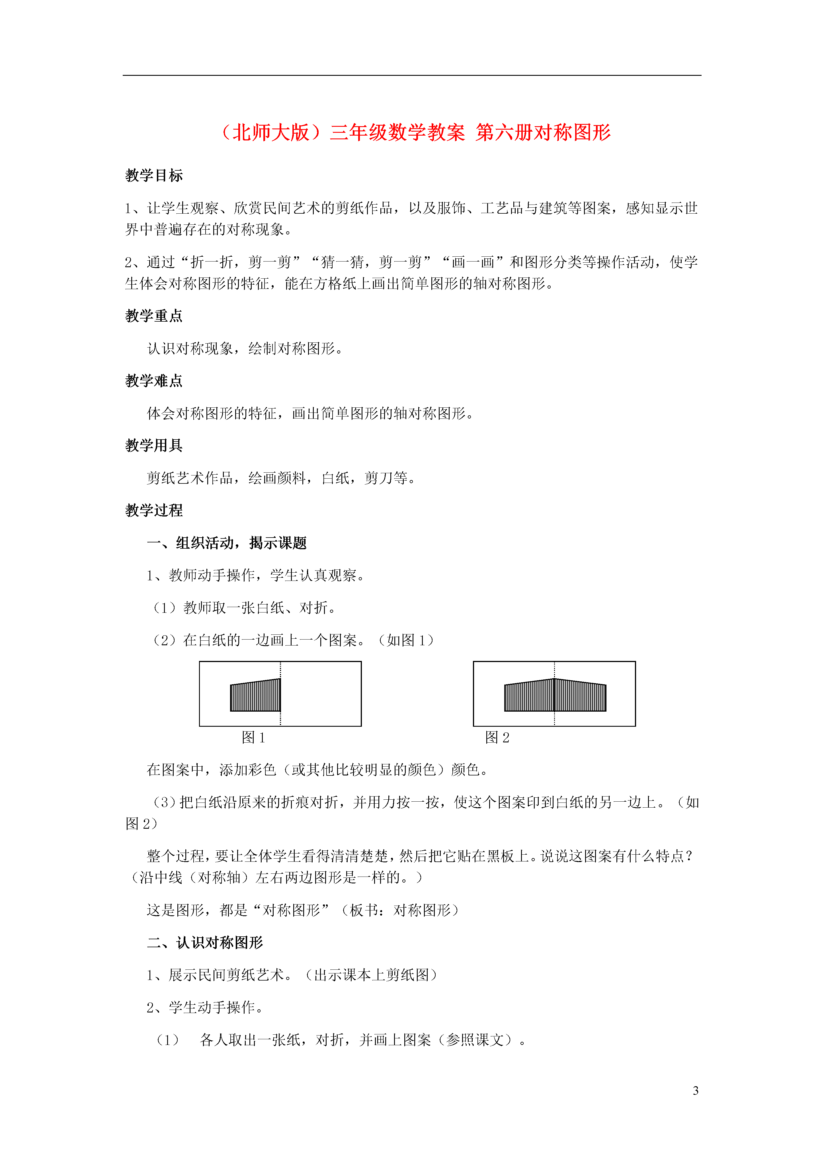 3(北师大版)三年级数学教案第六册对称图形教学目标1、让学生观察、欣赏民间艺术的剪纸作品,以及服饰、工艺品与建筑等图案,感知显示世界中普遍存在的对称现象。2、通过“折一折,剪一剪”“猜一猜,剪一剪”“画一画”和图形分类等操作活动,使学生体会对称图形的特征,能在方格纸上画出简单图形的轴对称图形。教学重点认识对称现象,绘制对称图形。教学难点体会对称图形的特征,画出简单图形的轴对称图形。教学用具剪纸艺术作品,绘画颜料,白纸,剪刀等。教学过程一、组织活动,揭示课题1、教师动手操作,学生认真观察。(1)教师取一张白纸、对折。(2)在白纸的一边画上一个图案。(如图1)图1图2在图案中,添加彩色(或其他比较明显的颜色)颜色。(3)把白纸沿原来的折痕对折,并用力按一按,使这个图案印到白纸的另一边上。(如图2)整个过程,要让全体学生看得清清楚楚,然后把它贴在黑板上。说说这图案有什么特点?(沿中线(对称轴)左右两边图形是一样的。)这是图形,都是“对称图形”(板书:对称图形)二、认识对称图形1、展示民间剪纸艺术。(出示课本上剪纸图)2、学生动手操作。各人取出一张纸,对折,并画上图案(参照课文)。用剪刀剪下图形,再打开。告诉学生,这样的图形是对称图形。3、认识对称轴。(1)告诉学生,刚才对折时出现的折痕,是这幅图的对称轴。对称有什么功能呢?(2)把图形沿着对称轴对折,发现对称轴左右两边的图形完全重合。(3)让学生自己试一试。4、猜一猜,剪一剪。(课本12页的下半页部分)5、看一看,说一说。考察学生是否体会对称图形的特征,并根据特征把图形分为对称图形和非对称图形两类。(1)课本的上半部分内容。除琴外,其他都是对称图形,因为琴把上4个把儿不对称。所以不能算是对称图形。(2)判断并分析。出示图形:判断:两幅图形都不是对称图形。原因:沿中间(这里不存在对称轴)对折,左右两边图形不能完全重合。通过这一练习,排除一种错误认识:左右两边图形一样,就是对称图形。三、课堂活动1、课文“在生活中你见过哪些图形是对称的?”让学生互相说一说,在这样交流中,能进一步感受对称图形在生活中有着极其广泛的应用。2、课文第14野“试一试”的第1、2和3题。这一题的学习任务是要使学生加深体验对称图形的特征。要求做到:(1)这三项学习任务要让学生独立完成;(2)在活动中,教师要特别关注第2题,发现学生中有没有独立的创意和想象力。(3)把好的创意和具有丰富想象力的作品向全班推荐,并给予积极的鼓励和评价。四、巩固练习1、课内外作业。课本“试一试”的第4题。2、选用作业。五、作业设计1、给对称图形打“√”。2、找一找哪些字是对称的。68HM责文育六、板书设计对称图形对称图形。对称轴:教学后记