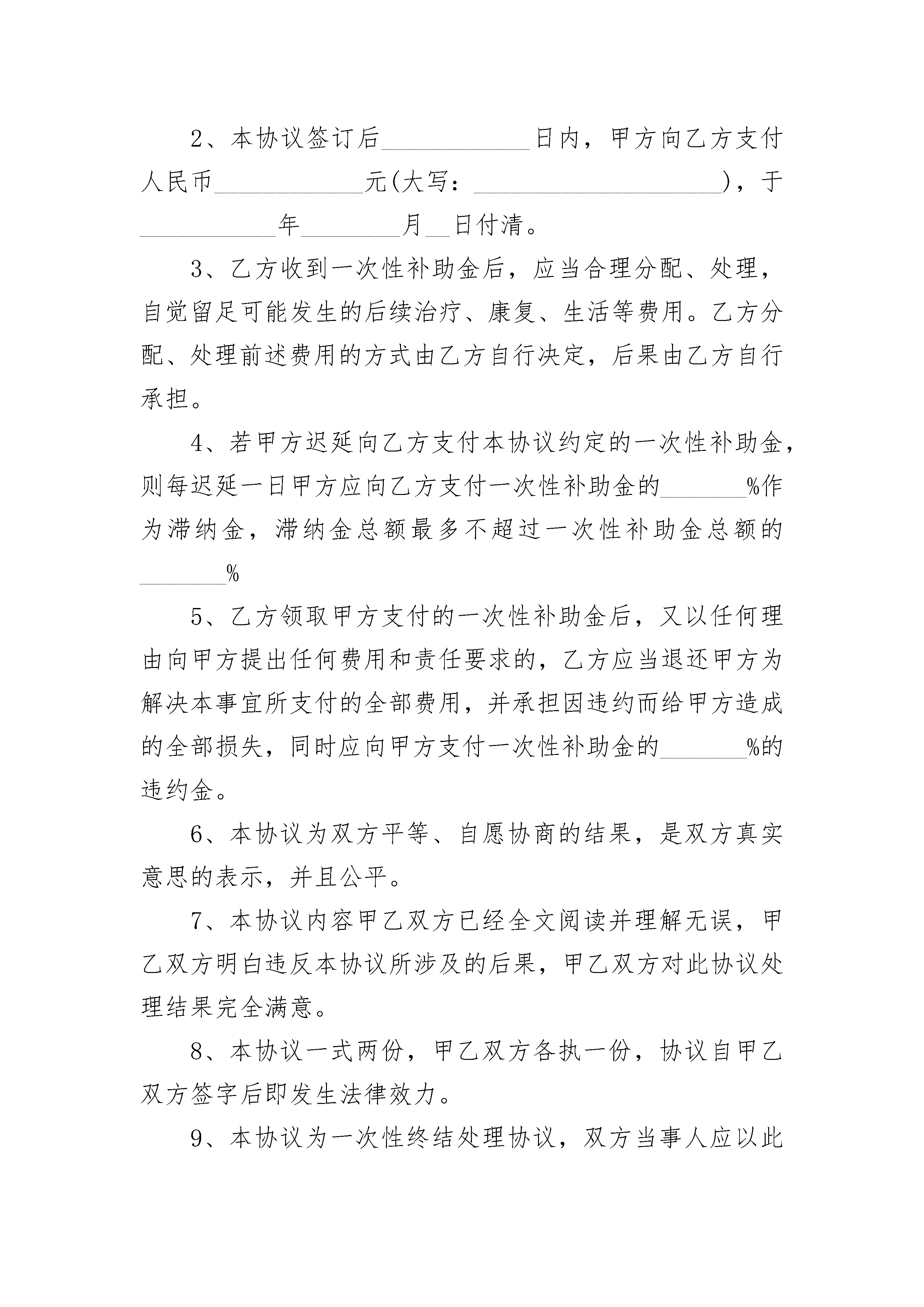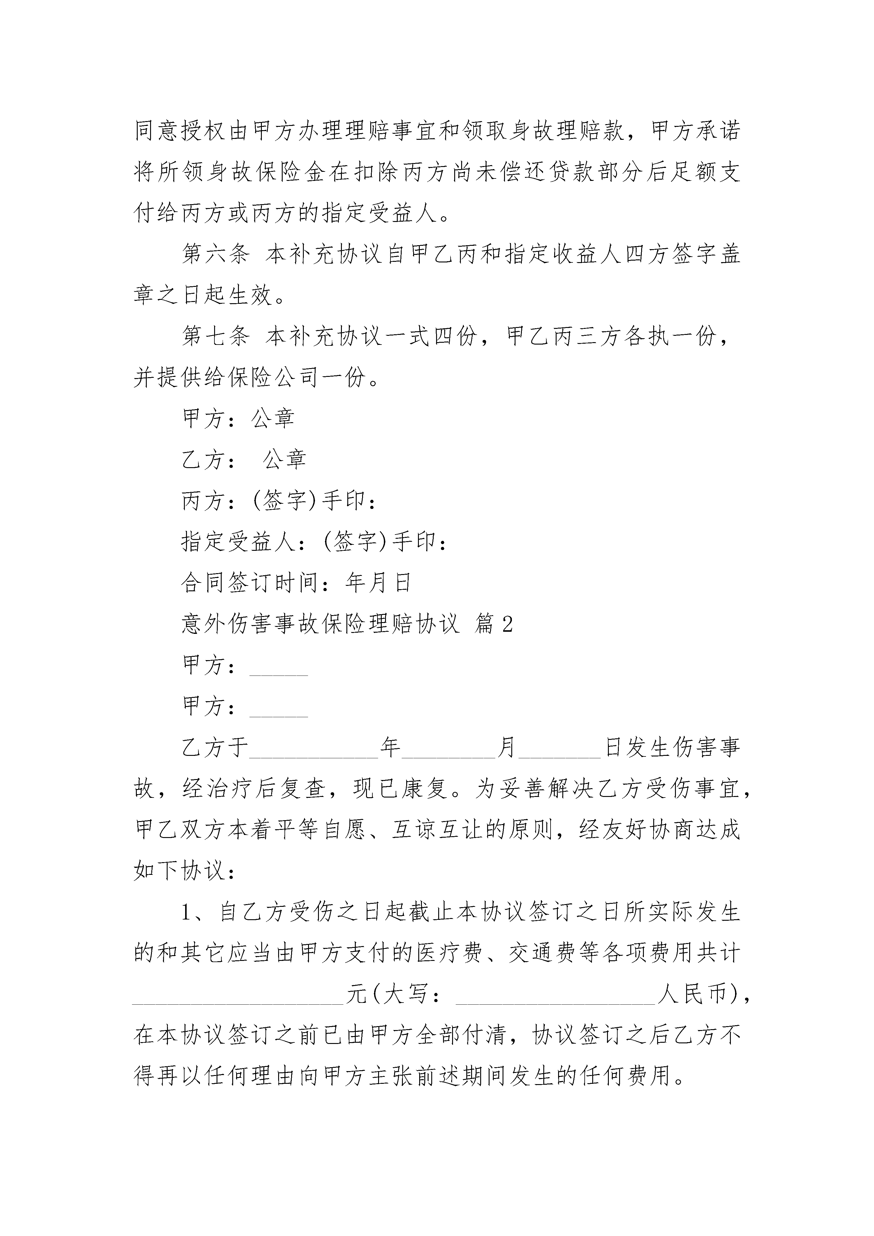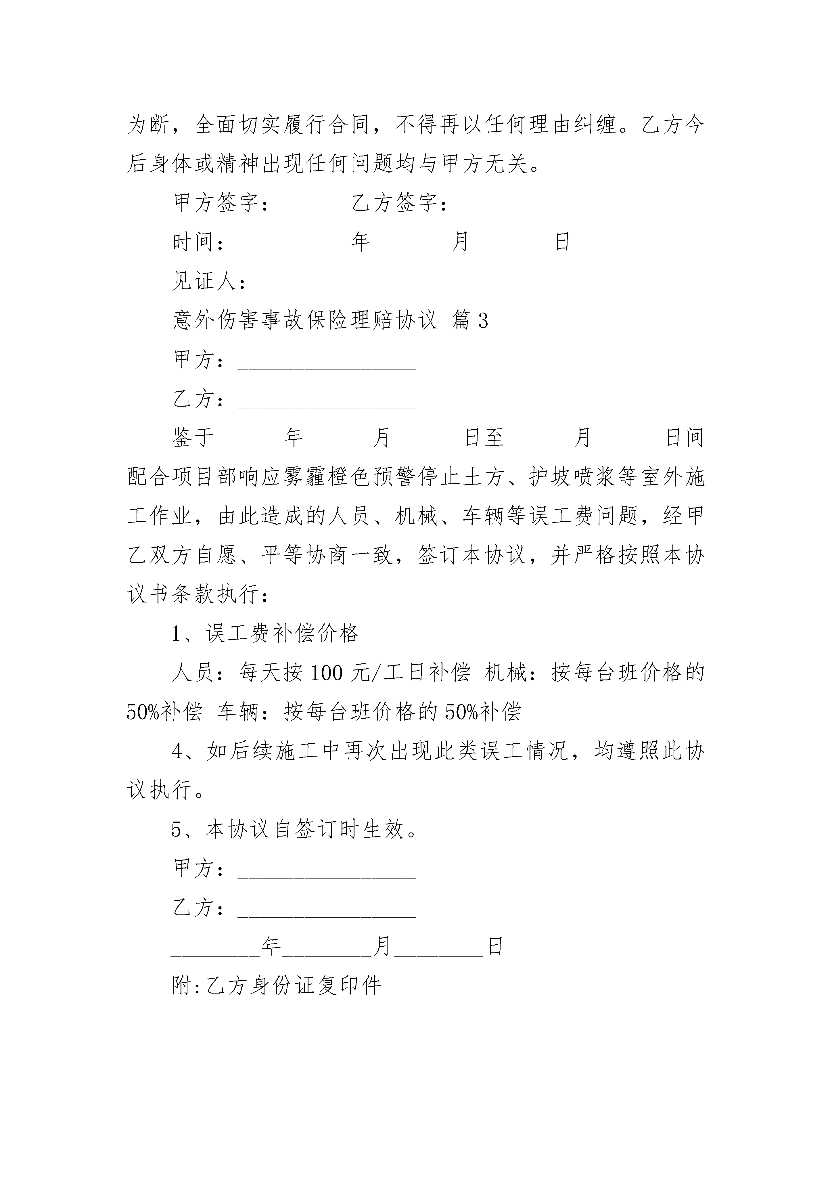意外伤害事故保险理赔协议意外伤害事故保险理赔协议(精选3篇)意外伤害事故保险理赔协议篇1甲方:乙方:丙方:为了保障丙方的意外伤害风险,减轻丙方因发生意外伤害事故无法还贷而造成的经济负担,甲方特为丙方办理了人身保险(以下简称“保险”),现就相关事项作如下约定:第一条本补充协议为丙方与甲方下属单位(乙方):签署(编号:)的补充协议。第二条丙方系与甲方下属单位(乙方):签署《》的客户,丙方自愿参加“保险”。第三条丙方在本补充协议上签字即视为同意甲方作为投保人办理以丙方为被保险人的“保险”,保险费由甲方统一向保险人支付。保险期间为年月日—年月日。第四条丙方同意将其法定继承人指定为该“保险”的唯一身故受益人。第五条在保险期间内,若丙方因意外伤害事故导致残疾或产生医疗费用,经保险公司审核确认同意支付理赔金后,由丙方在保的保险公司委托银行将理赔金直接划转到丙方帐户。若丙方因意外伤害事故导致身故,丙方及其受益人配合甲方提供理赔申请所需资料且同意授权由甲方办理理赔事宜和领取身故理赔款,甲方承诺将所领身故保险金在扣除丙方尚未偿还贷款部分后足额支付给丙方或丙方的指定受益人。第六条本补充协议自甲乙丙和指定收益人四方签字盖章之日起生效。第七条本补充协议一式四份,甲乙丙三方各执一份,并提供给保险公司一份。甲方:公章乙方:公章丙方:(签字)手印:指定受益人:(签字)手印:合同签订时间:年月日意外伤害事故保险理赔协议篇2甲方:_____甲方:_____乙方于___________年________月_______日发生伤害事故,经治疗后复查,现已康复。为妥善解决乙方受伤事宜,甲乙双方本着平等自愿、互谅互让的原则,经友好协商达成如下协议:1、自乙方受伤之日起截止本协议签订之日所实际发生的和其它应当由甲方支付的医疗费、交通费等各项费用共计__________________元(大写:_________________人民币),在本协议签订之前已由甲方全部付清,协议签订之后乙方不得再以任何理由向甲方主张前述期间发生的任何费用。2、本协议签订后____________日内,甲方向乙方支付人民币____________元(大写:____________________),于___________年________月__日付清。3、乙方收到一次性补助金后,应当合理分配、处理,自觉留足可能发生的后续治疗、康复、生活等费用。乙方分配、处理前述费用的方式由乙方自行决定,后果由乙方自行承担。4、若甲方迟延向乙方支付本协议约定的一次性补助金,则每迟延一日甲方应向乙方支付一次性补助金的_______%作为滞纳金,滞纳金总额最多不超过一次性补助金总额的_______%5、乙方领取甲方支付的一次性补助金后,又以任何理由向甲方提出任何费用和责任要求的,乙方应当退还甲方为解决本事宜所支付的全部费用,并承担因违约而给甲方造成的全部损失,同时应向甲方支付一次性补助金的_______%的违约金。6、本协议为双方平等、自愿协商的结果,是双方真实意思的表示,并且公平。7、本协议内容甲乙双方已经全文阅读并理解无误,甲乙双方明白违反本协议所涉及的后果,甲乙双方对此协议处理结果完全满意。8、本协议一式两份,甲乙双方各执一份,协议自甲乙双方签字后即发生法律效力。9、本协议为一次性终结处理协议,双方当事人应以此为断,全面切实履行合同,不得再以任何理由纠缠。乙方今后身体或精神出现任何问题均与甲方无关。甲方签字:_____乙方签字:_____时间:__________年_______月_______日见证人:_____意外伤害事故保险理赔协议篇3甲方:________________乙方:________________鉴于______年______月______日至______月______日间配合项目部响应雾霾橙色预警停止土方、护坡喷浆等室外施工作业,由此造成的人员、机械、车辆等误工费问题,经甲乙双方自愿、平等协商一致,签订本协议,并严格按照本协议书条款执行:1、误工费补偿价格人员:每天按100元/工日补偿机械:按每台班价格的50%补偿车辆:按每台班价格的50%补偿4、如后续施工中再次出现此类误工情况,均遵照此协议执行。5、本协议自签订时生效。甲方:________________乙方:________________________年________月________日附:乙方身份证复印件