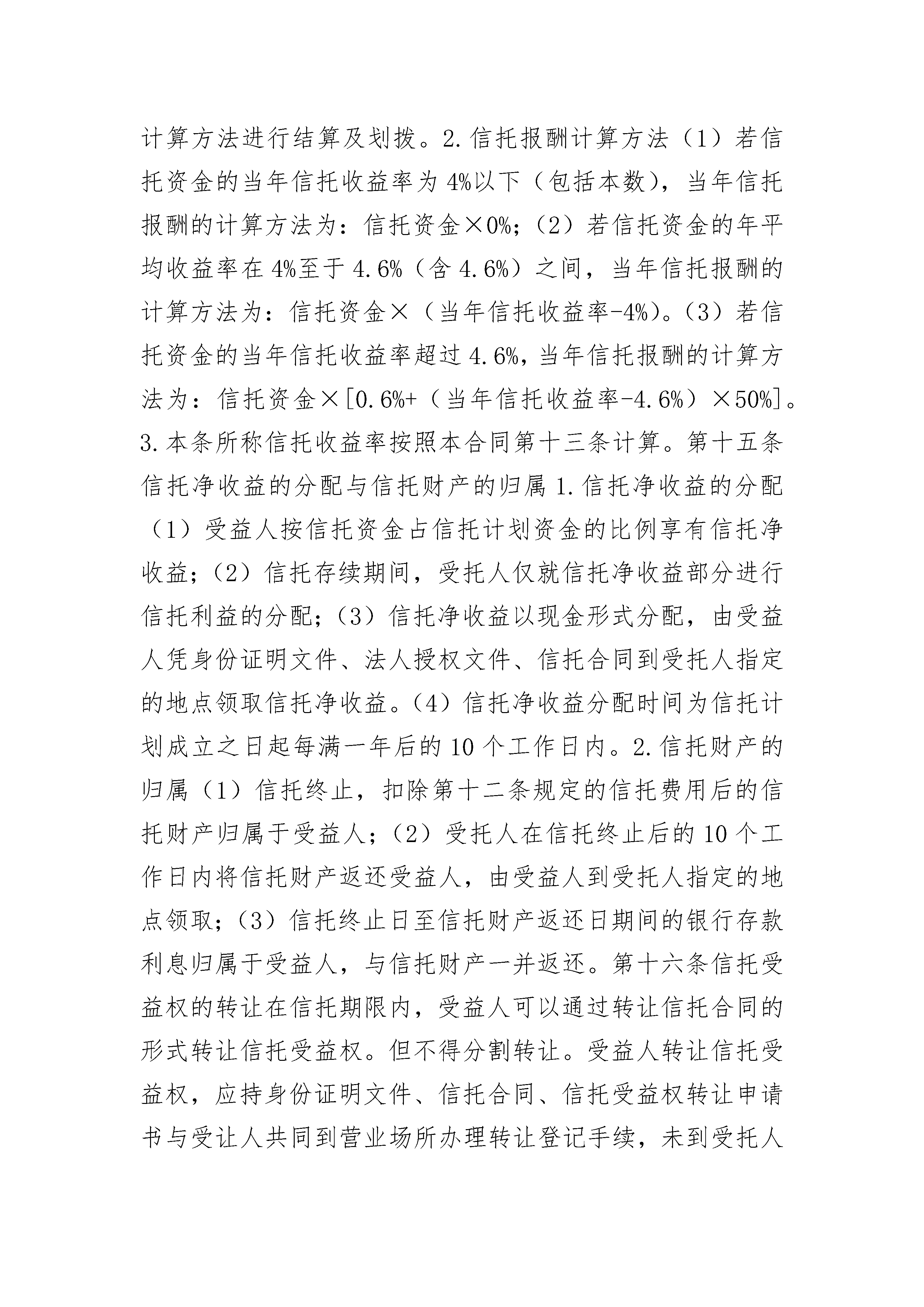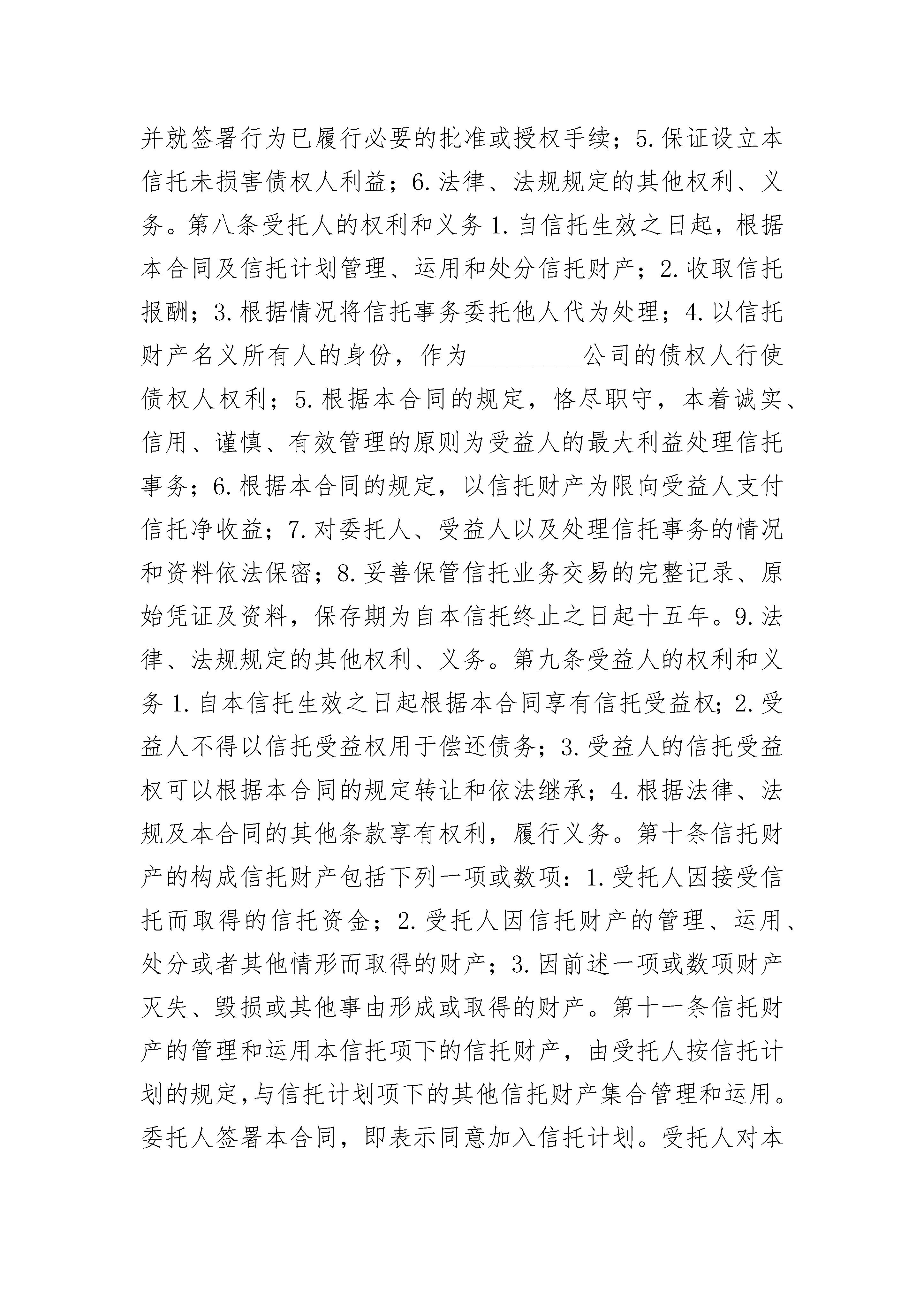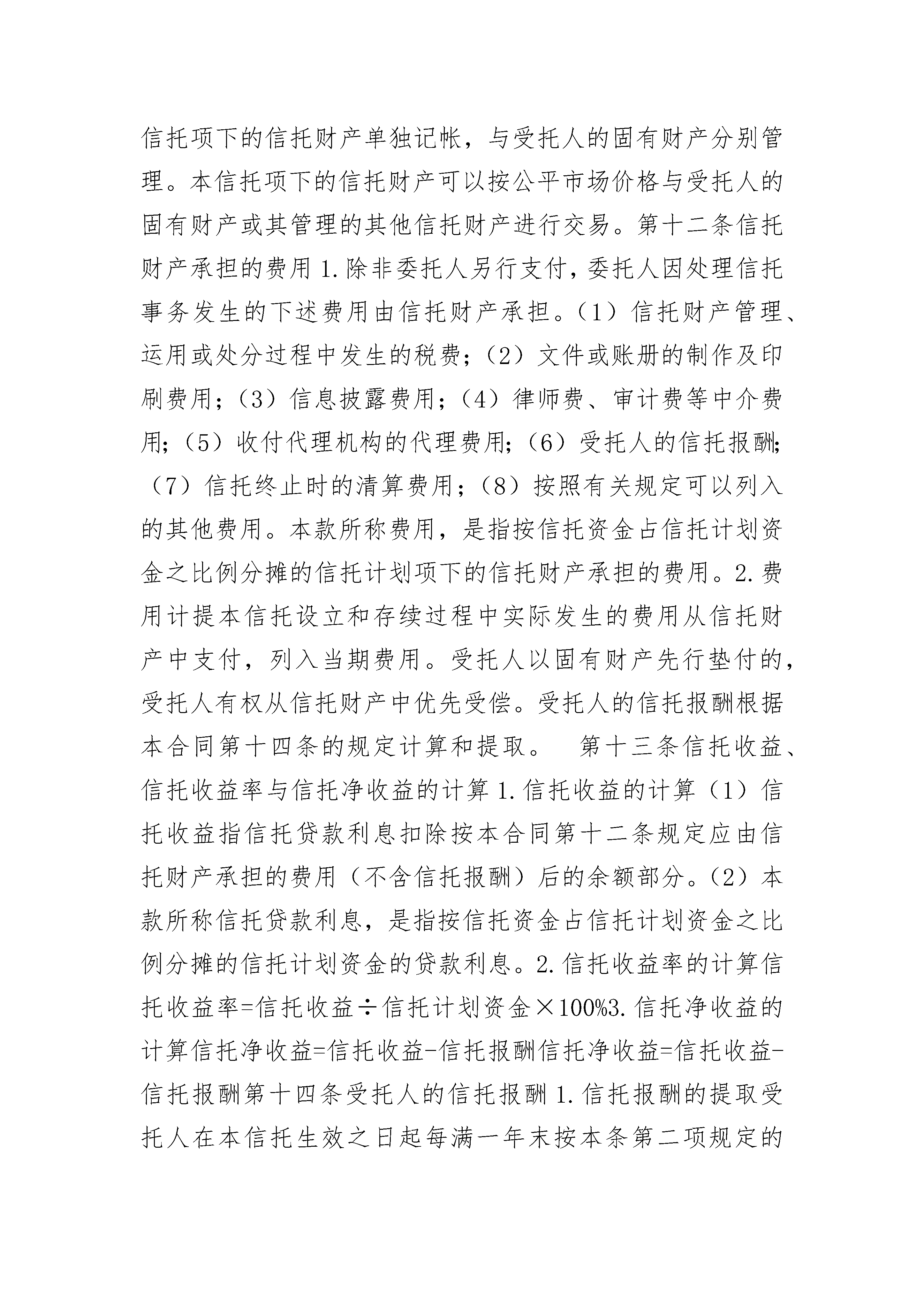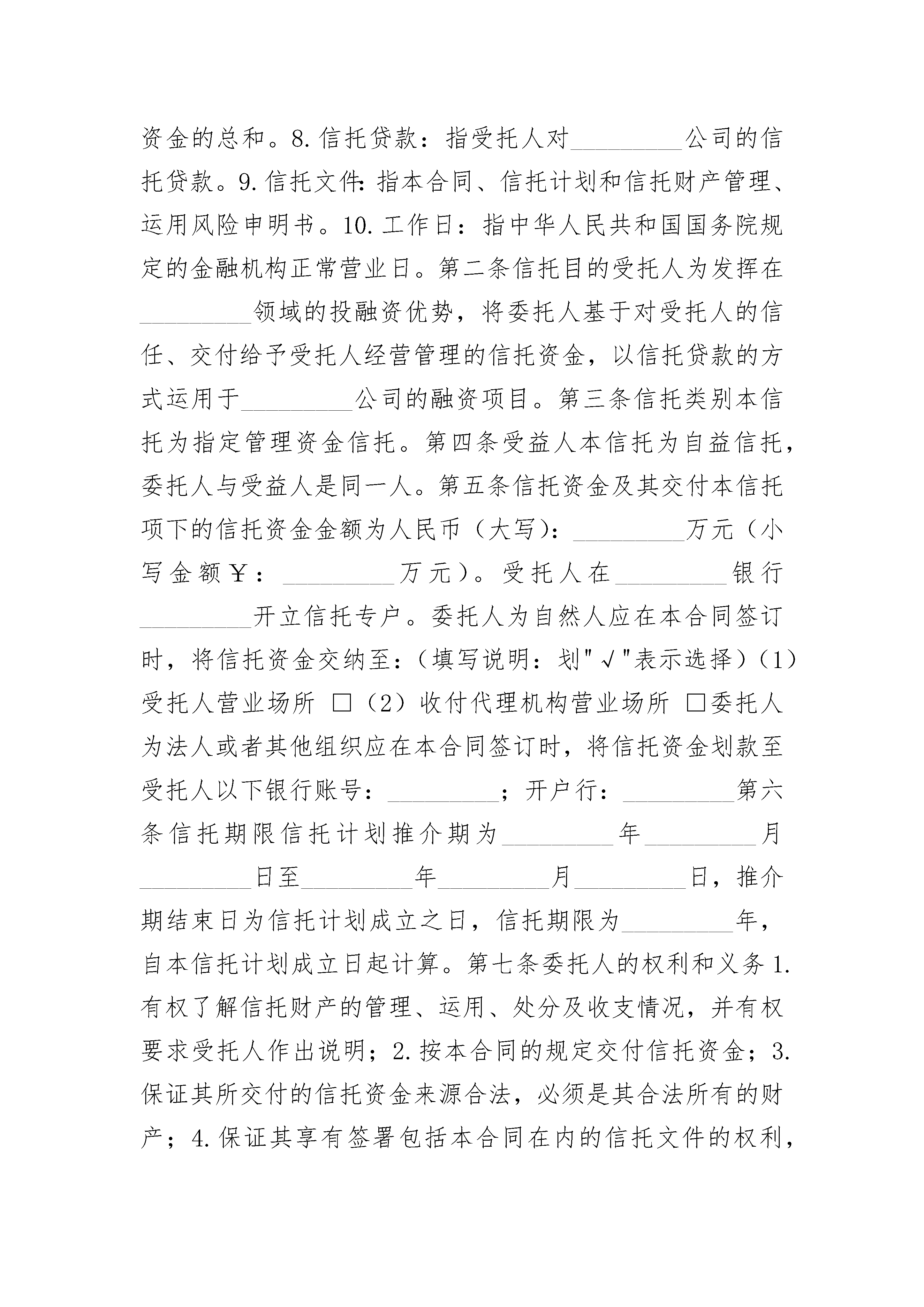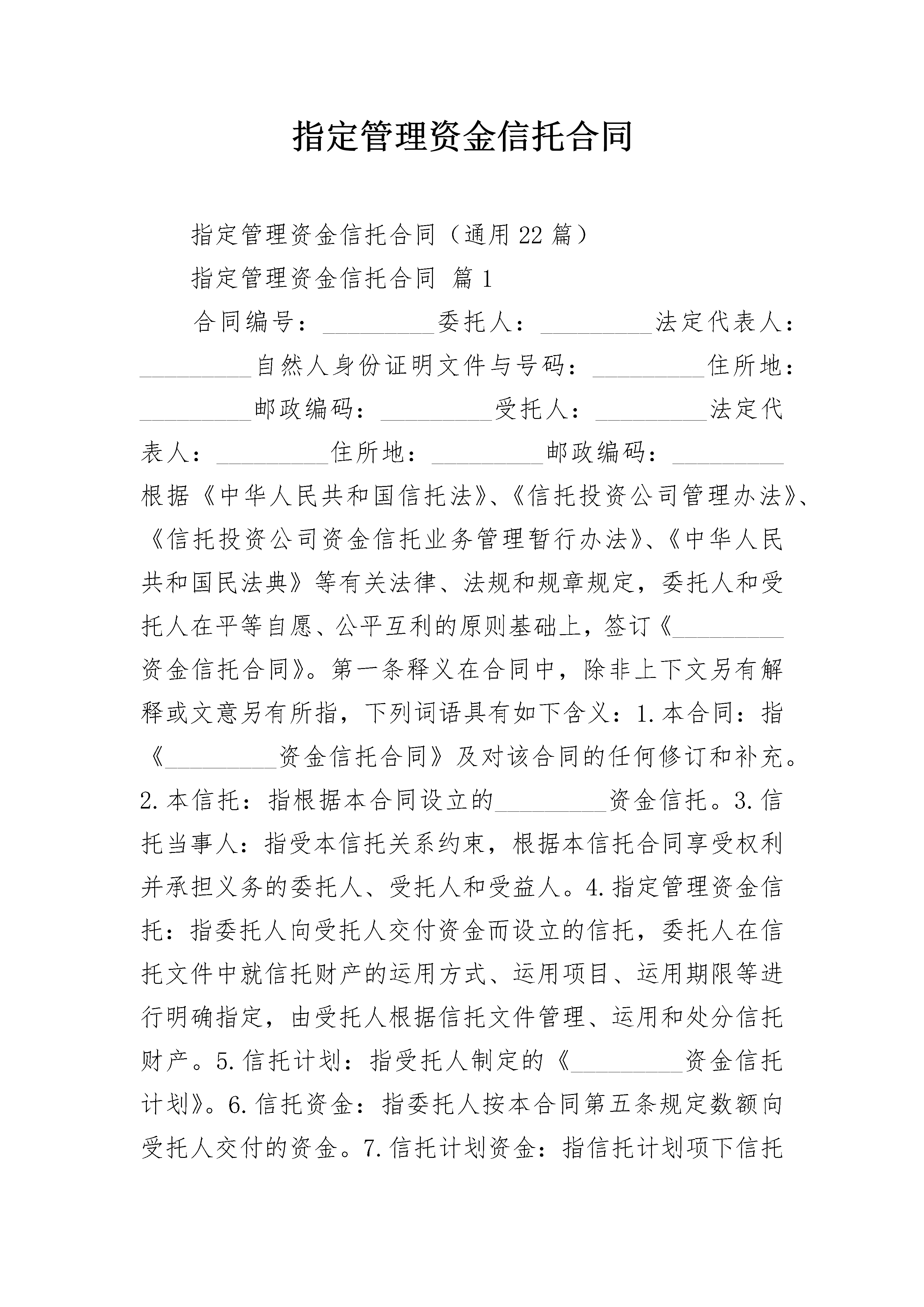 指定管理资金信托合同指定管理资金信托合同(通用22篇)指定管理资金信托合同篇1合同编号:_________委托人:_________法定代表人:_________自然人身份证明文件与号码:_________住所地:_________邮政编码:_________受托人:_________法定代表人:_________住所地:_________邮政编码:_________根据《中华人民共和国信托法》、《信托投资公司管理办法》、《信托投资公司资金信托业务管理暂行办法》、《中华人民共和国民法典》等有关法律、法规和规章规定,委托人和受托人在平等自愿、公平互利的原则基础上,签订《_________资金信托合同》。第一条释义在合同中,除非上下文另有解释或文意另有所指,下列词语具有如下含义:1.本合同:指《_________资金信托合同》及对该合同的任何修订和补充。2.本信托:指根据本合同设立的_________资金信托。3.信托当事人:指受本信托关系约束,根据本信托合同享受权利并承担义务的委托人、受托人和受益人。4.指定管理资金信托:指委托人向受托人交付资金而设立的信托,委托人在信托文件中就信托财产的运用方式、运用项目、运用期限等进行明确指定,由受托人根据信托文件管理、运用和处分信托财产。5.信托计划:指受托人制定的《_________资金信托计划》。6.信托资金:指委托人按本合同第五条规定数额向受托人交付的资金。7.信托计划资金:指信托计划项下信托资金的总和。8.信托贷款:指受托人对_________公司的信托贷款。9.信托文件:指本合同、信托计划和信托财产管理、运用风险申明书。10.工作日:指中华人民共和国国务院规定的金融机构正常营业日。第二条信托目的受托人为发挥在_________领域的投融资优势,将委托人基于对受托人的信任、交付给予受托人经营管理的信托资金,以信托贷款的方式运用于_________公司的融资项目。第三条信托类别本信托为指定管理资金信托。第四条受益人本信托为自益信托,委托人与受益人是同一人。第五条信托资金及其交付本信托项下的信托资金金额为人民币(大写):_________万元(小写金额¥:_________万元)。受托人在_________银行_________开立信托专户。委托人为自然人应在本合同签订时,将信托资金交纳至:(填写说明:划"√"表示选择)(1)受托人营业场所□(2)收付代理机构营业场所□委托人为法人或者其他组织应在本合同签订时,将信托资金划款至受托人以下银行账号:_________;开户行:_________第六条信托期限信托计划推介期为_________年_________月_________日至_________年_________月_________日,推介期结束日为信托计划成立之日,信托期限为_________年,自本信托计划成立日起计算。第七条委托人的权利和义务1.有权了解信托财产的管理、运用、处分及收支情况,并有权要求受托人作出说明;2.按本合同的规定交付信托资金;3.保证其所交付的信托资金来源合法,必须是其合法所有的财产;4.保证其享有签署包括本合同在内的信托文件的权利,并就签署行为已履行必要的批准或授权手续;5.保证设立本信托未损害债权人利益;6.法律、法规规定的其他权利、义务。第八条受托人的权利和义务1.自信托生效之日起,根据本合同及信托计划管理、运用和处分信托财产;2.收取信托报酬;3.根据情况将信托事务委托他人代为处理;4.以信托财产名义所有人的身份,作为_________公司的债权人行使债权人权利;5.根据本合同的规定,恪尽职守,本着诚实、信用、谨慎、有效管理的原则为受益人的最大利益处理信托事务;6.根据本合同的规定,以信托财产为限向受益人支付信托净收益;7.对委托人、受益人以及处理信托事务的情况和资料依法保密;8.妥善保管信托业务交易的完整记录、原始凭证及资料,保存期为自本信托终止之日起十五年。9.法律、法规规定的其他权利、义务。第九条受益人的权利和义务1.自本信托生效之日起根据本合同享有信托受益权;2.受益人不得以信托受益权用于偿还债务;3.受益人的信托受益权可以根据本合同的规定转让和依法继承;4.根据法律、法规及本合同的其他条款享有权利,履行义务。第十条信托财产的构成信托财产包括下列一项或数项:1.受托人因接受信托而取得的信托资金;2.受托人因信托财产的管理、运用、处分或者其他情形而取得的财产;3.因前述一项或数项财产灭失、毁损或其他事由形成或取得的财产。第十一条信托财产的管理和运用本信托项下的信托财产,由受托人按信托计划的规定,与信托计划项下的其他信托财产集合管理和运用。委托人签署本合同,即表示同意加入信托计划。受托人对本信托项下的信托财产单独记帐,与受托人的固有财产
