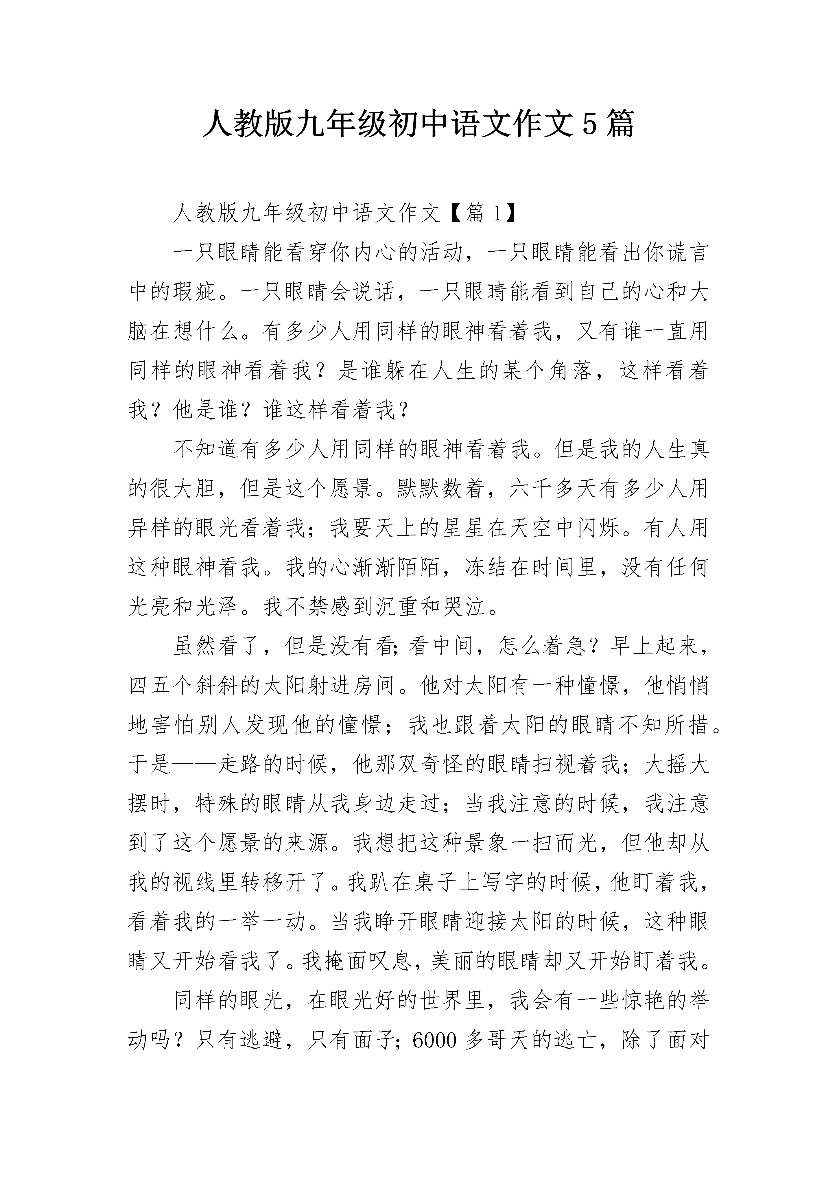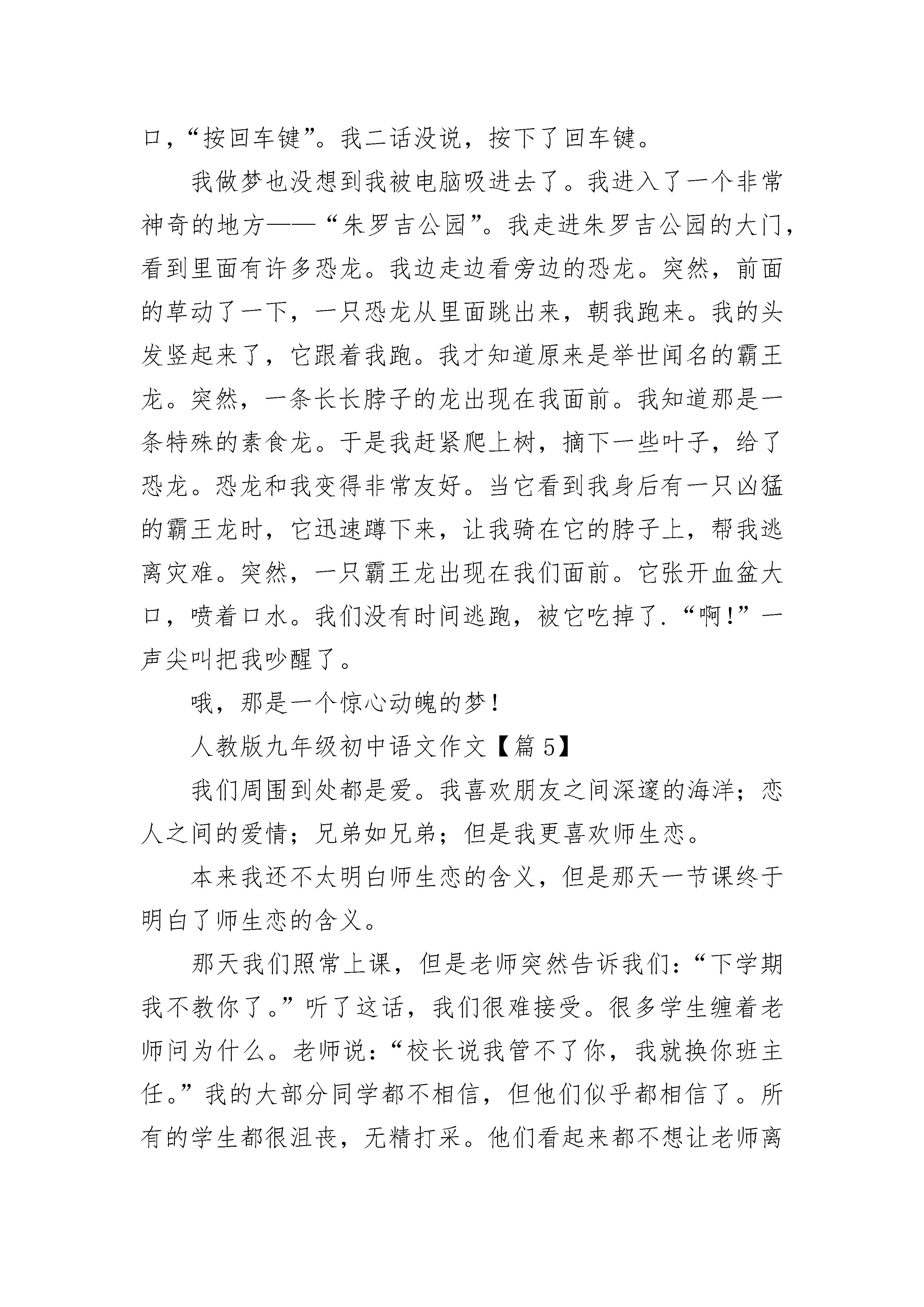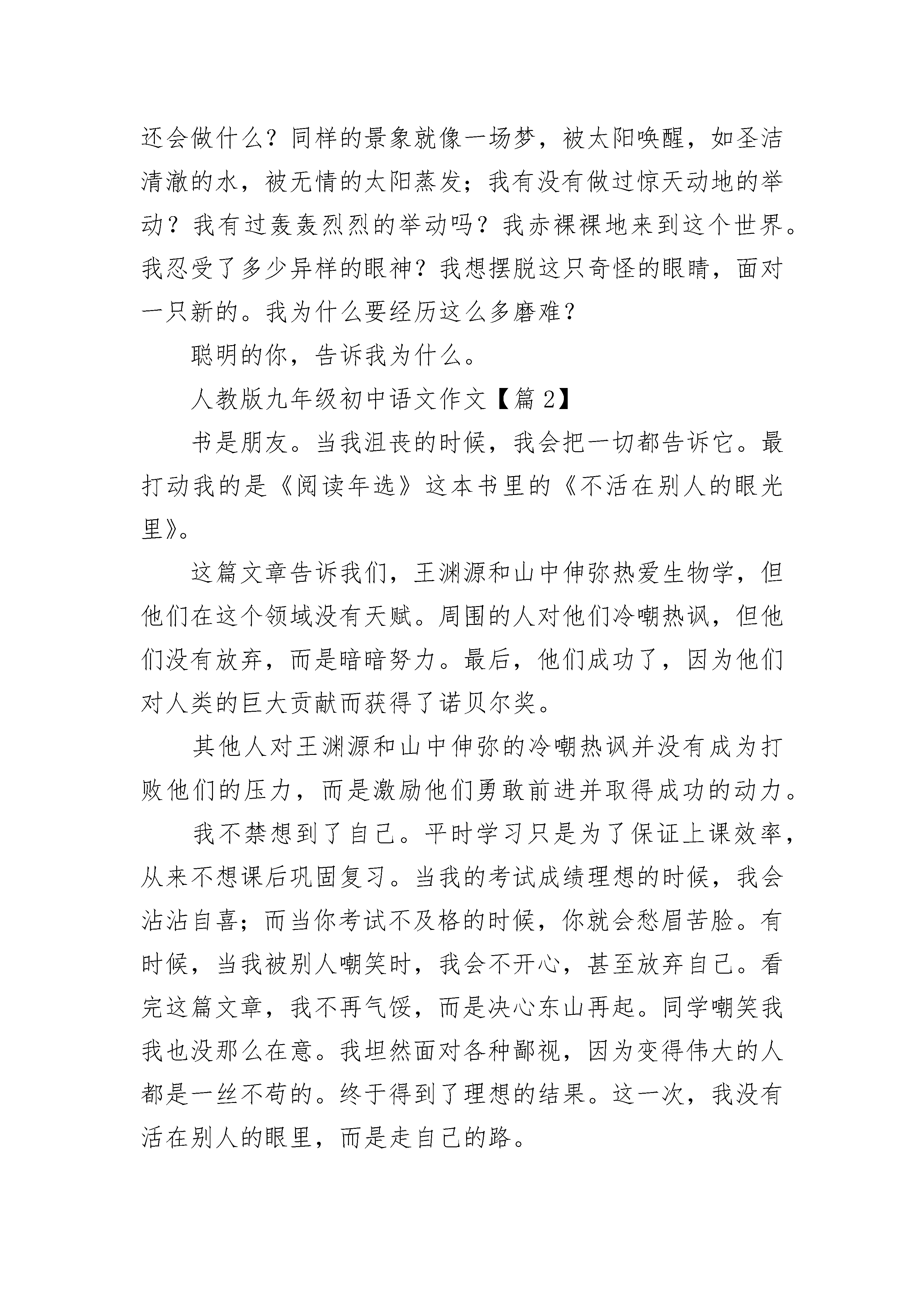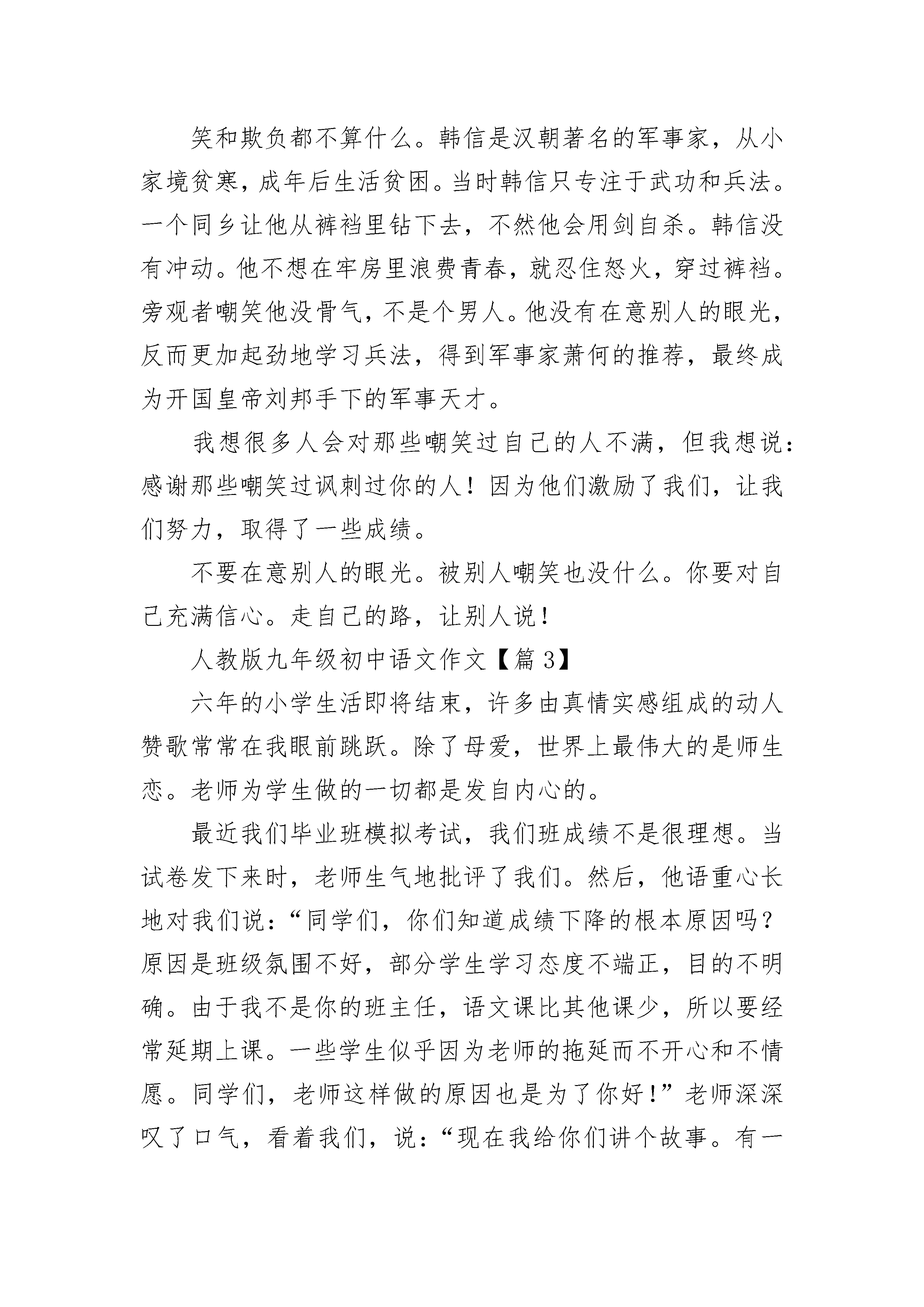 人教版九年级初中语文作文5篇人教版九年级初中语文作文【篇1】一只眼睛能看穿你内心的活动,一只眼睛能看出你谎言中的瑕疵。一只眼睛会说话,一只眼睛能看到自己的心和大脑在想什么。有多少人用同样的眼神看着我,又有谁一直用同样的眼神看着我?是谁躲在人生的某个角落,这样看着我?他是谁?谁这样看着我?不知道有多少人用同样的眼神看着我。但是我的人生真的很大胆,但是这个愿景。默默数着,六千多天有多少人用异样的眼光看着我;我要天上的星星在天空中闪烁。有人用这种眼神看我。我的心渐渐陌陌,冻结在时间里,没有任何光亮和光泽。我不禁感到沉重和哭泣。虽然看了,但是没有看;看中间,怎么着急?早上起来,四五个斜斜的太阳射进房间。他对太阳有一种憧憬,他悄悄地害怕别人发现他的憧憬;我也跟着太阳的眼睛不知所措。于是——走路的时候,他那双奇怪的眼睛扫视着我;大摇大摆时,特殊的眼睛从我身边走过;当我注意的时候,我注意到了这个愿景的来源。我想把这种景象一扫而光,但他却从我的视线里转移开了。我趴在桌子上写字的时候,他盯着我,看着我的一举一动。当我睁开眼睛迎接太阳的时候,这种眼睛又开始看我了。我掩面叹息,美丽的眼睛却又开始盯着我。同样的眼光,在眼光好的世界里,我会有一些惊艳的举动吗?只有逃避,只有面子;6000多哥天的逃亡,除了面对还会做什么?同样的景象就像一场梦,被太阳唤醒,如圣洁清澈的水,被无情的太阳蒸发;我有没有做过惊天动地的举动?我有过轰轰烈烈的举动吗?我赤裸裸地来到这个世界。我忍受了多少异样的眼神?我想摆脱这只奇怪的眼睛,面对一只新的。我为什么要经历这么多磨难?聪明的你,告诉我为什么。人教版九年级初中语文作文【篇2】书是朋友。当我沮丧的时候,我会把一切都告诉它。最打动我的是《阅读年选》这本书里的《不活在别人的眼光里》。这篇文章告诉我们,王渊源和山中伸弥热爱生物学,但他们在这个领域没有天赋。周围的人对他们冷嘲热讽,但他们没有放弃,而是暗暗努力。最后,他们成功了,因为他们对人类的巨大贡献而获得了诺贝尔奖。其他人对王渊源和山中伸弥的冷嘲热讽并没有成为打败他们的压力,而是激励他们勇敢前进并取得成功的动力。我不禁想到了自己。平时学习只是为了保证上课效率,从来不想课后巩固复习。当我的考试成绩理想的时候,我会沾沾自喜;而当你考试不及格的时候,你就会愁眉苦脸。有时候,当我被别人嘲笑时,我会不开心,甚至放弃自己。看完这篇文章,我不再气馁,而是决心东山再起。同学嘲笑我我也没那么在意。我坦然面对各种鄙视,因为变得伟大的人都是一丝不苟的。终于得到了理想的结果。这一次,我没有活在别人的眼里,而是走自己的路。笑和欺负都不算什么。韩信是汉朝著名的军事家,从小家境贫寒,成年后生活贫困。当时韩信只专注于武功和兵法。一个同乡让他从裤裆里钻下去,不然他会用剑自杀。韩信没有冲动。他不想在牢房里浪费青春,就忍住怒火,穿过裤裆。旁观者嘲笑他没骨气,不是个男人。他没有在意别人的眼光,反而更加起劲地学习兵法,得到军事家萧何的推荐,最终成为开国皇帝刘邦手下的军事天才。我想很多人会对那些嘲笑过自己的人不满,但我想说:感谢那些嘲笑过讽刺过你的人!因为他们激励了我们,让我们努力,取得了一些成绩。不要在意别人的眼光。被别人嘲笑也没什么。你要对自己充满信心。走自己的路,让别人说!人教版九年级初中语文作文【篇3】六年的小学生活即将结束,许多由真情实感组成的动人赞歌常常在我眼前跳跃。除了母爱,世界上最伟大的是师生恋。老师为学生做的一切都是发自内心的。最近我们毕业班模拟考试,我们班成绩不是很理想。当试卷发下来时,老师生气地批评了我们。然后,他语重心长地对我们说:“同学们,你们知道成绩下降的根本原因吗?原因是班级氛围不好,部分学生学习态度不端正,目的不明确。由于我不是你的班主任,语文课比其他课少,所以要经常延期上课。一些学生似乎因为老师的拖延而不开心和不情愿。同学们,老师这样做的原因也是为了你好!”老师深深叹了口气,看着我们,说:“现在我给你们讲个故事。有一个雕刻家正在用一块普通的石头雕刻。石头随处可见,所以并不罕见。但是经过他的精心雕刻,一个栩栩如生的小天使诞生了。一个好奇的小女孩问他为什么知道石头里有天使?雕塑家回答说,石头里没有天使,但他正在心里雕刻一个天使。同学们,如何在心中雕刻天使,是一个很深刻的问题。今天就来说说这个话题。”老师想了想说,“每个人心里都有一个天使,他也有一个魔鬼。对学生来说,天使是学习的欲望和努力。相反,学生心中的魔鬼是对学习的厌倦和无奈。把天使雕刻在心中,如果天使存在,就必须战胜恶魔。我们应该把注意力集中在学习的好处和学习的乐趣上,而不是整天想着怎么玩的更有趣更新鲜,这样才有天使站立的地方。同学们,努力把最美的天使刻在心里,不要让恶魔有立足之地。”那些上进心强,好学的同学,没话说。每个人似乎都在学习