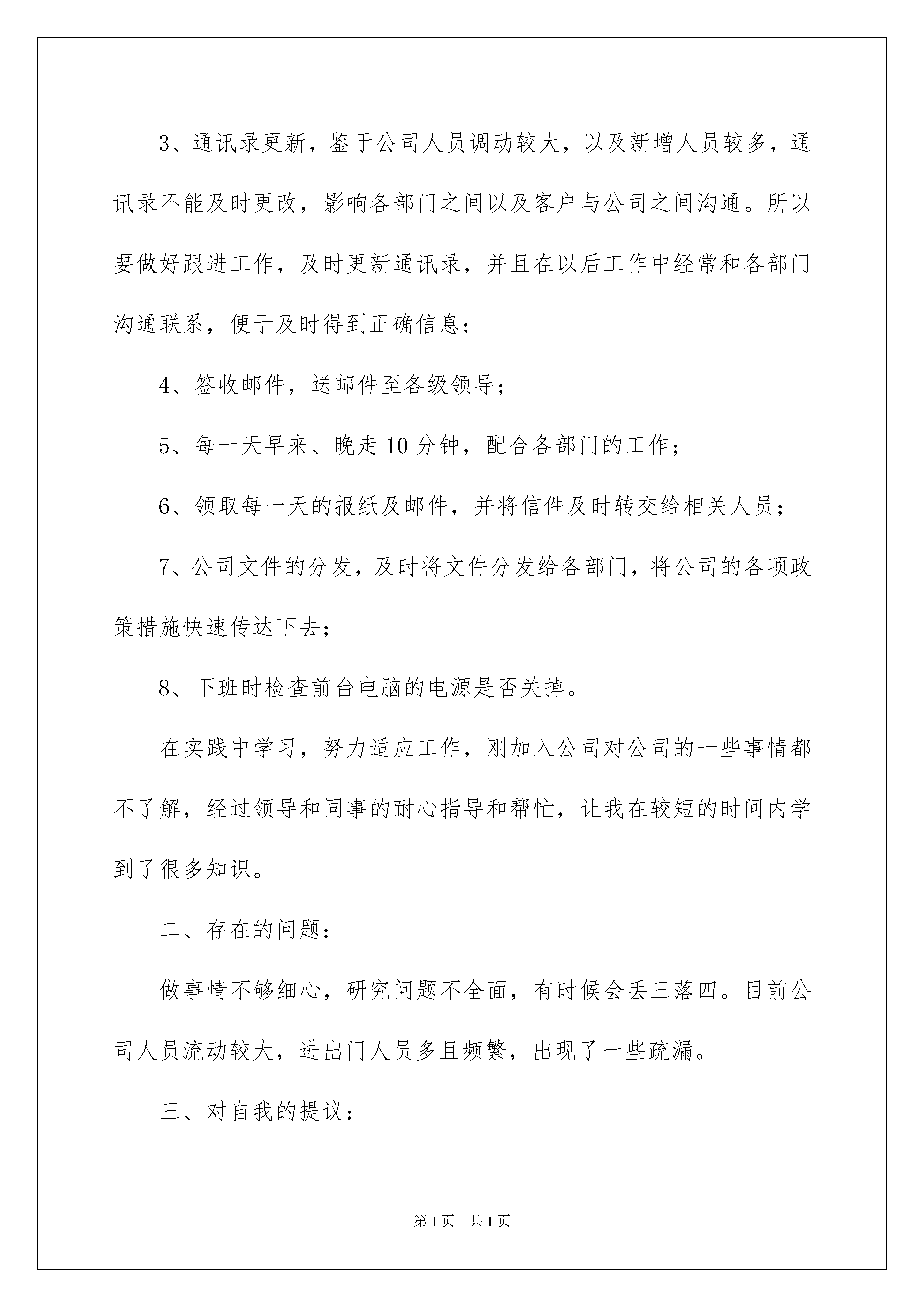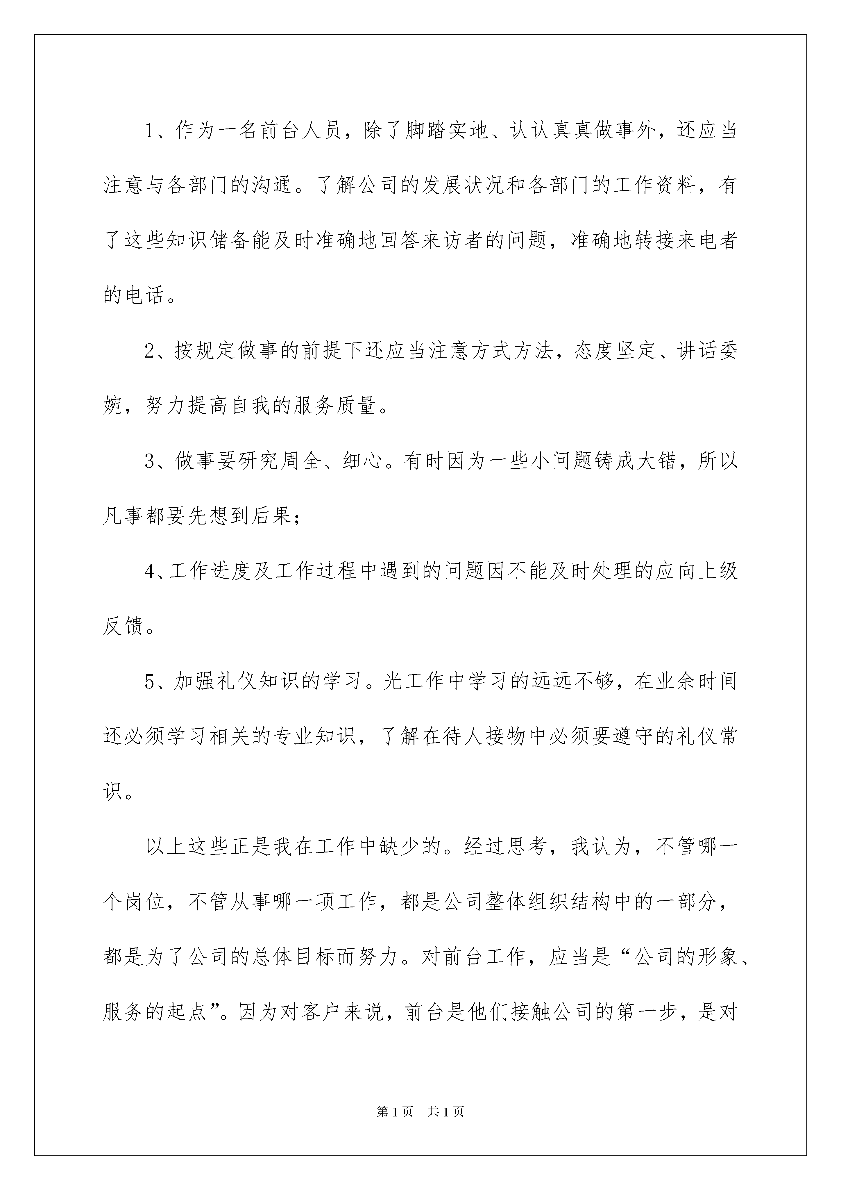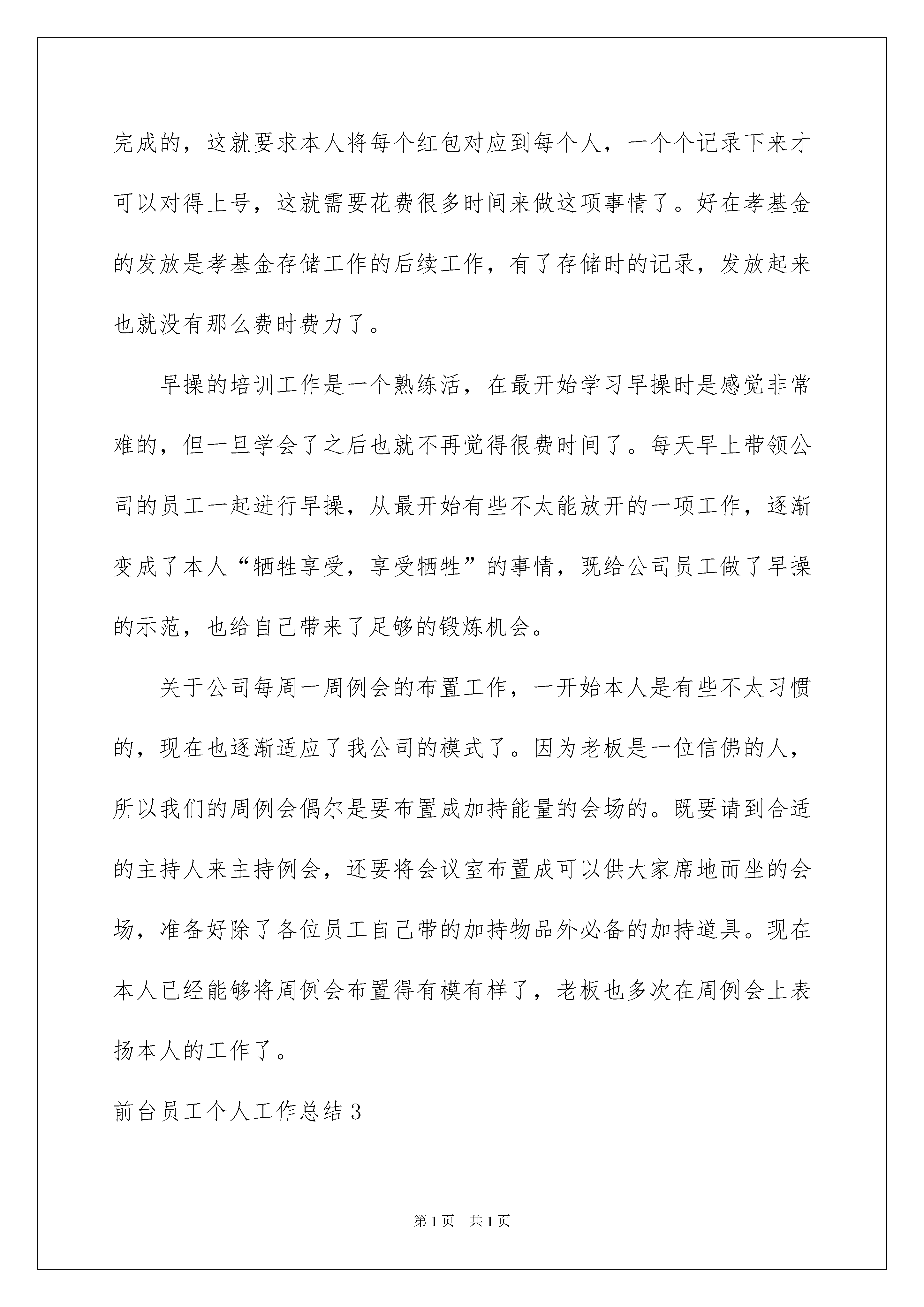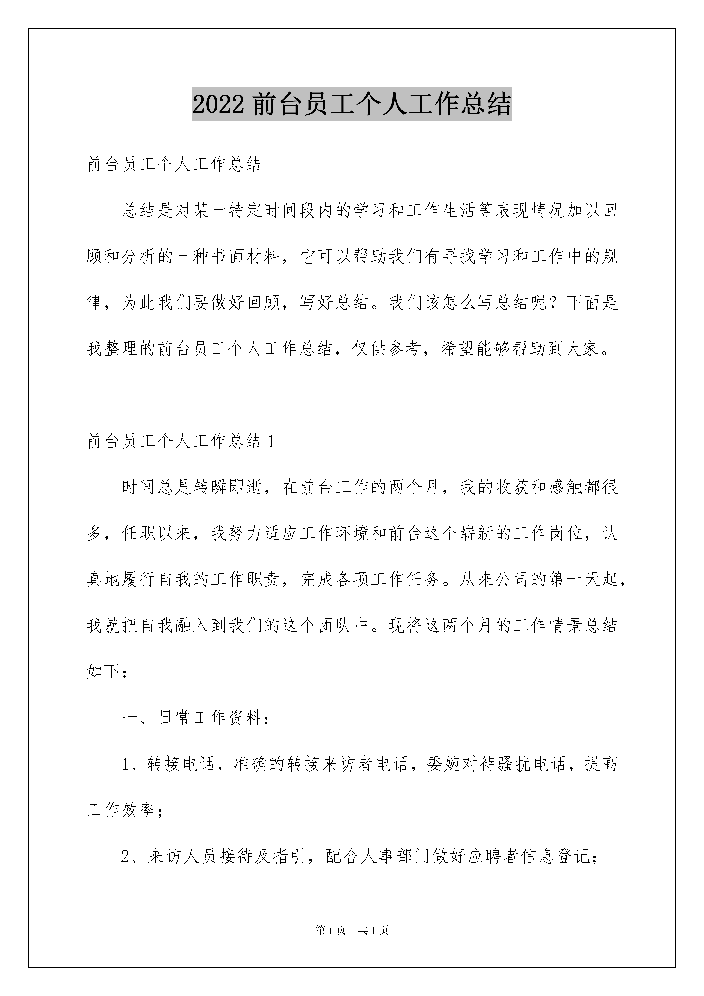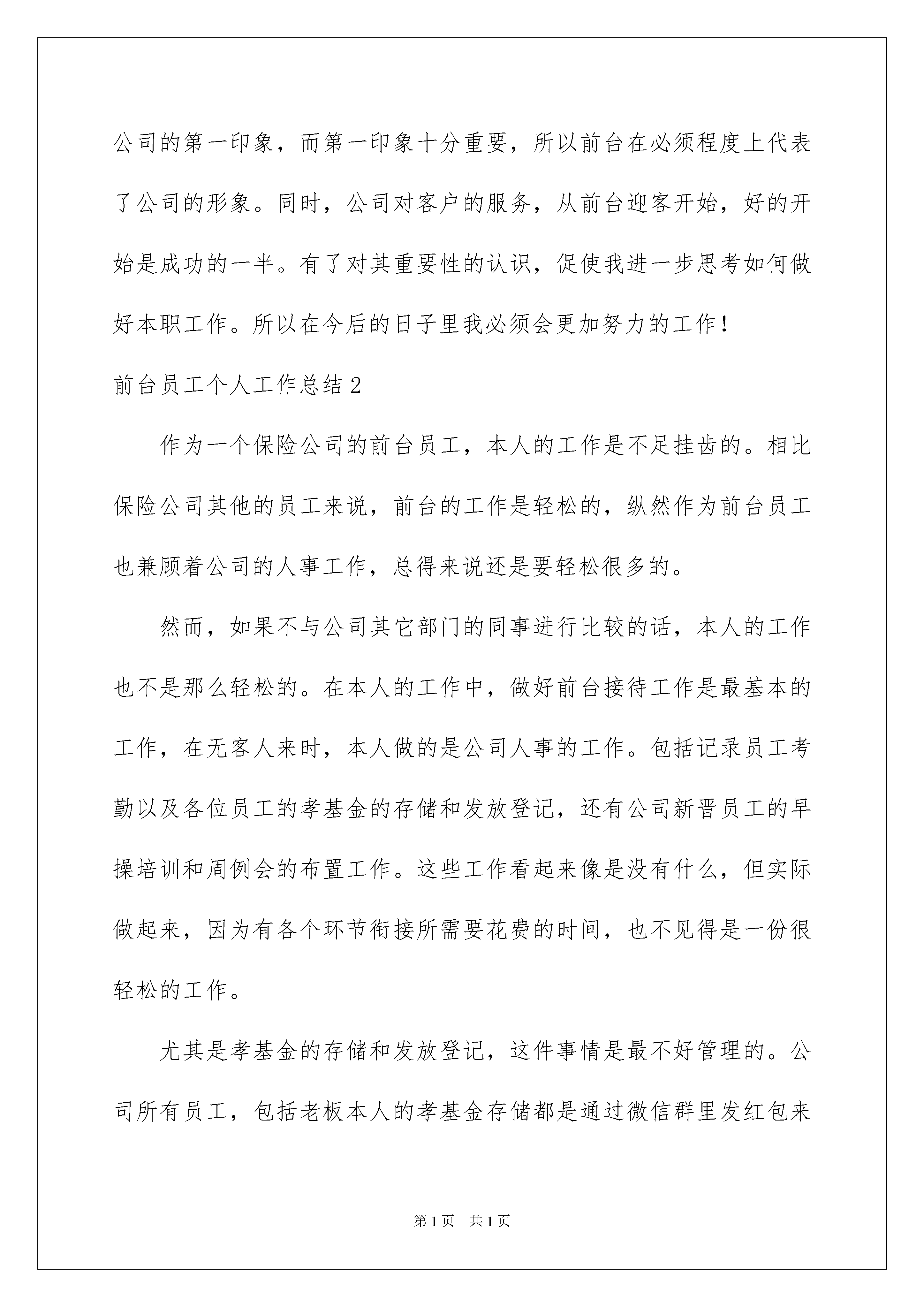 2022前台员工个人工作总结前台员工个人工作总结总结是对某一特定时间段内的学习和工作生活等表现情况加以回顾和分析的一种书面材料,它可以帮助我们有寻找学习和工作中的规律,为此我们要做好回顾,写好总结。我们该怎么写总结呢?下面是我整理的前台员工个人工作总结,仅供参考,希望能够帮助到大家。前台员工个人工作总结1时间总是转瞬即逝,在前台工作的两个月,我的收获和感触都很多,任职以来,我努力适应工作环境和前台这个崭新的工作岗位,认真地履行自我的工作职责,完成各项工作任务。从来公司的第一天起,我就把自我融入到我们的这个团队中。现将这两个月的工作情景总结如下:一、日常工作资料:1、转接电话,准确的转接来访者电话,委婉对待骚扰电话,提高工作效率;2、来访人员接待及指引,配合人事部门做好应聘者信息登记;3、通讯录更新,鉴于公司人员调动较大,以及新增人员较多,通讯录不能及时更改,影响各部门之间以及客户与公司之间沟通。所以要做好跟进工作,及时更新通讯录,并且在以后工作中经常和各部门沟通联系,便于及时得到正确信息;4、签收邮件,送邮件至各级领导;5、每一天早来、晚走10分钟,配合各部门的工作;6、领取每一天的报纸及邮件,并将信件及时转交给相关人员;7、公司文件的分发,及时将文件分发给各部门,将公司的各项政策措施快速传达下去;8、下班时检查前台电脑的电源是否关掉。在实践中学习,努力适应工作,刚加入公司对公司的一些事情都不了解,经过领导和同事的耐心指导和帮忙,让我在较短的时间内学到了很多知识。二、存在的问题:做事情不够细心,研究问题不全面,有时候会丢三落四。目前公司人员流动较大,进出门人员多且频繁,出现了一些疏漏。三、对自我的提议:1、作为一名前台人员,除了脚踏实地、认认真真做事外,还应当注意与各部门的沟通。了解公司的发展状况和各部门的工作资料,有了这些知识储备能及时准确地回答来访者的问题,准确地转接来电者的电话。2、按规定做事的前提下还应当注意方式方法,态度坚定、讲话委婉,努力提高自我的服务质量。3、做事要研究周全、细心。有时因为一些小问题铸成大错,所以凡事都要先想到后果;4、工作进度及工作过程中遇到的问题因不能及时处理的应向上级反馈。5、加强礼仪知识的学习。光工作中学习的远远不够,在业余时间还必须学习相关的专业知识,了解在待人接物中必须要遵守的礼仪常识。以上这些正是我在工作中缺少的。经过思考,我认为,不管哪一个岗位,不管从事哪一项工作,都是公司整体组织结构中的一部分,都是为了公司的总体目标而努力。对前台工作,应当是“公司的形象、服务的起点”。因为对客户来说,前台是他们接触公司的第一步,是对公司的第一印象,而第一印象十分重要,所以前台在必须程度上代表了公司的形象。同时,公司对客户的服务,从前台迎客开始,好的开始是成功的一半。有了对其重要性的认识,促使我进一步思考如何做好本职工作。所以在今后的日子里我必须会更加努力的工作!前台员工个人工作总结2作为一个保险公司的前台员工,本人的工作是不足挂齿的。相比保险公司其他的员工来说,前台的工作是轻松的,纵然作为前台员工也兼顾着公司的人事工作,总得来说还是要轻松很多的。然而,如果不与公司其它部门的同事进行比较的话,本人的工作也不是那么轻松的。在本人的工作中,做好前台接待工作是最基本的工作,在无客人来时,本人做的是公司人事的工作。包括记录员工考勤以及各位员工的孝基金的存储和发放登记,还有公司新晋员工的早操培训和周例会的布置工作。这些工作看起来像是没有什么,但实际做起来,因为有各个环节衔接所需要花费的时间,也不见得是一份很轻松的工作。尤其是孝基金的存储和发放登记,这件事情是最不好管理的。公司所有员工,包括老板本人的孝基金存储都是通过微信群里发红包来完成的,这就要求本人将每个红包对应到每个人,一个个记录下来才可以对得上号,这就需要花费很多时间来做这项事情了。好在孝基金的发放是孝基金存储工作的后续工作,有了存储时的记录,发放起来也就没有那么费时费力了。早操的培训工作是一个熟练活,在最开始学习早操时是感觉非常难的,但一旦学会了之后也就不再觉得很费时间了。每天早上带领公司的员工一起进行早操,从最开始有些不太能放开的一项工作,逐渐变成了本人“牺牲享受,享受牺牲”的事情,既给公司员工做了早操的示范,也给自己带来了足够的锻炼机会。关于公司每周一周例会的布置工作,一开始本人是有些不太习惯的,现在也逐渐适应了我公司的模式了。因为老板是一位信佛的人,所以我们的周例会偶尔是要布置成加持能量的会场的。既要请到合适的主持人来主持例会,还要将会议室布置成可以供大家席地而坐的会场,准备好除了各位员