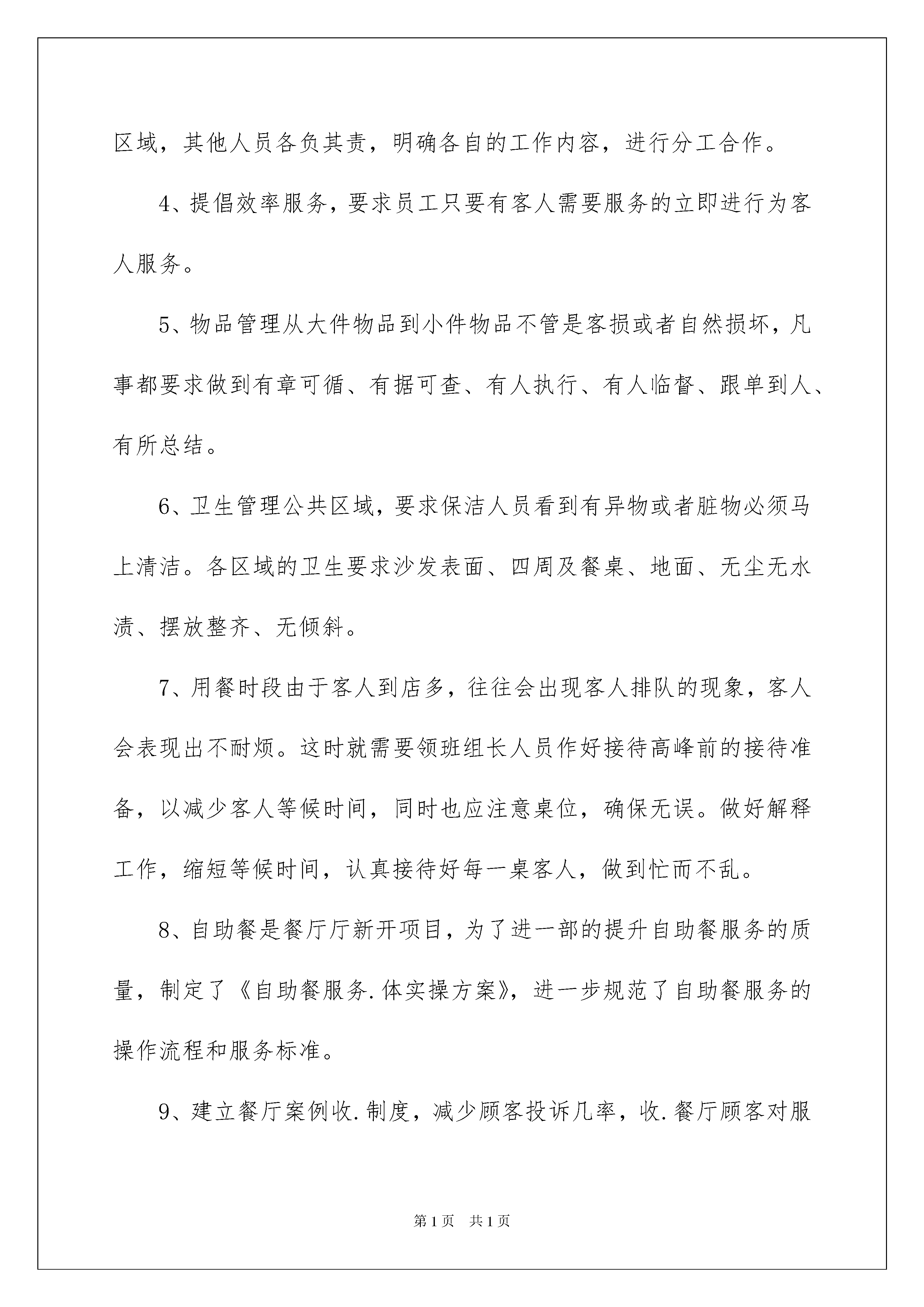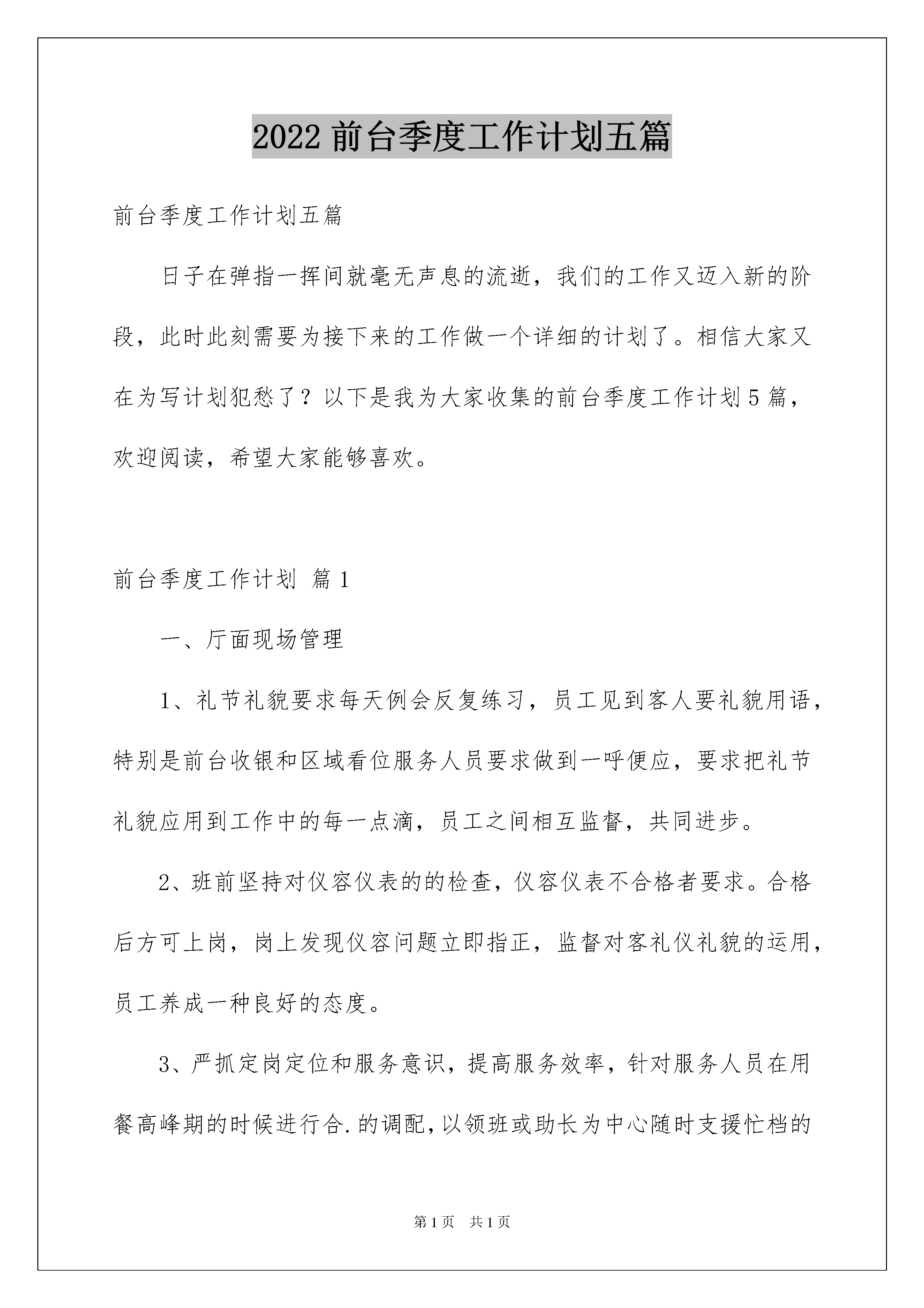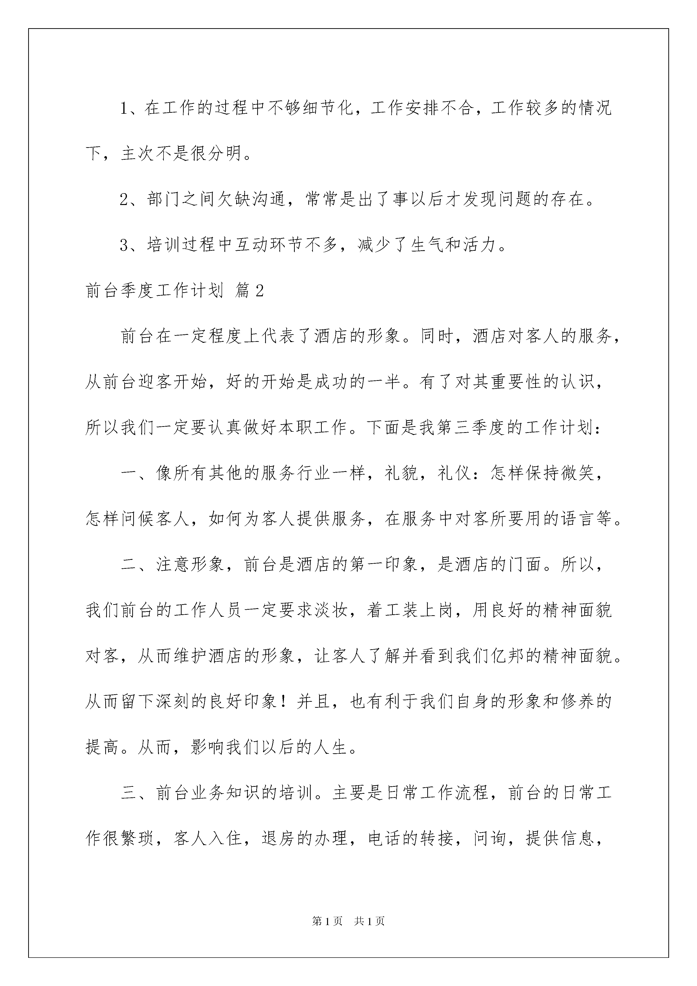 2022前台季度工作计划五篇前台季度工作计划五篇日子在弹指一挥间就毫无声息的流逝,我们的工作又迈入新的阶段,此时此刻需要为接下来的工作做一个详细的计划了。相信大家又在为写计划犯愁了?以下是我为大家收集的前台季度工作计划5篇,欢迎阅读,希望大家能够喜欢。前台季度工作计划篇1一、厅面现场管理1、礼节礼貌要求每天例会反复练习,员工见到客人要礼貌用语,特别是前台收银和区域看位服务人员要求做到一呼便应,要求把礼节礼貌应用到工作中的每一点滴,员工之间相互监督,共同进步。2、班前坚持对仪容仪表的的检查,仪容仪表不合格者要求。合格后方可上岗,岗上发现仪容问题立即指正,监督对客礼仪礼貌的运用,员工养成一种良好的态度。3、严抓定岗定位和服务意识,提高服务效率,针对服务人员在用餐高峰期的时候进行合.的调配,以领班或助长为中心随时支援忙档的区域,其他人员各负其责,明确各自的工作内容,进行分工合作。4、提倡效率服务,要求员工只要有客人需要服务的立即进行为客人服务。5、物品管理从大件物品到小件物品不管是客损或者自然损坏,凡事都要求做到有章可循、有据可查、有人执行、有人临督、跟单到人、有所总结。6、卫生管理公共区域,要求保洁人员看到有异物或者脏物必须马上清洁。各区域的卫生要求沙发表面、四周及餐桌、地面、无尘无水渍、摆放整齐、无倾斜。7、用餐时段由于客人到店多,往往会出现客人排队的现象,客人会表现出不耐烦。这时就需要领班组长人员作好接待高峰前的接待准备,以减少客人等候时间,同时也应注意桌位,确保无误。做好解释工作,缩短等候时间,认真接待好每一桌客人,做到忙而不乱。8、自助餐是餐厅厅新开项目,为了进一部的提升自助餐服务的质量,制定了《自助餐服务.体实操方案》,进一步规范了自助餐服务的操作流程和服务标准。9、建立餐厅案例收.制度,减少顾客投诉几率,收.餐厅顾客对服务质量、品质等方面的投诉,作为改善日常管.及服务提供重要依据,针对问题拿出解决方案,使日常服务更具针对性,减少了顾客的投诉几率。二、员工日常管理1、新员工作为餐厅人员的重要组成部分,能否快速的融入团队、调好转型心态将直接影响服务质量及团队建设。根据新员工特点及入职情况,开展专题培训,请保留此标记员工的心态,正视角色转化,认识餐饮行业特点。使新员工在心.上作好充分的思想准备,缓解了因角色转变的不适应而造成的不满情绪,加快了融入餐饮团队的步伐。2、注重员工的成长,时刻关注员工的心态,要求保持良好的工作状态,不定期组织员工进行学习,并以对员工进行考核,检查培训效果,发现不足之处及时弥补,并对培训计划加以改进,每月定期找员工谈心做思想工作,了解他们近期的工作情况从中发现问题解决问题。3、结合工作实际加强培训,目的是为了提高工作效率,使管.更加规范有效。并结合日常餐厅案例分析的形式进行剖析,使员员对日常服务有了全新的认识,在日常服务意识上形成了一致。三、工作中存在不足1、在工作的过程中不够细节化,工作安排不合,工作较多的情况下,主次不是很分明。2、部门之间欠缺沟通,常常是出了事以后才发现问题的存在。3、培训过程中互动环节不多,减少了生气和活力。前台季度工作计划篇2前台在一定程度上代表了酒店的形象。同时,酒店对客人的服务,从前台迎客开始,好的开始是成功的一半。有了对其重要性的认识,所以我们一定要认真做好本职工作。下面是我第三季度的工作计划:一、像所有其他的服务行业一样,礼貌,礼仪:怎样保持微笑,怎样问候客人,如何为客人提供服务,在服务中对客所要用的语言等。二、注意形象,前台是酒店的第一印象,是酒店的门面。所以,我们前台的工作人员一定要求淡妆,着工装上岗,用良好的精神面貌对客,从而维护酒店的形象,让客人了解并看到我们亿邦的精神面貌。从而留下深刻的良好印象!并且,也有利于我们自身的形象和修养的提高。从而,影响我们以后的人生。三、前台业务知识的培训。主要是日常工作流程,前台的日常工作很繁琐,客人入住,退房的办理,电话的转接,问询,提供信息,行李寄存,接送机信息的查询与核对。订单的检查与核对,排房,交接班时的交接工作等。所以,我们随时都要保持认真,细致工作作风和责任心!以免给客人和自己的同事带来很多的不便!四、前台英语,一些前台英语能力的具备是对我们每个前台接待员的基本要求,这样才能好为来自外国的客人服务。对于英语的接待方面,我本以为对于像我一个英语专业的人来说不是问题,可是,后来在接待外国客人的时候,好多问题出来了,对于我已经一年多没有接触英语这才明白我好些单词都已生疏,还酒店的好多设施设备的名称都是以前没有接触过的。还好我们酒店组织了前台接待的英语培训,使我对以前