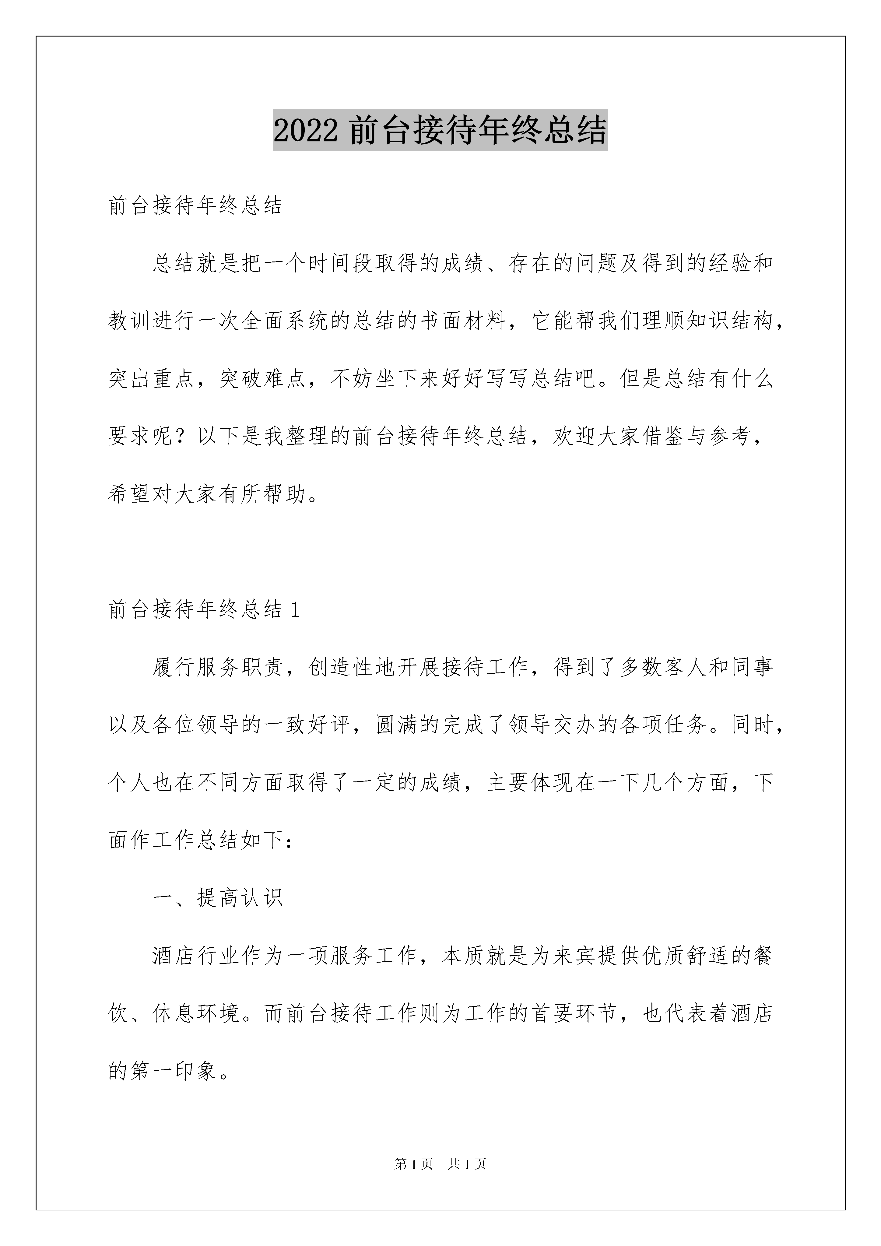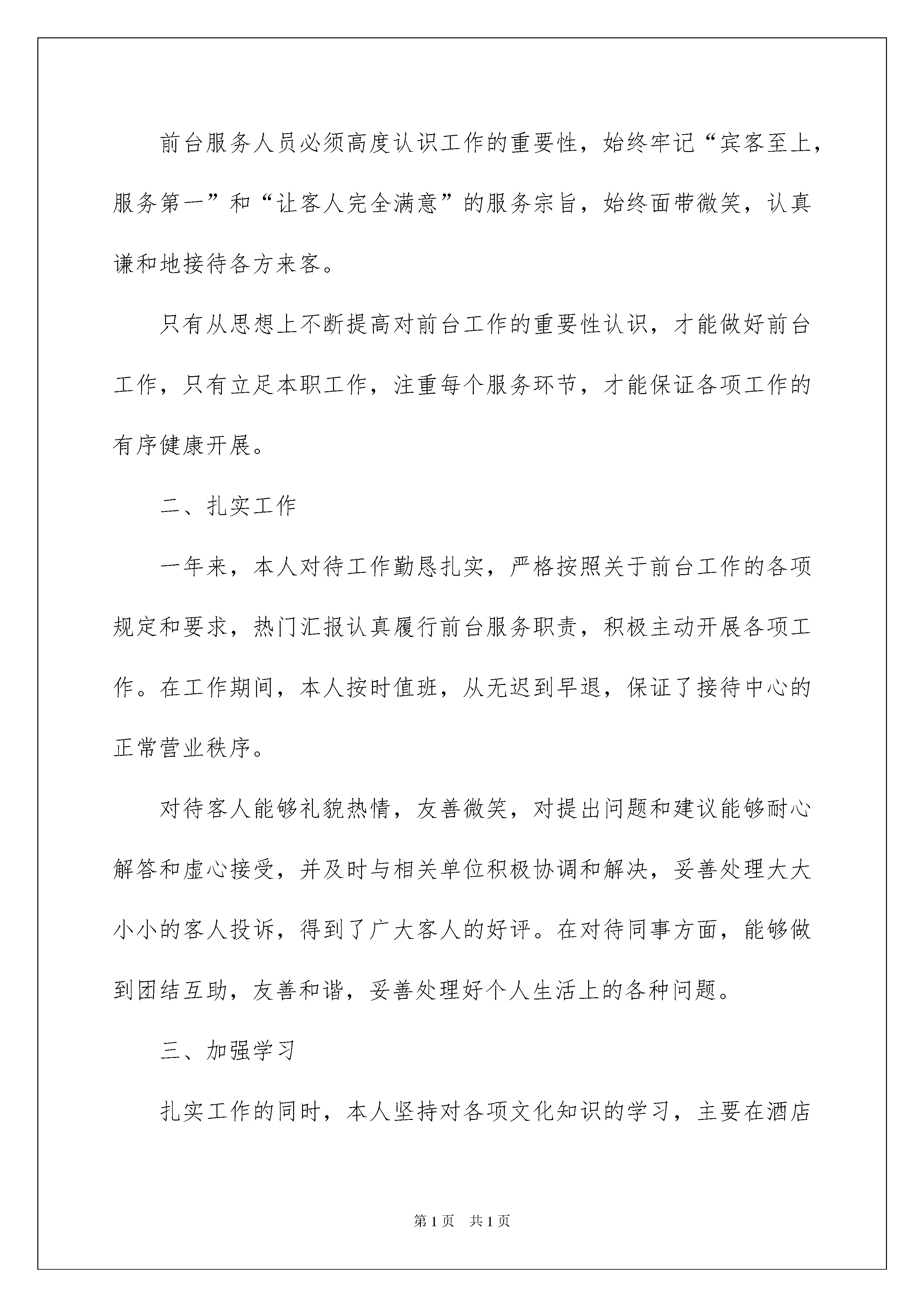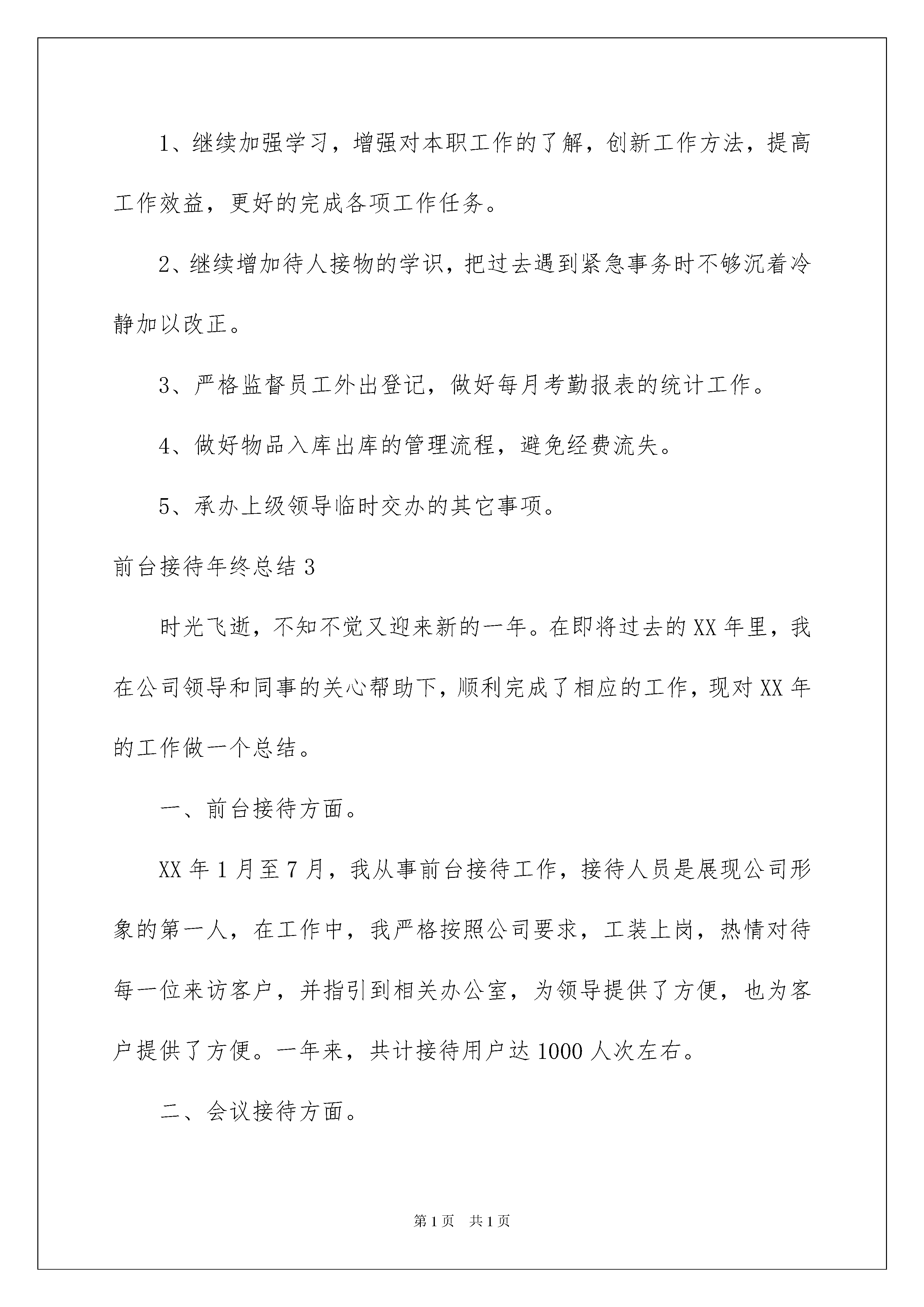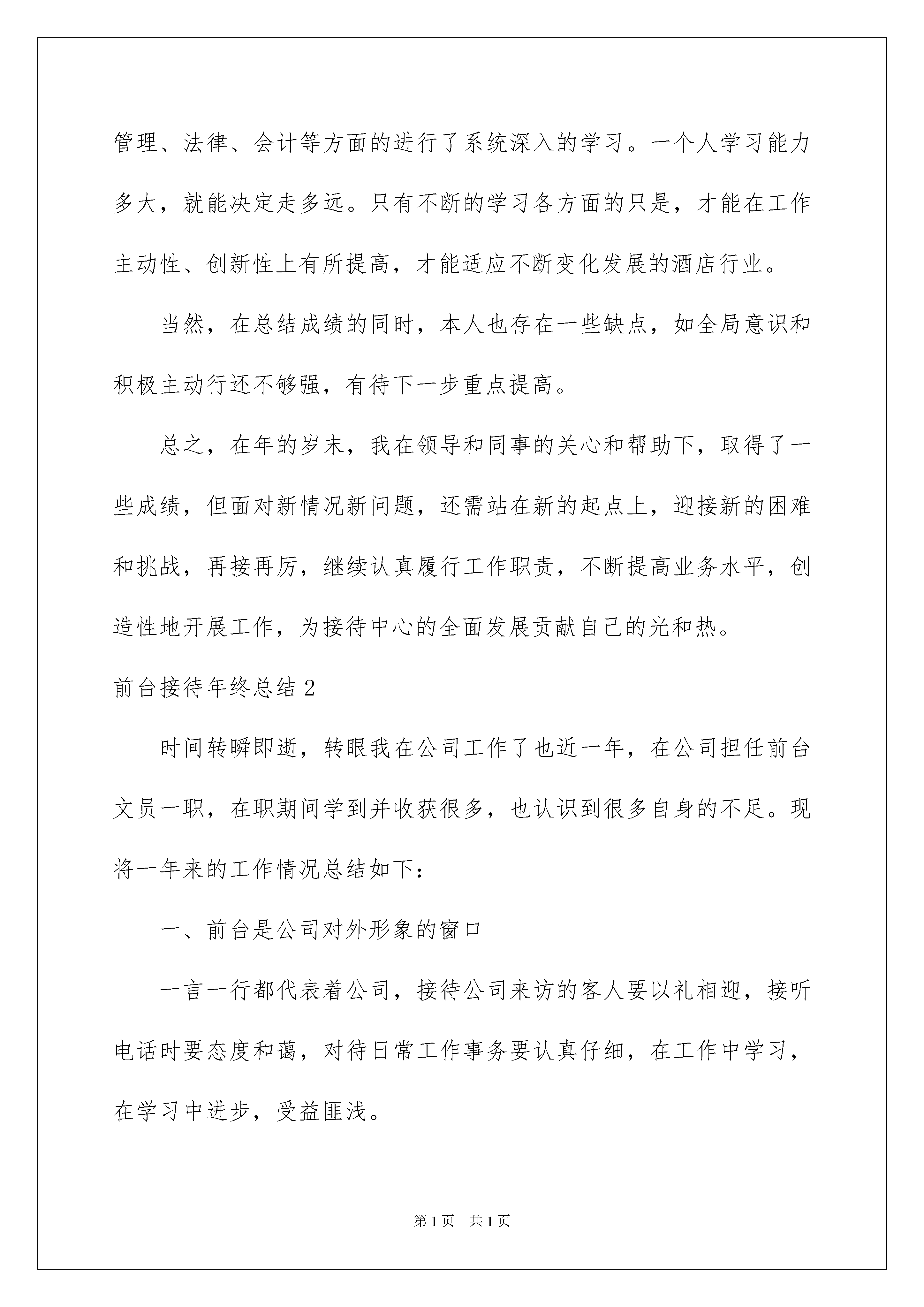 2022前台接待年终总结前台接待年终总结总结就是把一个时间段取得的成绩、存在的问题及得到的经验和教训进行一次全面系统的总结的书面材料,它能帮我们理顺知识结构,突出重点,突破难点,不妨坐下来好好写写总结吧。但是总结有什么要求呢?以下是我整理的前台接待年终总结,欢迎大家借鉴与参考,希望对大家有所帮助。前台接待年终总结1履行服务职责,创造性地开展接待工作,得到了多数客人和同事以及各位领导的一致好评,圆满的完成了领导交办的各项任务。同时,个人也在不同方面取得了一定的成绩,主要体现在一下几个方面,下面作工作总结如下:一、提高认识酒店行业作为一项服务工作,本质就是为来宾提供优质舒适的餐饮、休息环境。而前台接待工作则为工作的首要环节,也代表着酒店的第一印象。前台服务人员必须高度认识工作的重要性,始终牢记“宾客至上,服务第一”和“让客人完全满意”的服务宗旨,始终面带微笑,认真谦和地接待各方来客。只有从思想上不断提高对前台工作的重要性认识,才能做好前台工作,只有立足本职工作,注重每个服务环节,才能保证各项工作的有序健康开展。二、扎实工作一年来,本人对待工作勤恳扎实,严格按照关于前台工作的各项规定和要求,热门汇报认真履行前台服务职责,积极主动开展各项工作。在工作期间,本人按时值班,从无迟到早退,保证了接待中心的正常营业秩序。对待客人能够礼貌热情,友善微笑,对提出问题和建议能够耐心解答和虚心接受,并及时与相关单位积极协调和解决,妥善处理大大小小的客人投诉,得到了广大客人的好评。在对待同事方面,能够做到团结互助,友善和谐,妥善处理好个人生活上的各种问题。三、加强学习扎实工作的同时,本人坚持对各项文化知识的学习,主要在酒店管理、法律、会计等方面的进行了系统深入的学习。一个人学习能力多大,就能决定走多远。只有不断的学习各方面的只是,才能在工作主动性、创新性上有所提高,才能适应不断变化发展的酒店行业。当然,在总结成绩的同时,本人也存在一些缺点,如全局意识和积极主动行还不够强,有待下一步重点提高。总之,在年的岁末,我在领导和同事的关心和帮助下,取得了一些成绩,但面对新情况新问题,还需站在新的起点上,迎接新的困难和挑战,再接再厉,继续认真履行工作职责,不断提高业务水平,创造性地开展工作,为接待中心的全面发展贡献自己的光和热。前台接待年终总结2时间转瞬即逝,转眼我在公司工作了也近一年,在公司担任前台文员一职,在职期间学到并收获很多,也认识到很多自身的不足。现将一年来的工作情况总结如下:一、前台是公司对外形象的窗口一言一行都代表着公司,接待公司来访的客人要以礼相迎,接听电话时要态度和蔼,对待日常工作事务要认真仔细,在工作中学习,在学习中进步,受益匪浅。二、在职期间还担任公司考勤抽查及统计的工作在统计考勤时要严格按照考勤制度执行,做到不徇私舞弊。严格维护公司所制定的规章制度。三、认真细致的做好办公用品的入库出库工作根据办公用品的种类进行归类摆放,消除了仓库凌乱不堪的状况。在改善办公用品存放环境的同时也为后续库存统计工作奠定了基础。保持干净整齐的库容库貌成为仓库管理的一个长期基础工作。四、存在的不足1、由于刚接手工作不到一年,很多地方了解不够深入细致,需要继续努力;2、处理紧急事务时,不够沉着冷静;3、待人接物时,态度不够热情。在这一年的工作中有很多问题发生,我们要善于发现问题,把握问题,并在第一时间去解决,来提升自身的工作能力。这也要求我不断的去学习,去提升。争取在下一年度完善自身的不足,把工作做的更好,更专业!五、工作计划1、继续加强学习,增强对本职工作的了解,创新工作方法,提高工作效益,更好的完成各项工作任务。2、继续增加待人接物的学识,把过去遇到紧急事务时不够沉着冷静加以改正。3、严格监督员工外出登记,做好每月考勤报表的统计工作。4、做好物品入库出库的管理流程,避免经费流失。5、承办上级领导临时交办的其它事项。前台接待年终总结3时光飞逝,不知不觉又迎来新的一年。在即将过去的XX年里,我在公司领导和同事的关心帮助下,顺利完成了相应的工作,现对XX年的工作做一个总结。一、前台接待方面。XX年1月至7月,我从事前台接待工作,接待人员是展现公司形象的第一人,在工作中,我严格按照公司要求,工装上岗,热情对待每一位来访客户,并指引到相关办公室,为领导提供了方便,也为客户提供了方便。一年来,共计接待用户达1000人次左右。二、会议接待方面。1.外部会议接待参与接待了神族联通全省财务会议、运维部工作会议、人力监察培训会议、全省g网经营部工作会议、神族分公司与神族分公司共同召开的经营分析会等大型会议,在这种外部会议中,严格
