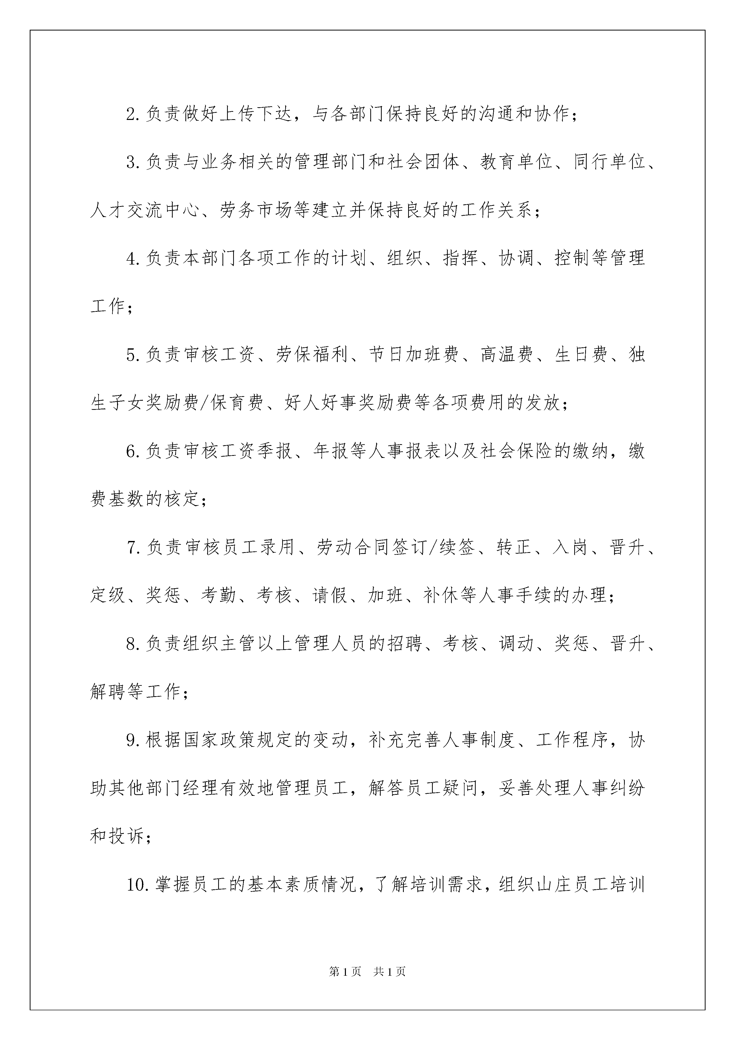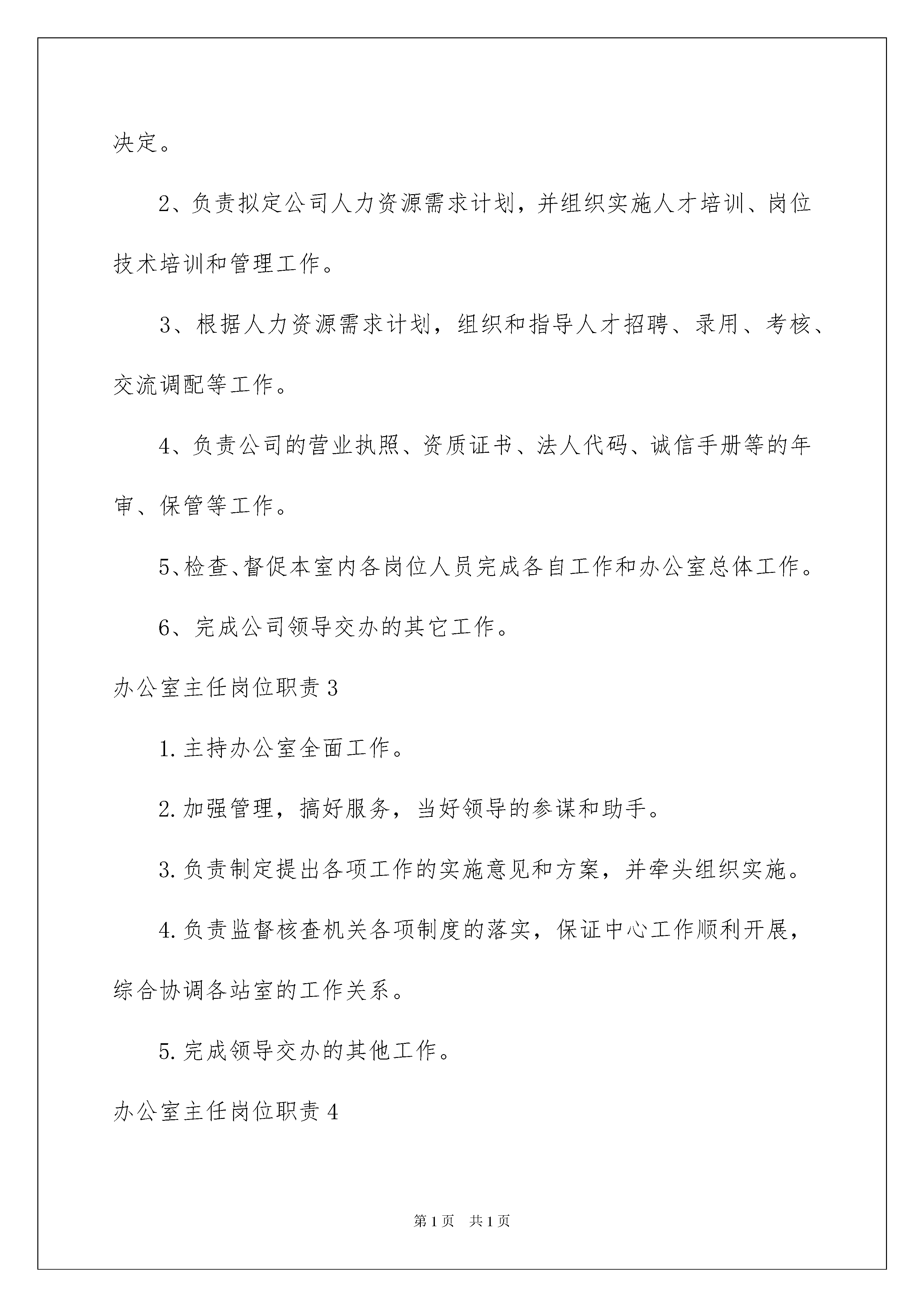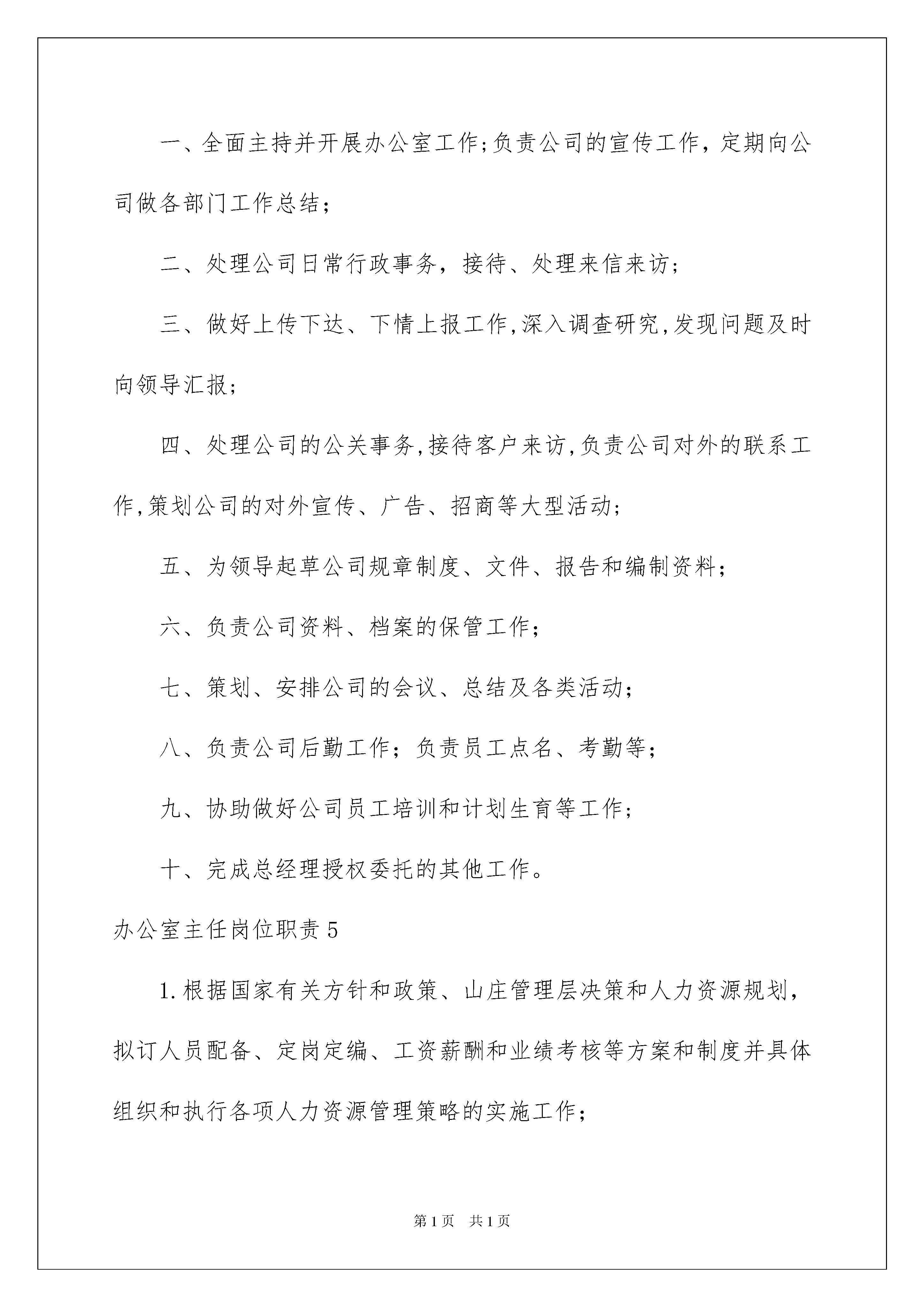 2022办公室主任岗位职责15篇办公室主任岗位职责15篇在现在社会,岗位职责使用的频率越来越高,岗位职责的明确对于企业规范用工、避免风险是非常重要的。岗位职责到底怎么制定才合适呢?以下是我帮大家整理的办公室主任岗位职责,欢迎阅读与收藏。办公室主任岗位职责1第一条:在公司总经理的领导下,负责本公司的行政管理、人力资源管理及内外部协调和后勤管理工作,并接受集团归口业务部门的指导。第二条:建立健全公司各项规章制度,并监督、检查各项规章制度的贯彻落实。第三条:负责组织本公司各类会议,并监督、检查会议决议的执行。第四条:按照逐级管理权限负责本公司员工招聘、培训、考核、社保、劳保福利、员工关系等日常人事工作的具体管理与实施。第五条:负责本公司的市场开发及内外部关系的协调,积极配合总经理处理好与相关单位和政府职能部门的关系。第六条:负责本公司各类文件的起草、审核,以及印鉴和档案管理工作。第七条:负责公司各类证照办理与审验,及固定实物资产和公务车辆管理。第八条:负责本公司安全、保卫、环境卫生、员工食堂、宿舍及员工业余文化生活的管理工作。第九条:协助本公司的党团、工会工作的开展,并负责本公司的品牌建设和企划宣传工作。第十条:完成领导交办的其他工作。以上岗位职责,我已经认真阅读,并理解每一条职责所包含的工作内容和要求,我承诺严格执行本岗位职责各条款。承诺人:承诺日期:办公室主任岗位职责21、对各部门的相关工作进行检查与协调,落实办公会议或董事会决定。2、负责拟定公司人力资源需求计划,并组织实施人才培训、岗位技术培训和管理工作。3、根据人力资源需求计划,组织和指导人才招聘、录用、考核、交流调配等工作。4、负责公司的营业执照、资质证书、法人代码、诚信手册等的年审、保管等工作。5、检查、督促本室内各岗位人员完成各自工作和办公室总体工作。6、完成公司领导交办的其它工作。办公室主任岗位职责31.主持办公室全面工作。2.加强管理,搞好服务,当好领导的参谋和助手。3.负责制定提出各项工作的实施意见和方案,并牵头组织实施。4.负责监督核査机关各项制度的落实,保证中心工作顺利开展,综合协调各站室的工作关系。5.完成领导交办的其他工作。办公室主任岗位职责4一、全面主持并开展办公室工作;负责公司的宣传工作,定期向公司做各部门工作总结;二、处理公司日常行政事务,接待、处理来信来访;三、做好上传下达、下情上报工作,深入调查研究,发现问题及时向领导汇报;四、处理公司的公关事务,接待客户来访,负责公司对外的联系工作,策划公司的对外宣传、广告、招商等大型活动;五、为领导起草公司规章制度、文件、报告和编制资料;六、负责公司资料、档案的保管工作;七、策划、安排公司的会议、总结及各类活动;八、负责公司后勤工作;负责员工点名、考勤等;九、协助做好公司员工培训和计划生育等工作;十、完成总经理授权委托的其他工作。办公室主任岗位职责51.根据国家有关方针和政策、山庄管理层决策和人力资源规划,拟订人员配备、定岗定编、工资薪酬和业绩考核等方案和制度并具体组织和执行各项人力资源管理策略的实施工作;2.负责做好上传下达,与各部门保持良好的沟通和协作;3.负责与业务相关的管理部门和社会团体、教育单位、同行单位、人才交流中心、劳务市场等建立并保持良好的工作关系;4.负责本部门各项工作的计划、组织、指挥、协调、控制等管理工作;5.负责审核工资、劳保福利、节日加班费、高温费、生日费、独生子女奖励费/保育费、好人好事奖励费等各项费用的发放;6.负责审核工资季报、年报等人事报表以及社会保险的缴纳,缴费基数的核定;7.负责审核员工录用、劳动合同签订/续签、转正、入岗、晋升、定级、奖惩、考勤、考核、请假、加班、补休等人事手续的办理;8.负责组织主管以上管理人员的招聘、考核、调动、奖惩、晋升、解聘等工作;9.根据国家政策规定的变动,补充完善人事制度、工作程序,协助其他部门经理有效地管理员工,解答员工疑问,妥善处理人事纠纷和投诉;10.掌握员工的基本素质情况,了解培训需求,组织山庄员工培训计划的制订,执行主管以上人员的培训计划;11.负责员工外出就诊的审批,审核医药费,并按山庄规定组织健康检查;12.负责抓好员工餐厅、浴室等后勤生活区域的服务质量;13.负责拟订本部门费用预算,检查监督执行情况,做好相关成本的控制;14.负责各类行政事务的处理,包括组织整理文件档案、组织山庄年度考核及考核方案的修订完善;15.管理登记山庄印章、介绍信的使用,负责组织卫生许可证、垃圾清运、电视收视等的缴费或年检工作;16.完成上级交待的其他事宜。办公室主任岗位职责61、认真贯彻执行党