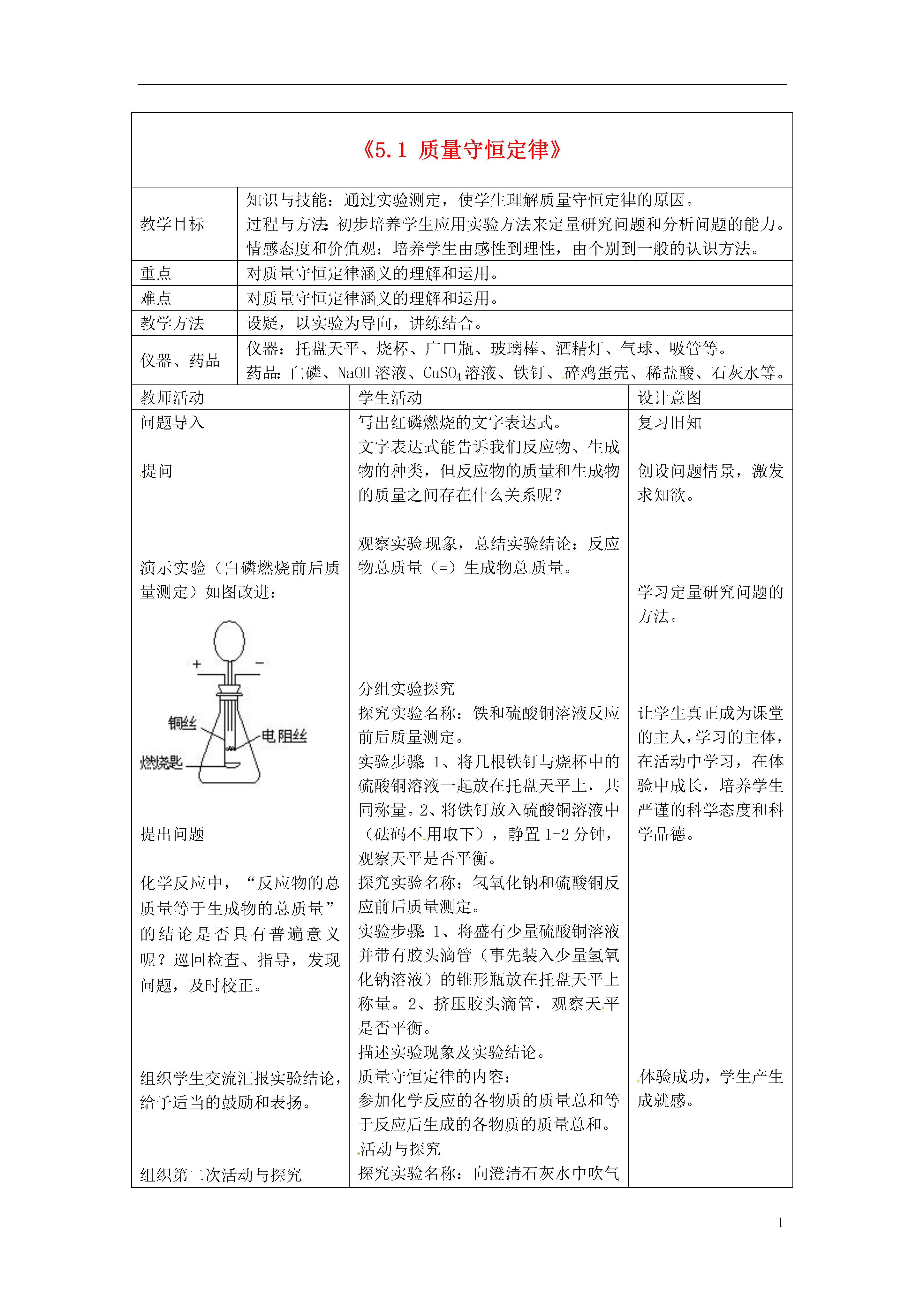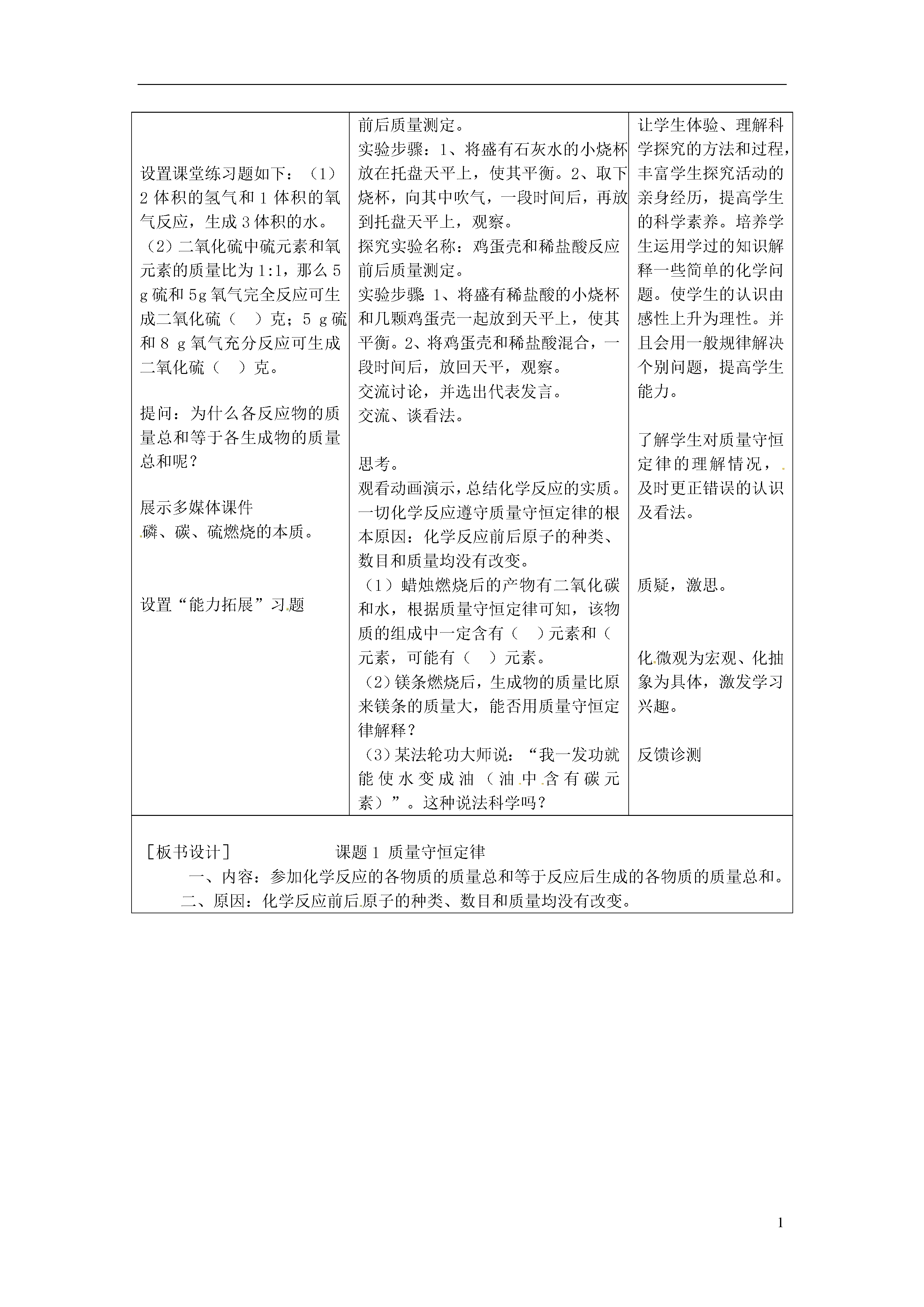 1《5.1质量守恒定律》教学目标知识与技能:通过实验测定,使学生理解质量守恒定律的原因。过程与方法:初步培养学生应用实验方法来定量研究问题和分析问题的能力。情感态度和价值观:培养学生由感性到理性,由个别到一般的认识方法。重点对质量守恒定律涵义的理解和运用。难点对质量守恒定律涵义的理解和运用。教学方法设疑,以实验为导向,讲练结合。仪器、药品仪器:托盘天平、烧杯、广口瓶、玻璃棒、酒精灯、气球、吸管等。药品:白磷、NaOH溶液、CuSO4溶液、铁钉、碎鸡蛋壳、稀盐酸、石灰水等。教师活动学生活动设计意图问题导入提问演示实验(白磷燃烧前后质量测定)如图改进:提出问题化学反应中,“反应物的总质量等于生成物的总质量”的结论是否具有普遍意义呢?巡回检查、指导,发现问题,及时校正。组织学生交流汇报实验结论,给予适当的鼓励和表扬。组织第二次活动与探究设置课堂练习题如下:(1)2体积的氢气和1体积的氧气反应,生成3体积的水。(2)二氧化硫中硫元素和氧元素的质量比为1:1,那么5g硫和5g氧气完全反应可生成二氧化硫()克;5g硫和8g氧气充分反应可生成二氧化硫()克。提问:为什么各反应物的质量总和等于各生成物的质量总和呢?展示多媒体课件磷、碳、硫燃烧的本质。设置“能力拓展”习题写出红磷燃烧的文字表达式。文字表达式能告诉我们反应物、生成物的种类,但反应物的质量和生成物的质量之间存在什么关系呢?观察实验现象,总结实验结论:反应物总质量(=)生成物总质量。分组实验探究探究实验名称:铁和硫酸铜溶液反应前后质量测定。实验步骤:1、将几根铁钉与烧杯中的硫酸铜溶液一起放在托盘天平上,共同称量。2、将铁钉放入硫酸铜溶液中(砝码不用取下),静置1-2分钟,观察天平是否平衡。探究实验名称:氢氧化钠和硫酸铜反应前后质量测定。实验步骤:1、将盛有少量硫酸铜溶液并带有胶头滴管(事先装入少量氢氧化钠溶液)的锥形瓶放在托盘天平上称量。2、挤压胶头滴管,观察天平是否平衡。描述实验现象及实验结论。质量守恒定律的内容:参加化学反应的各物质的质量总和等于反应后生成的各物质的质量总和。活动与探究探究实验名称:向澄清石灰水中吹气前后质量测定。实验步骤:1、将盛有石灰水的小烧杯放在托盘天平上,使其平衡。2、取下烧杯,向其中吹气,一段时间后,再放到托盘天平上,观察。探究实验名称:鸡蛋壳和稀盐酸反应前后质量测定。实验步骤:1、将盛有稀盐酸的小烧杯和几颗鸡蛋壳一起放到天平上,使其平衡。2、将鸡蛋壳和稀盐酸混合,一段时间后,放回天平,观察。交流讨论,并选出代表发言。交流、谈看法。思考。观看动画演示,总结化学反应的实质。一切化学反应遵守质量守恒定律的根本原因:化学反应前后原子的种类、数目和质量均没有改变。(1)蜡烛燃烧后的产物有二氧化碳和水,根据质量守恒定律可知,该物质的组成中一定含有()元素和()元素,可能有()元素。(2)镁条燃烧后,生成物的质量比原来镁条的质量大,能否用质量守恒定律解释?(3)某法轮功大师说:“我一发功就能使水变成油(油中含有碳元素)”。这种说法科学吗?复习旧知创设问题情景,激发求知欲。学习定量研究问题的方法。让学生真正成为课堂的主人,学习的主体,在活动中学习,在体验中成长,培养学生严谨的科学态度和科学品德。体验成功,学生产生成就感。让学生体验、理解科学探究的方法和过程,丰富学生探究活动的亲身经历,提高学生的科学素养。培养学生运用学过的知识解释一些简单的化学问题。使学生的认识由感性上升为理性。并且会用一般规律解决个别问题,提高学生能力。了解学生对质量守恒定律的理解情况,及时更正错误的认识及看法。质疑,激思。化微观为宏观、化抽象为具体,激发学习兴趣。反馈诊测[板书设计]课题1质量守恒定律一、内容:参加化学反应的各物质的质量总和等于反应后生成的各物质的质量总和。二、原因:化学反应前后原子的种类、数目和质量均没有改变。3《5.2如何正确书写化学方程式》教学目标1.通过具体化学反应分析,使学生理解化学方程式的涵义。2.理解书写化学方程式要遵守的两条原则,能初步掌握用最小公倍数法配平化学方程式的方法。重点和难点1.重点是正确书写化学方程式。2.难点是化学方程式的配平方法。教学方法讲练结合,配合阅读。教学过程【复习提问】1.什么是质量守恒定律?2.为什么在化学反应前后,各物质的质量总和必然是相等的呢?(用原子、分子的观点说明。)〔引言〕我们已经知道质量守恒定律,那么在化学上有没有一种式子,既能表示出反应物和生成物是什么,又能反映出遵循质量守恒定律