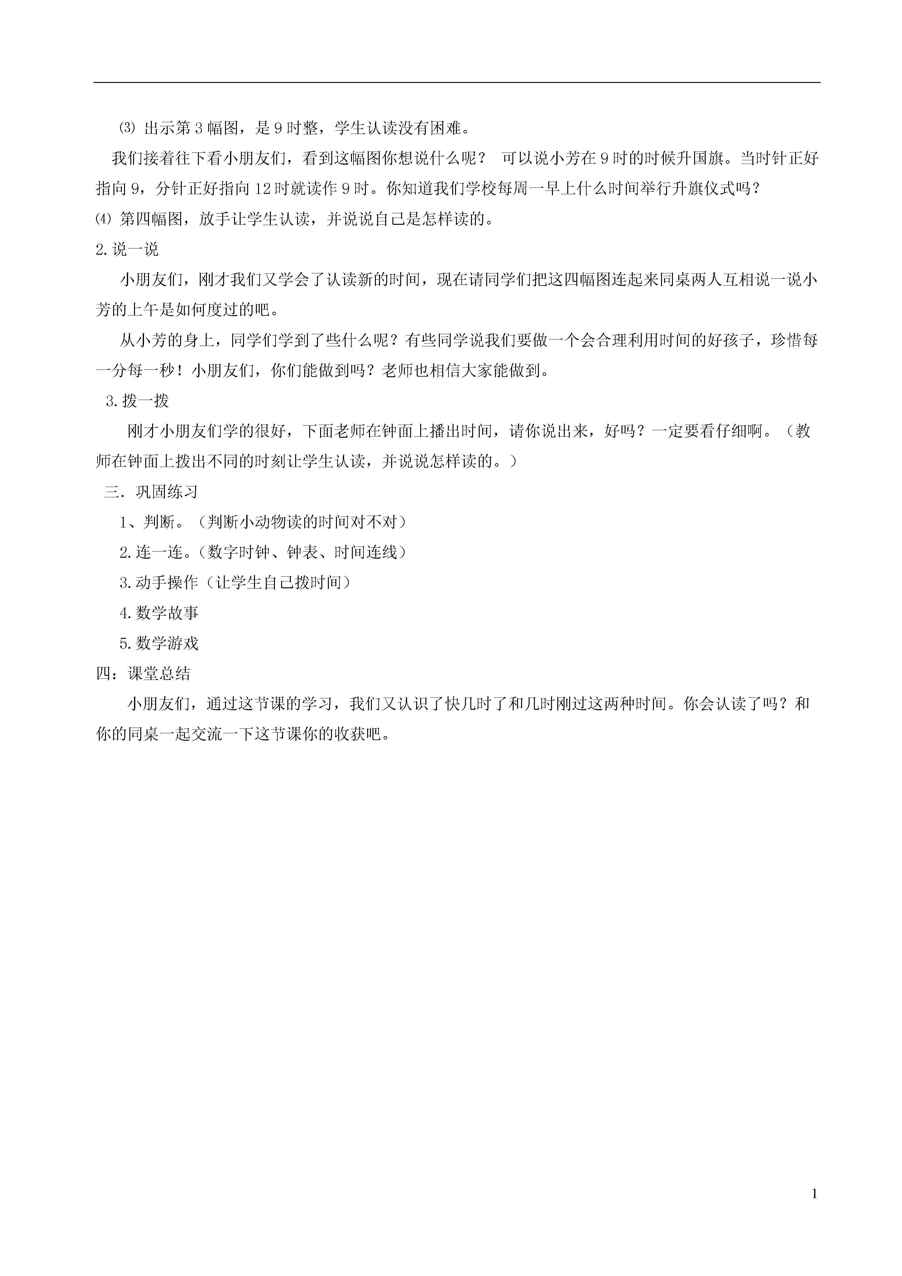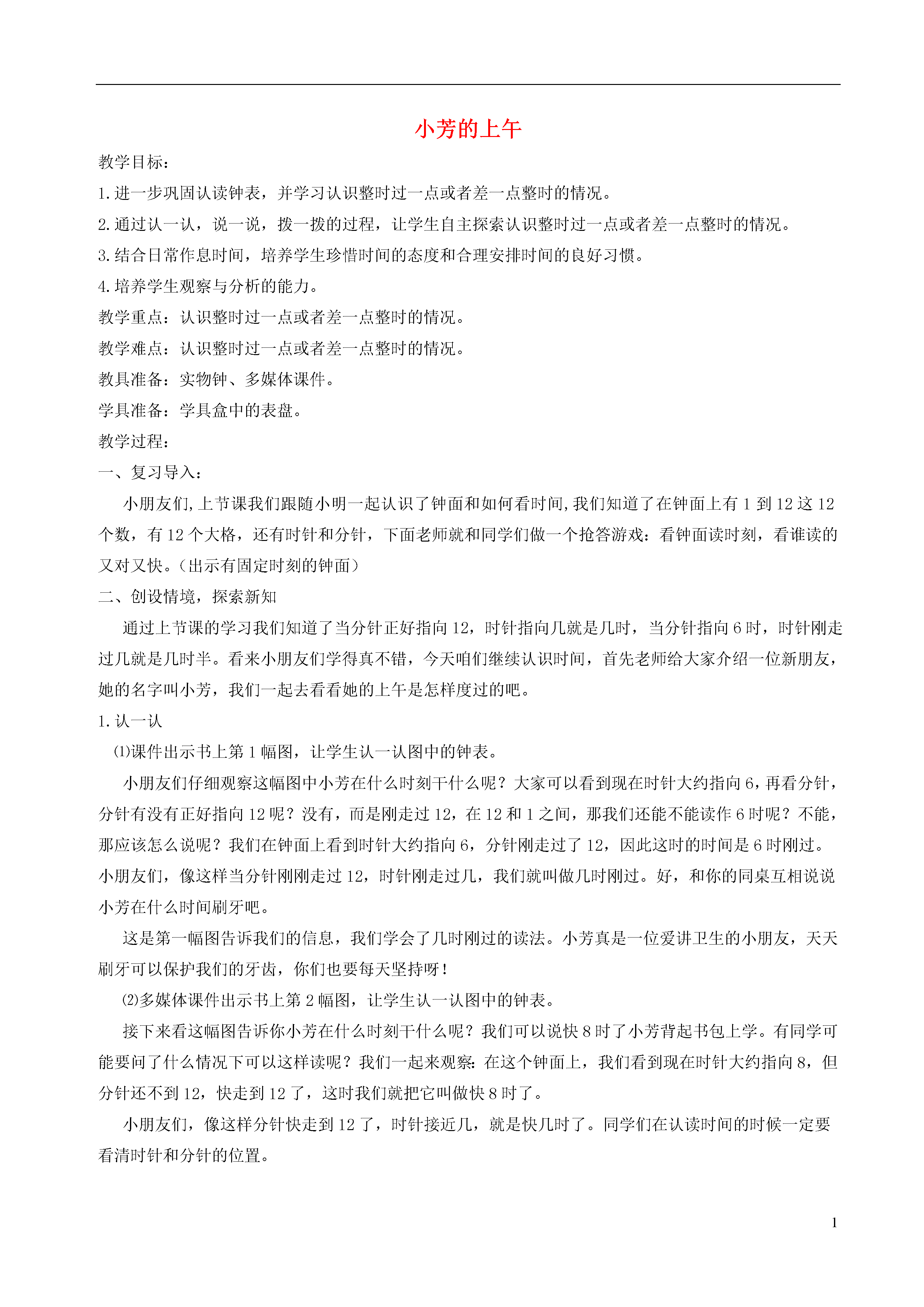 1小芳的上午教学目标:1.进一步巩固认读钟表,并学习认识整时过一点或者差一点整时的情况。2.通过认一认,说一说,拨一拨的过程,让学生自主探索认识整时过一点或者差一点整时的情况。3.结合日常作息时间,培养学生珍惜时间的态度和合理安排时间的良好习惯。4.培养学生观察与分析的能力。教学重点:认识整时过一点或者差一点整时的情况。教学难点:认识整时过一点或者差一点整时的情况。教具准备:实物钟、多媒体课件。学具准备:学具盒中的表盘。教学过程:一、复习导入:小朋友们,上节课我们跟随小明一起认识了钟面和如何看时间,我们知道了在钟面上有1到12这12个数,有12个大格,还有时针和分针,下面老师就和同学们做一个抢答游戏:看钟面读时刻,看谁读的又对又快。(出示有固定时刻的钟面)二、创设情境,探索新知通过上节课的学习我们知道了当分针正好指向12,时针指向几就是几时,当分针指向6时,时针刚走过几就是几时半。看来小朋友们学得真不错,今天咱们继续认识时间,首先老师给大家介绍一位新朋友,她的名字叫小芳,我们一起去看看她的上午是怎样度过的吧。1.认一认⑴课件出示书上第1幅图,让学生认一认图中的钟表。小朋友们仔细观察这幅图中小芳在什么时刻干什么呢?大家可以看到现在时针大约指向6,再看分针,分针有没有正好指向12呢?没有,而是刚走过12,在12和1之间,那我们还能不能读作6时呢?不能,那应该怎么说呢?我们在钟面上看到时针大约指向6,分针刚走过了12,因此这时的时间是6时刚过。小朋友们,像这样当分针刚刚走过12,时针刚走过几,我们就叫做几时刚过。好,和你的同桌互相说说小芳在什么时间刷牙吧。这是第一幅图告诉我们的信息,我们学会了几时刚过的读法。小芳真是一位爱讲卫生的小朋友,天天刷牙可以保护我们的牙齿,你们也要每天坚持呀!⑵多媒体课件出示书上第2幅图,让学生认一认图中的钟表。接下来看这幅图告诉你小芳在什么时刻干什么呢?我们可以说快8时了小芳背起书包上学。有同学可能要问了什么情况下可以这样读呢?我们一起来观察:在这个钟面上,我们看到现在时针大约指向8,但分针还不到12,快走到12了,这时我们就把它叫做快8时了。小朋友们,像这样分针快走到12了,时针接近几,就是快几时了。同学们在认读时间的时候一定要看清时针和分针的位置。⑶出示第3幅图,是9时整,学生认读没有困难。我们接着往下看小朋友们,看到这幅图你想说什么呢?可以说小芳在9时的时候升国旗。当时针正好指向9,分针正好指向12时就读作9时。你知道我们学校每周一早上什么时间举行升旗仪式吗?⑷第四幅图,放手让学生认读,并说说自己是怎样读的。2.说一说小朋友们,刚才我们又学会了认读新的时间,现在请同学们把这四幅图连起来同桌两人互相说一说小芳的上午是如何度过的吧。从小芳的身上,同学们学到了些什么呢?有些同学说我们要做一个会合理利用时间的好孩子,珍惜每一分每一秒!小朋友们,你们能做到吗?老师也相信大家能做到。3.拨一拨刚才小朋友们学的很好,下面老师在钟面上播出时间,请你说出来,好吗?一定要看仔细啊。(教师在钟面上拨出不同的时刻让学生认读,并说说怎样读的。)三.巩固练习1、判断。(判断小动物读的时间对不对)2.连一连。(数字时钟、钟表、时间连线)3.动手操作(让学生自己拨时间)4.数学故事5.数学游戏四:课堂总结小朋友们,通过这节课的学习,我们又认识了快几时了和几时刚过这两种时间。你会认读了吗?和你的同桌一起交流一下这节课你的收获吧。