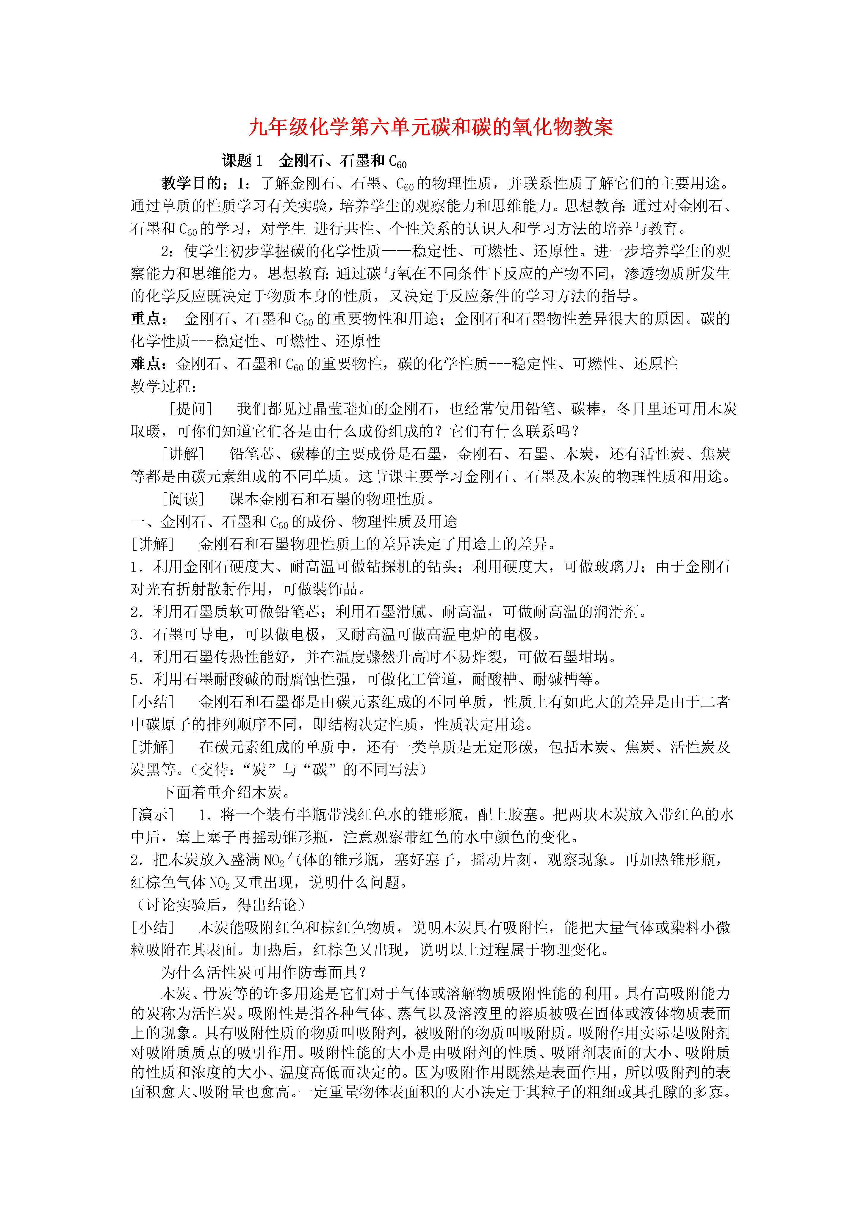 九年级化学第六单元碳和碳的氧化物教案课题1金刚石、石墨和C60教学目的;1:了解金刚石、石墨、C60的物理性质,并联系性质了解它们的主要用途。通过单质的性质学习有关实验,培养学生的观察能力和思维能力。思想教育:通过对金刚石、石墨和C60的学习,对学生进行共性、个性关系的认识人和学习方法的培养与教育。2:使学生初步掌握碳的化学性质——稳定性、可燃性、还原性。进一步培养学生的观察能力和思维能力。思想教育:通过碳与氧在不同条件下反应的产物不同,渗透物质所发生的化学反应既决定于物质本身的性质,又决定于反应条件的学习方法的指导。重点:金刚石、石墨和C60的重要物性和用途;金刚石和石墨物性差异很大的原因。碳的化学性质---稳定性、可燃性、还原性难点:金刚石、石墨和C60的重要物性,碳的化学性质---稳定性、可燃性、还原性教学过程:[提问]我们都见过晶莹璀灿的金刚石,也经常使用铅笔、碳棒,冬日里还可用木炭取暖,可你们知道它们各是由什么成份组成的?它们有什么联系吗?[讲解]铅笔芯、碳棒的主要成份是石墨,金刚石、石墨、木炭,还有活性炭、焦炭等都是由碳元素组成的不同单质。这节课主要学习金刚石、石墨及木炭的物理性质和用途。[阅读]课本金刚石和石墨的物理性质。一、金刚石、石墨和C60的成份、物理性质及用途[讲解]金刚石和石墨物理性质上的差异决定了用途上的差异。1.利用金刚石硬度大、耐高温可做钻探机的钻头;利用硬度大,可做玻璃刀;由于金刚石对光有折射散射作用,可做装饰品。2.利用石墨质软可做铅笔芯;利用石墨滑腻、耐高温,可做耐高温的润滑剂。3.石墨可导电,可以做电极,又耐高温可做高温电炉的电极。4.利用石墨传热性能好,并在温度骤然升高时不易炸裂,可做石墨坩埚。5.利用石墨耐酸碱的耐腐蚀性强,可做化工管道,耐酸槽、耐碱槽等。[小结]金刚石和石墨都是由碳元素组成的不同单质,性质上有如此大的差异是由于二者中碳原子的排列顺序不同,即结构决定性质,性质决定用途。[讲解]在碳元素组成的单质中,还有一类单质是无定形碳,包括木炭、焦炭、活性炭及炭黑等。(交待:“炭”与“碳”的不同写法)下面着重介绍木炭。[演示]1.将一个装有半瓶带浅红色水的锥形瓶,配上胶塞。把两块木炭放入带红色的水中后,塞上塞子再摇动锥形瓶,注意观察带红色的水中颜色的变化。2.把木炭放入盛满NO2气体的锥形瓶,塞好塞子,摇动片刻,观察现象。再加热锥形瓶,红棕色气体NO2又重出现,说明什么问题。(讨论实验后,得出结论)[小结]木炭能吸附红色和棕红色物质,说明木炭具有吸附性,能把大量气体或染料小微粒吸附在其表面。加热后,红棕色又出现,说明以上过程属于物理变化。为什么活性炭可用作防毒面具?木炭、骨炭等的许多用途是它们对于气体或溶解物质吸附性能的利用。具有高吸附能力的炭称为活性炭。吸附性是指各种气体、蒸气以及溶液里的溶质被吸在固体或液体物质表面上的现象。具有吸附性质的物质叫吸附剂,被吸附的物质叫吸附质。吸附作用实际是吸附剂对吸附质质点的吸引作用。吸附性能的大小是由吸附剂的性质、吸附剂表面的大小、吸附质的性质和浓度的大小、温度高低而决定的。因为吸附作用既然是表面作用,所以吸附剂的表面积愈大、吸附量也愈高。一定重量物体表面积的大小决定于其粒子的粗细或其孔隙的多寡。棱长1cm的立方体如分裂为棱长1mm的立方粒子,面积就由6cm2增大为6000m2。活性炭由于孔性充分发展,1g中的总面积可达7000m2。故粉末状和多孔性活性炭常有很高的吸附能力。防毒面具主要分面罩、呼吸管和滤毒罐三部分。滤毒罐里起主要作用的有活性炭层、化学吸附层和防烟滤层。在不同滤毒罐里各层排列顺序不尽相同。活性炭层主要用于吸附毒气。由于活性炭具有巨大的表面积,吸附能力很强,所以用于防毒面具。活性炭与防毒面具防毒面具作为一种防御性的保护器具问世几十年来,不仅广泛应用于军事上,而且也是我们科学实验在某险恶环境中从事工作的一个不可缺少的工具。说起它的诞生,还有一段有趣的故事呢!早在第一次世界大战的1915年,欧洲各参战国军事力量相差无几,使战争表面上处于相持状态。德帝国主义为了在军事上取得进展,首先在战场上施放了一种有毒气体--氯气,使英法两国军队吃亏不小。为了惩罚德军的这种行径,英法两国就以同样的方法"回敬"了德军,一时间整个欧洲战场毒气滚滚,一场化学战就这样开始了。怎样使自己的士兵不被毒气伤害而更有效地消灭敌人呢?这一严重而又急迫的问题摆在各国军队的指挥者面前。能否找到一种物质来同时对付多种毒气以减轻士兵的负担而赢得战争的胜利呢?各国化学家都在致力研究。俄国化学家谢宁斯基首先想到了制糖工业中用来吸附杂质和色素的木炭。他冒着生命危险进行了实验。他用装有木炭的布包堵住自己的呼吸道,钻进充满氯气和光