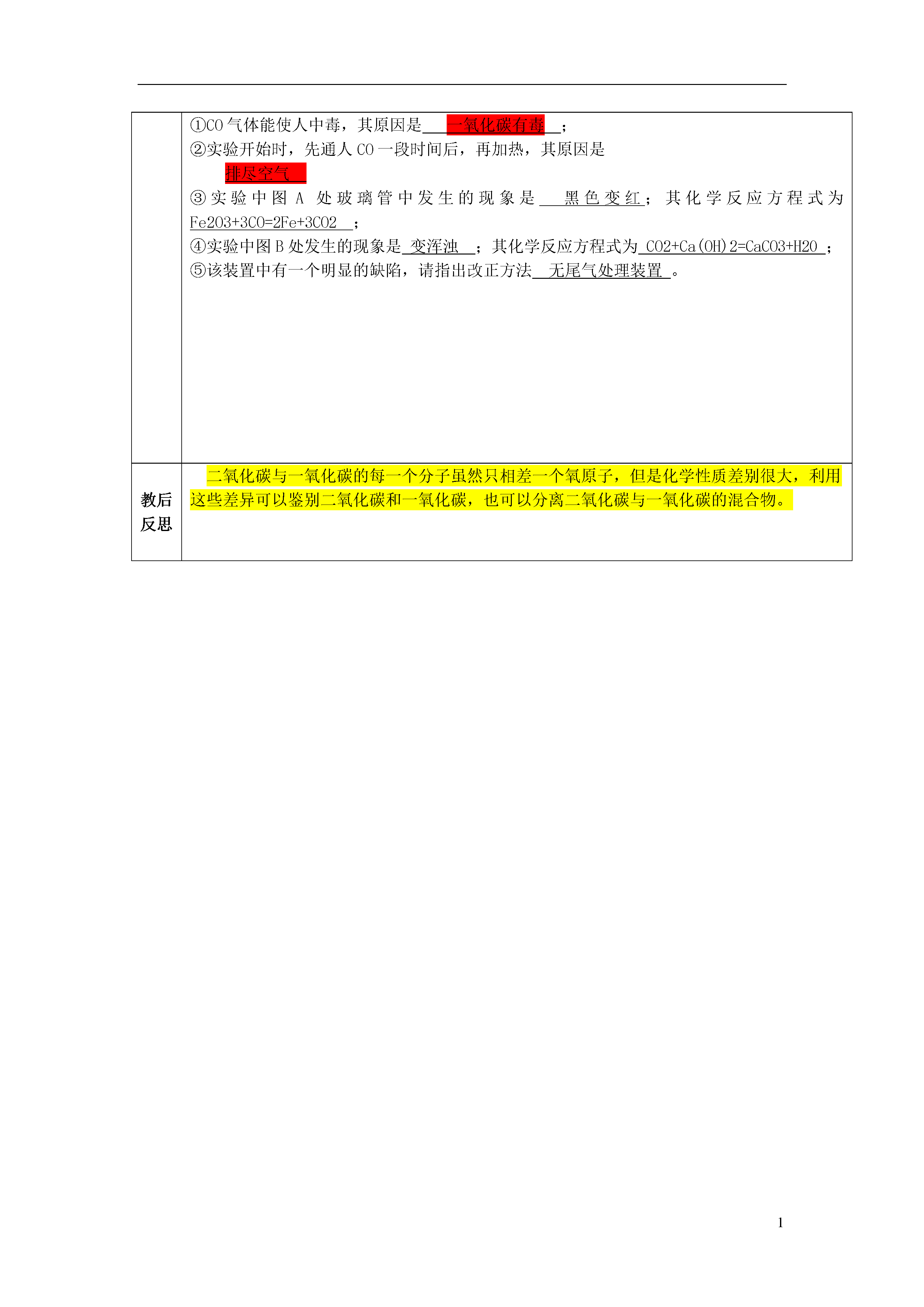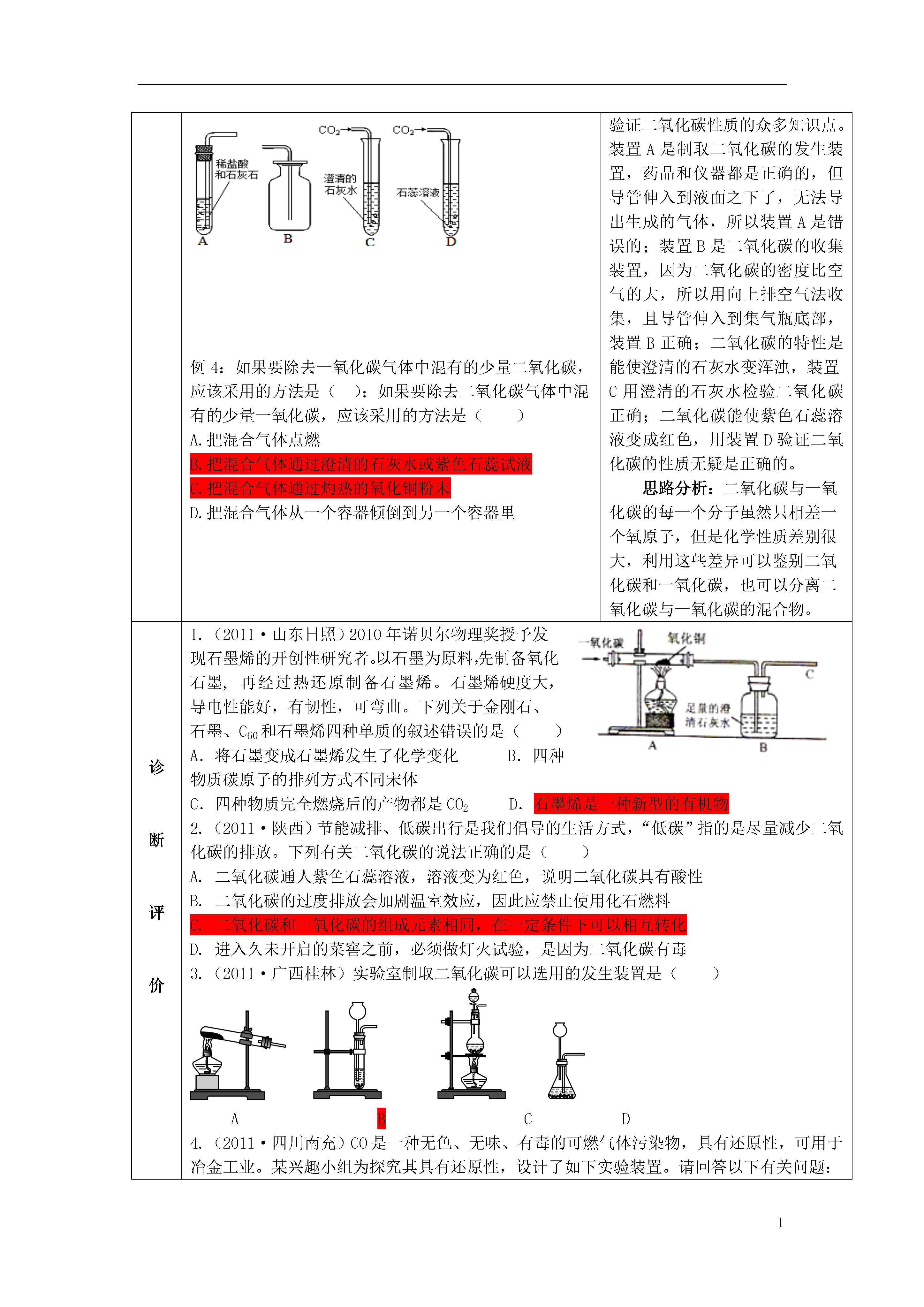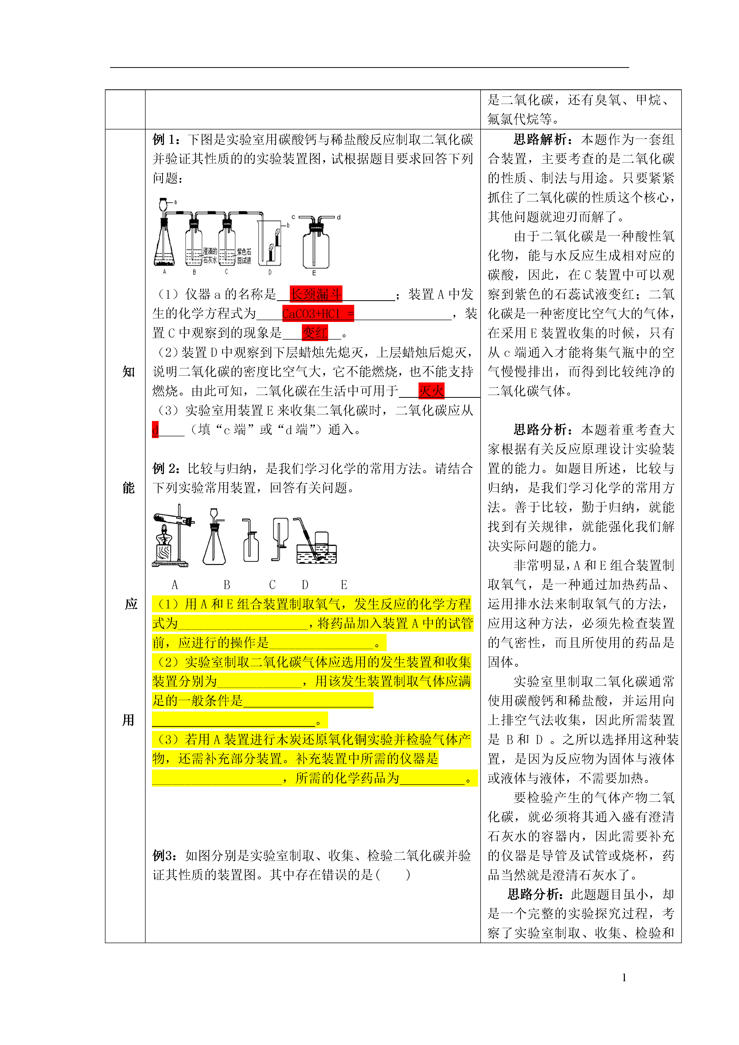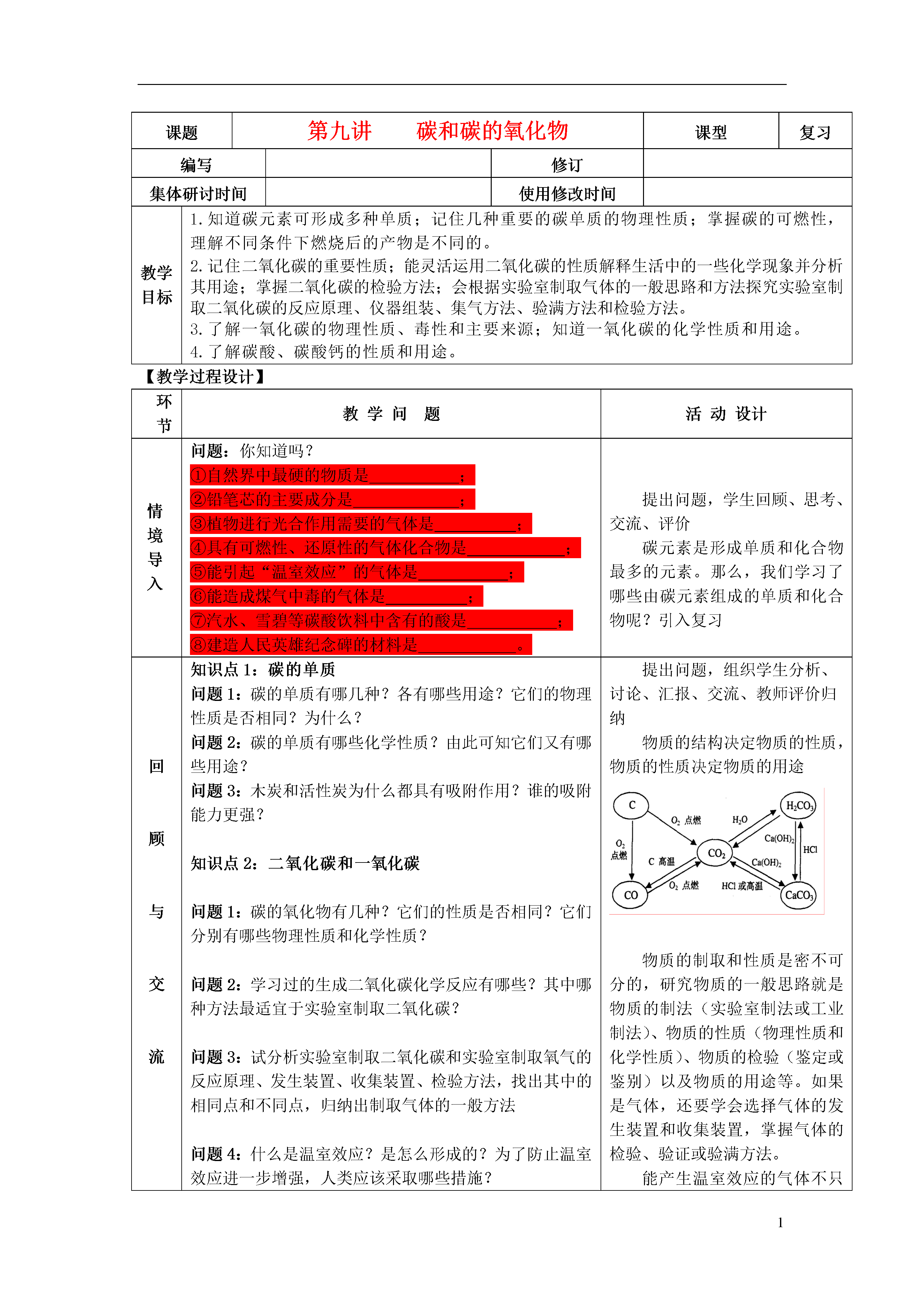 1课题第九讲碳和碳的氧化物课型复习编写修订集体研讨时间使用修改时间教学目标1.知道碳元素可形成多种单质;记住几种重要的碳单质的物理性质;掌握碳的可燃性,理解不同条件下燃烧后的产物是不同的。2.记住二氧化碳的重要性质;能灵活运用二氧化碳的性质解释生活中的一些化学现象并分析其用途;掌握二氧化碳的检验方法;会根据实验室制取气体的一般思路和方法探究实验室制取二氧化碳的反应原理、仪器组装、集气方法、验满方法和检验方法。3.了解一氧化碳的物理性质、毒性和主要来源;知道一氧化碳的化学性质和用途。4.了解碳酸、碳酸钙的性质和用途。【教学过程设计】环节教学问题活动设计情境导入问题:你知道吗?①自然界中最硬的物质是;②铅笔芯的主要成分是;③植物进行光合作用需要的气体是;④具有可燃性、还原性的气体化合物是;⑤能引起“温室效应”的气体是;⑥能造成煤气中毒的气体是;⑦汽水、雪碧等碳酸饮料中含有的酸是;⑧建造人民英雄纪念碑的材料是。提出问题,学生回顾、思考、交流、评价碳元素是形成单质和化合物最多的元素。那么,我们学习了哪些由碳元素组成的单质和化合物呢?引入复习回顾与交流知识点1:碳的单质问题1:碳的单质有哪几种?各有哪些用途?它们的物理性质是否相同?为什么?问题2:碳的单质有哪些化学性质?由此可知它们又有哪些用途?问题3:木炭和活性炭为什么都具有吸附作用?谁的吸附能力更强?知识点2:二氧化碳和一氧化碳问题1:碳的氧化物有几种?它们的性质是否相同?它们分别有哪些物理性质和化学性质?问题2:学习过的生成二氧化碳化学反应有哪些?其中哪种方法最适宜于实验室制取二氧化碳?问题3:试分析实验室制取二氧化碳和实验室制取氧气的反应原理、发生装置、收集装置、检验方法,找出其中的相同点和不同点,归纳出制取气体的一般方法问题4:什么是温室效应?是怎么形成的?为了防止温室效应进一步增强,人类应该采取哪些措施?提出问题,组织学生分析、讨论、汇报、交流、教师评价归纳物质的结构决定物质的性质,物质的性质决定物质的用途物质的制取和性质是密不可分的,研究物质的一般思路就是物质的制法(实验室制法或工业制法)、物质的性质(物理性质和化学性质)、物质的检验(鉴定或鉴别)以及物质的用途等。如果是气体,还要学会选择气体的发生装置和收集装置,掌握气体的检验、验证或验满方法。能产生温室效应的气体不只是二氧化碳,还有臭氧、甲烷、氟氯代烷等。知能应用例1:下图是实验室用碳酸钙与稀盐酸反应制取二氧化碳并验证其性质的的实验装置图,试根据题目要求回答下列问题:(1)仪器a的名称是长颈漏斗;装置A中发生的化学方程式为CaCO3+HCl=,装置C中观察到的现象是变红。(2)装置D中观察到下层蜡烛先熄灭,上层蜡烛后熄灭,说明二氧化碳的密度比空气大,它不能燃烧,也不能支持燃烧。由此可知,二氧化碳在生活中可用于灭火。(3)实验室用装置E来收集二氧化碳时,二氧化碳应从d(填“c端”或“d端”)通入。例2:比较与归纳,是我们学习化学的常用方法。请结合下列实验常用装置,回答有关问题。ABCDE(1)用A和E组合装置制取氧气,发生反应的化学方程式为____________________,将药品加入装置A中的试管前,应进行的操作是________________。(2)实验室制取二氧化碳气体应选用的发生装置和收集装置分别为_____________,用该发生装置制取气体应满足的一般条件是。(3)若用A装置进行木炭还原氧化铜实验并检验气体产物,还需补充部分装置。补充装置中所需的仪器是____________________,所需的化学药品为。例3:如图分别是实验室制取、收集、检验二氧化碳并验证其性质的装置图。其中存在错误的是()例4:如果要除去一氧化碳气体中混有的少量二氧化碳,应该采用的方法是();如果要除去二氧化碳气体中混有的少量一氧化碳,应该采用的方法是()A.把混合气体点燃B.把混合气体通过澄清的石灰水或紫色石蕊试液C.把混合气体通过灼热的氧化铜粉末D.把混合气体从一个容器倾倒到另一个容器里思路解析:本题作为一套组合装置,主要考查的是二氧化碳的性质、制法与用途。只要紧紧抓住了二氧化碳的性质这个核心,其他问题就迎刃而解了。由于二氧化碳是一种酸性氧化物,能与水反应生成相对应的碳酸,因此,在C装置中可以观察到紫色的石蕊试液变红;二氧化碳是一种密度比空气大的气体,在采用E装置收集的时候,只有从c端通入才能将集气瓶中的空气慢慢排出,而得到比较纯净的二氧化碳气体。思