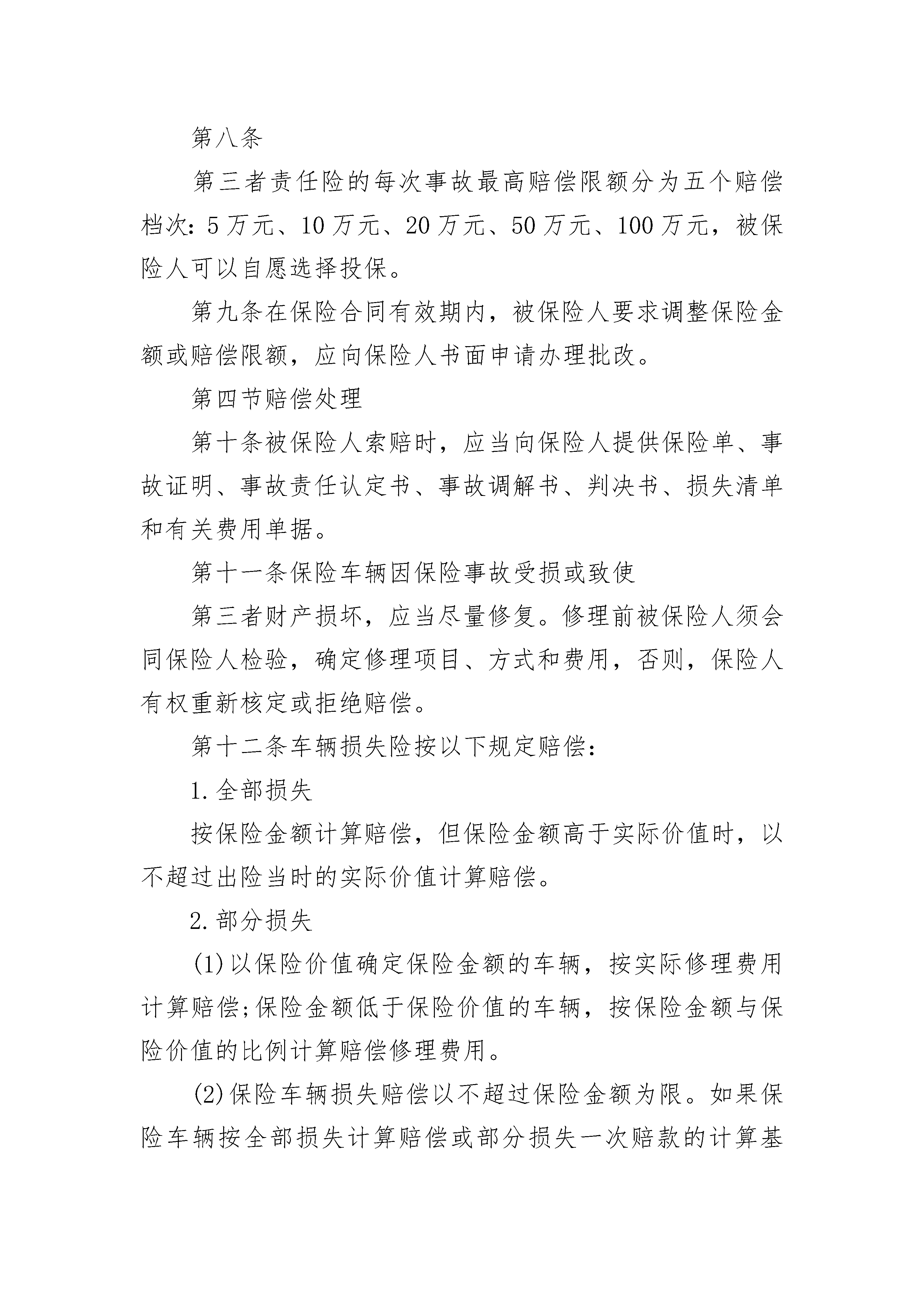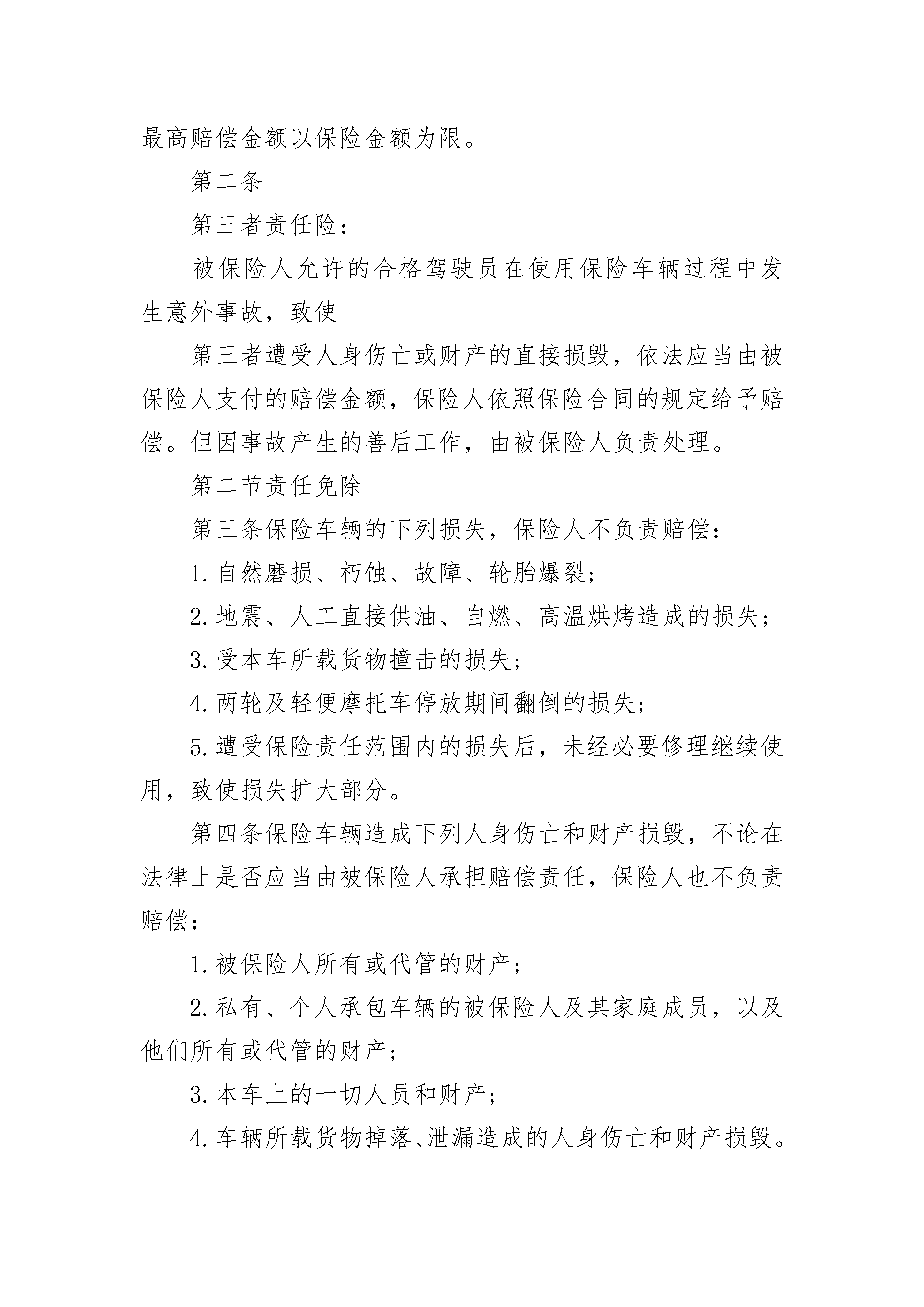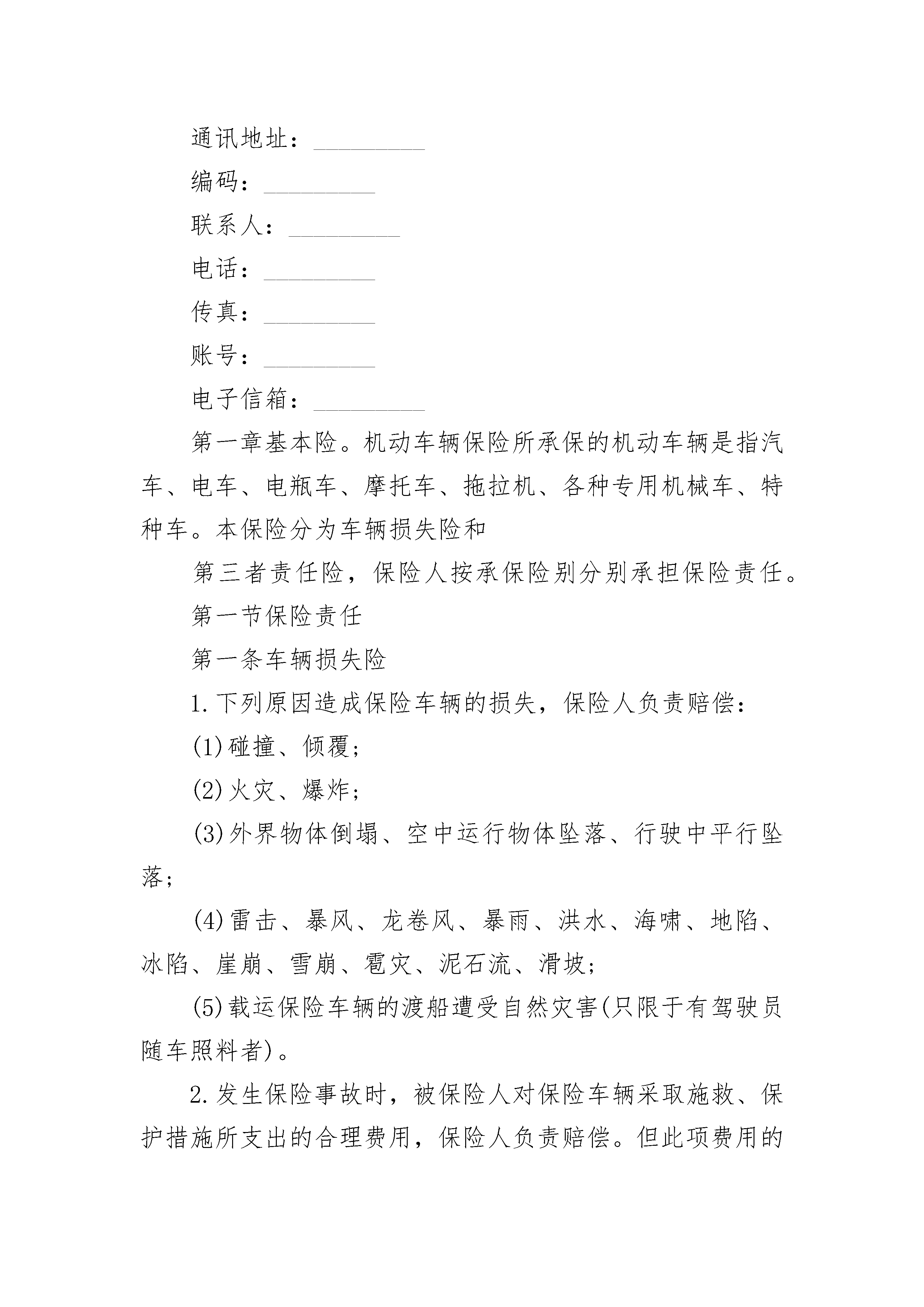 车辆保险合同范文车辆保险合同范文(精选13篇)车辆保险合同范文篇1合同编号:_________保险人:_________注册地址:_________法定代表人:_________职务:_________委托代理人:_________身份证号码:_________通讯地址:_________编码:_________联系人:_________电话:_________传真:_________账号:_________电子信箱:_________被保险人:_________注册地址:_________法定代表人:_________职务:_________委托代理人:_________身份证号码:_________通讯地址:_________编码:_________联系人:_________电话:_________传真:_________账号:_________电子信箱:_________第一章基本险。机动车辆保险所承保的机动车辆是指汽车、电车、电瓶车、摩托车、拖拉机、各种专用机械车、特种车。本保险分为车辆损失险和第三者责任险,保险人按承保险别分别承担保险责任。第一节保险责任第一条车辆损失险1.下列原因造成保险车辆的损失,保险人负责赔偿:(1)碰撞、倾覆;(2)火灾、爆炸;(3)外界物体倒塌、空中运行物体坠落、行驶中平行坠落;(4)雷击、暴风、龙卷风、暴雨、洪水、海啸、地陷、冰陷、崖崩、雪崩、雹灾、泥石流、滑坡;(5)载运保险车辆的渡船遭受自然灾害(只限于有驾驶员随车照料者)。2.发生保险事故时,被保险人对保险车辆采取施救、保护措施所支出的合理费用,保险人负责赔偿。但此项费用的最高赔偿金额以保险金额为限。第二条第三者责任险:被保险人允许的合格驾驶员在使用保险车辆过程中发生意外事故,致使第三者遭受人身伤亡或财产的直接损毁,依法应当由被保险人支付的赔偿金额,保险人依照保险合同的规定给予赔偿。但因事故产生的善后工作,由被保险人负责处理。第二节责任免除第三条保险车辆的下列损失,保险人不负责赔偿:1.自然磨损、朽蚀、故障、轮胎爆裂;2.地震、人工直接供油、自燃、高温烘烤造成的损失;3.受本车所载货物撞击的损失;4.两轮及轻便摩托车停放期间翻倒的损失;5.遭受保险责任范围内的损失后,未经必要修理继续使用,致使损失扩大部分。第四条保险车辆造成下列人身伤亡和财产损毁,不论在法律上是否应当由被保险人承担赔偿责任,保险人也不负责赔偿:1.被保险人所有或代管的财产;2.私有、个人承包车辆的被保险人及其家庭成员,以及他们所有或代管的财产;3.本车上的一切人员和财产;4.车辆所载货物掉落、泄漏造成的人身伤亡和财产损毁。第五条下列原因造成保险车辆的损失或第三者的经济赔偿责任,保险人均不负责赔偿:1.战争、军事冲突、暴乱、扣押、罚没;2.竞赛、测试、进厂修理;3.驾驶员饮酒、吸毒、药物麻醉、无有效驾驶证;4.保险车辆拖带未保险车辆及其他拖带物或未保险车辆拖带保险车辆造成的损失;5.保险车辆肇事逃逸经公安部门侦破后;6.保险事故发生前,未按书面约定履行交纳保险费义务;7.保险车辆全车被盗窃、被抢劫、被抢夺,以及在此期间受到损坏或车上零部件、附属设备丢失,以及第三者人员伤亡或财产损失。第六条下列损失和费用,保险人不负责赔偿:1.保险车辆发生意外事故,致使被保险人或第三者停业、停驶、停电、停水、停气、停产、中断通讯以及其他各种间接损失;2.被保险人或其驾驶员的故意行为;3.因保险事故引起的任何有关精神损害赔偿;4.其他不属于保险责任范围内的损失和费用。第三节保险金额和赔偿限额第七条车辆的保险价值根据新车购置价确定。车辆损失险的保险金额可以按投保时保险价值或实际价值确定,也可以由被保险人与保险人协商确定,但保险金额不得超过保险价值,超过部分无效。第八条第三者责任险的每次事故最高赔偿限额分为五个赔偿档次:5万元、10万元、20万元、50万元、100万元,被保险人可以自愿选择投保。第九条在保险合同有效期内,被保险人要求调整保险金额或赔偿限额,应向保险人书面申请办理批改。第四节赔偿处理第十条被保险人索赔时,应当向保险人提供保险单、事故证明、事故责任认定书、事故调解书、判决书、损失清单和有关费用单据。第十一条保险车辆因保险事故受损或致使第三者财产损坏,应当尽量修复。修理前被保险人须会同保险人检验,确定修理项目、方式和费用,否则,保险人有权重新核定或拒绝赔偿。第十二条车辆损失险按以下规定赔偿:1.全部损失按保险金额计算赔偿,但保险金额高于实际价值时,以不超过出险当时的实际价值计算赔偿。2.部分损失(1)以保险价值确定保险金额的车辆,按实际修理费用计算赔偿;保险金额低于保险价值的车辆,按保险金额与保险价值的比例计算赔偿修理费用。(2)保险车辆损失赔偿以不超过保险金额为限。如果保险车辆