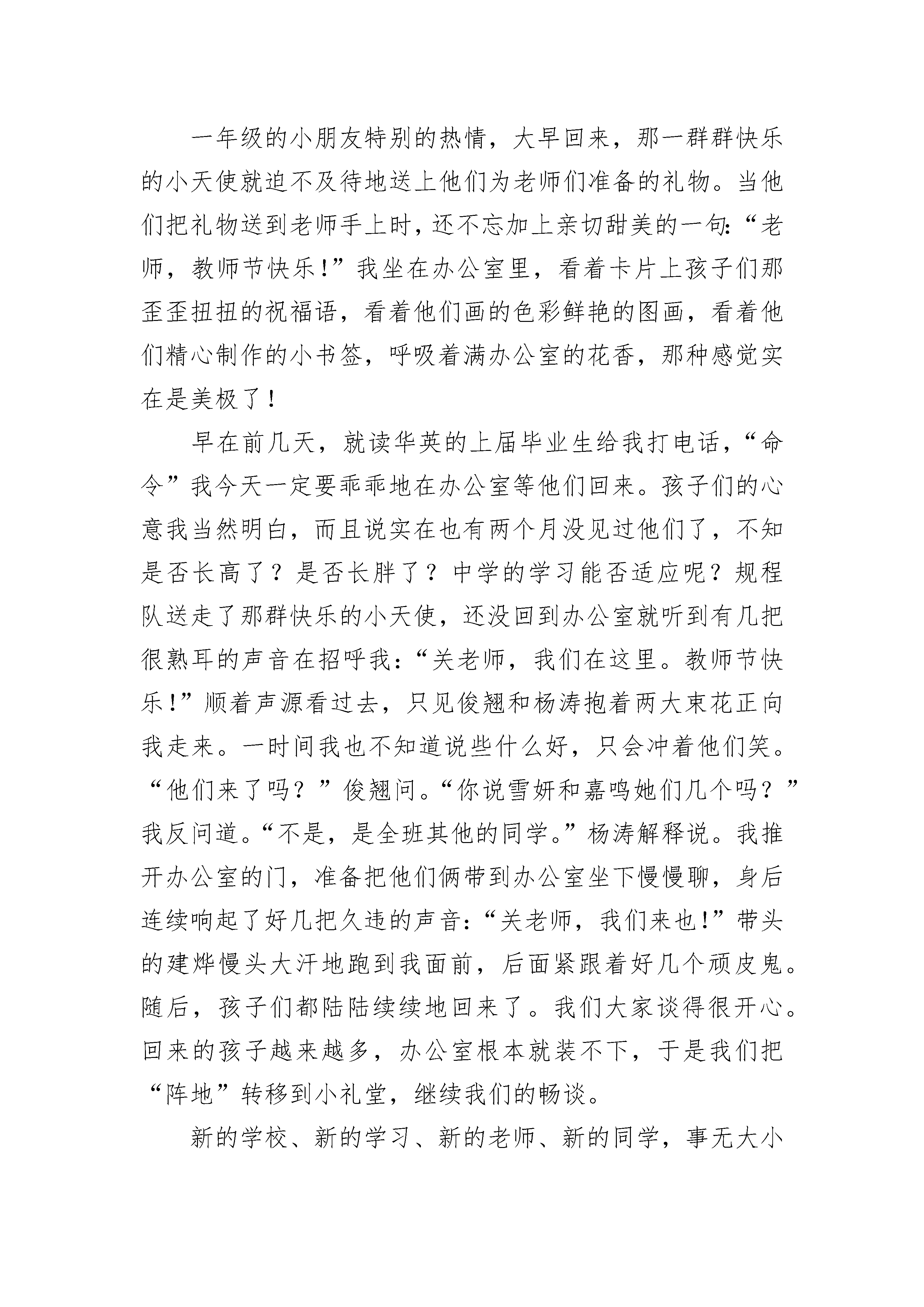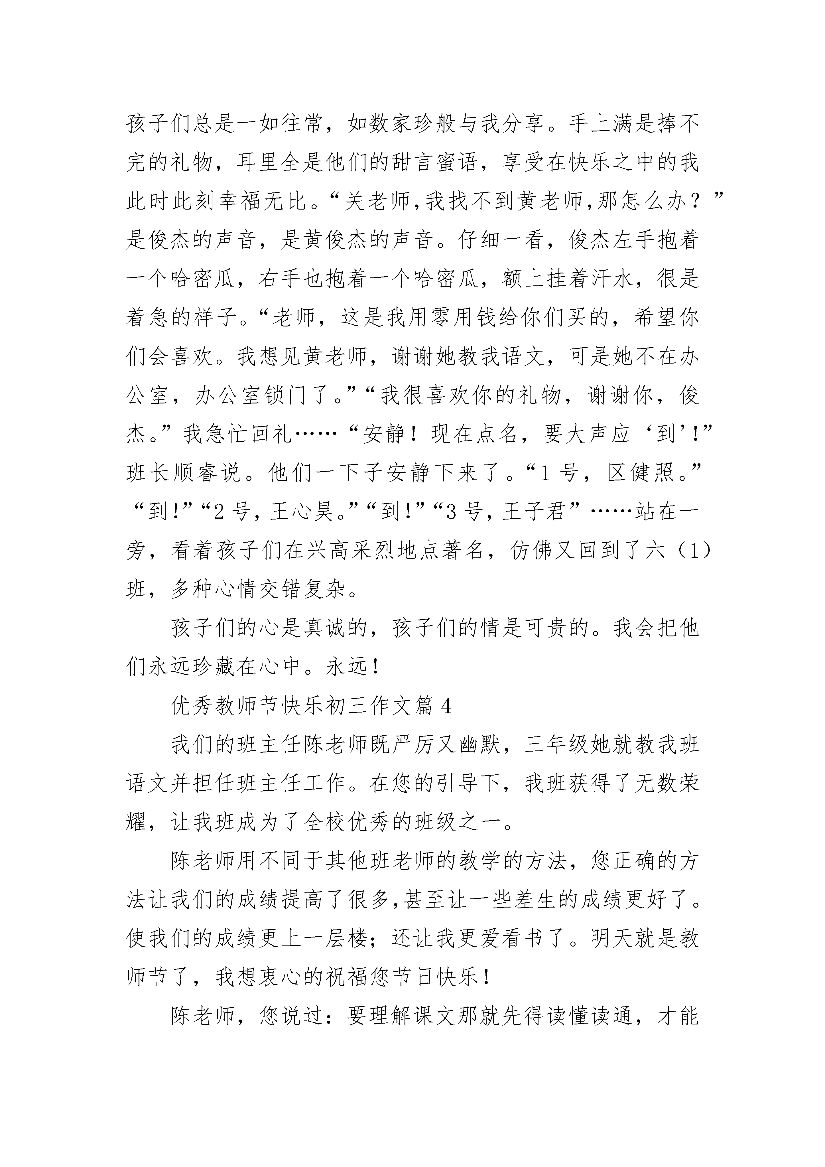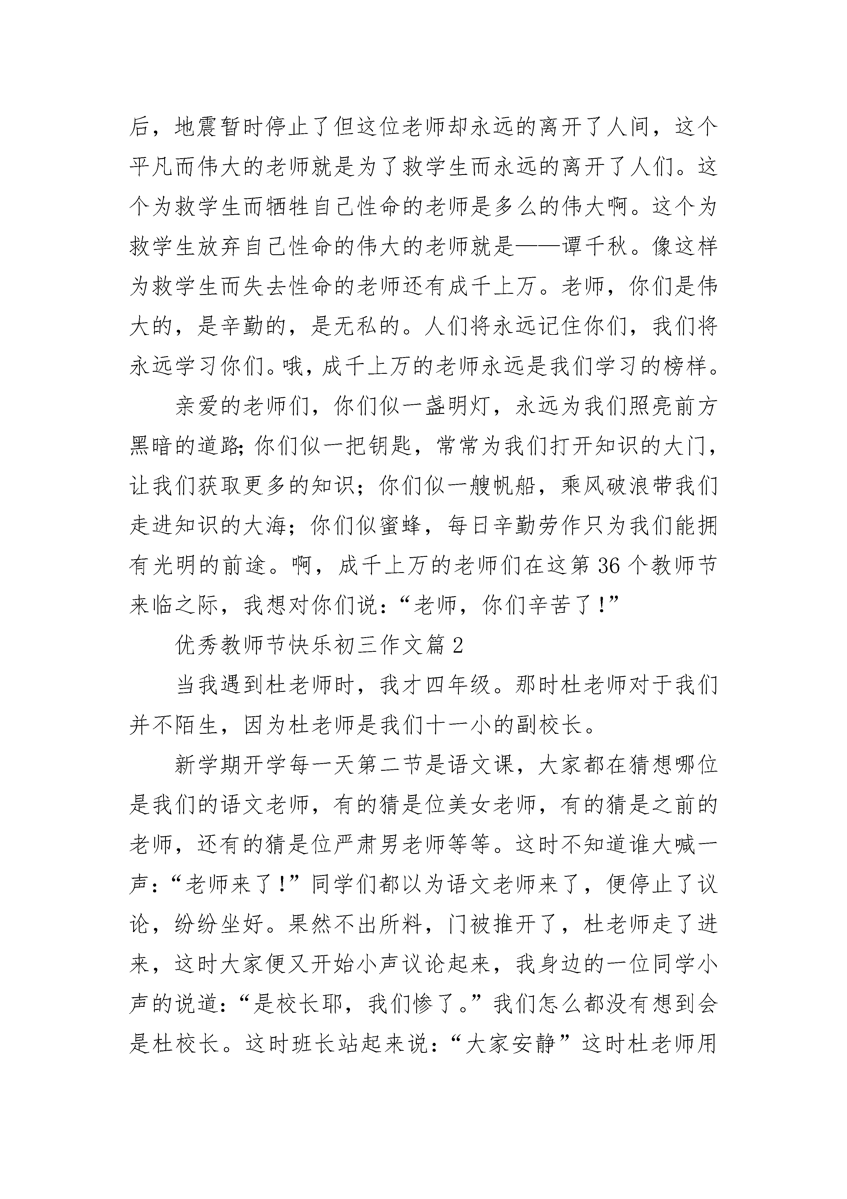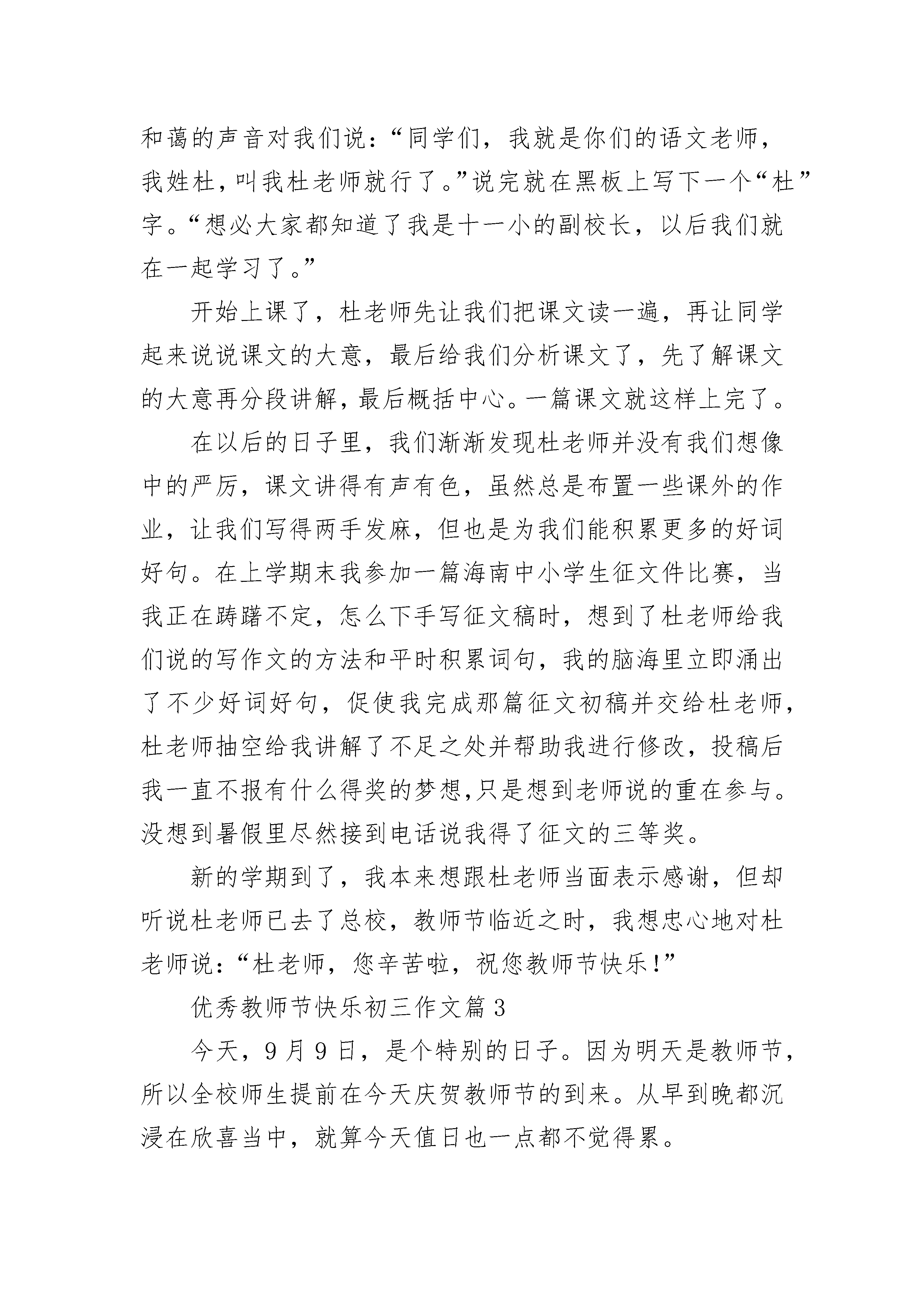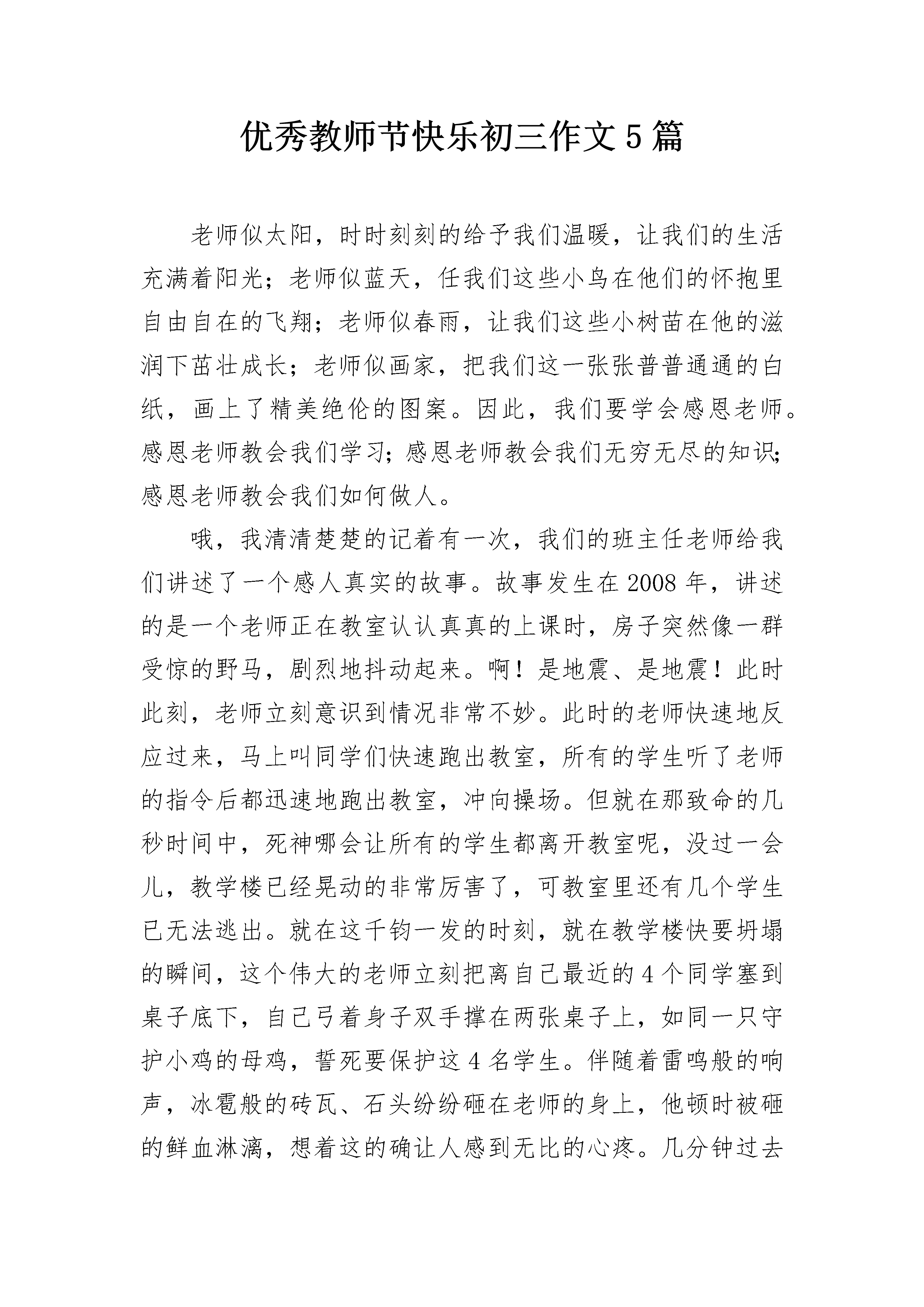 优秀教师节快乐初三作文5篇老师似太阳,时时刻刻的给予我们温暖,让我们的生活充满着阳光;老师似蓝天,任我们这些小鸟在他们的怀抱里自由自在的飞翔;老师似春雨,让我们这些小树苗在他的滋润下茁壮成长;老师似画家,把我们这一张张普普通通的白纸,画上了精美绝伦的图案。因此,我们要学会感恩老师。感恩老师教会我们学习;感恩老师教会我们无穷无尽的知识;感恩老师教会我们如何做人。哦,我清清楚楚的记着有一次,我们的班主任老师给我们讲述了一个感人真实的故事。故事发生在2008年,讲述的是一个老师正在教室认认真真的上课时,房子突然像一群受惊的野马,剧烈地抖动起来。啊!是地震、是地震!此时此刻,老师立刻意识到情况非常不妙。此时的老师快速地反应过来,马上叫同学们快速跑出教室,所有的学生听了老师的指令后都迅速地跑出教室,冲向操场。但就在那致命的几秒时间中,死神哪会让所有的学生都离开教室呢,没过一会儿,教学楼已经晃动的非常厉害了,可教室里还有几个学生已无法逃出。就在这千钧一发的时刻,就在教学楼快要坍塌的瞬间,这个伟大的老师立刻把离自己最近的4个同学塞到桌子底下,自己弓着身子双手撑在两张桌子上,如同一只守护小鸡的母鸡,誓死要保护这4名学生。伴随着雷鸣般的响声,冰雹般的砖瓦、石头纷纷砸在老师的身上,他顿时被砸的鲜血淋漓,想着这的确让人感到无比的心疼。几分钟过去后,地震暂时停止了但这位老师却永远的离开了人间,这个平凡而伟大的老师就是为了救学生而永远的离开了人们。这个为救学生而牺牲自己性命的老师是多么的伟大啊。这个为救学生放弃自己性命的伟大的老师就是——谭千秋。像这样为救学生而失去性命的老师还有成千上万。老师,你们是伟大的,是辛勤的,是无私的。人们将永远记住你们,我们将永远学习你们。哦,成千上万的老师永远是我们学习的榜样。亲爱的老师们,你们似一盏明灯,永远为我们照亮前方黑暗的道路;你们似一把钥匙,常常为我们打开知识的大门,让我们获取更多的知识;你们似一艘帆船,乘风破浪带我们走进知识的大海;你们似蜜蜂,每日辛勤劳作只为我们能拥有光明的前途。啊,成千上万的老师们在这第36个教师节来临之际,我想对你们说:“老师,你们辛苦了!”优秀教师节快乐初三作文篇2当我遇到杜老师时,我才四年级。那时杜老师对于我们并不陌生,因为杜老师是我们十一小的副校长。新学期开学每一天第二节是语文课,大家都在猜想哪位是我们的语文老师,有的猜是位美女老师,有的猜是之前的老师,还有的猜是位严肃男老师等等。这时不知道谁大喊一声:“老师来了!”同学们都以为语文老师来了,便停止了议论,纷纷坐好。果然不出所料,门被推开了,杜老师走了进来,这时大家便又开始小声议论起来,我身边的一位同学小声的说道:“是校长耶,我们惨了。”我们怎么都没有想到会是杜校长。这时班长站起来说:“大家安静”这时杜老师用和蔼的声音对我们说:“同学们,我就是你们的语文老师,我姓杜,叫我杜老师就行了。”说完就在黑板上写下一个“杜”字。“想必大家都知道了我是十一小的副校长,以后我们就在一起学习了。”开始上课了,杜老师先让我们把课文读一遍,再让同学起来说说课文的大意,最后给我们分析课文了,先了解课文的大意再分段讲解,最后概括中心。一篇课文就这样上完了。在以后的日子里,我们渐渐发现杜老师并没有我们想像中的严厉,课文讲得有声有色,虽然总是布置一些课外的作业,让我们写得两手发麻,但也是为我们能积累更多的好词好句。在上学期末我参加一篇海南中小学生征文件比赛,当我正在踌躇不定,怎么下手写征文稿时,想到了杜老师给我们说的写作文的方法和平时积累词句,我的脑海里立即涌出了不少好词好句,促使我完成那篇征文初稿并交给杜老师,杜老师抽空给我讲解了不足之处并帮助我进行修改,投稿后我一直不报有什么得奖的梦想,只是想到老师说的重在参与。没想到暑假里尽然接到电话说我得了征文的三等奖。新的学期到了,我本来想跟杜老师当面表示感谢,但却听说杜老师已去了总校,教师节临近之时,我想忠心地对杜老师说:“杜老师,您辛苦啦,祝您教师节快乐!”优秀教师节快乐初三作文篇3今天,9月9日,是个特别的日子。因为明天是教师节,所以全校师生提前在今天庆贺教师节的到来。从早到晚都沉浸在欣喜当中,就算今天值日也一点都不觉得累。一年级的小朋友特别的热情,大早回来,那一群群快乐的小天使就迫不及待地送上他们为老师们准备的礼物。当他们把礼物送到老师手上时,还不忘加上亲切甜美的一句:“老师,教师节快乐!”我坐在办公室里,看着卡片上孩子们那歪歪扭扭的祝福语,看着他们画的色彩鲜艳的图画,看着他们精心制作的小书签,呼吸着满办公室的花香,那种感觉实在是美极了!早在前几天,就读华英的上届毕业生给我打电话,“命令”我今天一定要乖乖地在办公室等他们回来。孩子们的心意我当然明白,而且说实在也有两个月没见过他们了,不知是否长高了?是否长胖