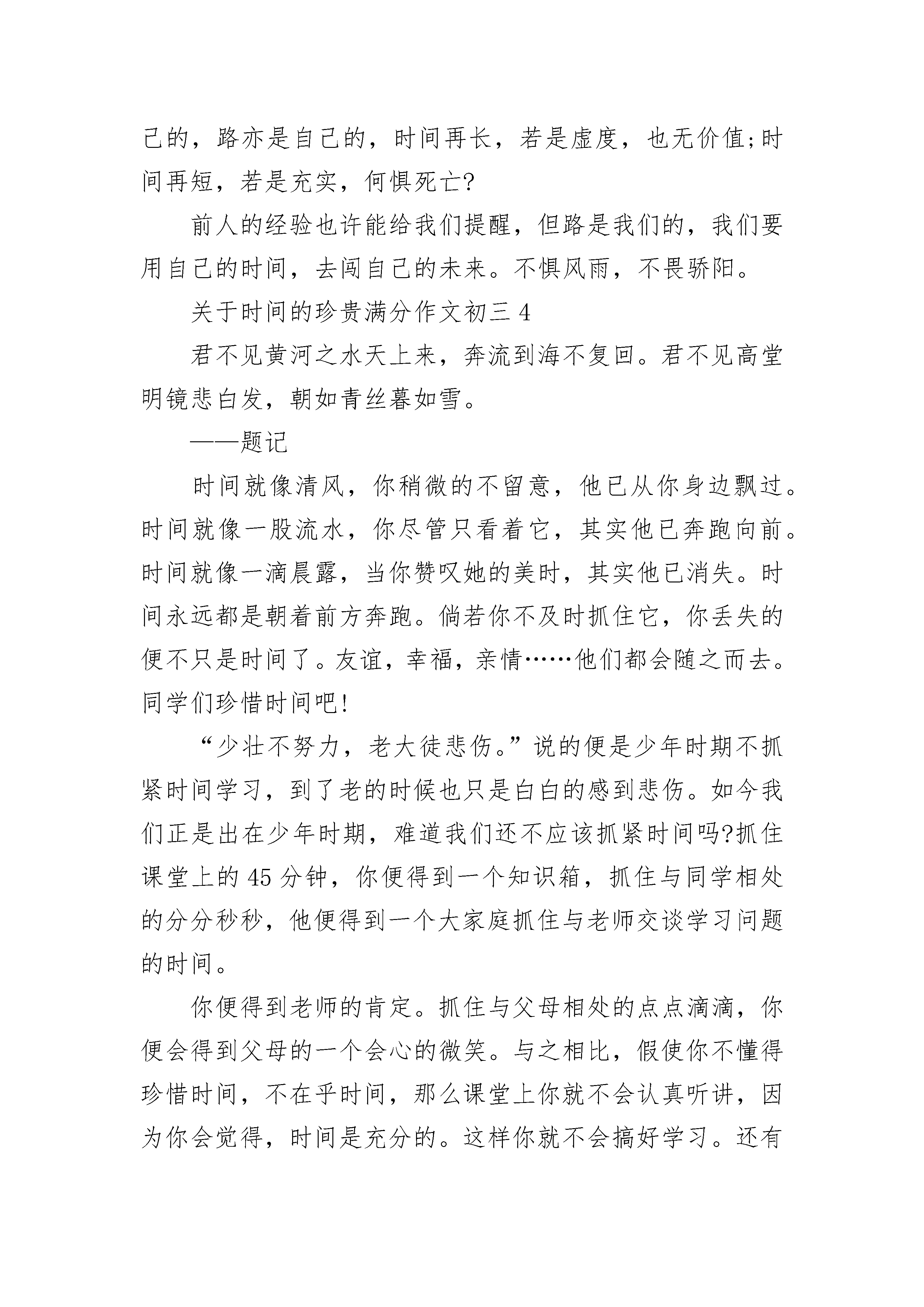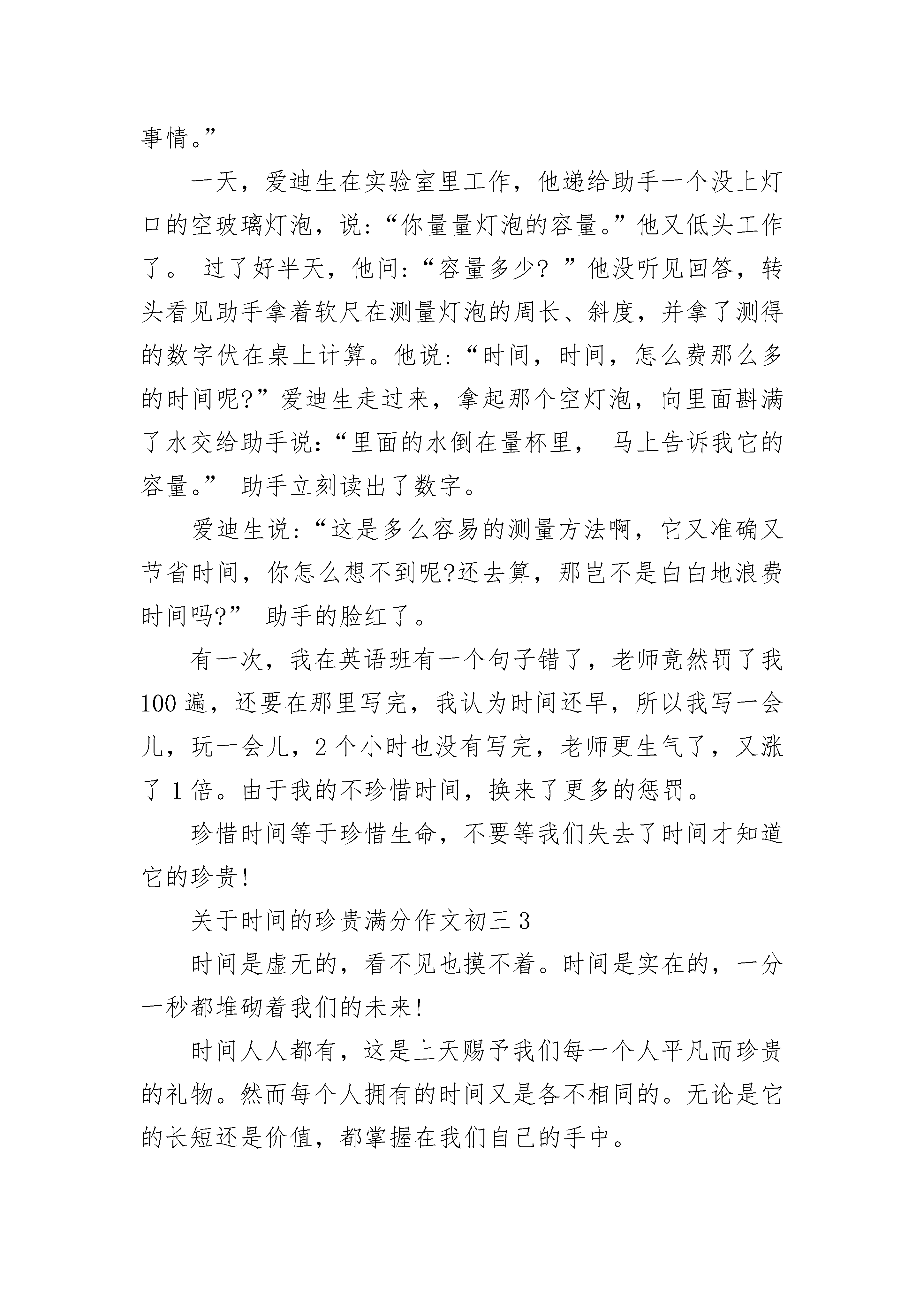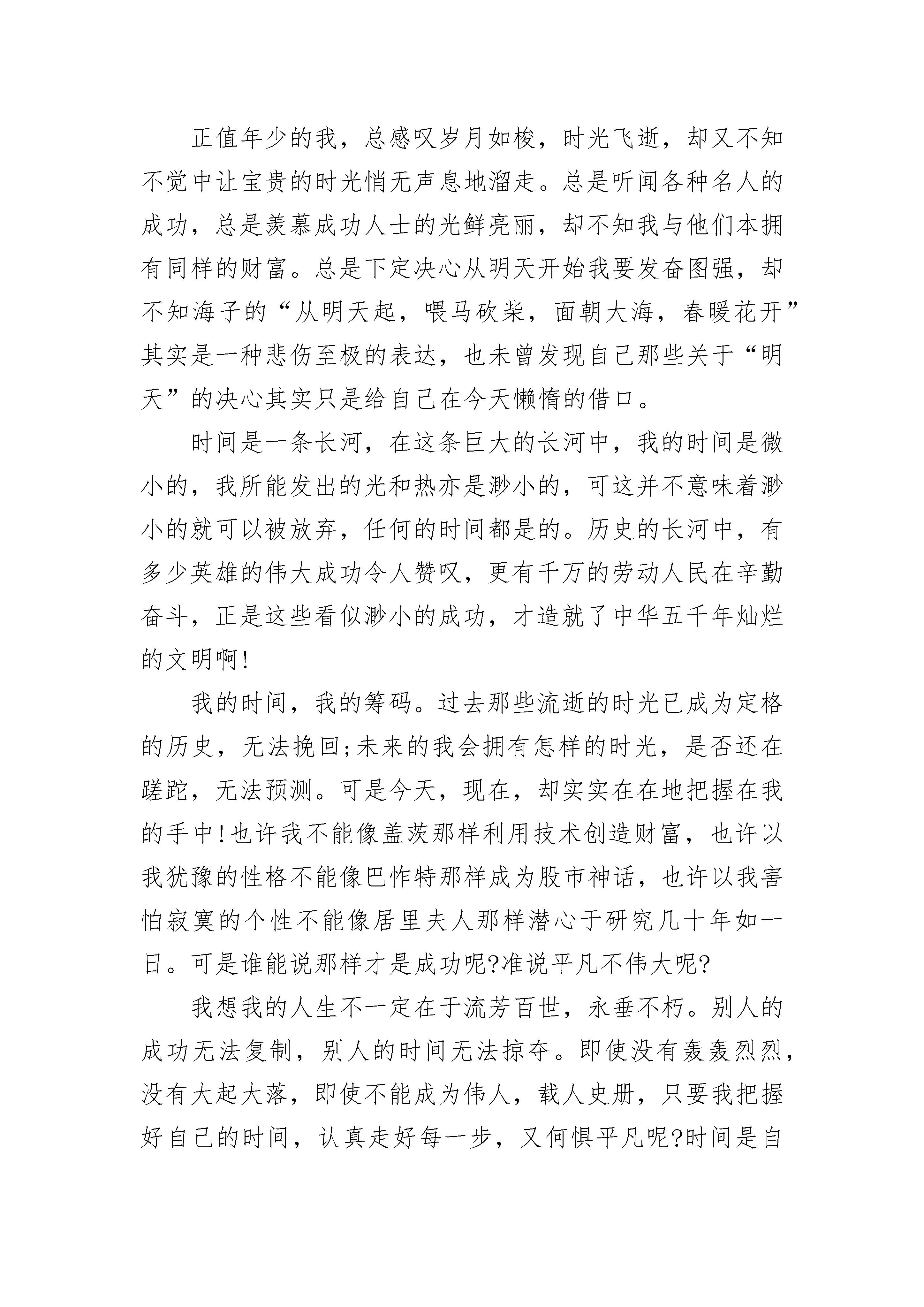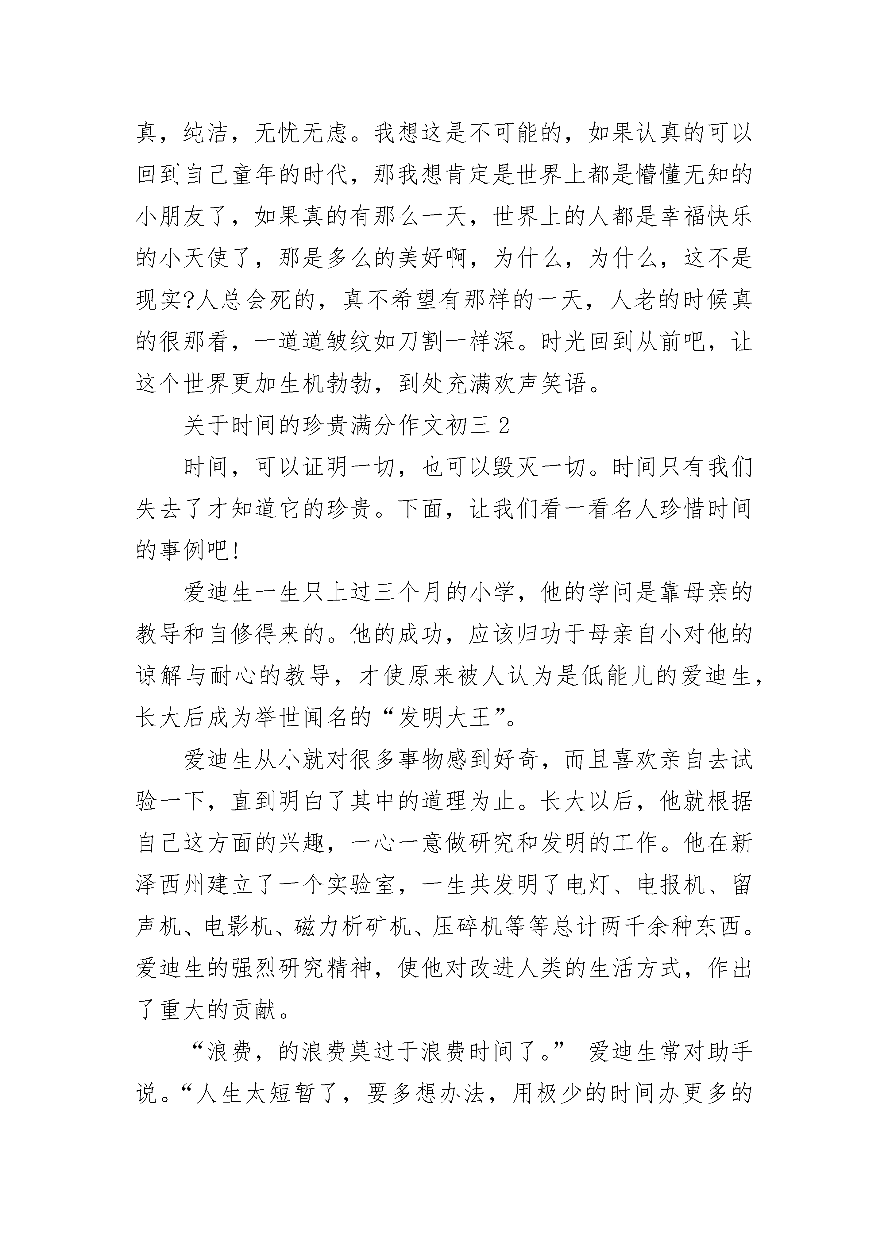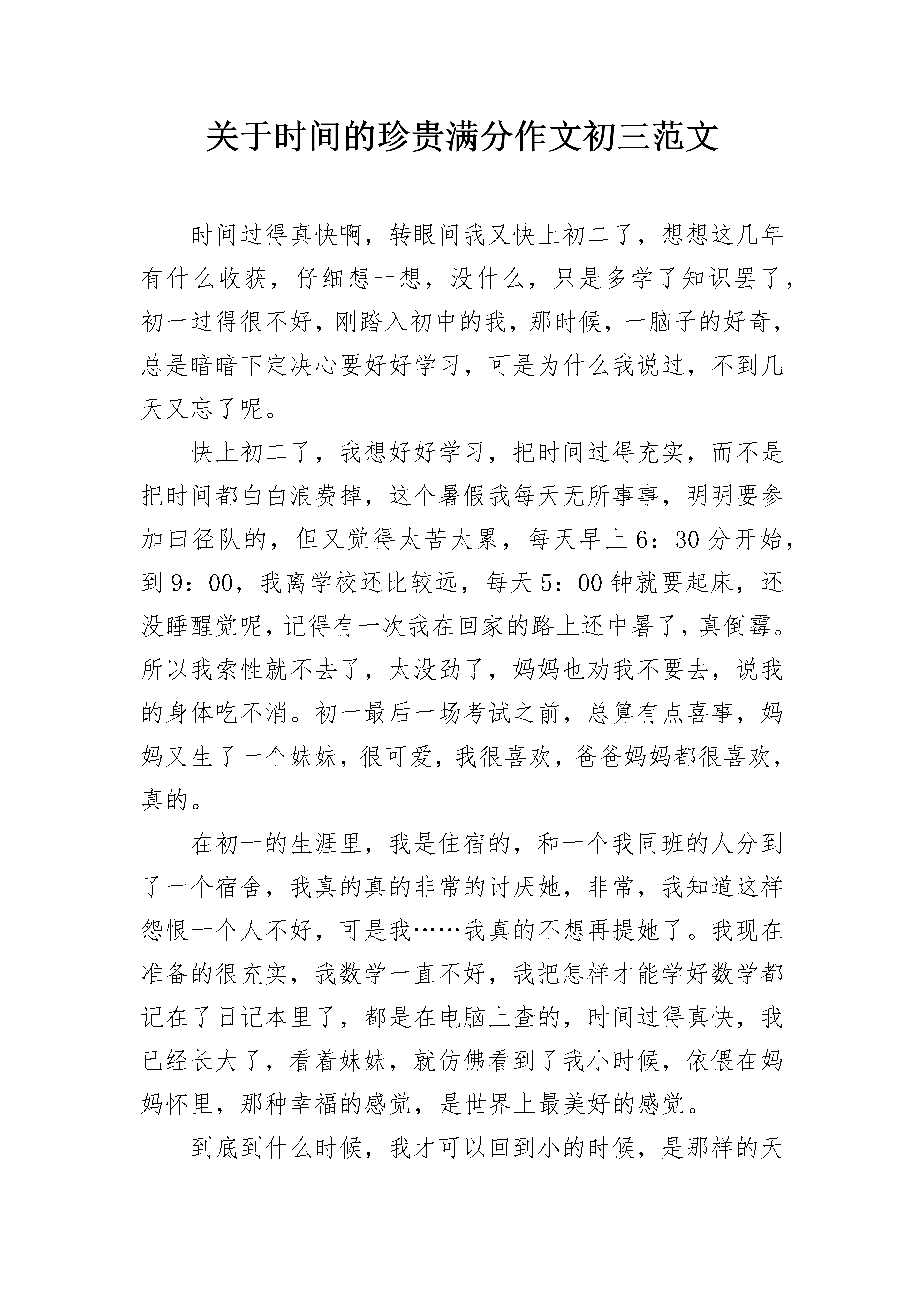 关于时间的珍贵满分作文初三范文时间过得真快啊,转眼间我又快上初二了,想想这几年有什么收获,仔细想一想,没什么,只是多学了知识罢了,初一过得很不好,刚踏入初中的我,那时候,一脑子的好奇,总是暗暗下定决心要好好学习,可是为什么我说过,不到几天又忘了呢。快上初二了,我想好好学习,把时间过得充实,而不是把时间都白白浪费掉,这个暑假我每天无所事事,明明要参加田径队的,但又觉得太苦太累,每天早上6:30分开始,到9:00,我离学校还比较远,每天5:00钟就要起床,还没睡醒觉呢,记得有一次我在回家的路上还中暑了,真倒霉。所以我索性就不去了,太没劲了,妈妈也劝我不要去,说我的身体吃不消。初一最后一场考试之前,总算有点喜事,妈妈又生了一个妹妹,很可爱,我很喜欢,爸爸妈妈都很喜欢,真的。在初一的生涯里,我是住宿的,和一个我同班的人分到了一个宿舍,我真的真的非常的讨厌她,非常,我知道这样怨恨一个人不好,可是我……我真的不想再提她了。我现在准备的很充实,我数学一直不好,我把怎样才能学好数学都记在了日记本里了,都是在电脑上查的,时间过得真快,我已经长大了,看着妹妹,就仿佛看到了我小时候,依偎在妈妈怀里,那种幸福的感觉,是世界上最美好的感觉。到底到什么时候,我才可以回到小的时候,是那样的天真,纯洁,无忧无虑。我想这是不可能的,如果认真的可以回到自己童年的时代,那我想肯定是世界上都是懵懂无知的小朋友了,如果真的有那么一天,世界上的人都是幸福快乐的小天使了,那是多么的美好啊,为什么,为什么,这不是现实?人总会死的,真不希望有那样的一天,人老的时候真的很那看,一道道皱纹如刀割一样深。时光回到从前吧,让这个世界更加生机勃勃,到处充满欢声笑语。关于时间的珍贵满分作文初三2时间,可以证明一切,也可以毁灭一切。时间只有我们失去了才知道它的珍贵。下面,让我们看一看名人珍惜时间的事例吧!爱迪生一生只上过三个月的小学,他的学问是靠母亲的教导和自修得来的。他的成功,应该归功于母亲自小对他的谅解与耐心的教导,才使原来被人认为是低能儿的爱迪生,长大后成为举世闻名的“发明大王”。爱迪生从小就对很多事物感到好奇,而且喜欢亲自去试验一下,直到明白了其中的道理为止。长大以后,他就根据自己这方面的兴趣,一心一意做研究和发明的工作。他在新泽西州建立了一个实验室,一生共发明了电灯、电报机、留声机、电影机、磁力析矿机、压碎机等等总计两千余种东西。爱迪生的强烈研究精神,使他对改进人类的生活方式,作出了重大的贡献。“浪费,的浪费莫过于浪费时间了。”爱迪生常对助手说。“人生太短暂了,要多想办法,用极少的时间办更多的事情。”一天,爱迪生在实验室里工作,他递给助手一个没上灯口的空玻璃灯泡,说:“你量量灯泡的容量。”他又低头工作了。过了好半天,他问:“容量多少?”他没听见回答,转头看见助手拿着软尺在测量灯泡的周长、斜度,并拿了测得的数字伏在桌上计算。他说:“时间,时间,怎么费那么多的时间呢?”爱迪生走过来,拿起那个空灯泡,向里面斟满了水交给助手说:“里面的水倒在量杯里,马上告诉我它的容量。”助手立刻读出了数字。爱迪生说:“这是多么容易的测量方法啊,它又准确又节省时间,你怎么想不到呢?还去算,那岂不是白白地浪费时间吗?”助手的脸红了。有一次,我在英语班有一个句子错了,老师竟然罚了我100遍,还要在那里写完,我认为时间还早,所以我写一会儿,玩一会儿,2个小时也没有写完,老师更生气了,又涨了1倍。由于我的不珍惜时间,换来了更多的惩罚。珍惜时间等于珍惜生命,不要等我们失去了时间才知道它的珍贵!关于时间的珍贵满分作文初三3时间是虚无的,看不见也摸不着。时间是实在的,一分一秒都堆砌着我们的未来!时间人人都有,这是上天赐予我们每一个人平凡而珍贵的礼物。然而每个人拥有的时间又是各不相同的。无论是它的长短还是价值,都掌握在我们自己的手中。正值年少的我,总感叹岁月如梭,时光飞逝,却又不知不觉中让宝贵的时光悄无声息地溜走。总是听闻各种名人的成功,总是羡慕成功人士的光鲜亮丽,却不知我与他们本拥有同样的财富。总是下定决心从明天开始我要发奋图强,却不知海子的“从明天起,喂马砍柴,面朝大海,春暖花开”其实是一种悲伤至极的表达,也未曾发现自己那些关于“明天”的决心其实只是给自己在今天懒惰的借口。时间是一条长河,在这条巨大的长河中,我的时间是微小的,我所能发出的光和热亦是渺小的,可这并不意味着渺小的就可以被放弃,任何的时间都是的。历史的长河中,有多少英雄的伟大成功令人赞叹,更有千万的劳动人民在辛勤奋斗,正是这些看似渺小的成功,才造就了中华五千年灿烂的文明啊!我的时间,我的筹码。过去那些流逝的时光已成为定格的历史,无法挽回;未来的我会拥有怎样的时光,是否还在蹉跎,无法预测。可是今天,现在,却实实在在地把握在我的手中!也许我不能像盖茨那样利