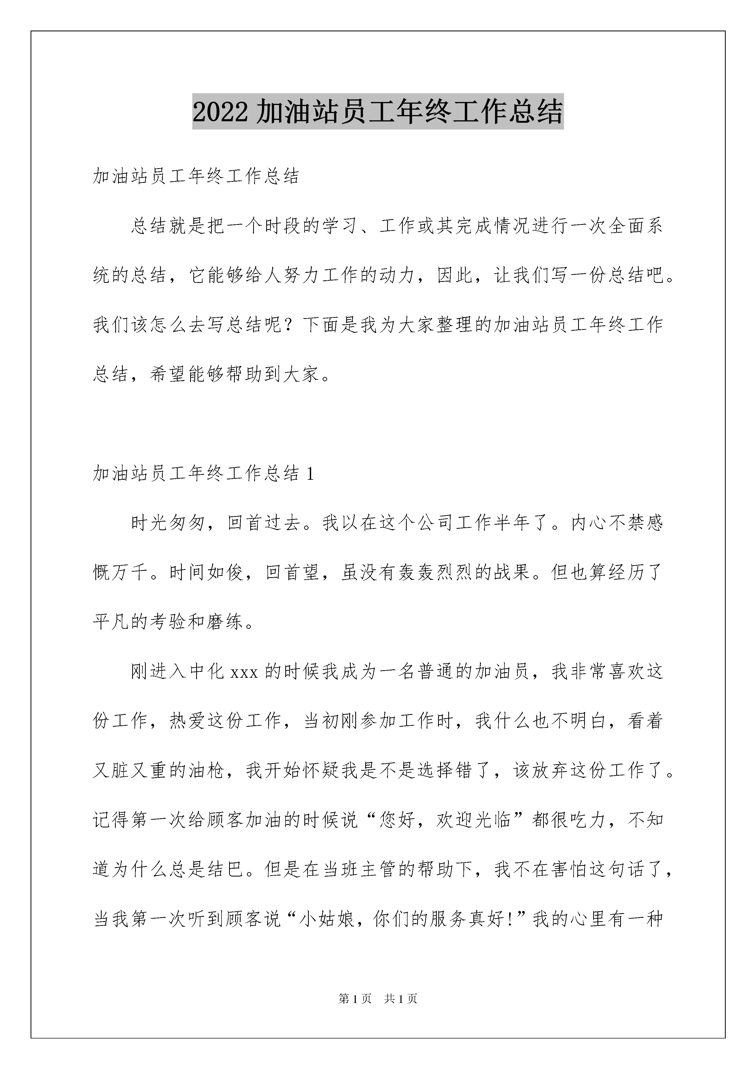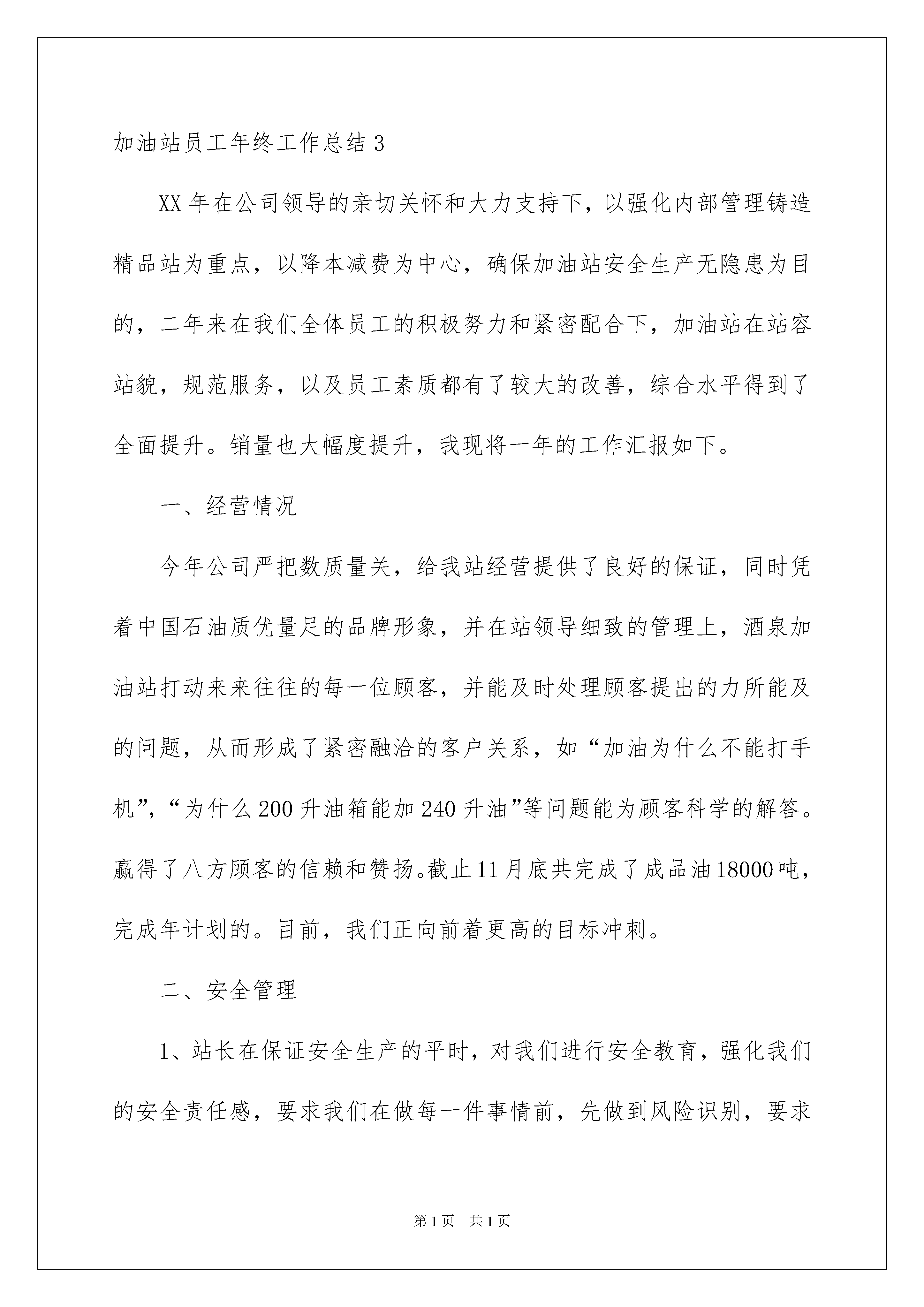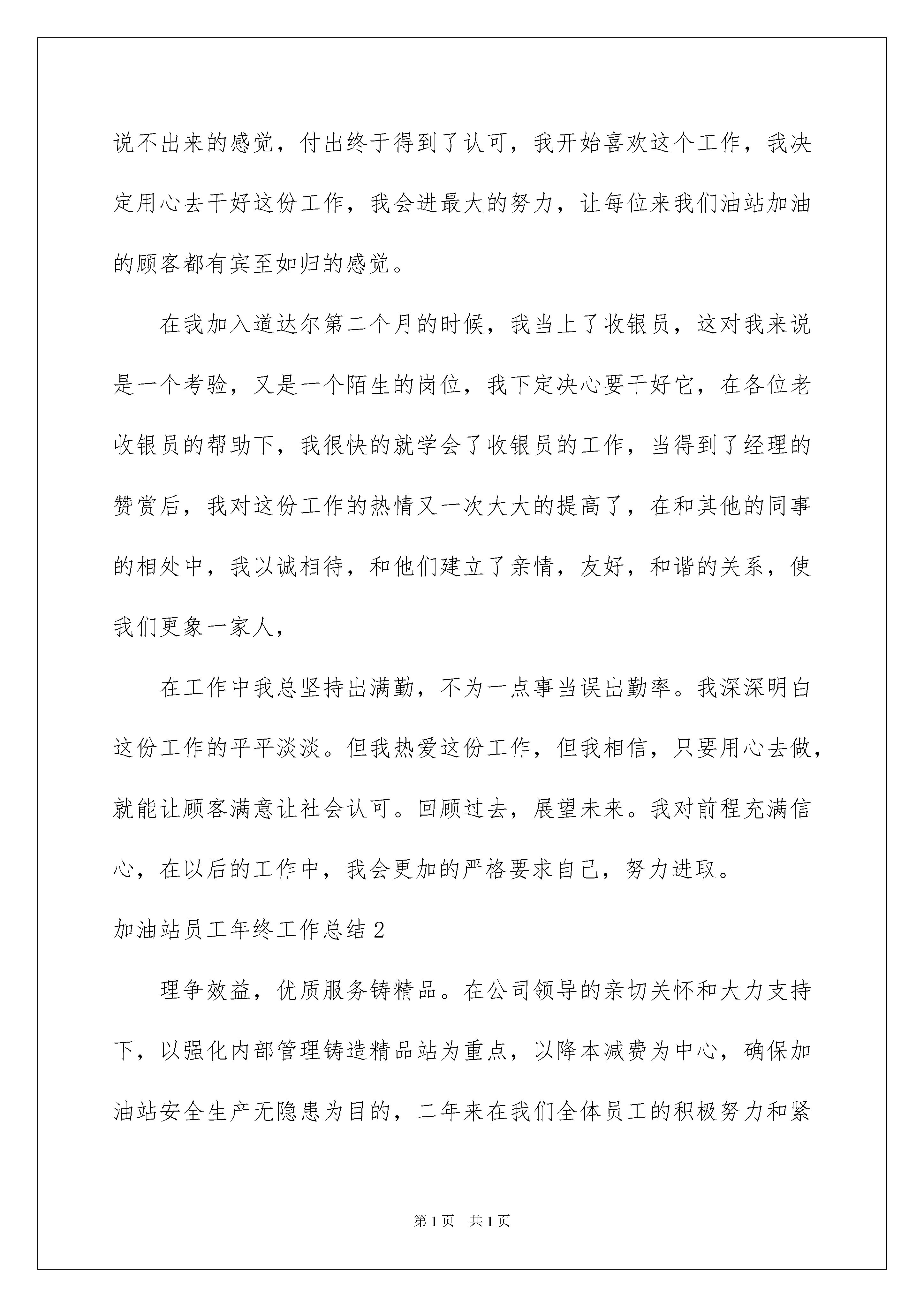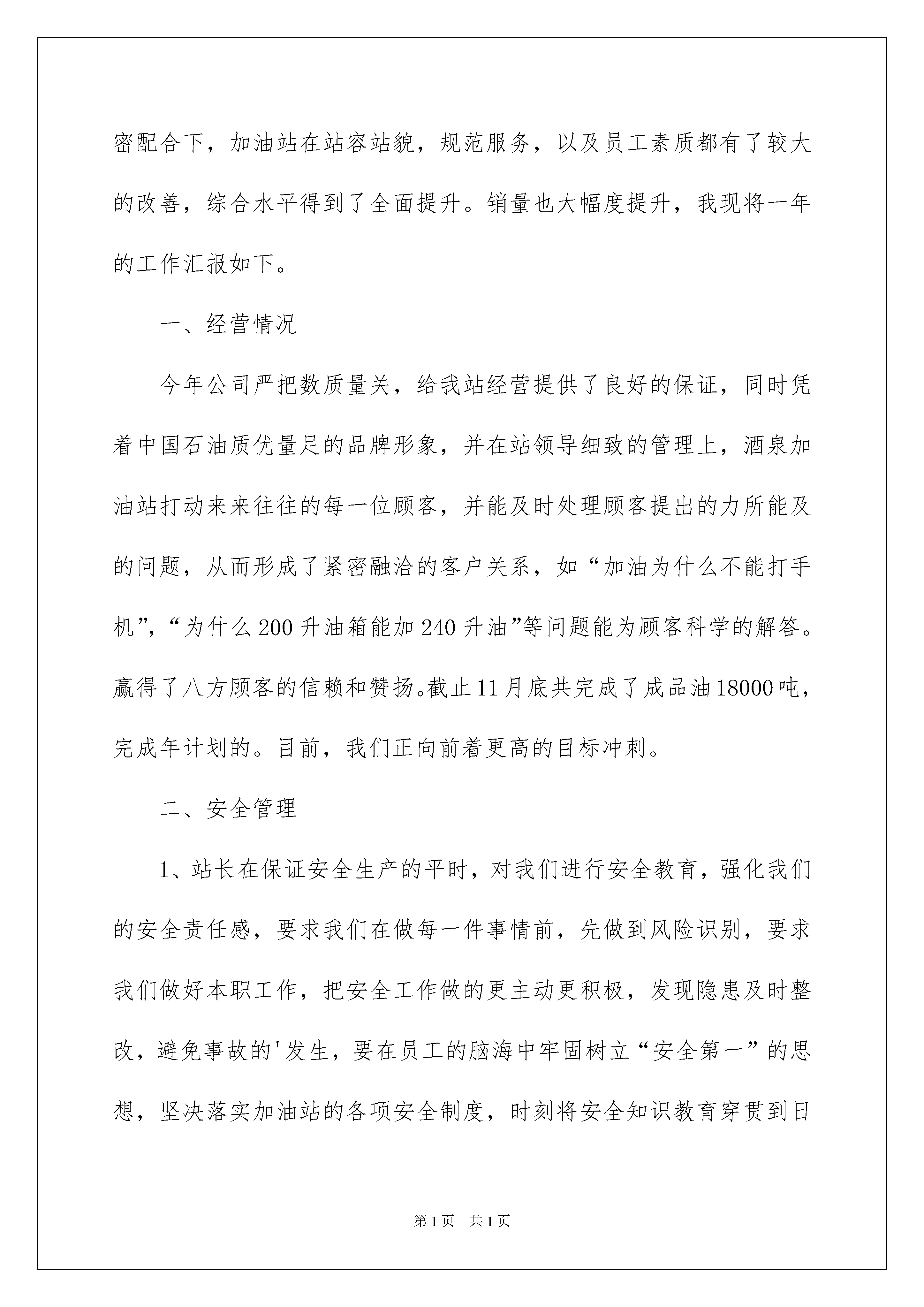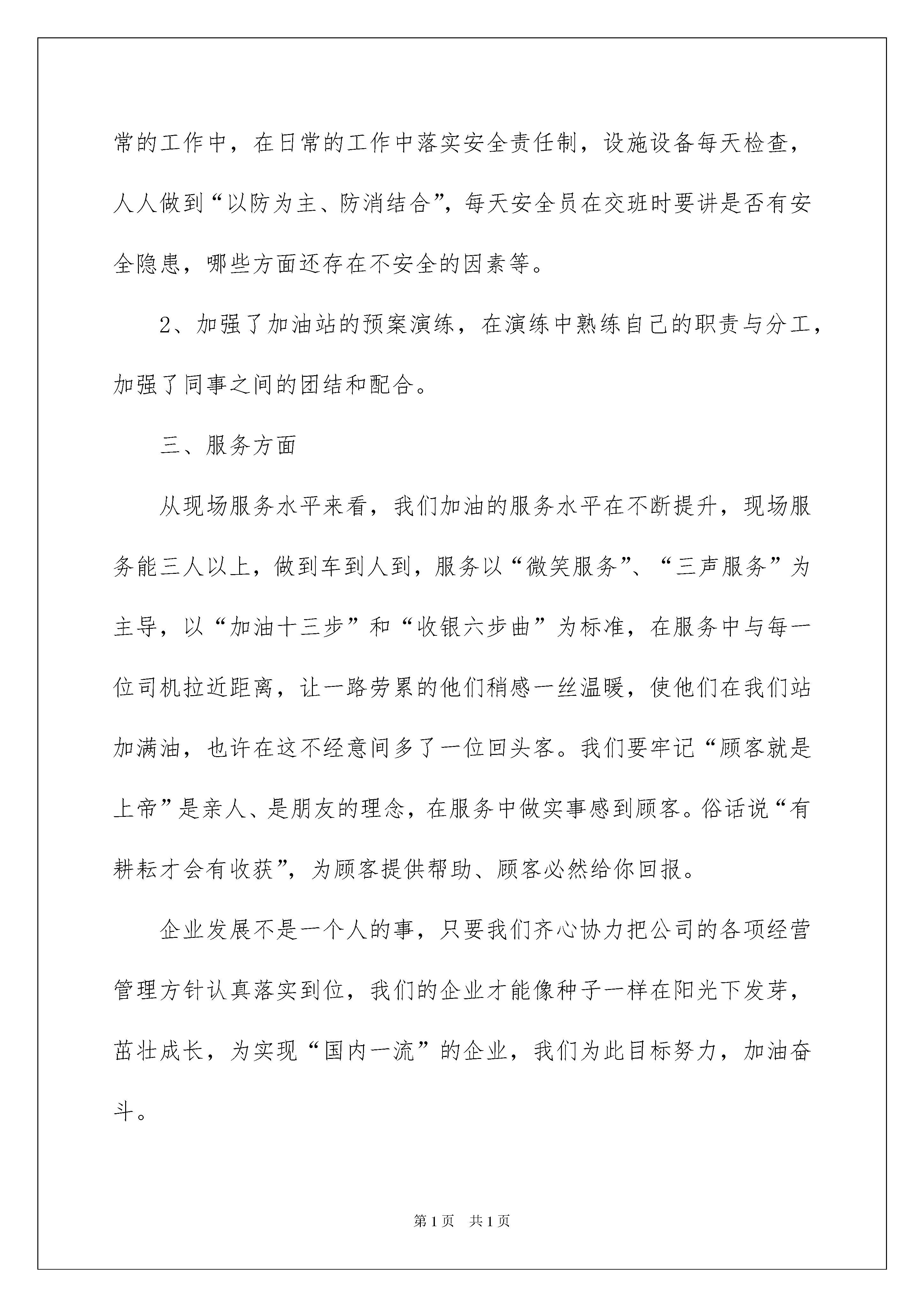 2022加油站员工年终工作总结加油站员工年终工作总结总结就是把一个时段的学习、工作或其完成情况进行一次全面系统的总结,它能够给人努力工作的动力,因此,让我们写一份总结吧。我们该怎么去写总结呢?下面是我为大家整理的加油站员工年终工作总结,希望能够帮助到大家。加油站员工年终工作总结1时光匆匆,回首过去。我以在这个公司工作半年了。内心不禁感慨万千。时间如俊,回首望,虽没有轰轰烈烈的战果。但也算经历了平凡的考验和磨练。刚进入中化xxx的时候我成为一名普通的加油员,我非常喜欢这份工作,热爱这份工作,当初刚参加工作时,我什么也不明白,看着又脏又重的油枪,我开始怀疑我是不是选择错了,该放弃这份工作了。记得第一次给顾客加油的时候说“您好,欢迎光临”都很吃力,不知道为什么总是结巴。但是在当班主管的帮助下,我不在害怕这句话了,当我第一次听到顾客说“小姑娘,你们的服务真好!”我的心里有一种说不出来的感觉,付出终于得到了认可,我开始喜欢这个工作,我决定用心去干好这份工作,我会进最大的努力,让每位来我们油站加油的顾客都有宾至如归的感觉。在我加入道达尔第二个月的时候,我当上了收银员,这对我来说是一个考验,又是一个陌生的岗位,我下定决心要干好它,在各位老收银员的帮助下,我很快的就学会了收银员的工作,当得到了经理的赞赏后,我对这份工作的热情又一次大大的提高了,在和其他的同事的相处中,我以诚相待,和他们建立了亲情,友好,和谐的关系,使我们更象一家人,在工作中我总坚持出满勤,不为一点事当误出勤率。我深深明白这份工作的平平淡淡。但我热爱这份工作,但我相信,只要用心去做,就能让顾客满意让社会认可。回顾过去,展望未来。我对前程充满信心,在以后的工作中,我会更加的严格要求自己,努力进取。加油站员工年终工作总结2理争效益,优质服务铸精品。在公司领导的亲切关怀和大力支持下,以强化内部管理铸造精品站为重点,以降本减费为中心,确保加油站安全生产无隐患为目的,二年来在我们全体员工的积极努力和紧密配合下,加油站在站容站貌,规范服务,以及员工素质都有了较大的改善,综合水平得到了全面提升。销量也大幅度提升,我现将一年的工作汇报如下。一、经营情况今年公司严把数质量关,给我站经营提供了良好的保证,同时凭着中国石油质优量足的品牌形象,并在站领导细致的管理上,酒泉加油站打动来来往往的每一位顾客,并能及时处理顾客提出的力所能及的问题,从而形成了紧密融洽的客户关系,如“加油为什么不能打手机”,“为什么200升油箱能加240升油”等问题能为顾客科学的解答。赢得了八方顾客的信赖和赞扬。截止11月底共完成了成品油18000吨,完成年计划的。目前,我们正向前着更高的目标冲刺。二、安全管理1、站长在保证安全生产的平时,对我们进行安全教育,强化我们的安全责任感,要求我们在做每一件事情前,先做到风险识别,要求我们做好本职工作,把安全工作做的更主动更积极,发现隐患及时整改,避免事故的'发生,要在员工的脑海中牢固树立“安全第一”的思想,坚决落实加油站的各项安全制度,时刻将安全知识教育穿贯到日常的工作中,在日常的工作中落实安全责任制,设施设备每天检查,人人做到“以防为主、防消结合”,每天安全员在交班时要讲是否有安全隐患,哪些方面还存在不安全的因素等。2、加强了加油站的预案演练,在演练中熟练自己的职责与分工,加强了同事之间的团结和配合。三、服务方面从现场服务水平来看,我们加油的服务水平在不断提升,现场服务能三人以上,做到车到人到,服务以“微笑服务”、“三声服务”为主导,以“加油十三步”和“收银六步曲”为标准,在服务中与每一位司机拉近距离,让一路劳累的他们稍感一丝温暖,使他们在我们站加满油,也许在这不经意间多了一位回头客。我们要牢记“顾客就是上帝”是亲人、是朋友的理念,在服务中做实事感到顾客。俗话说“有耕耘才会有收获”,为顾客提供帮助、顾客必然给你回报。企业发展不是一个人的事,只要我们齐心协力把公司的各项经营管理方针认真落实到位,我们的企业才能像种子一样在阳光下发芽,茁壮成长,为实现“国内一流”的企业,我们为此目标努力,加油奋斗。加油站员工年终工作总结3XX年在公司领导的亲切关怀和大力支持下,以强化内部管理铸造精品站为重点,以降本减费为中心,确保加油站安全生产无隐患为目的,二年来在我们全体员工的积极努力和紧密配合下,加油站在站容站貌,规范服务,以及员工素质都有了较大的改善,综合水平得到了全面提升。销量也大幅度提升,我现将一年的工作汇报如下。一、经营情况今年公司严把数质量关,给我站经营提供了良好的保证,同时凭着中国石油质优量足的品牌形象,并在站领导细致的管理上,酒泉加