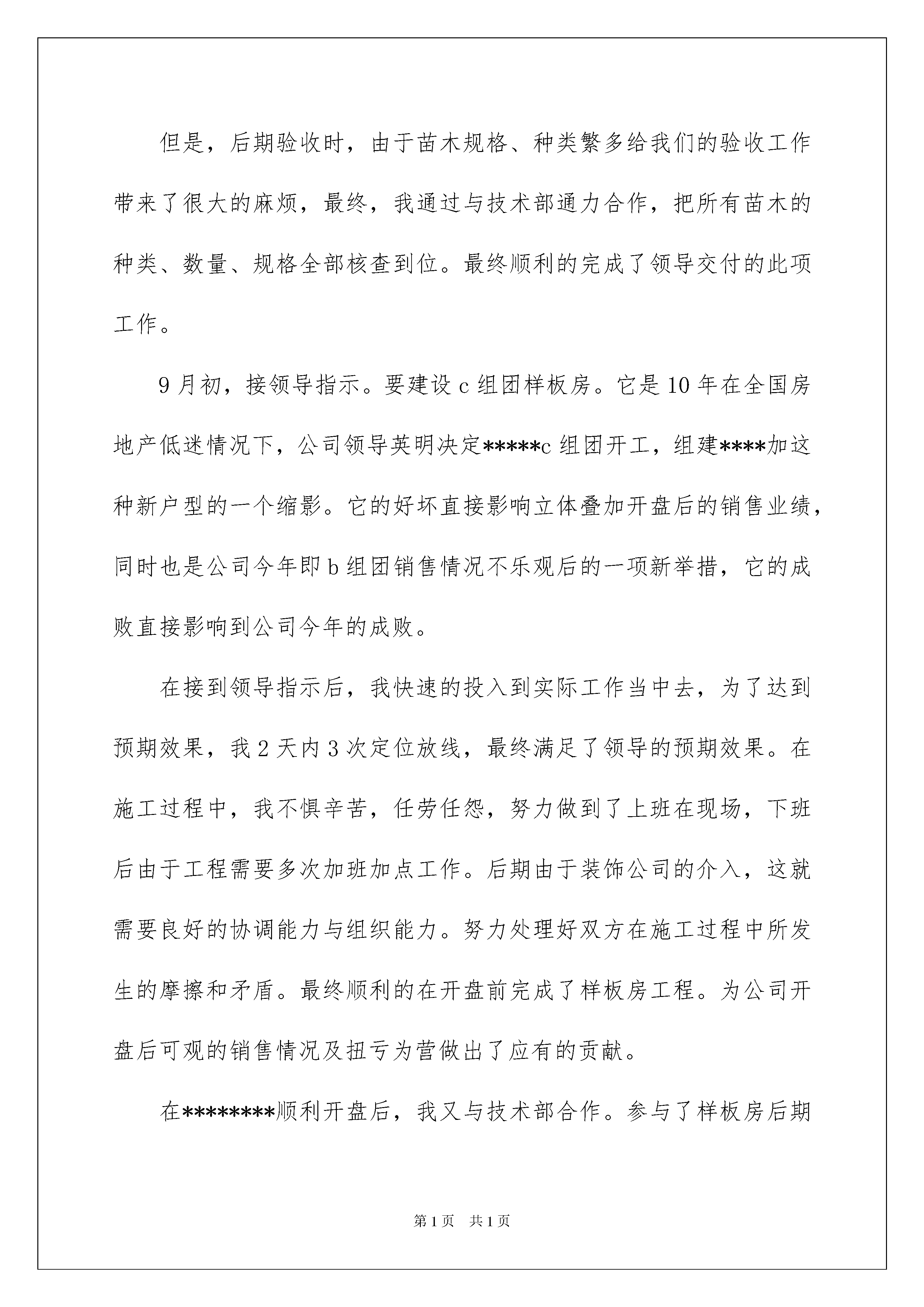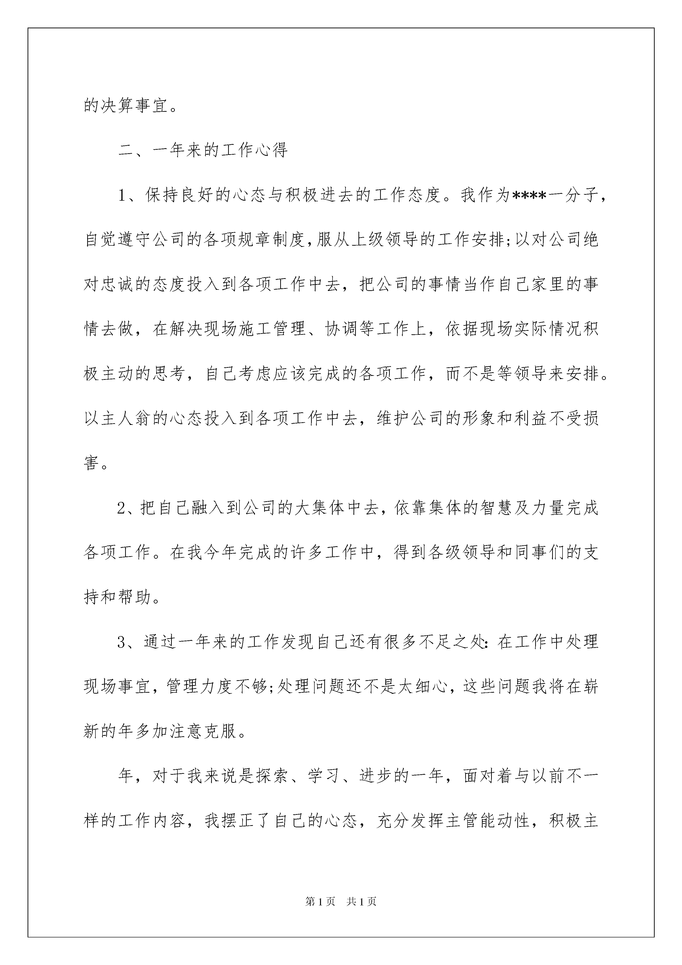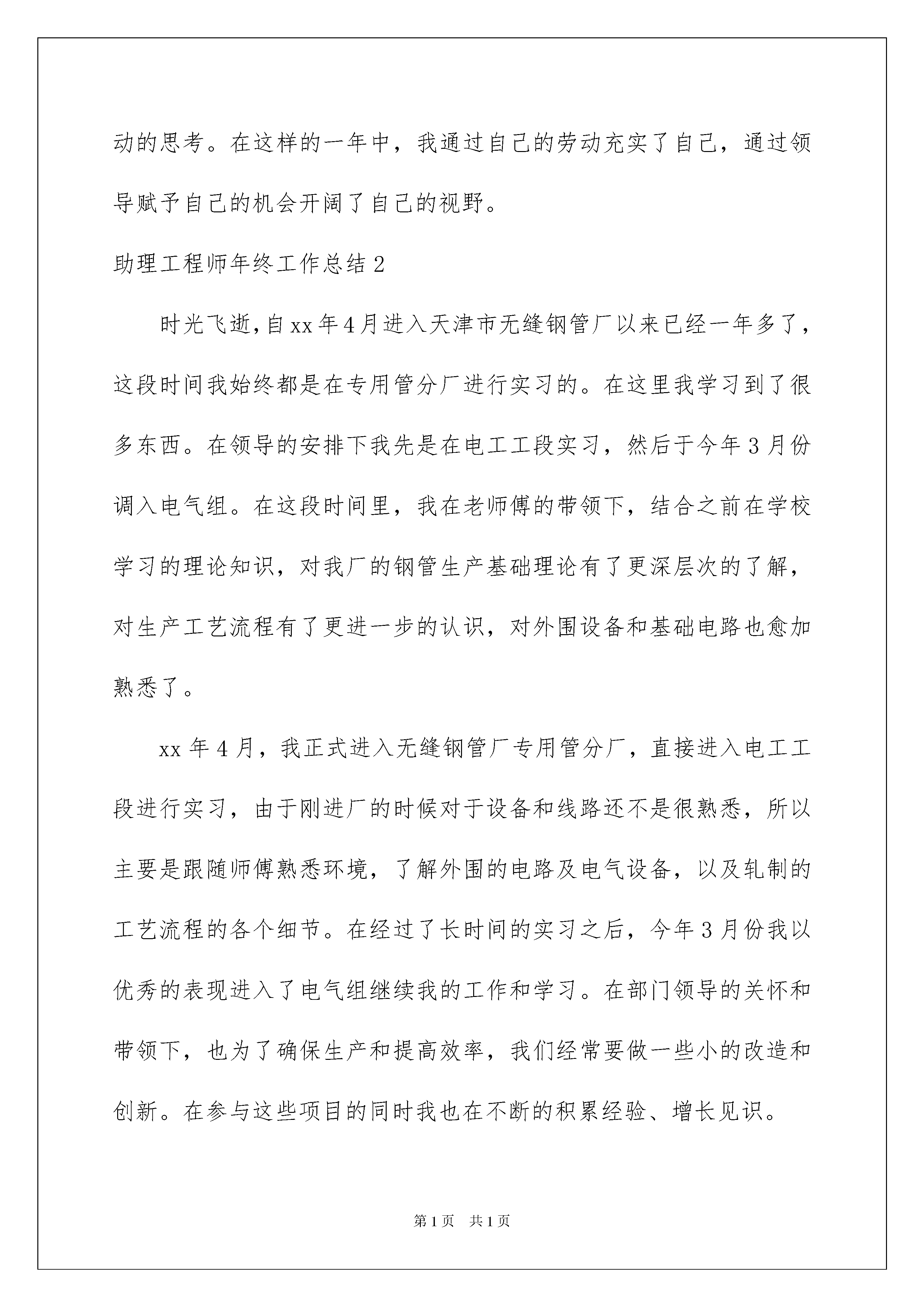 2022助理工程师年终工作总结助理工程师年终工作总结总结就是对一个时期的学习、工作或其完成情况进行一次全面系统的回顾和分析的书面材料,他能够提升我们的书面表达能力,不如立即行动起来写一份总结吧。那么你知道总结如何写吗?下面是我为大家收集的助理工程师年终工作总结,欢迎大家分享。助理工程师年终工作总结1今年是我成为上班族以来的第二个整年。土建工程师是我从事的第一份工作,是我职业生涯的一个起点,我对此也十分珍惜,尽最大努力去适应这一岗位。通过一年来的不断学习,以及同事、领导的帮助,我已完全融入到了*******这个大家庭中,个人的工作技能也有了明显的提高,虽然工作中还存在这样那样的不足之处,但应该说这一年付出了不少,也收获了很多,我自己感到成长了,也逐渐成熟了。现在就年的工作情况总结.一、一年来经过我的不懈努力,完成了一期、二期工程施工资料整理及移交工作、二期工程景观、绿化工作、c组团前期开工准备工作、c组团样板房工程等公司领导交付的其他工。。一、二期工程施工资料整理及移交工作今年上半年二期工程顺利交工并交付业主使用,工程交工前必须先把施工资料整理交接完毕,我认真检查把每一栋楼的施工资料都仔细查阅,力争做到一张不漏、一张不缺、目录整齐、保证资料齐全,交房前二期13栋楼所有的户型图、质保保证书、使用说明书,我都要提前准备齐全,已备交房时给业主以充分的保障。二期13栋楼的备案资料全部经由我手整理完毕,再领导的指导下,我顺利的完成了交房前所有资料的整理工作。交房后由于资料过多及其重要性,需移交公司档案室保管,移交期间,我必须对一、二期30栋楼的100多盒资料重新整理,做到每张都有记录并制定出能够从中找出任意一张资料的目录。期间我花费大量精力,花费将近一月的时间,终于不负领导所托吧所有资料都重新整理完毕。二期工程景观、绿化工作年初,我接手二期工程景观、绿化工作。景观、绿化工作相对于现代化小区,比重虽小,但是意义重大。它是现代化新生活小区不可或缺的。由于准备充足,二期的景观、绿化工作进行的很顺利。但是,后期验收时,由于苗木规格、种类繁多给我们的验收工作带来了很大的麻烦,最终,我通过与技术部通力合作,把所有苗木的种类、数量、规格全部核查到位。最终顺利的完成了领导交付的此项工作。9月初,接领导指示。要建设c组团样板房。它是10年在全国房地产低迷情况下,公司领导英明决定*****c组团开工,组建****加这种新户型的一个缩影。它的好坏直接影响立体叠加开盘后的销售业绩,同时也是公司今年即b组团销售情况不乐观后的一项新举措,它的成败直接影响到公司今年的成败。在接到领导指示后,我快速的投入到实际工作当中去,为了达到预期效果,我2天内3次定位放线,最终满足了领导的预期效果。在施工过程中,我不惧辛苦,任劳任怨,努力做到了上班在现场,下班后由于工程需要多次加班加点工作。后期由于装饰公司的介入,这就需要良好的协调能力与组织能力。努力处理好双方在施工过程中所发生的摩擦和矛盾。最终顺利的在开盘前完成了样板房工程。为公司开盘后可观的销售情况及扭亏为营做出了应有的贡献。在********顺利开盘后,我又与技术部合作。参与了样板房后期的决算事宜。二、一年来的工作心得1、保持良好的心态与积极进去的工作态度。我作为****一分子,自觉遵守公司的各项规章制度,服从上级领导的工作安排;以对公司绝对忠诚的态度投入到各项工作中去,把公司的事情当作自己家里的事情去做,在解决现场施工管理、协调等工作上,依据现场实际情况积极主动的思考,自己考虑应该完成的各项工作,而不是等领导来安排。以主人翁的心态投入到各项工作中去,维护公司的形象和利益不受损害。2、把自己融入到公司的大集体中去,依靠集体的智慧及力量完成各项工作。在我今年完成的许多工作中,得到各级领导和同事们的支持和帮助。3、通过一年来的工作发现自己还有很多不足之处:在工作中处理现场事宜,管理力度不够;处理问题还不是太细心,这些问题我将在崭新的年多加注意克服。年,对于我来说是探索、学习、进步的一年,面对着与以前不一样的工作内容,我摆正了自己的心态,充分发挥主管能动性,积极主动的思考。在这样的一年中,我通过自己的劳动充实了自己,通过领导赋予自己的机会开阔了自己的视野。助理工程师年终工作总结2时光飞逝,自xx年4月进入天津市无缝钢管厂以来已经一年多了,这段时间我始终都是在专用管分厂进行实习的。在这里我学习到了很多东西。在领导的安排下我先是在电工工段实习,然后于今年3月份调入电气组。在这段时间里,我在老师傅的带领下,结合之前在学校学习的理论知识,对我厂的钢管生产基础理论有了更深层次的了解,对