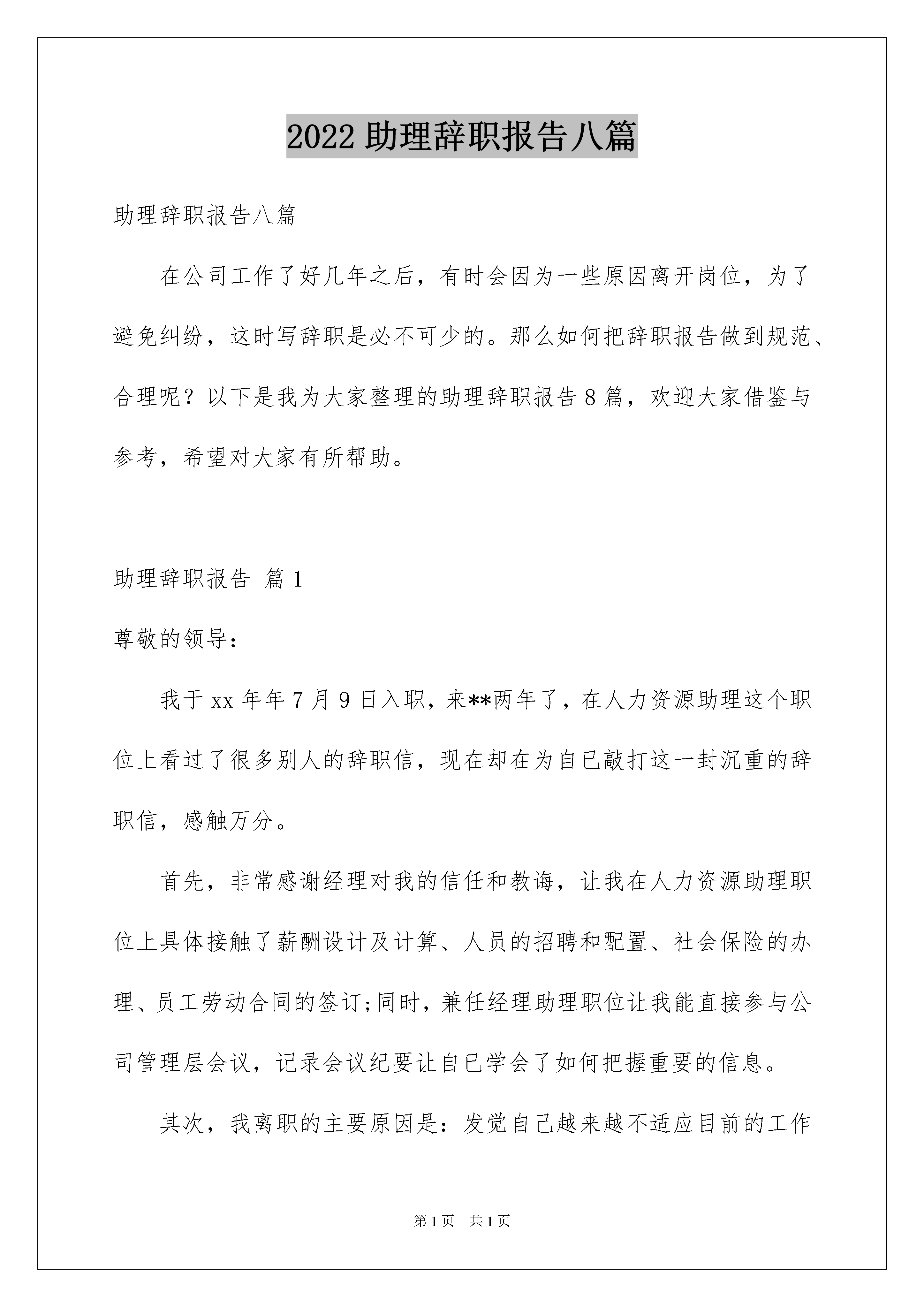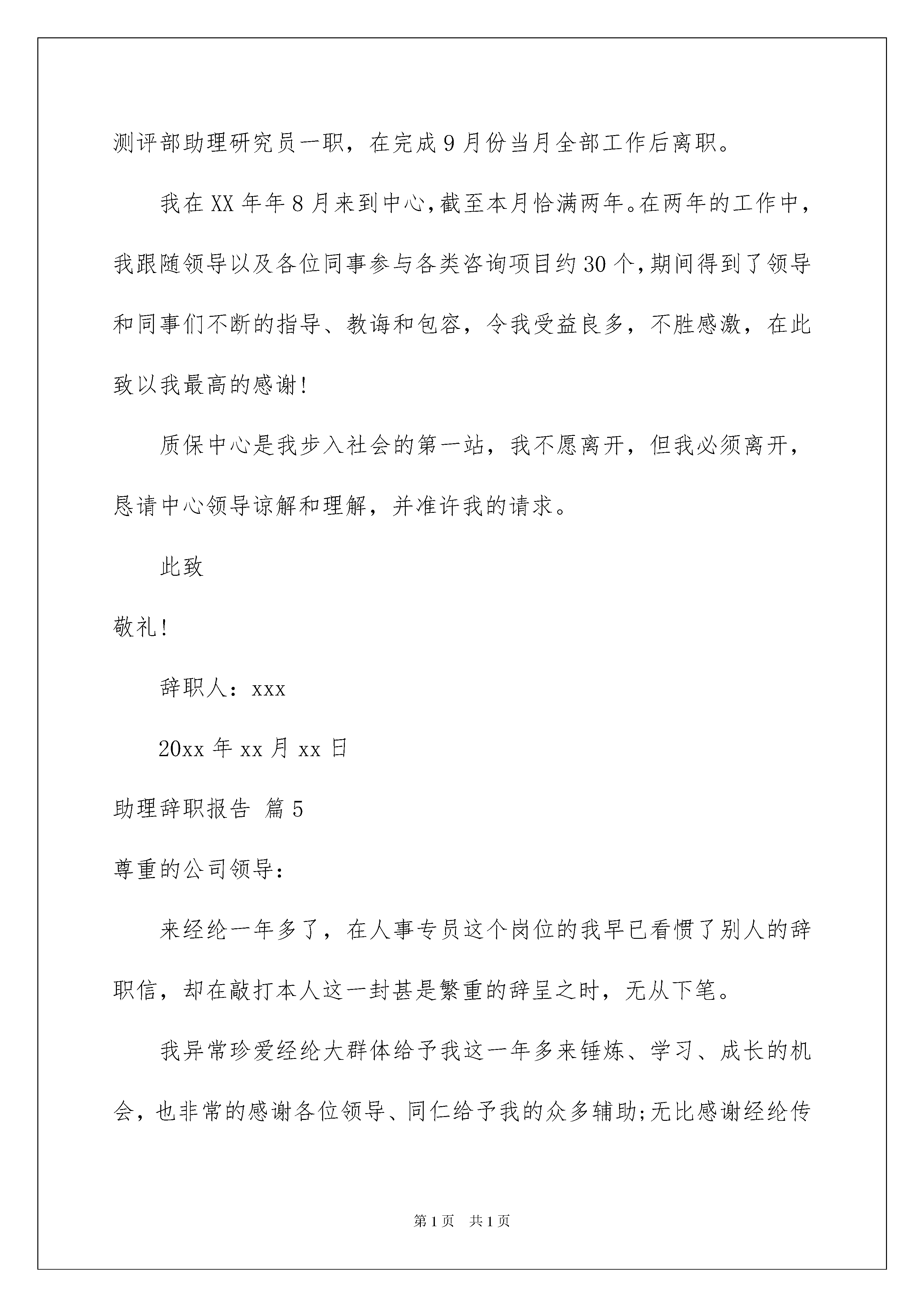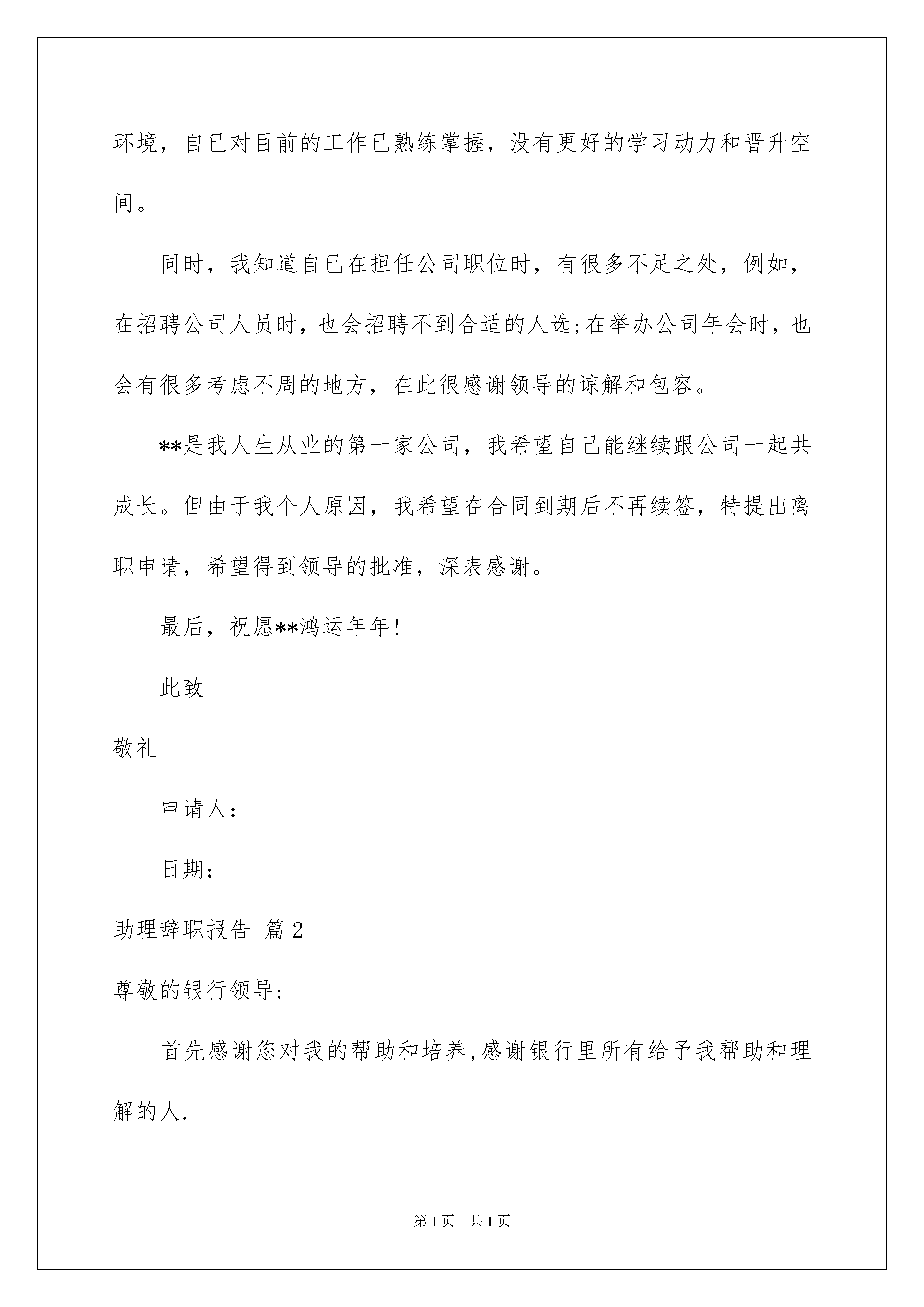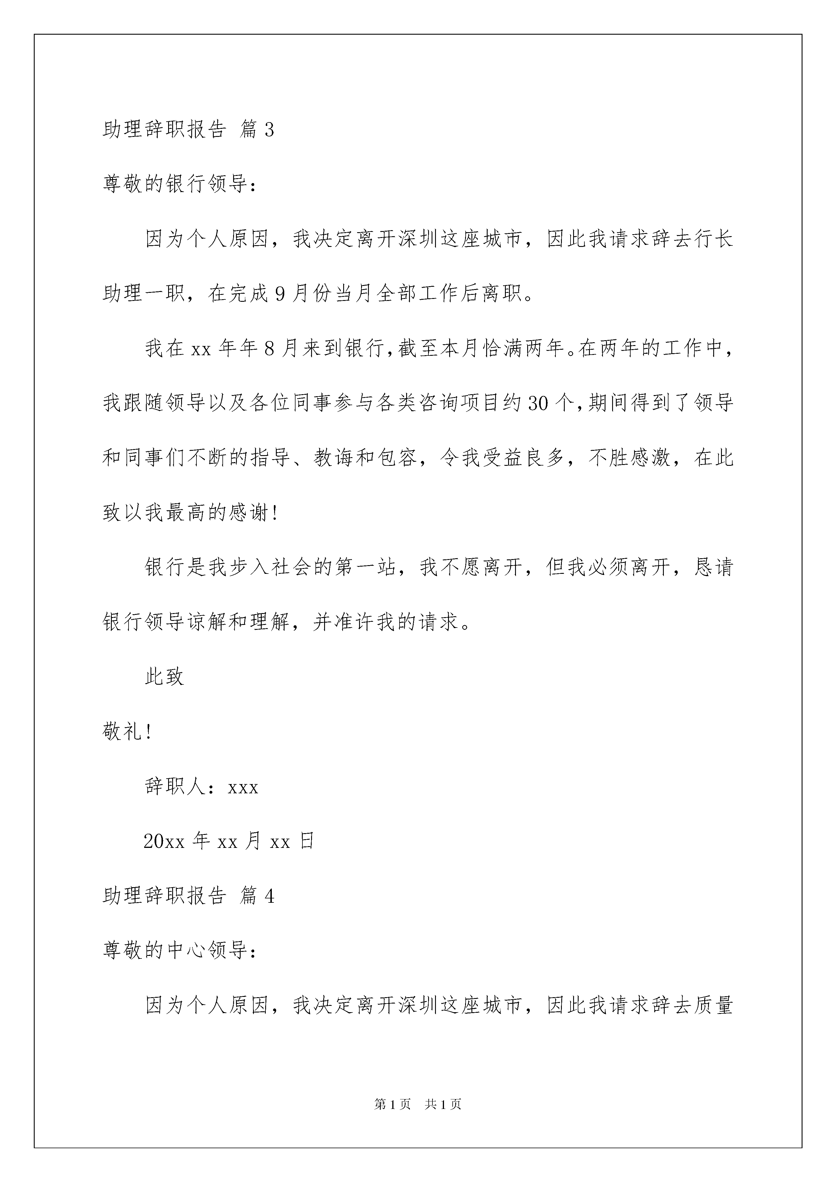 2022助理辞职报告八篇助理辞职报告八篇在公司工作了好几年之后,有时会因为一些原因离开岗位,为了避免纠纷,这时写辞职是必不可少的。那么如何把辞职报告做到规范、合理呢?以下是我为大家整理的助理辞职报告8篇,欢迎大家借鉴与参考,希望对大家有所帮助。助理辞职报告篇1尊敬的领导:我于xx年年7月9日入职,来**两年了,在人力资源助理这个职位上看过了很多别人的辞职信,现在却在为自已敲打这一封沉重的辞职信,感触万分。首先,非常感谢经理对我的信任和教诲,让我在人力资源助理职位上具体接触了薪酬设计及计算、人员的招聘和配置、社会保险的办理、员工劳动合同的签订;同时,兼任经理助理职位让我能直接参与公司管理层会议,记录会议纪要让自已学会了如何把握重要的信息。其次,我离职的主要原因是:发觉自己越来越不适应目前的工作环境,自已对目前的工作已熟练掌握,没有更好的学习动力和晋升空间。同时,我知道自已在担任公司职位时,有很多不足之处,例如,在招聘公司人员时,也会招聘不到合适的人选;在举办公司年会时,也会有很多考虑不周的地方,在此很感谢领导的谅解和包容。**是我人生从业的第一家公司,我希望自己能继续跟公司一起共成长。但由于我个人原因,我希望在合同到期后不再续签,特提出离职申请,希望得到领导的批准,深表感谢。最后,祝愿**鸿运年年!此致敬礼申请人:日期:助理辞职报告篇2尊敬的银行领导:首先感谢您对我的帮助和培养,感谢银行里所有给予我帮助和理解的人.在银行不到2年的时间里让我学到了很多很多知识和道理,在我缓慢成长的道路上给予我极大的鼓舞和推动,令我的成长速度有所快活到老学到老,真诚的希望在以后的生活中还会继续接受大家的帮助和批评,那将是我一生都受只不尽的财富.离开银行的原因很简单:想更好的发展和尽快的实现自己的追求!应该说银行给员工提供了一个好的发展平台,但是这个平台不属于我.一个好的平台对于一个想成功的人而言作用显而易见,我会努力的,一定会.但是经过努力,学习,耐心,还是原地踏步只有选择放弃了!工商管理专业的我热衷于:经济,管理,营销,培训,但目前的工作性质和机制的限制使我无从发挥,这是我如何努力也改变不了的!学习是一生中很重要的事情,活到老学到老.相信在以后的日子我会体会从银行学习到的东西,同样也希望银行越来越好.请批准我的辞职!此致敬礼!辞职人:xxx20xx年xx月xx日助理辞职报告篇3尊敬的银行领导:因为个人原因,我决定离开深圳这座城市,因此我请求辞去行长助理一职,在完成9月份当月全部工作后离职。我在xx年年8月来到银行,截至本月恰满两年。在两年的工作中,我跟随领导以及各位同事参与各类咨询项目约30个,期间得到了领导和同事们不断的指导、教诲和包容,令我受益良多,不胜感激,在此致以我最高的感谢!银行是我步入社会的第一站,我不愿离开,但我必须离开,恳请银行领导谅解和理解,并准许我的请求。此致敬礼!辞职人:xxx20xx年xx月xx日助理辞职报告篇4尊敬的中心领导:因为个人原因,我决定离开深圳这座城市,因此我请求辞去质量测评部助理研究员一职,在完成9月份当月全部工作后离职。我在XX年年8月来到中心,截至本月恰满两年。在两年的工作中,我跟随领导以及各位同事参与各类咨询项目约30个,期间得到了领导和同事们不断的指导、教诲和包容,令我受益良多,不胜感激,在此致以我最高的感谢!质保中心是我步入社会的第一站,我不愿离开,但我必须离开,恳请中心领导谅解和理解,并准许我的请求。此致敬礼!辞职人:xxx20xx年xx月xx日助理辞职报告篇5尊重的公司领导:来经纶一年多了,在人事专员这个岗位的我早已看惯了别人的辞职信,却在敲打本人这一封甚是繁重的辞呈之时,无从下笔。我异常珍爱经纶大群体给予我这一年多来锤炼、学习、成长的机会,也非常的感谢各位领导、同仁给予我的众多辅助;无比感谢经纶传媒给予我这样一个意识自己、转变自己的平台,不断的磨难让自己从象牙塔中走到事实。我欢喜的`察看着园区一花一木的成长,愉悦的迎接一张又一张的新面貌,也遗憾的送走一位又一位同仁。在经纶的大家庭里,我学会了许多在学校里未曾接触的货色,也开端学会认真地看待自己的工作,善待身边的每一个人,爱护这份工作的机会,尽力让自己在一直的在毛病中成长。面对自己的良多错误,我只有觉得负疚,十分感激各位领导的信赖,给予我一次又一次的机遇持续在人事专员这个岗位上探索成长。我的每一个过错都是由于自己的不够当真、不够负责造成的,鉴于自己的才能有限,现提出辞职。最后,我发自心坎的盼望公司鸿运年年!此致敬礼!助理辞职报告篇6各位领导好:本人xx于今日愿辞去xx营销中心经理助理及销售内