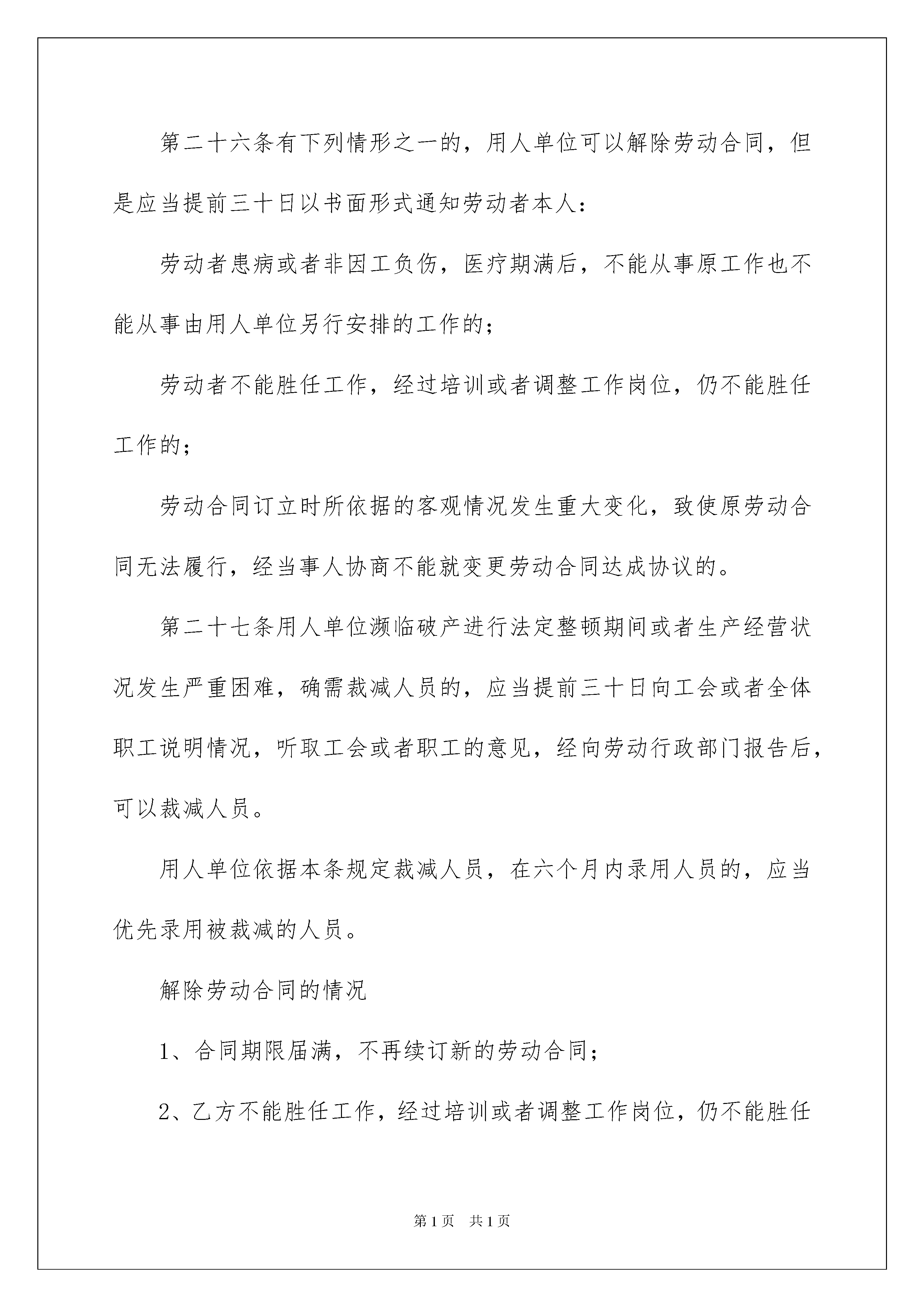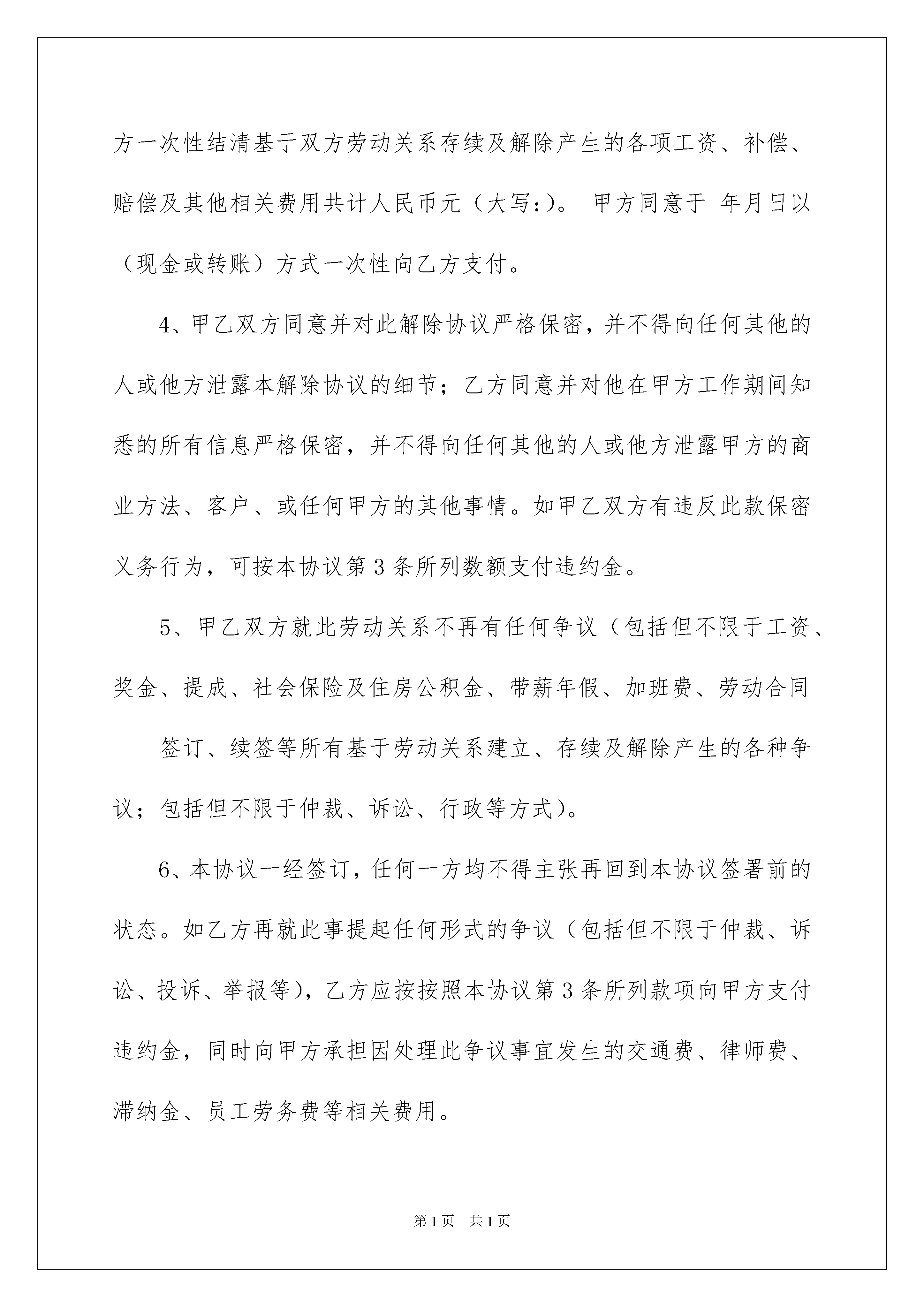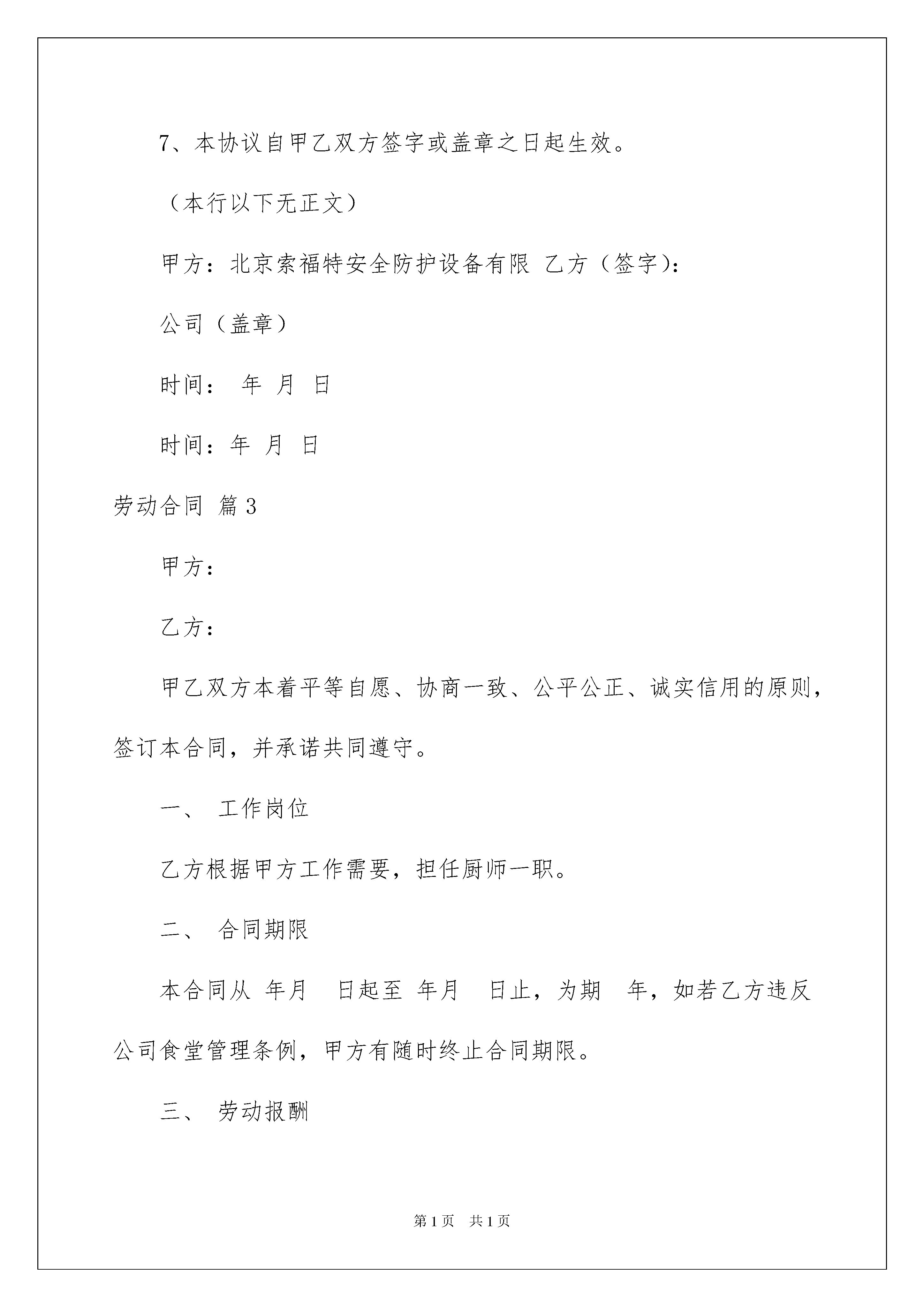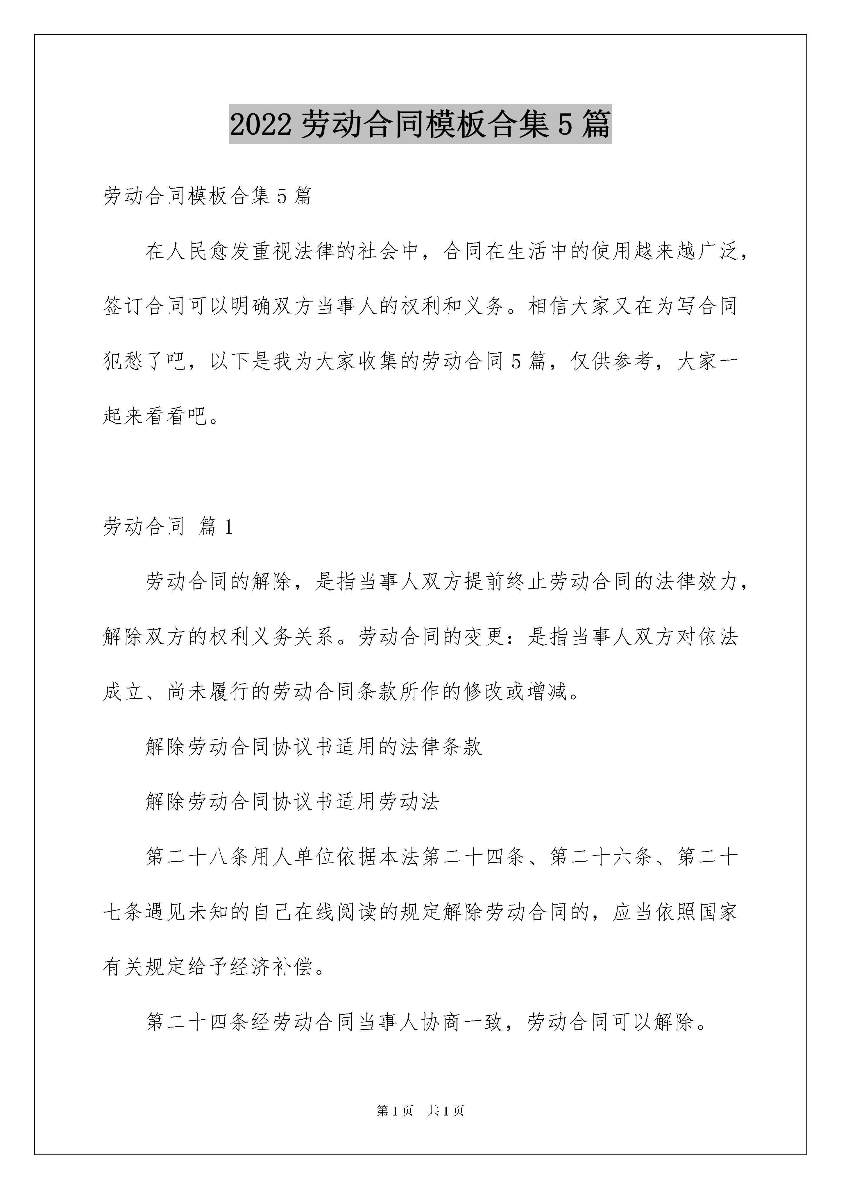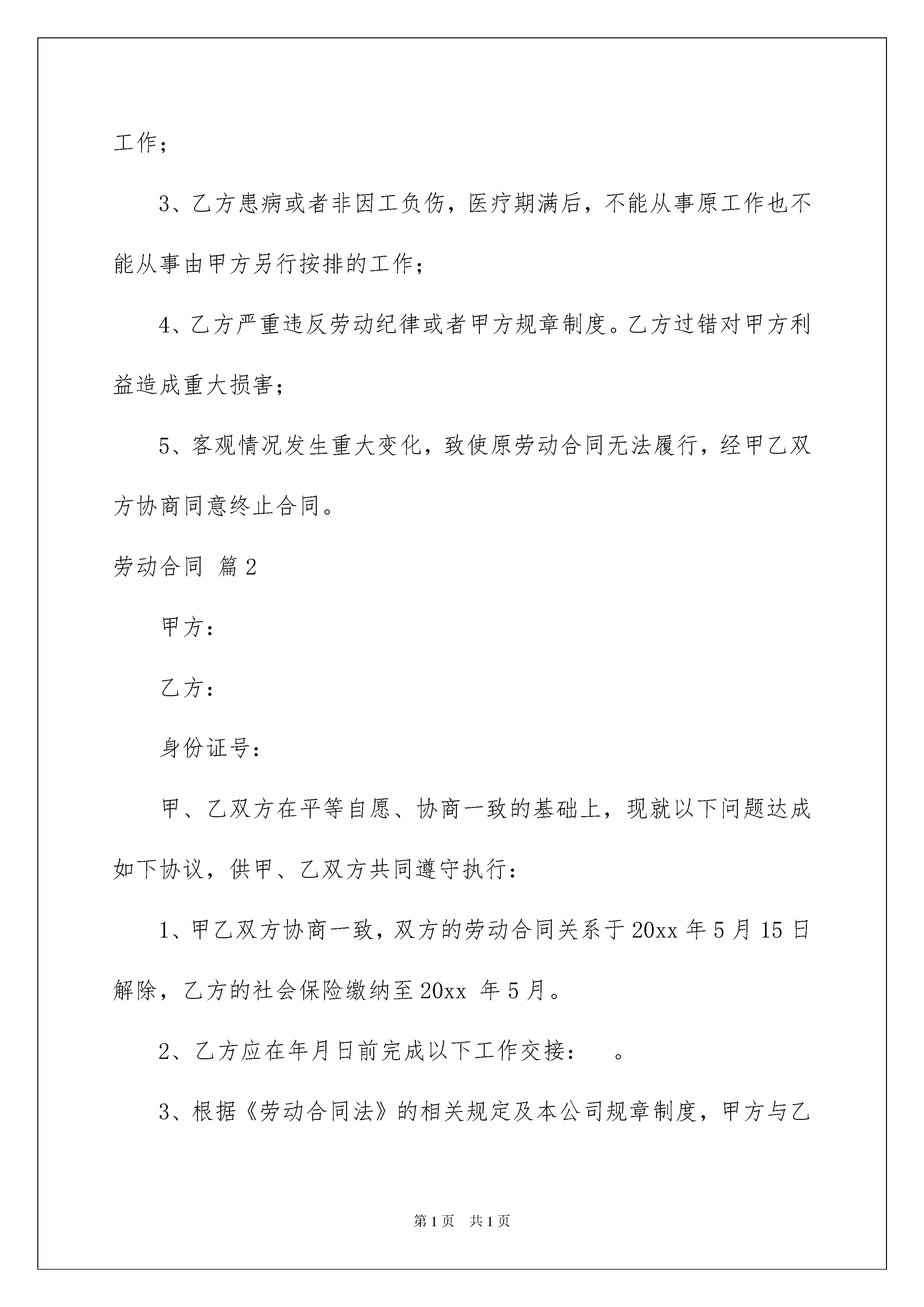 2022劳动合同模板合集5篇劳动合同模板合集5篇在人民愈发重视法律的社会中,合同在生活中的使用越来越广泛,签订合同可以明确双方当事人的权利和义务。相信大家又在为写合同犯愁了吧,以下是我为大家收集的劳动合同5篇,仅供参考,大家一起来看看吧。劳动合同篇1劳动合同的解除,是指当事人双方提前终止劳动合同的法律效力,解除双方的权利义务关系。劳动合同的变更:是指当事人双方对依法成立、尚未履行的劳动合同条款所作的修改或增减。解除劳动合同协议书适用的法律条款解除劳动合同协议书适用劳动法第二十八条用人单位依据本法第二十四条、第二十六条、第二十七条遇见未知的自己在线阅读的规定解除劳动合同的,应当依照国家有关规定给予经济补偿。第二十四条经劳动合同当事人协商一致,劳动合同可以解除。第二十六条有下列情形之一的,用人单位可以解除劳动合同,但是应当提前三十日以书面形式通知劳动者本人:劳动者患病或者非因工负伤,医疗期满后,不能从事原工作也不能从事由用人单位另行安排的工作的;劳动者不能胜任工作,经过培训或者调整工作岗位,仍不能胜任工作的;劳动合同订立时所依据的客观情况发生重大变化,致使原劳动合同无法履行,经当事人协商不能就变更劳动合同达成协议的。第二十七条用人单位濒临破产进行法定整顿期间或者生产经营状况发生严重困难,确需裁减人员的,应当提前三十日向工会或者全体职工说明情况,听取工会或者职工的意见,经向劳动行政部门报告后,可以裁减人员。用人单位依据本条规定裁减人员,在六个月内录用人员的,应当优先录用被裁减的人员。解除劳动合同的情况1、合同期限届满,不再续订新的劳动合同;2、乙方不能胜任工作,经过培训或者调整工作岗位,仍不能胜任工作;3、乙方患病或者非因工负伤,医疗期满后,不能从事原工作也不能从事由甲方另行按排的工作;4、乙方严重违反劳动纪律或者甲方规章制度。乙方过错对甲方利益造成重大损害;5、客观情况发生重大变化,致使原劳动合同无法履行,经甲乙双方协商同意终止合同。劳动合同篇2甲方:乙方:身份证号:甲、乙双方在平等自愿、协商一致的基础上,现就以下问题达成如下协议,供甲、乙双方共同遵守执行:1、甲乙双方协商一致,双方的劳动合同关系于20xx年5月15日解除,乙方的社会保险缴纳至20xx年5月。2、乙方应在年月日前完成以下工作交接:。3、根据《劳动合同法》的相关规定及本公司规章制度,甲方与乙方一次性结清基于双方劳动关系存续及解除产生的各项工资、补偿、赔偿及其他相关费用共计人民币元(大写:)。甲方同意于年月日以(现金或转账)方式一次性向乙方支付。4、甲乙双方同意并对此解除协议严格保密,并不得向任何其他的人或他方泄露本解除协议的细节;乙方同意并对他在甲方工作期间知悉的所有信息严格保密,并不得向任何其他的人或他方泄露甲方的商业方法、客户、或任何甲方的其他事情。如甲乙双方有违反此款保密义务行为,可按本协议第3条所列数额支付违约金。5、甲乙双方就此劳动关系不再有任何争议(包括但不限于工资、奖金、提成、社会保险及住房公积金、带薪年假、加班费、劳动合同签订、续签等所有基于劳动关系建立、存续及解除产生的各种争议;包括但不限于仲裁、诉讼、行政等方式)。6、本协议一经签订,任何一方均不得主张再回到本协议签署前的状态。如乙方再就此事提起任何形式的争议(包括但不限于仲裁、诉讼、投诉、举报等),乙方应按按照本协议第3条所列款项向甲方支付违约金,同时向甲方承担因处理此争议事宜发生的交通费、律师费、滞纳金、员工劳务费等相关费用。7、本协议自甲乙双方签字或盖章之日起生效。(本行以下无正文)甲方:北京索福特安全防护设备有限乙方(签字):公司(盖章)时间:年月日时间:年月日劳动合同篇3甲方:乙方:甲乙双方本着平等自愿、协商一致、公平公正、诚实信用的原则,签订本合同,并承诺共同遵守。一、工作岗位乙方根据甲方工作需要,担任厨师一职。二、合同期限本合同从年月日起至年月日止,为期年,如若乙方违反公司食堂管理条例,甲方有随时终止合同期限。三、劳动报酬甲方按照协议规定,以货币形式支付乙方工资:乙方工资标准:基本工资元/月四、相关协定1、乙方在岗期间负责为公司员工烧饭工作,负责食堂卫生清洁,并遵守公司食堂管理制度。2、乙方在岗期间因自身身体原因发生的一切事故,甲方不负任何责任。在岗期间发生的一切意外事故由自身负责。五、本合同自签字盖章之日起生效。附:1、必须遵守公司规章制度,如有违反按照制度执行。2、必须按要求完成公司交给的工作任务,如个人原因造成公司损失的全额赔偿。甲方盖章:年月乙方签字:年月日日劳动合同篇4甲方:乙方:法定代表人:身份证号:负责人:联系电话