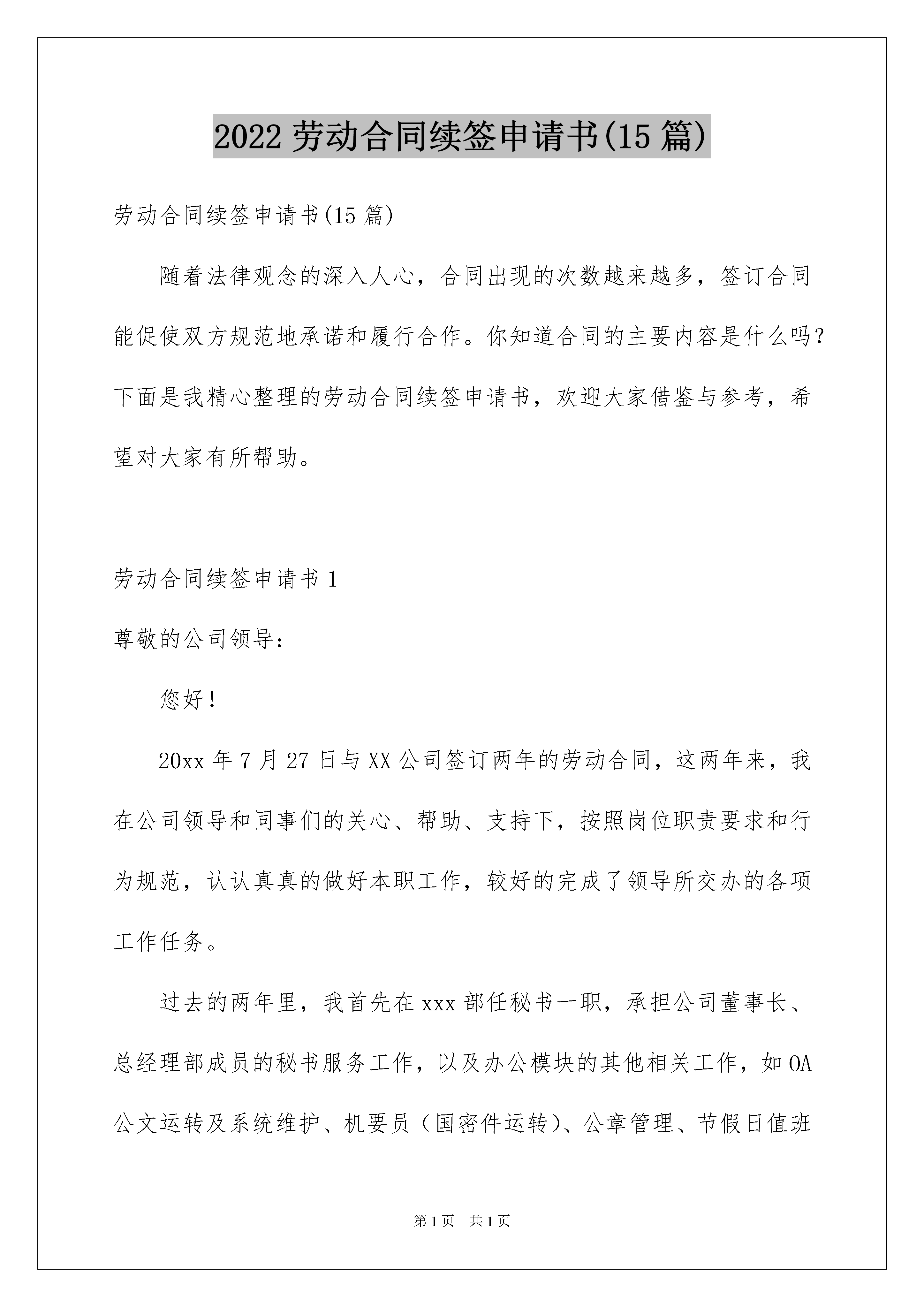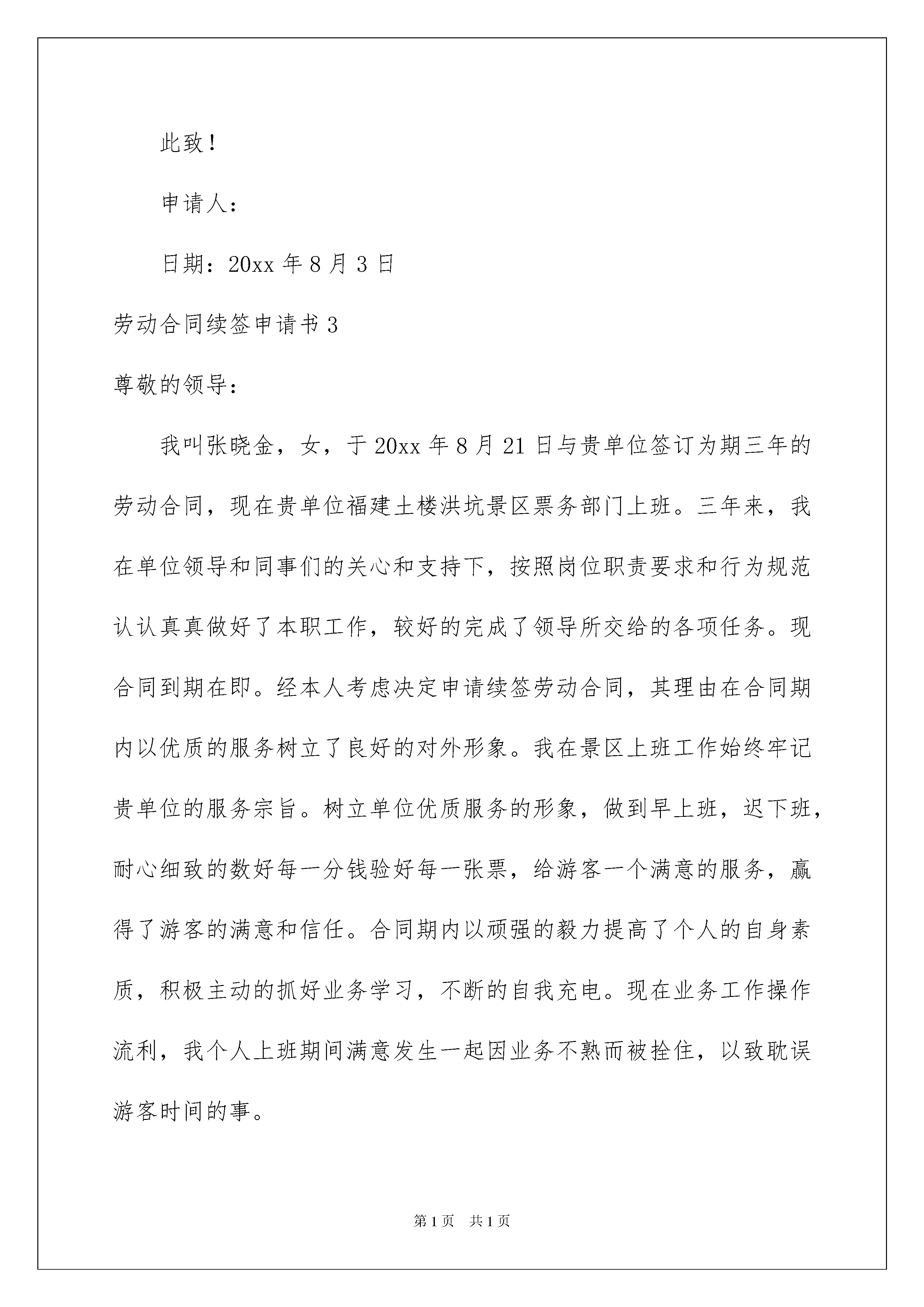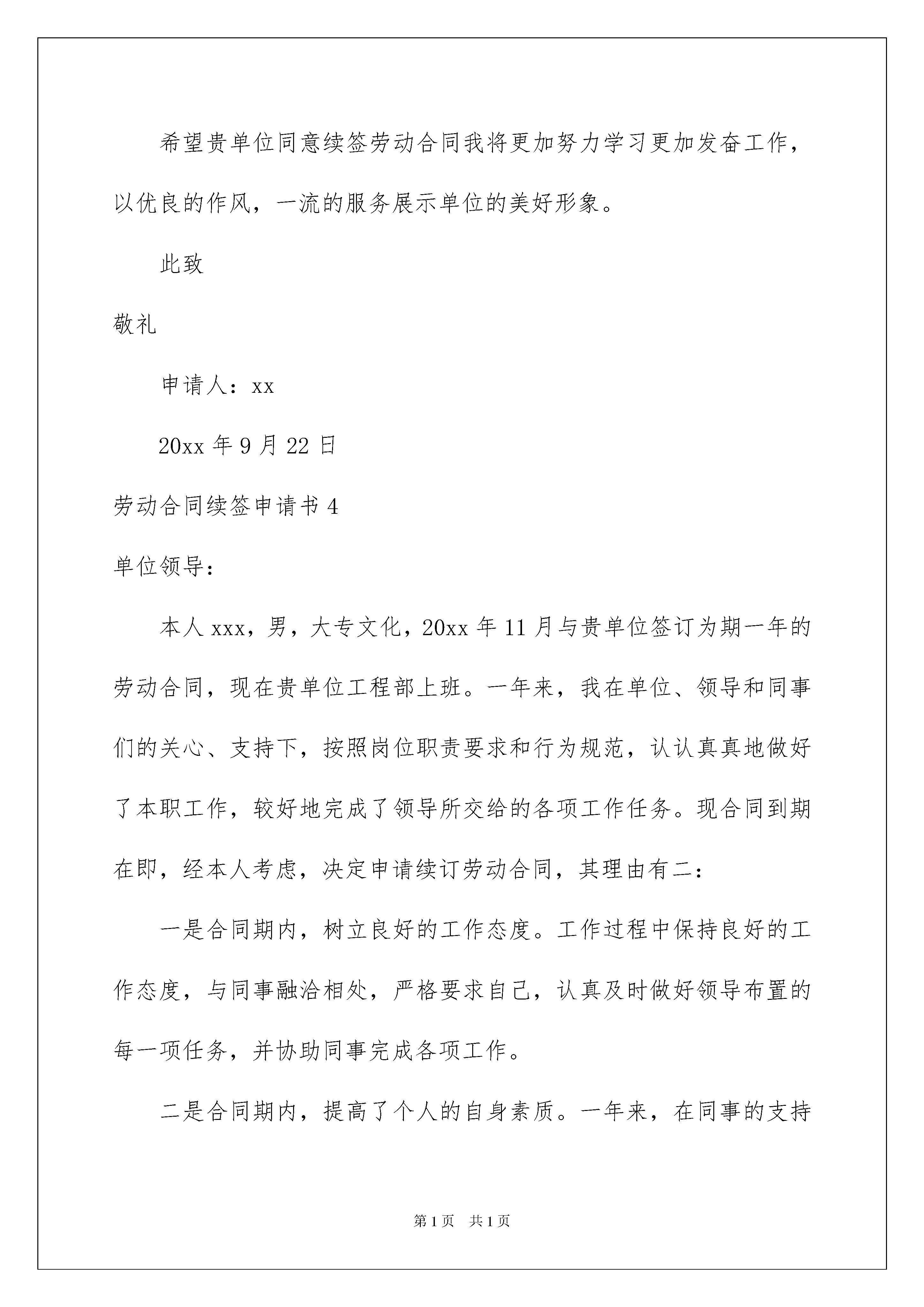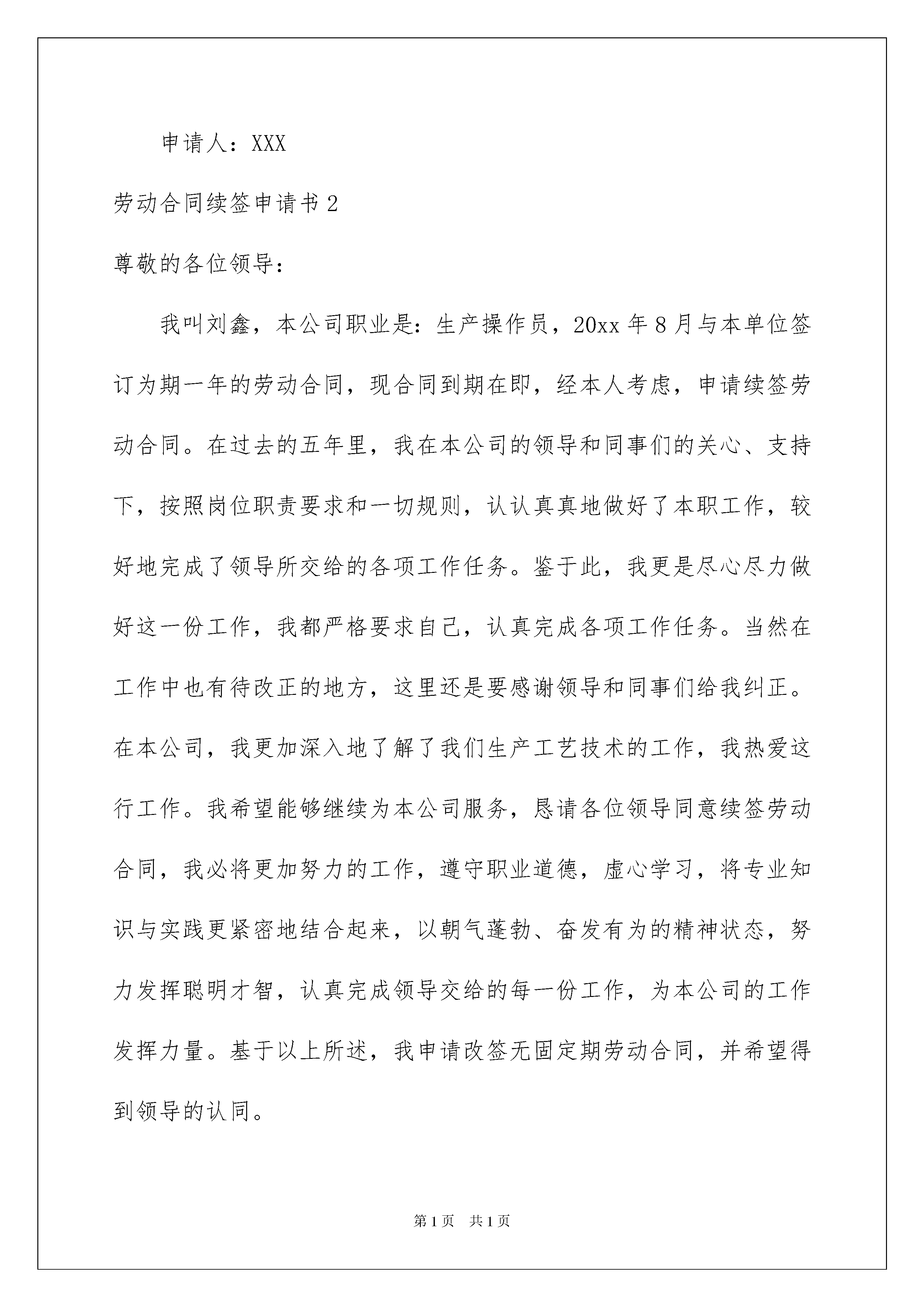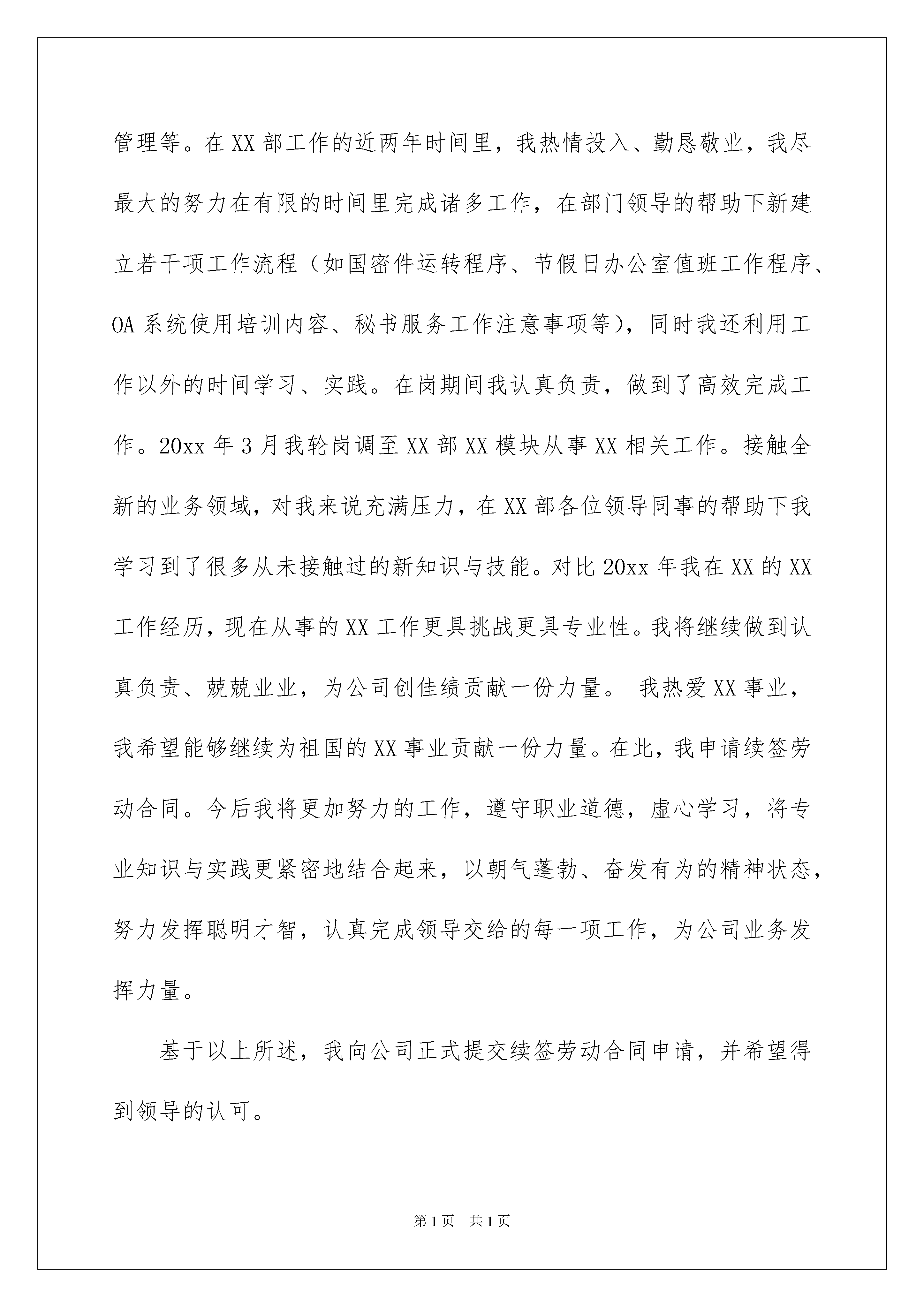 2022劳动合同续签申请书(15篇)劳动合同续签申请书(15篇)随着法律观念的深入人心,合同出现的次数越来越多,签订合同能促使双方规范地承诺和履行合作。你知道合同的主要内容是什么吗?下面是我精心整理的劳动合同续签申请书,欢迎大家借鉴与参考,希望对大家有所帮助。劳动合同续签申请书1尊敬的公司领导:您好!20xx年7月27日与XX公司签订两年的劳动合同,这两年来,我在公司领导和同事们的关心、帮助、支持下,按照岗位职责要求和行为规范,认认真真的做好本职工作,较好的完成了领导所交办的各项工作任务。过去的两年里,我首先在xxx部任秘书一职,承担公司董事长、总经理部成员的秘书服务工作,以及办公模块的其他相关工作,如OA公文运转及系统维护、机要员(国密件运转)、公章管理、节假日值班管理等。在XX部工作的近两年时间里,我热情投入、勤恳敬业,我尽最大的努力在有限的时间里完成诸多工作,在部门领导的帮助下新建立若干项工作流程(如国密件运转程序、节假日办公室值班工作程序、OA系统使用培训内容、秘书服务工作注意事项等),同时我还利用工作以外的时间学习、实践。在岗期间我认真负责,做到了高效完成工作。20xx年3月我轮岗调至XX部XX模块从事XX相关工作。接触全新的业务领域,对我来说充满压力,在XX部各位领导同事的帮助下我学习到了很多从未接触过的新知识与技能。对比20xx年我在XX的XX工作经历,现在从事的XX工作更具挑战更具专业性。我将继续做到认真负责、兢兢业业,为公司创佳绩贡献一份力量。我热爱XX事业,我希望能够继续为祖国的XX事业贡献一份力量。在此,我申请续签劳动合同。今后我将更加努力的工作,遵守职业道德,虚心学习,将专业知识与实践更紧密地结合起来,以朝气蓬勃、奋发有为的精神状态,努力发挥聪明才智,认真完成领导交给的每一项工作,为公司业务发挥力量。基于以上所述,我向公司正式提交续签劳动合同申请,并希望得到领导的认可。申请人:XXX劳动合同续签申请书2尊敬的各位领导:我叫刘鑫,本公司职业是:生产操作员,20xx年8月与本单位签订为期一年的劳动合同,现合同到期在即,经本人考虑,申请续签劳动合同。在过去的五年里,我在本公司的领导和同事们的关心、支持下,按照岗位职责要求和一切规则,认认真真地做好了本职工作,较好地完成了领导所交给的各项工作任务。鉴于此,我更是尽心尽力做好这一份工作,我都严格要求自己,认真完成各项工作任务。当然在工作中也有待改正的地方,这里还是要感谢领导和同事们给我纠正。在本公司,我更加深入地了解了我们生产工艺技术的工作,我热爱这行工作。我希望能够继续为本公司服务,恳请各位领导同意续签劳动合同,我必将更加努力的工作,遵守职业道德,虚心学习,将专业知识与实践更紧密地结合起来,以朝气蓬勃、奋发有为的精神状态,努力发挥聪明才智,认真完成领导交给的每一份工作,为本公司的工作发挥力量。基于以上所述,我申请改签无固定期劳动合同,并希望得到领导的认同。此致!申请人:日期:20xx年8月3日劳动合同续签申请书3尊敬的领导:我叫张晓金,女,于20xx年8月21日与贵单位签订为期三年的劳动合同,现在贵单位福建土楼洪坑景区票务部门上班。三年来,我在单位领导和同事们的关心和支持下,按照岗位职责要求和行为规范认认真真做好了本职工作,较好的完成了领导所交给的各项任务。现合同到期在即。经本人考虑决定申请续签劳动合同,其理由在合同期内以优质的服务树立了良好的对外形象。我在景区上班工作始终牢记贵单位的服务宗旨。树立单位优质服务的形象,做到早上班,迟下班,耐心细致的数好每一分钱验好每一张票,给游客一个满意的服务,赢得了游客的满意和信任。合同期内以顽强的毅力提高了个人的自身素质,积极主动的抓好业务学习,不断的自我充电。现在业务工作操作流利,我个人上班期间满意发生一起因业务不熟而被拴住,以致耽误游客时间的事。希望贵单位同意续签劳动合同我将更加努力学习更加发奋工作,以优良的作风,一流的服务展示单位的美好形象。此致敬礼申请人:xx20xx年9月22日劳动合同续签申请书4单位领导:本人xxx,男,大专文化,20xx年11月与贵单位签订为期一年的劳动合同,现在贵单位工程部上班。一年来,我在单位、领导和同事们的关心、支持下,按照岗位职责要求和行为规范,认认真真地做好了本职工作,较好地完成了领导所交给的各项工作任务。现合同到期在即,经本人考虑,决定申请续订劳动合同,其理由有二:一是合同期内,树立良好的工作态度。工作过程中保持良好的工作态度,与同事融洽相处,严格要求自己,认真及时做好领导布置的每一项任务,并协助同事完成各项工作。二是合同期内,