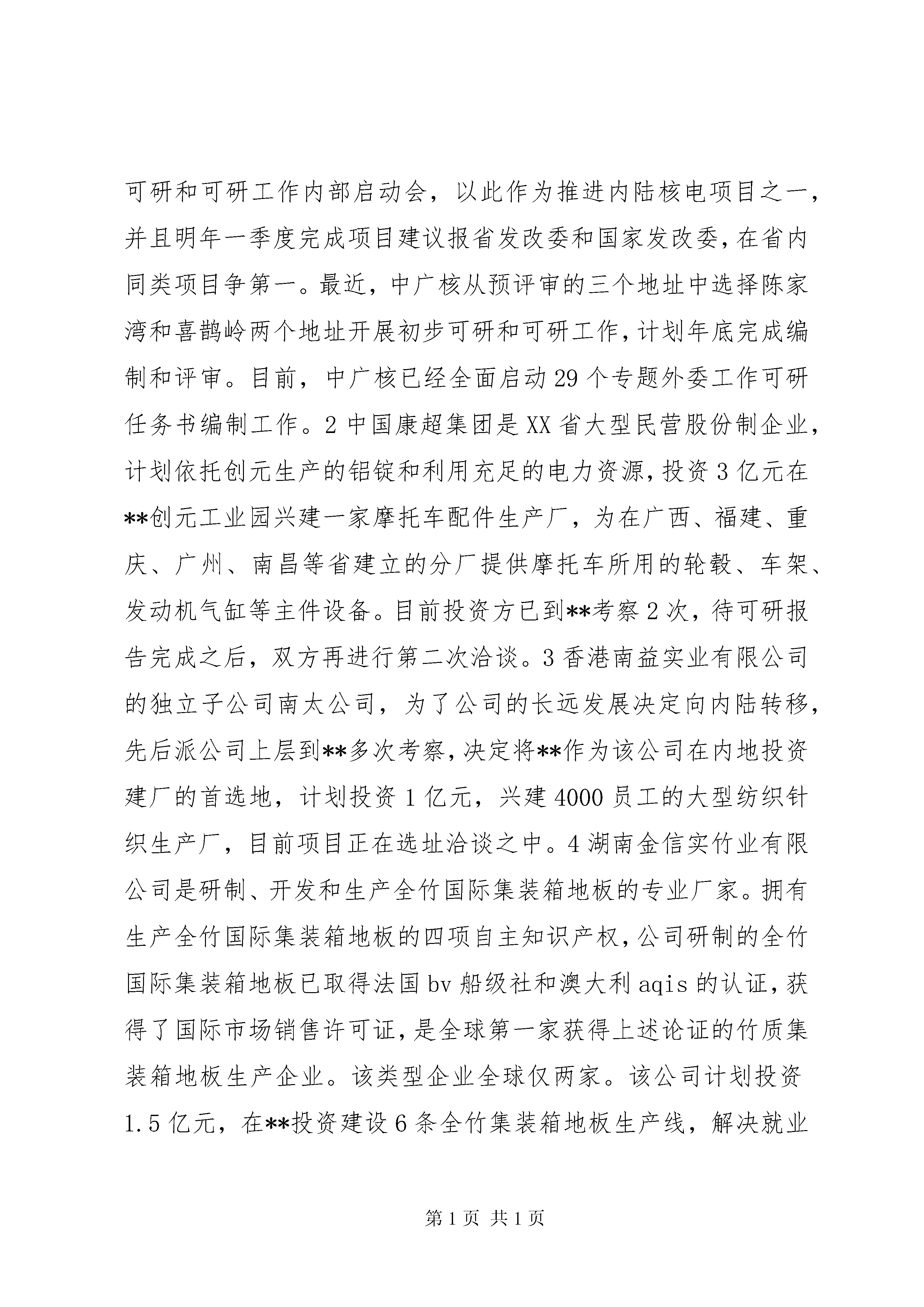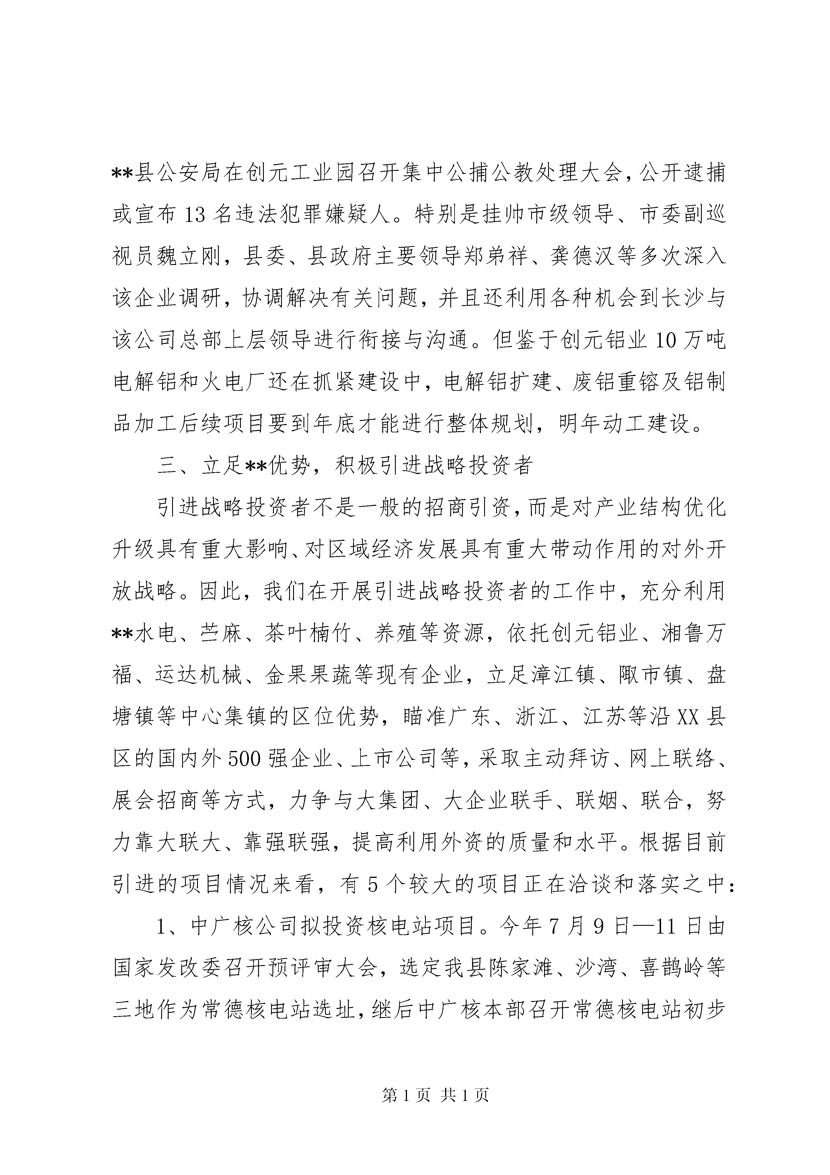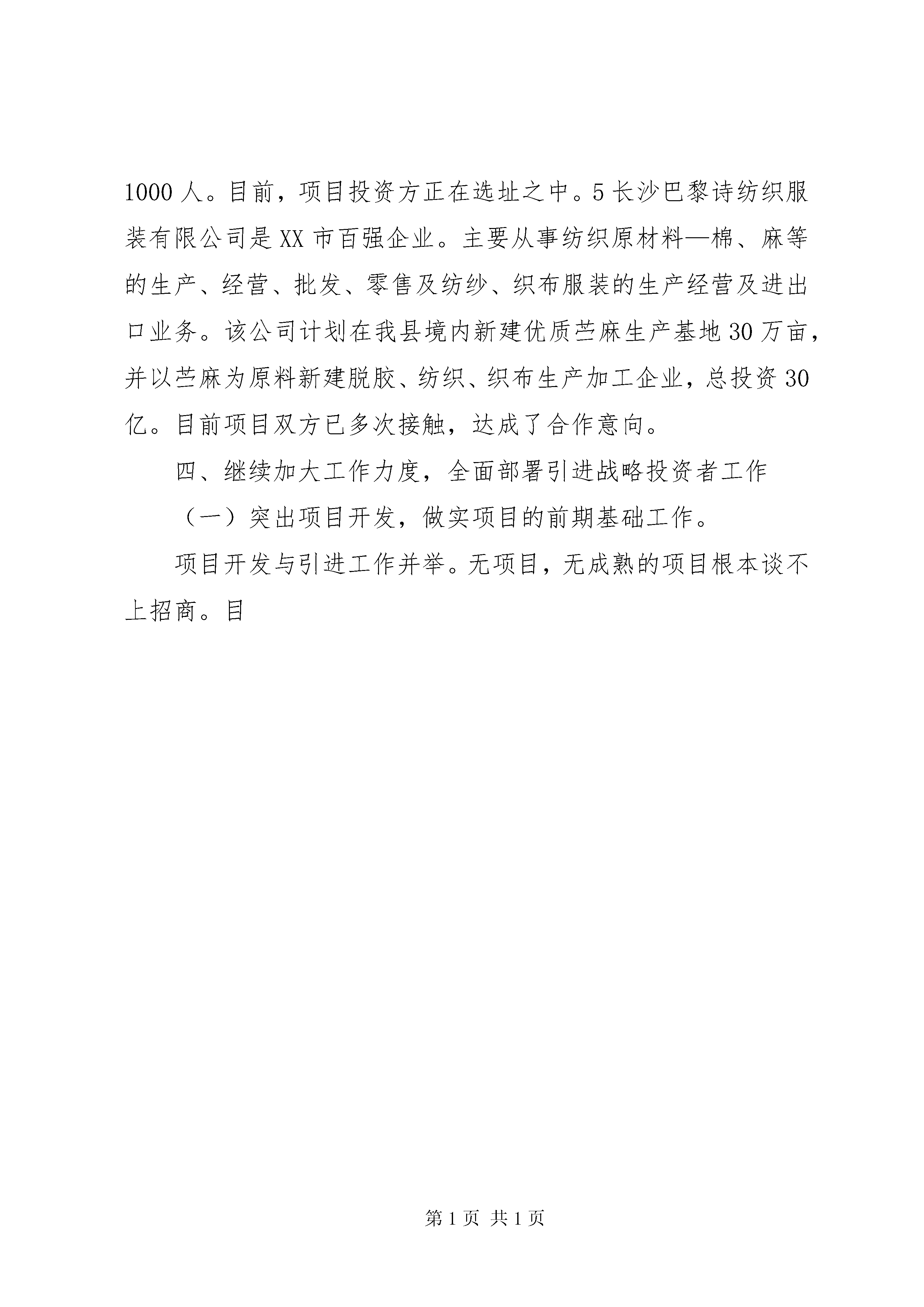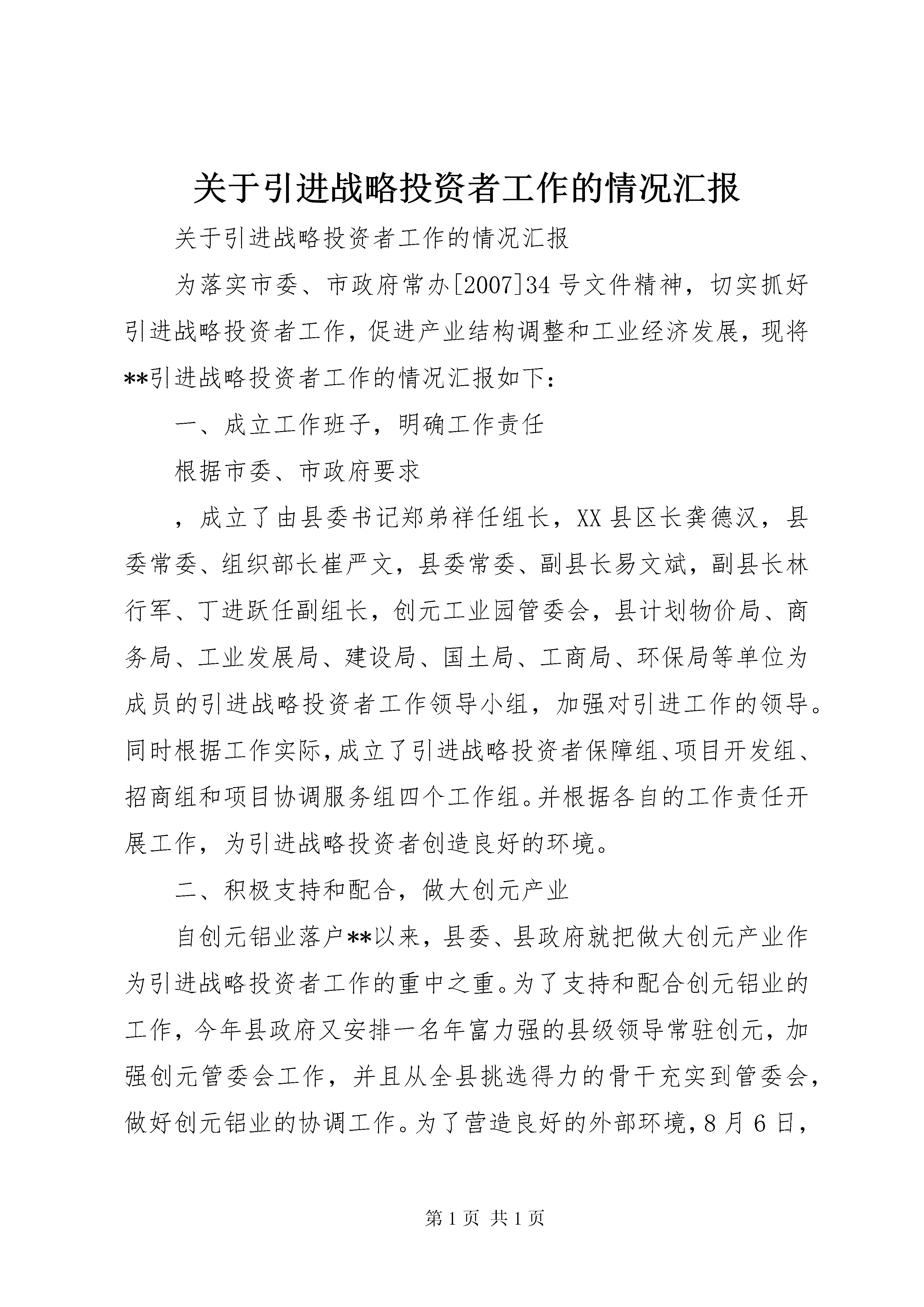 关于引进战略投资者工作的情况汇报关于引进战略投资者工作的情况汇报为落实市委、市政府常办[2007]34号文件精神,切实抓好引进战略投资者工作,促进产业结构调整和工业经济发展,现将**引进战略投资者工作的情况汇报如下:一、成立工作班子,明确工作责任根据市委、市政府要求,成立了由县委书记郑弟祥任组长,XX县区长龚德汉,县委常委、组织部长崔严文,县委常委、副县长易文斌,副县长林行军、丁进跃任副组长,创元工业园管委会,县计划物价局、商务局、工业发展局、建设局、国土局、工商局、环保局等单位为成员的引进战略投资者工作领导小组,加强对引进工作的领导。同时根据工作实际,成立了引进战略投资者保障组、项目开发组、招商组和项目协调服务组四个工作组。并根据各自的工作责任开展工作,为引进战略投资者创造良好的环境。二、积极支持和配合,做大创元产业自创元铝业落户**以来,县委、县政府就把做大创元产业作为引进战略投资者工作的重中之重。为了支持和配合创元铝业的工作,今年县政府又安排一名年富力强的县级领导常驻创元,加强创元管委会工作,并且从全县挑选得力的骨干充实到管委会,做好创元铝业的协调工作。为了营造良好的外部环境,8月6日,**县公安局在创元工业园召开集中公捕公教处理大会,公开逮捕或宣布13名违法犯罪嫌疑人。特别是挂帅市级领导、市委副巡视员魏立刚,县委、县政府主要领导郑弟祥、龚德汉等多次深入该企业调研,协调解决有关问题,并且还利用各种机会到长沙与该公司总部上层领导进行衔接与沟通。但鉴于创元铝业10万吨电解铝和火电厂还在抓紧建设中,电解铝扩建、废铝重镕及铝制品加工后续项目要到年底才能进行整体规划,明年动工建设。三、立足**优势,积极引进战略投资者引进战略投资者不是一般的招商引资,而是对产业结构优化升级具有重大影响、对区域经济发展具有重大带动作用的对外开放战略。因此,我们在开展引进战略投资者的工作中,充分利用**水电、苎麻、茶叶楠竹、养殖等资源,依托创元铝业、湘鲁万福、运达机械、金果果蔬等现有企业,立足漳江镇、陬市镇、盘塘镇等中心集镇的区位优势,瞄准广东、浙江、江苏等沿XX县区的国内外500强企业、上市公司等,采取主动拜访、网上联络、展会招商等方式,力争与大集团、大企业联手、联姻、联合,努力靠大联大、靠强联强,提高利用外资的质量和水平。根据目前引进的项目情况来看,有5个较大的项目正在洽谈和落实之中:1、中广核公司拟投资核电站项目。今年7月9日—11日由国家发改委召开预评审大会,选定我县陈家滩、沙湾、喜鹊岭等三地作为常德核电站选址,继后中广核本部召开常德核电站初步可研和可研工作内部启动会,以此作为推进内陆核电项目之一,并且明年一季度完成项目建议报省发改委和国家发改委,在省内同类项目争第一。最近,中广核从预评审的三个地址中选择陈家湾和喜鹊岭两个地址开展初步可研和可研工作,计划年底完成编制和评审。目前,中广核已经全面启动29个专题外委工作可研任务书编制工作。2中国康超集团是XX省大型民营股份制企业,计划依托创元生产的铝锭和利用充足的电力资源,投资3亿元在**创元工业园兴建一家摩托车配件生产厂,为在广西、福建、重庆、广州、南昌等省建立的分厂提供摩托车所用的轮毂、车架、发动机气缸等主件设备。目前投资方已到**考察2次,待可研报告完成之后,双方再进行第二次洽谈。3香港南益实业有限公司的独立子公司南太公司,为了公司的长远发展决定向内陆转移,先后派公司上层到**多次考察,决定将**作为该公司在内地投资建厂的首选地,计划投资1亿元,兴建4000员工的大型纺织针织生产厂,目前项目正在选址洽谈之中。4湖南金信实竹业有限公司是研制、开发和生产全竹国际集装箱地板的专业厂家。拥有生产全竹国际集装箱地板的四项自主知识产权,公司研制的全竹国际集装箱地板已取得法国bv船级社和澳大利aqis的认证,获得了国际市场销售许可证,是全球第一家获得上述论证的竹质集装箱地板生产企业。该类型企业全球仅两家。该公司计划投资1.5亿元,在**投资建设6条全竹集装箱地板生产线,解决就业1000人。目前,项目投资方正在选址之中。5长沙巴黎诗纺织服装有限公司是XX市百强企业。主要从事纺织原材料—棉、麻等的生产、经营、批发、零售及纺纱、织布服装的生产经营及进出口业务。该公司计划在我县境内新建优质苎麻生产基地30万亩,并以苎麻为原料新建脱胶、纺织、织布生产加工企业,总投资30亿。目前项目双方已多次接触,达成了合作意向。四、继续加大工作力度,全面部署引进战略投资者工作(一)突出项目开发,做实项目的前期基础工作。项目开发与引进工作并举。无项目,无成熟的项目根本谈不上招商。目