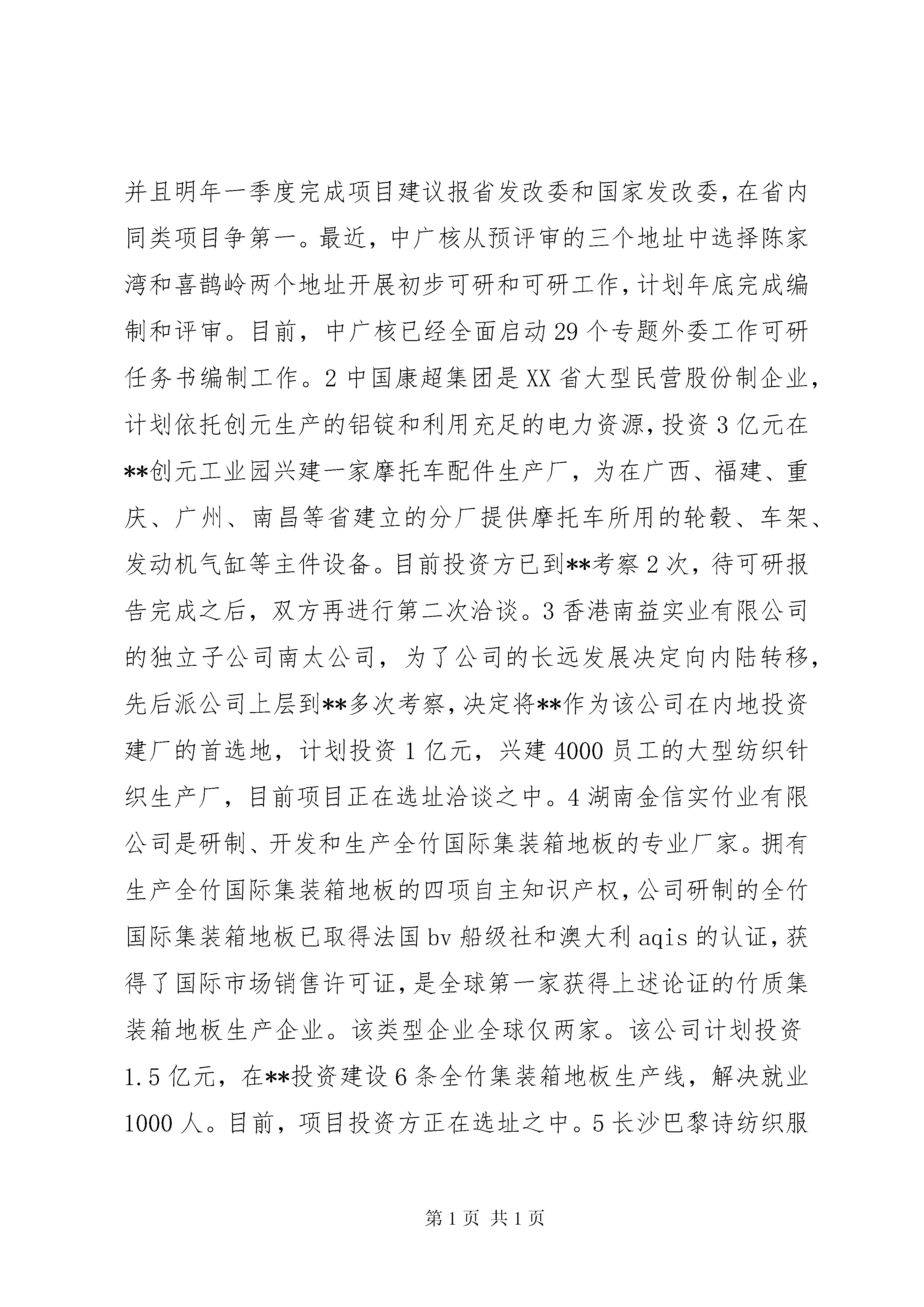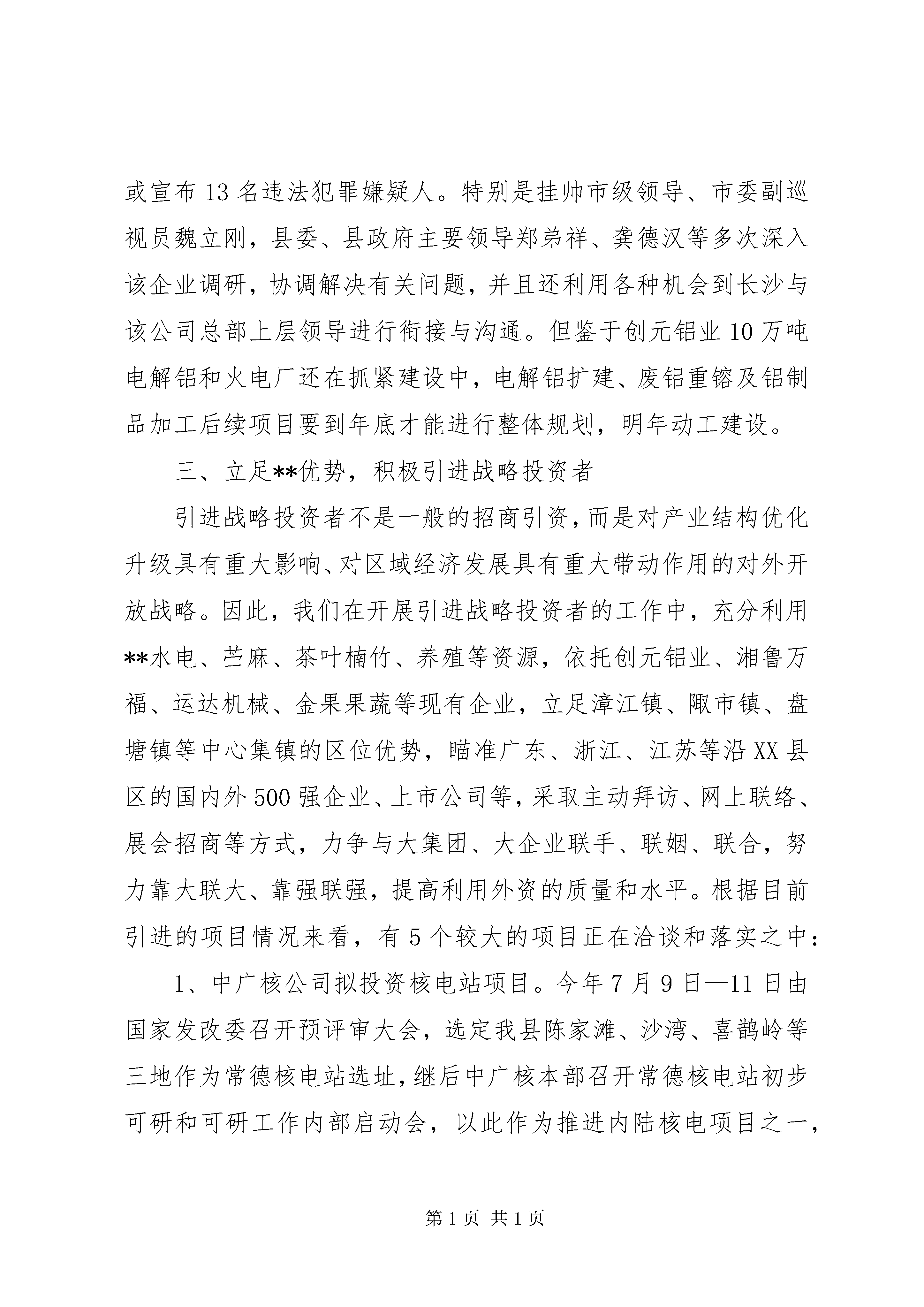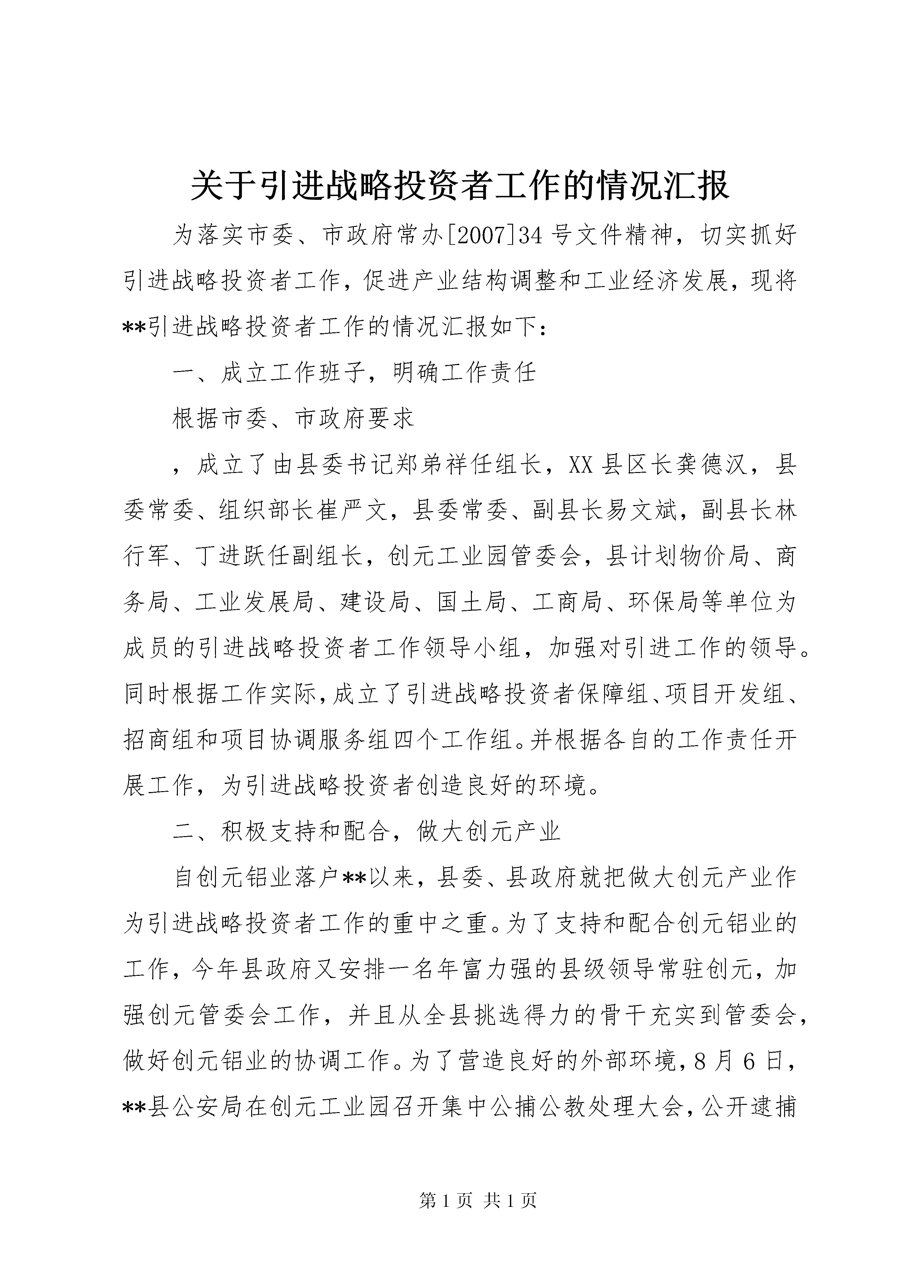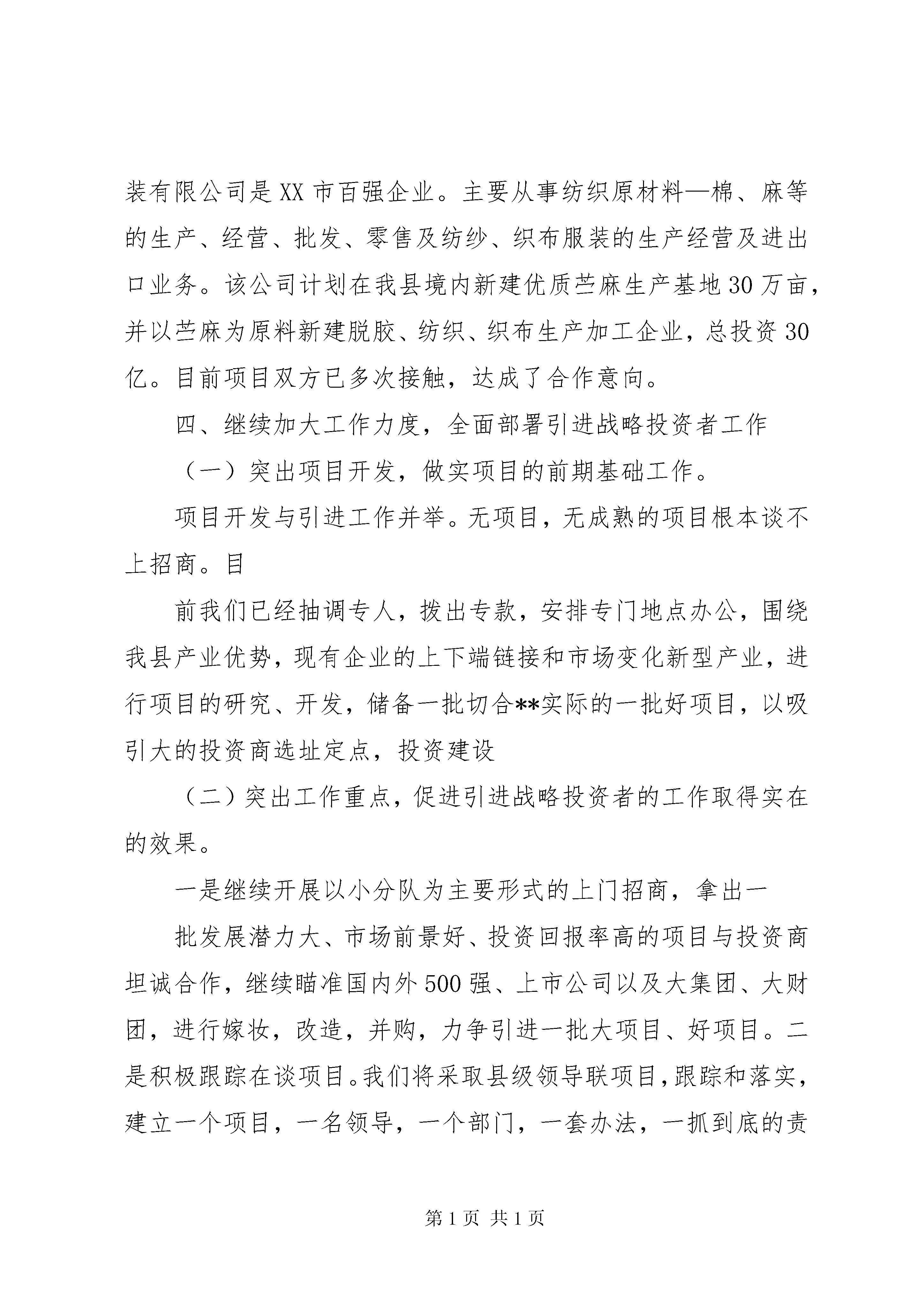 关于引进战略投资者工作的情况汇报为落实市委、市政府常办[2007]34号文件精神,切实抓好引进战略投资者工作,促进产业结构调整和工业经济发展,现将**引进战略投资者工作的情况汇报如下:一、成立工作班子,明确工作责任根据市委、市政府要求,成立了由县委书记郑弟祥任组长,XX县区长龚德汉,县委常委、组织部长崔严文,县委常委、副县长易文斌,副县长林行军、丁进跃任副组长,创元工业园管委会,县计划物价局、商务局、工业发展局、建设局、国土局、工商局、环保局等单位为成员的引进战略投资者工作领导小组,加强对引进工作的领导。同时根据工作实际,成立了引进战略投资者保障组、项目开发组、招商组和项目协调服务组四个工作组。并根据各自的工作责任开展工作,为引进战略投资者创造良好的环境。二、积极支持和配合,做大创元产业自创元铝业落户**以来,县委、县政府就把做大创元产业作为引进战略投资者工作的重中之重。为了支持和配合创元铝业的工作,今年县政府又安排一名年富力强的县级领导常驻创元,加强创元管委会工作,并且从全县挑选得力的骨干充实到管委会,做好创元铝业的协调工作。为了营造良好的外部环境,8月6日,**县公安局在创元工业园召开集中公捕公教处理大会,公开逮捕或宣布13名违法犯罪嫌疑人。特别是挂帅市级领导、市委副巡视员魏立刚,县委、县政府主要领导郑弟祥、龚德汉等多次深入该企业调研,协调解决有关问题,并且还利用各种机会到长沙与该公司总部上层领导进行衔接与沟通。但鉴于创元铝业10万吨电解铝和火电厂还在抓紧建设中,电解铝扩建、废铝重镕及铝制品加工后续项目要到年底才能进行整体规划,明年动工建设。三、立足**优势,积极引进战略投资者引进战略投资者不是一般的招商引资,而是对产业结构优化升级具有重大影响、对区域经济发展具有重大带动作用的对外开放战略。因此,我们在开展引进战略投资者的工作中,充分利用**水电、苎麻、茶叶楠竹、养殖等资源,依托创元铝业、湘鲁万福、运达机械、金果果蔬等现有企业,立足漳江镇、陬市镇、盘塘镇等中心集镇的区位优势,瞄准广东、浙江、江苏等沿XX县区的国内外500强企业、上市公司等,采取主动拜访、网上联络、展会招商等方式,力争与大集团、大企业联手、联姻、联合,努力靠大联大、靠强联强,提高利用外资的质量和水平。根据目前引进的项目情况来看,有5个较大的项目正在洽谈和落实之中:1、中广核公司拟投资核电站项目。今年7月9日—11日由国家发改委召开预评审大会,选定我县陈家滩、沙湾、喜鹊岭等三地作为常德核电站选址,继后中广核本部召开常德核电站初步可研和可研工作内部启动会,以此作为推进内陆核电项目之一,并且明年一季度完成项目建议报省发改委和国家发改委,在省内同类项目争第一。最近,中广核从预评审的三个地址中选择陈家湾和喜鹊岭两个地址开展初步可研和可研工作,计划年底完成编制和评审。目前,中广核已经全面启动29个专题外委工作可研任务书编制工作。2中国康超集团是XX省大型民营股份制企业,计划依托创元生产的铝锭和利用充足的电力资源,投资3亿元在**创元工业园兴建一家摩托车配件生产厂,为在广西、福建、重庆、广州、南昌等省建立的分厂提供摩托车所用的轮毂、车架、发动机气缸等主件设备。目前投资方已到**考察2次,待可研报告完成之后,双方再进行第二次洽谈。3香港南益实业有限公司的独立子公司南太公司,为了公司的长远发展决定向内陆转移,先后派公司上层到**多次考察,决定将**作为该公司在内地投资建厂的首选地,计划投资1亿元,兴建4000员工的大型纺织针织生产厂,目前项目正在选址洽谈之中。4湖南金信实竹业有限公司是研制、开发和生产全竹国际集装箱地板的专业厂家。拥有生产全竹国际集装箱地板的四项自主知识产权,公司研制的全竹国际集装箱地板已取得法国bv船级社和澳大利aqis的认证,获得了国际市场销售许可证,是全球第一家获得上述论证的竹质集装箱地板生产企业。该类型企业全球仅两家。该公司计划投资1.5亿元,在**投资建设6条全竹集装箱地板生产线,解决就业1000人。目前,项目投资方正在选址之中。5长沙巴黎诗纺织服装有限公司是XX市百强企业。主要从事纺织原材料—棉、麻等的生产、经营、批发、零售及纺纱、织布服装的生产经营及进出口业务。该公司计划在我县境内新建优质苎麻生产基地30万亩,并以苎麻为原料新建脱胶、纺织、织布生产加工企业,总投资30亿。目前项目双方已多次接触,达成了合作意向。四、继续加大工作力度,全面部署引进战略投资者工作(一)突出项目开发,做实项目的前期基础工作。项目开发与引进工作并举。无项目,无成熟的项目根本谈不上招商。目前我们已经抽调专人,拨出专款,安排专门地点办公,围绕我县产业优势,现有企业的上下端链接和市场变化新型产业,进行项目的研究、开发,储备一批切合**实际的一批好项目,