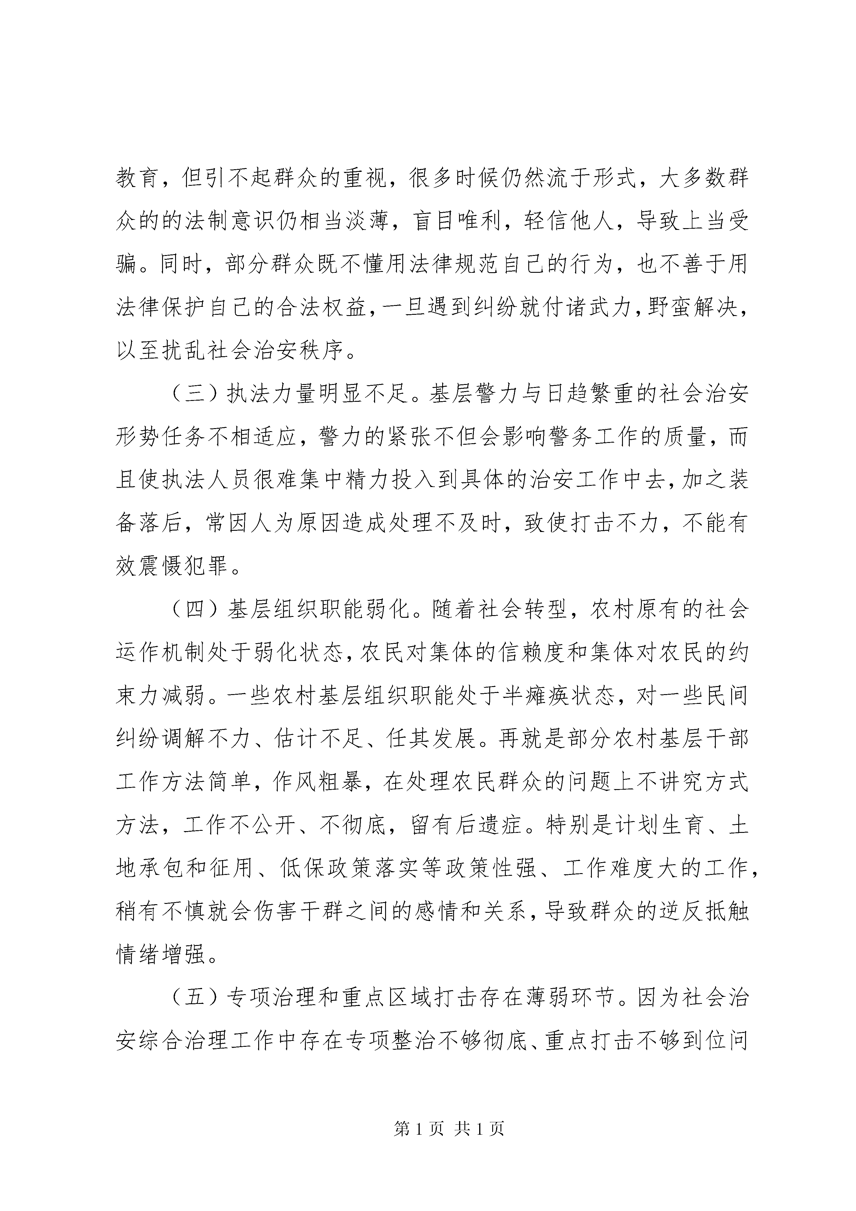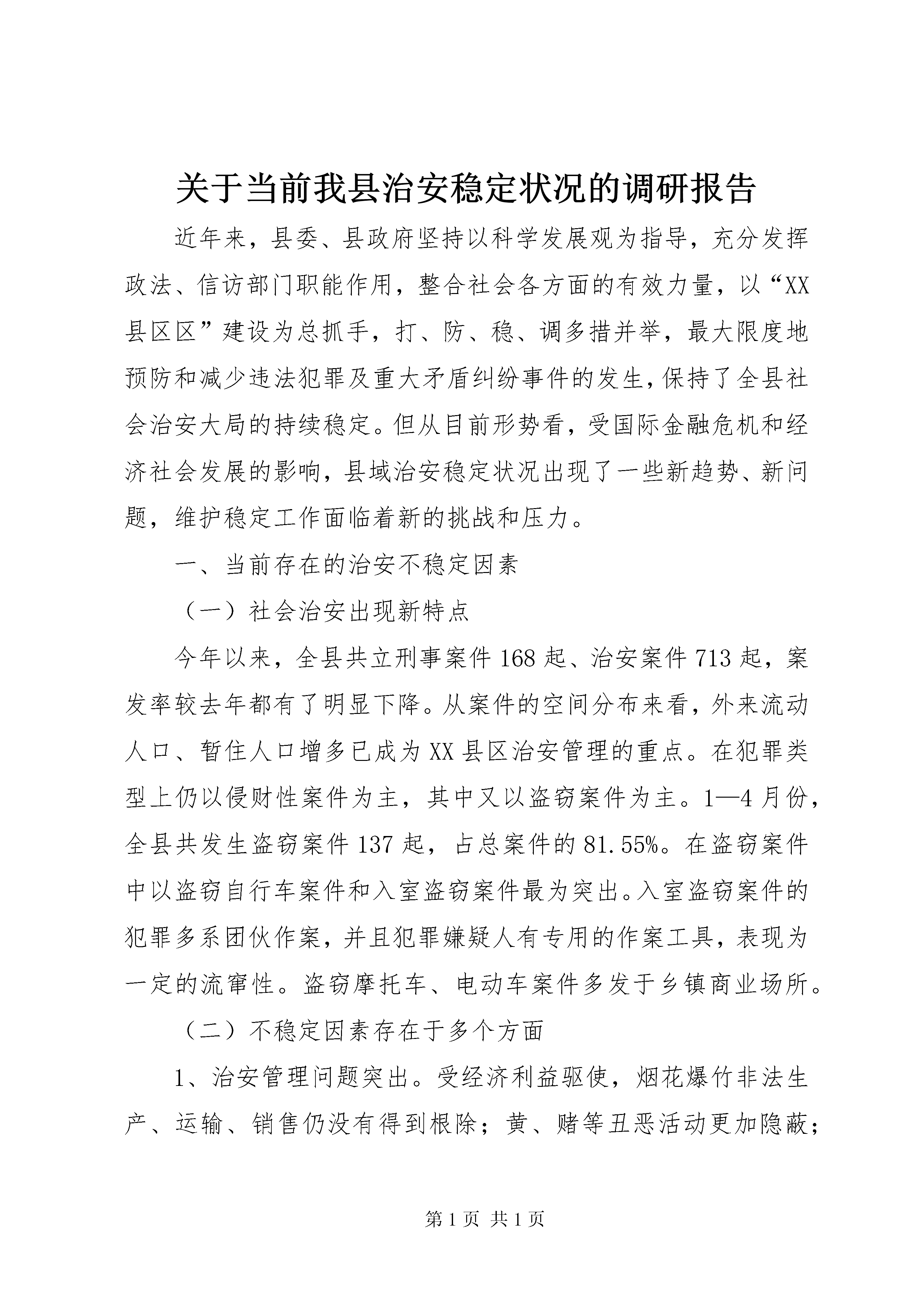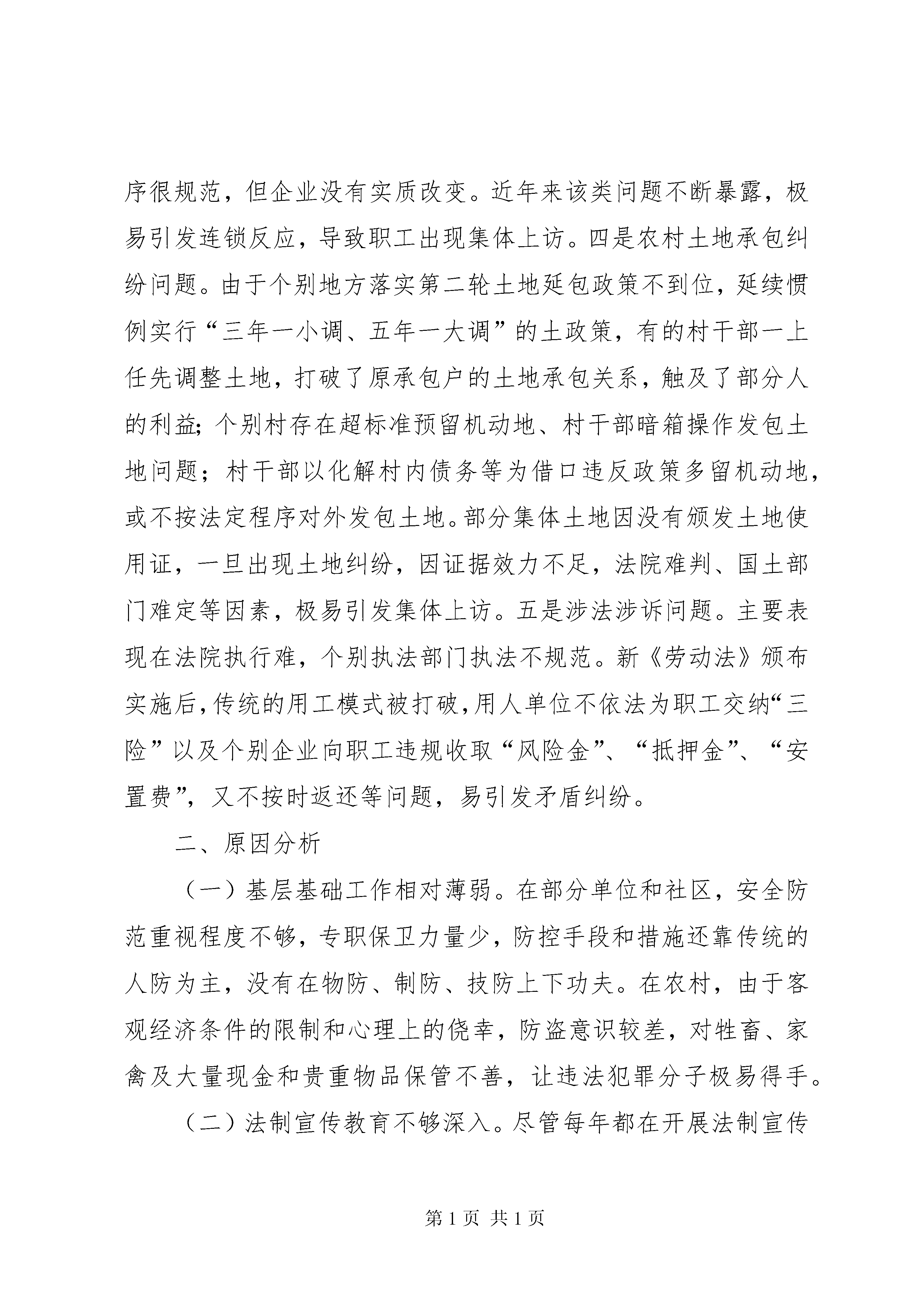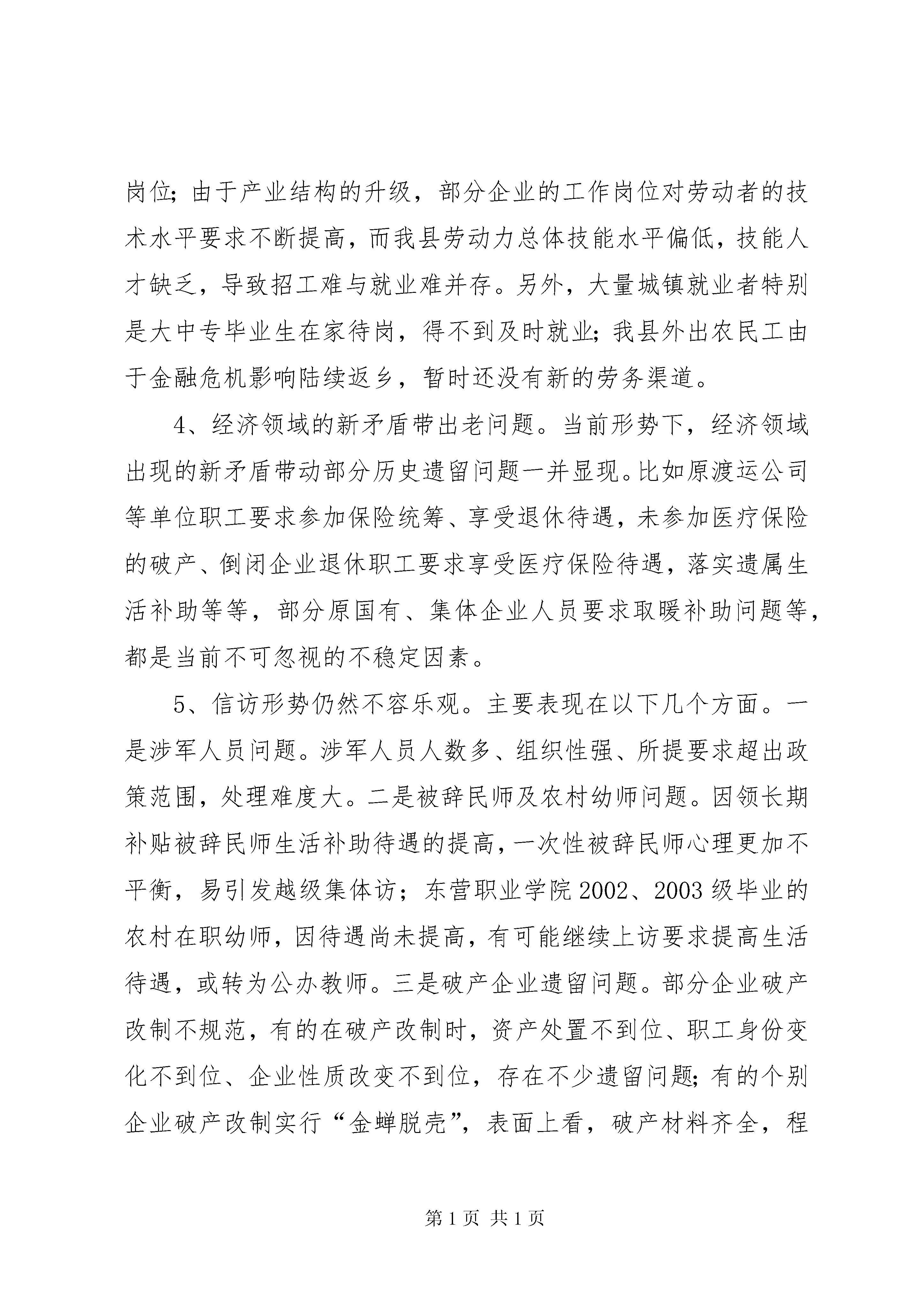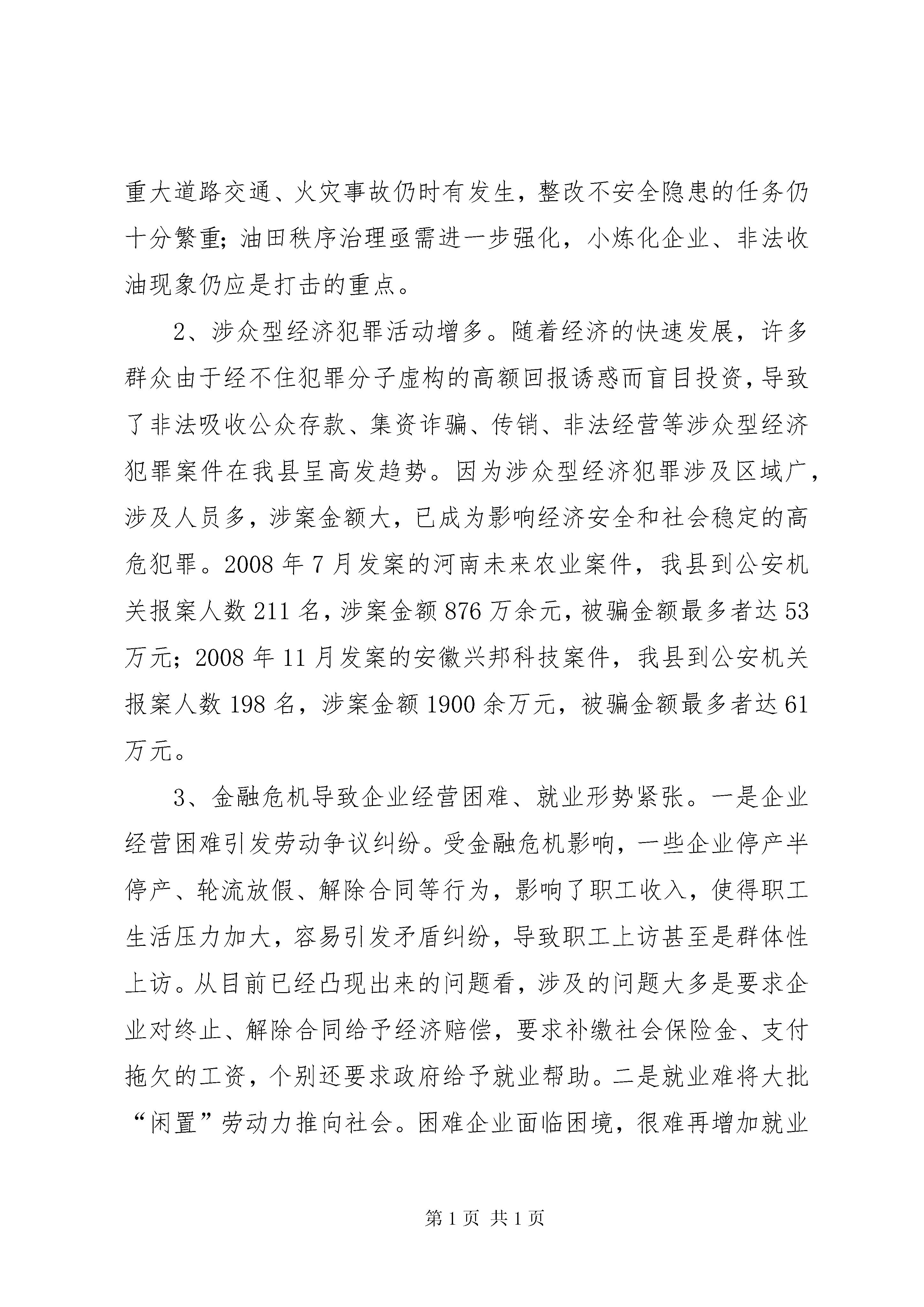 关于当前我县治安稳定状况的调研报告近年来,县委、县政府坚持以科学发展观为指导,充分发挥政法、信访部门职能作用,整合社会各方面的有效力量,以“XX县区区”建设为总抓手,打、防、稳、调多措并举,最大限度地预防和减少违法犯罪及重大矛盾纠纷事件的发生,保持了全县社会治安大局的持续稳定。但从目前形势看,受国际金融危机和经济社会发展的影响,县域治安稳定状况出现了一些新趋势、新问题,维护稳定工作面临着新的挑战和压力。一、当前存在的治安不稳定因素(一)社会治安出现新特点今年以来,全县共立刑事案件168起、治安案件713起,案发率较去年都有了明显下降。从案件的空间分布来看,外来流动人口、暂住人口增多已成为XX县区治安管理的重点。在犯罪类型上仍以侵财性案件为主,其中又以盗窃案件为主。1—4月份,全县共发生盗窃案件137起,占总案件的81.55%。在盗窃案件中以盗窃自行车案件和入室盗窃案件最为突出。入室盗窃案件的犯罪多系团伙作案,并且犯罪嫌疑人有专用的作案工具,表现为一定的流窜性。盗窃摩托车、电动车案件多发于乡镇商业场所。(二)不稳定因素存在于多个方面1、治安管理问题突出。受经济利益驱使,烟花爆竹非法生产、运输、销售仍没有得到根除;黄、赌等丑恶活动更加隐蔽;重大道路交通、火灾事故仍时有发生,整改不安全隐患的任务仍十分繁重;油田秩序治理亟需进一步强化,小炼化企业、非法收油现象仍应是打击的重点。2、涉众型经济犯罪活动增多。随着经济的快速发展,许多群众由于经不住犯罪分子虚构的高额回报诱惑而盲目投资,导致了非法吸收公众存款、集资诈骗、传销、非法经营等涉众型经济犯罪案件在我县呈高发趋势。因为涉众型经济犯罪涉及区域广,涉及人员多,涉案金额大,已成为影响经济安全和社会稳定的高危犯罪。2008年7月发案的河南未来农业案件,我县到公安机关报案人数211名,涉案金额876万余元,被骗金额最多者达53万元;2008年11月发案的安徽兴邦科技案件,我县到公安机关报案人数198名,涉案金额1900余万元,被骗金额最多者达61万元。3、金融危机导致企业经营困难、就业形势紧张。一是企业经营困难引发劳动争议纠纷。受金融危机影响,一些企业停产半停产、轮流放假、解除合同等行为,影响了职工收入,使得职工生活压力加大,容易引发矛盾纠纷,导致职工上访甚至是群体性上访。从目前已经凸现出来的问题看,涉及的问题大多是要求企业对终止、解除合同给予经济赔偿,要求补缴社会保险金、支付拖欠的工资,个别还要求政府给予就业帮助。二是就业难将大批“闲置”劳动力推向社会。困难企业面临困境,很难再增加就业岗位;由于产业结构的升级,部分企业的工作岗位对劳动者的技术水平要求不断提高,而我县劳动力总体技能水平偏低,技能人才缺乏,导致招工难与就业难并存。另外,大量城镇就业者特别是大中专毕业生在家待岗,得不到及时就业;我县外出农民工由于金融危机影响陆续返乡,暂时还没有新的劳务渠道。4、经济领域的新矛盾带出老问题。当前形势下,经济领域出现的新矛盾带动部分历史遗留问题一并显现。比如原渡运公司等单位职工要求参加保险统筹、享受退休待遇,未参加医疗保险的破产、倒闭企业退休职工要求享受医疗保险待遇,落实遗属生活补助等等,部分原国有、集体企业人员要求取暖补助问题等,都是当前不可忽视的不稳定因素。5、信访形势仍然不容乐观。主要表现在以下几个方面。一是涉军人员问题。涉军人员人数多、组织性强、所提要求超出政策范围,处理难度大。二是被辞民师及农村幼师问题。因领长期补贴被辞民师生活补助待遇的提高,一次性被辞民师心理更加不平衡,易引发越级集体访;东营职业学院2002、2003级毕业的农村在职幼师,因待遇尚未提高,有可能继续上访要求提高生活待遇,或转为公办教师。三是破产企业遗留问题。部分企业破产改制不规范,有的在破产改制时,资产处置不到位、职工身份变化不到位、企业性质改变不到位,存在不少遗留问题;有的个别企业破产改制实行“金蝉脱壳”,表面上看,破产材料齐全,程序很规范,但企业没有实质改变。近年来该类问题不断暴露,极易引发连锁反应,导致职工出现集体上访。四是农村土地承包纠纷问题。由于个别地方落实第二轮土地延包政策不到位,延续惯例实行“三年一小调、五年一大调”的土政策,有的村干部一上任先调整土地,打破了原承包户的土地承包关系,触及了部分人的利益;个别村存在超标准预留机动地、村干部暗箱操作发包土地问题;村干部以化解村内债务等为借口违反政策多留机动地,或不按法定程序对外发包土地。部分集体土地因没有颁发土地使用证,一旦出现土地纠纷,因证据效力不足,法院难判、国土部门难定等因素,极易引发集体上访。五是涉法涉诉问题。主要表现在法院执行难,个别执法部门执法不规范。新《劳动法》颁布实施后,传统的用工模式被打破,用人单位不依法为职工交纳“三险”