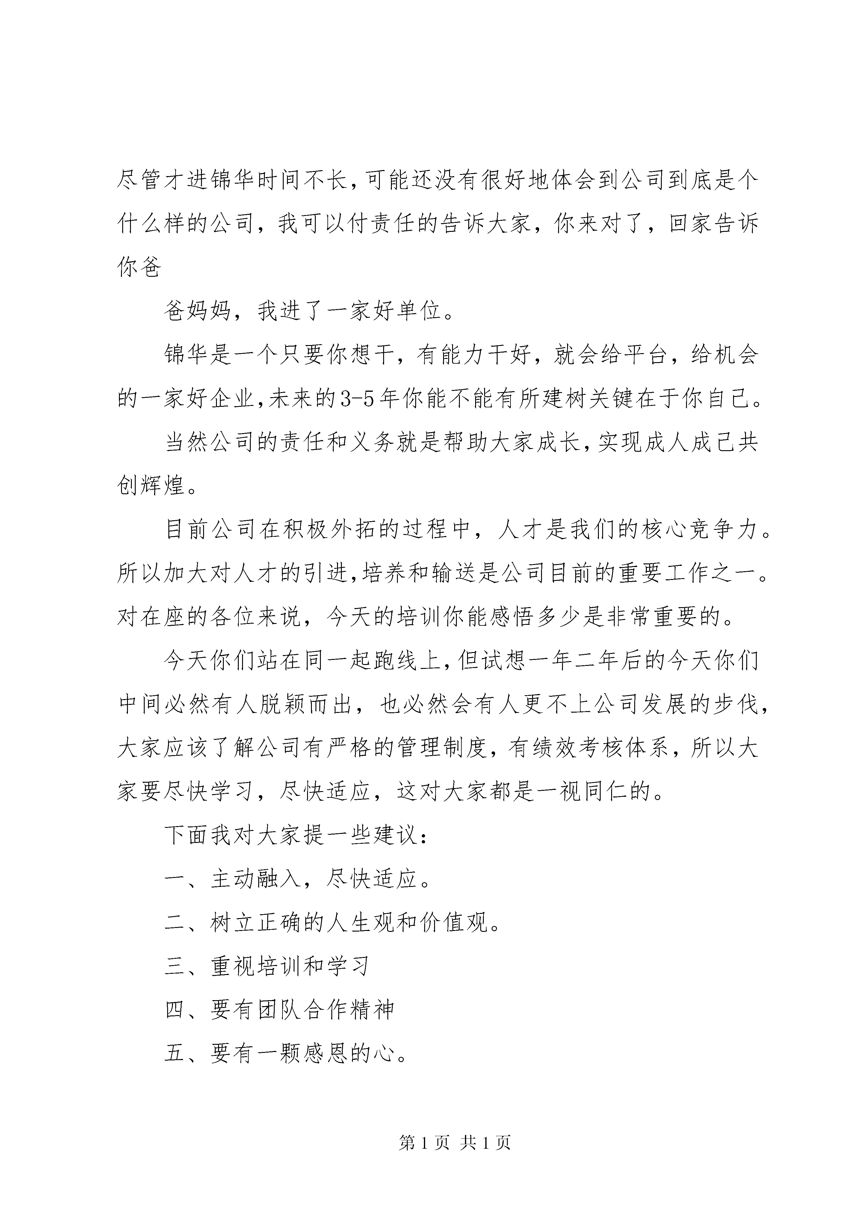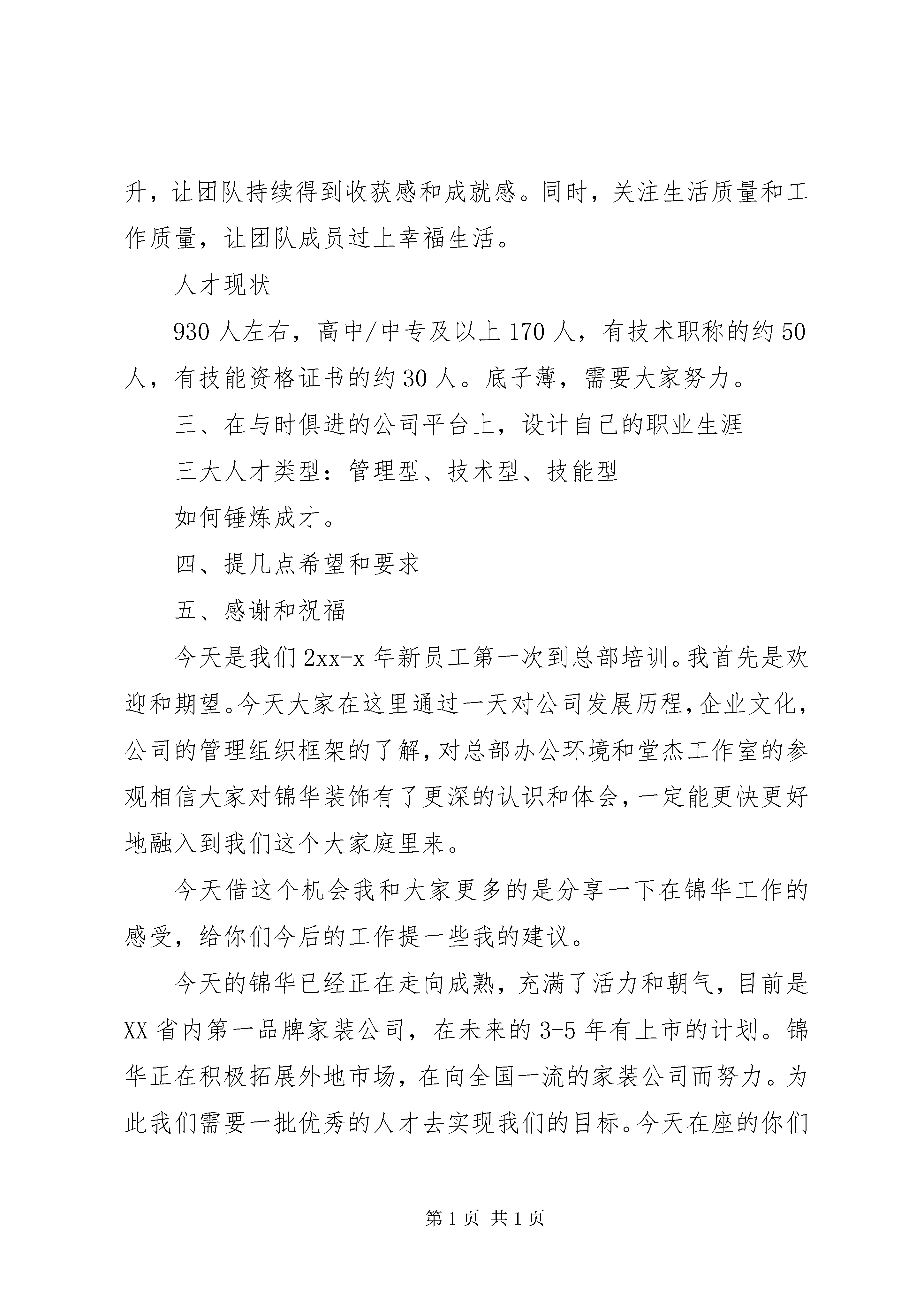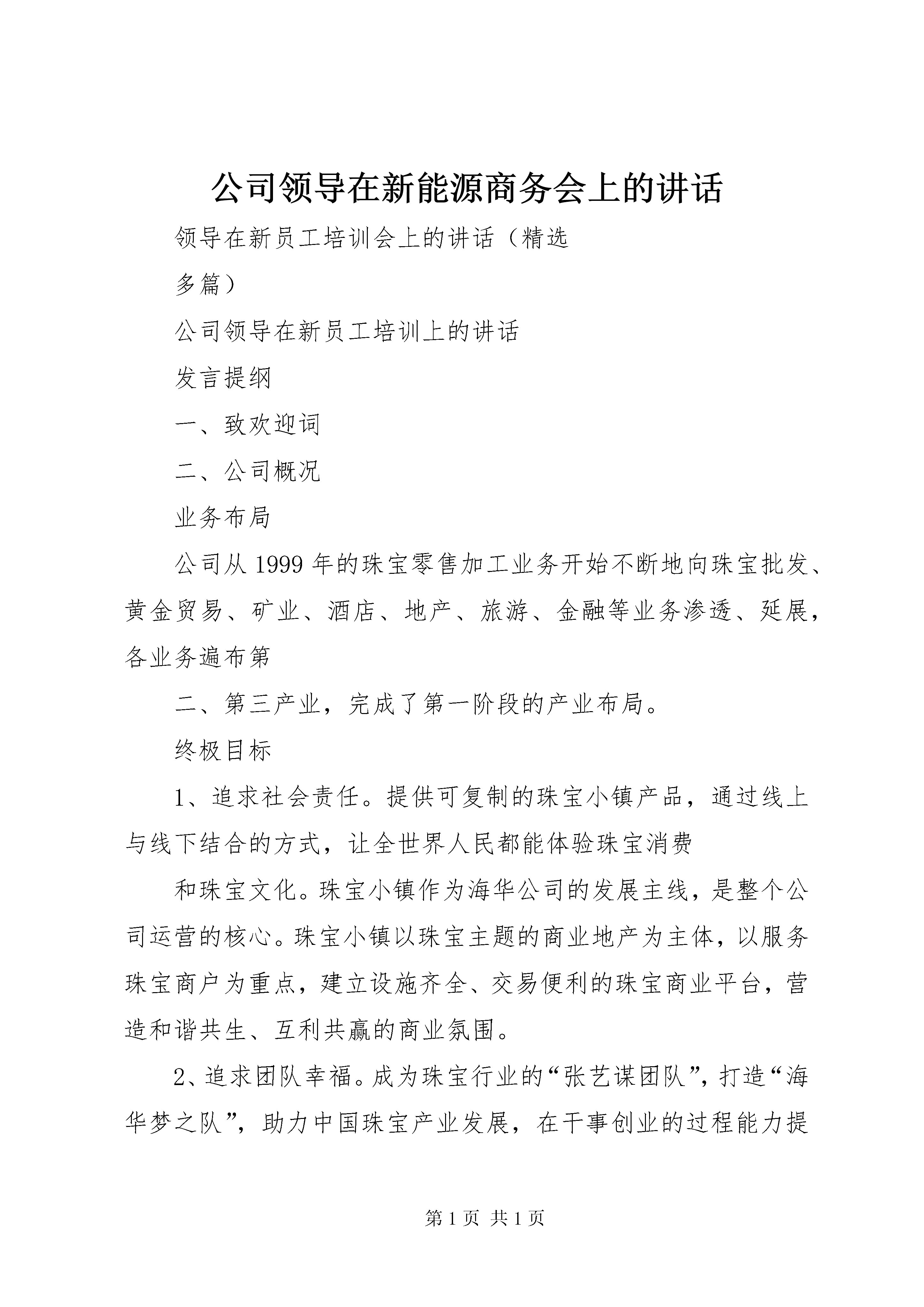 公司领导在新能源商务会上的讲话领导在新员工培训会上的讲话(精选多篇)公司领导在新员工培训上的讲话发言提纲一、致欢迎词二、公司概况业务布局公司从1999年的珠宝零售加工业务开始不断地向珠宝批发、黄金贸易、矿业、酒店、地产、旅游、金融等业务渗透、延展,各业务遍布第二、第三产业,完成了第一阶段的产业布局。终极目标1、追求社会责任。提供可复制的珠宝小镇产品,通过线上与线下结合的方式,让全世界人民都能体验珠宝消费和珠宝文化。珠宝小镇作为海华公司的发展主线,是整个公司运营的核心。珠宝小镇以珠宝主题的商业地产为主体,以服务珠宝商户为重点,建立设施齐全、交易便利的珠宝商业平台,营造和谐共生、互利共赢的商业氛围。2、追求团队幸福。成为珠宝行业的“张艺谋团队”,打造“海华梦之队”,助力中国珠宝产业发展,在干事创业的过程能力提升,让团队持续得到收获感和成就感。同时,关注生活质量和工作质量,让团队成员过上幸福生活。人才现状930人左右,高中/中专及以上170人,有技术职称的约50人,有技能资格证书的约30人。底子薄,需要大家努力。三、在与时俱进的公司平台上,设计自己的职业生涯三大人才类型:管理型、技术型、技能型如何锤炼成才。四、提几点希望和要求五、感谢和祝福今天是我们2xx-x年新员工第一次到总部培训。我首先是欢迎和期望。今天大家在这里通过一天对公司发展历程,企业文化,公司的管理组织框架的了解,对总部办公环境和堂杰工作室的参观相信大家对锦华装饰有了更深的认识和体会,一定能更快更好地融入到我们这个大家庭里来。今天借这个机会我和大家更多的是分享一下在锦华工作的感受,给你们今后的工作提一些我的建议。今天的锦华已经正在走向成熟,充满了活力和朝气,目前是XX省内第一品牌家装公司,在未来的3-5年有上市的计划。锦华正在积极拓展外地市场,在向全国一流的家装公司而努力。为此我们需要一批优秀的人才去实现我们的目标。今天在座的你们尽管才进锦华时间不长,可能还没有很好地体会到公司到底是个什么样的公司,我可以付责任的告诉大家,你来对了,回家告诉你爸爸妈妈,我进了一家好单位。锦华是一个只要你想干,有能力干好,就会给平台,给机会的一家好企业,未来的3-5年你能不能有所建树关键在于你自己。当然公司的责任和义务就是帮助大家成长,实现成人成己共创辉煌。目前公司在积极外拓的过程中,人才是我们的核心竞争力。所以加大对人才的引进,培养和输送是公司目前的重要工作之一。对在座的各位来说,今天的培训你能感悟多少是非常重要的。今天你们站在同一起跑线上,但试想一年二年后的今天你们中间必然有人脱颖而出,也必然会有人更不上公司发展的步伐,大家应该了解公司有严格的管理制度,有绩效考核体系,所以大家要尽快学习,尽快适应,这对大家都是一视同仁的。下面我对大家提一些建议:一、主动融入,尽快适应。二、树立正确的人生观和价值观。三、重视培训和学习四、要有团队合作精神五、要有一颗感恩的心。六,要有理想和行动七、做人要诚信对企业要忠诚八、人品和业绩公司发展的空间很大,机会很多,所以大家一定要好好把握现在,我特别希望从你们中间能涌现出一批将才和帅才,让我们一起为我们的明天而努力。2.现将参与此次培训班的总结做以下梳理:一、针对此次培训班的效果评估1.本次培训班所达到的效果比预期的要好得很多,不管从学员的激-情度、投入度达到的效果都是非常棒的。举例:培训第一天下午的报到,能感觉出很多学员都是抱着很不情愿的态度来的,应付性的心态。结训的时候看到学员之间没有任何掩饰的感情,自己也很受感动。2.学员的心态变化;本次培训班学员普遍入司时间都不是很长,有的还处在刚入司时的迷茫和没有自信心的阶段,所以在第一天报到的时候学员都普遍看起来比较内敛,安静。经过一天的成长训练快速的将伙伴们融入到一起,整理氛围也越来越好,而且很多比较内向的学员也都有积极的进行分享,大家的自信心也得到很大的提升。3.本次培训班达到的效果跟之初办理培训班的目的是相符的。此次培训班不仅让学员快速的融入到整个大团队,也从中提升了员工对自己的信心,对我们公司的信心,对自己所在团队的信心,从学员在制订目标写出他们梦想,都可以看出来。二、对于本次培训班的后续跟进1.可进行多元化的考评方式。通过对学员全方位、立体化表现的考核评审,达到导向与激励作用、反馈与调节的作用,提高培训质量。如可以综合测试或者通过一段时间,学员在培训后在工作上的收获进行总结,在学员其反馈的信息当中收获学员培训后的学习效果。也可以反应阶段性时学员的心态。2.通过总部大讲堂对学员进行跟踪了解,以研讨的方式3.可挑选比较优质的学员,进行座谈式的交流,树立好的榜样。三、从教学教务的角度,在培训操作方式上,你学到什么。三、1.用心做事,诚心做人,此次培训班是以比较感性的方式来带动学员的,