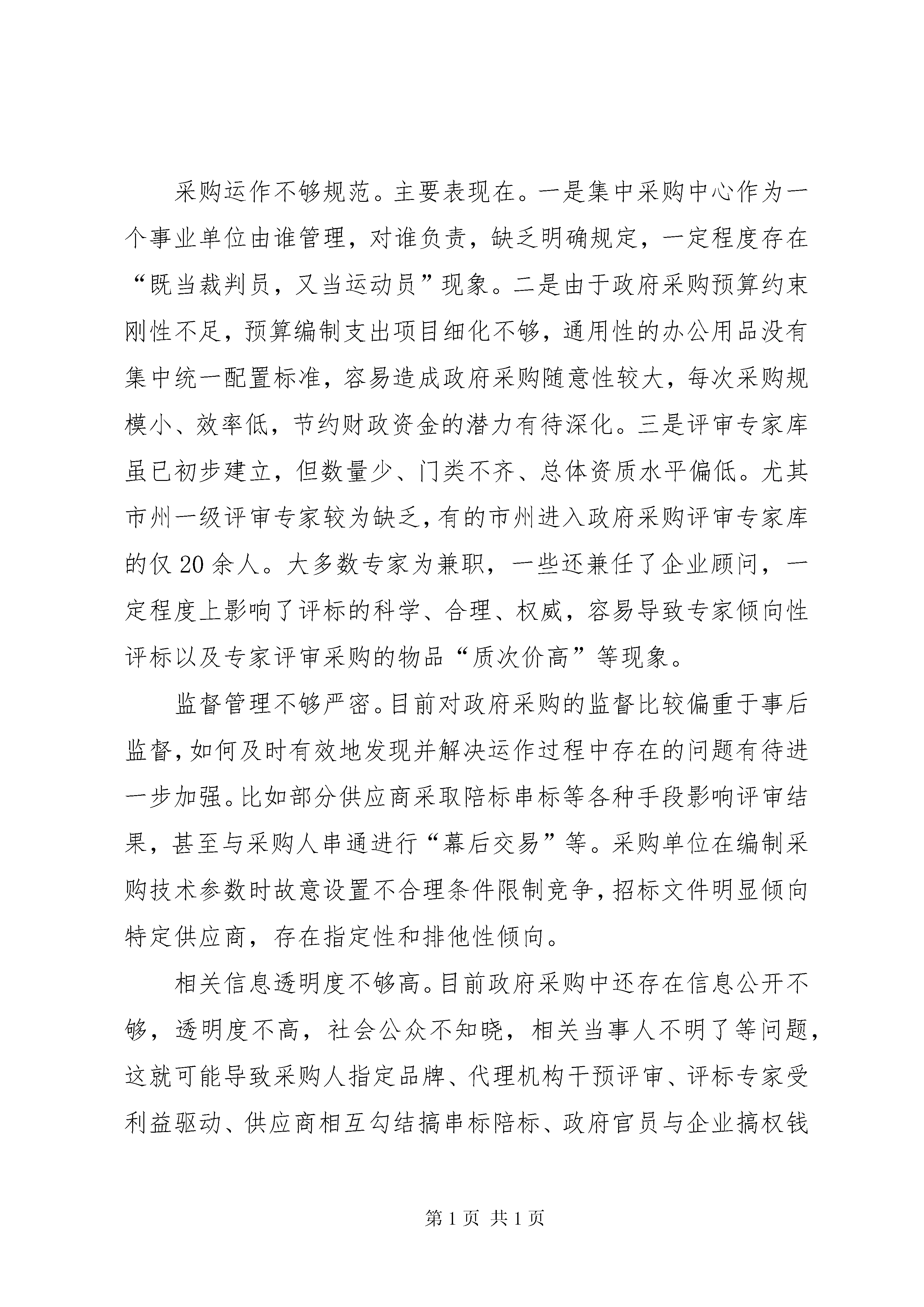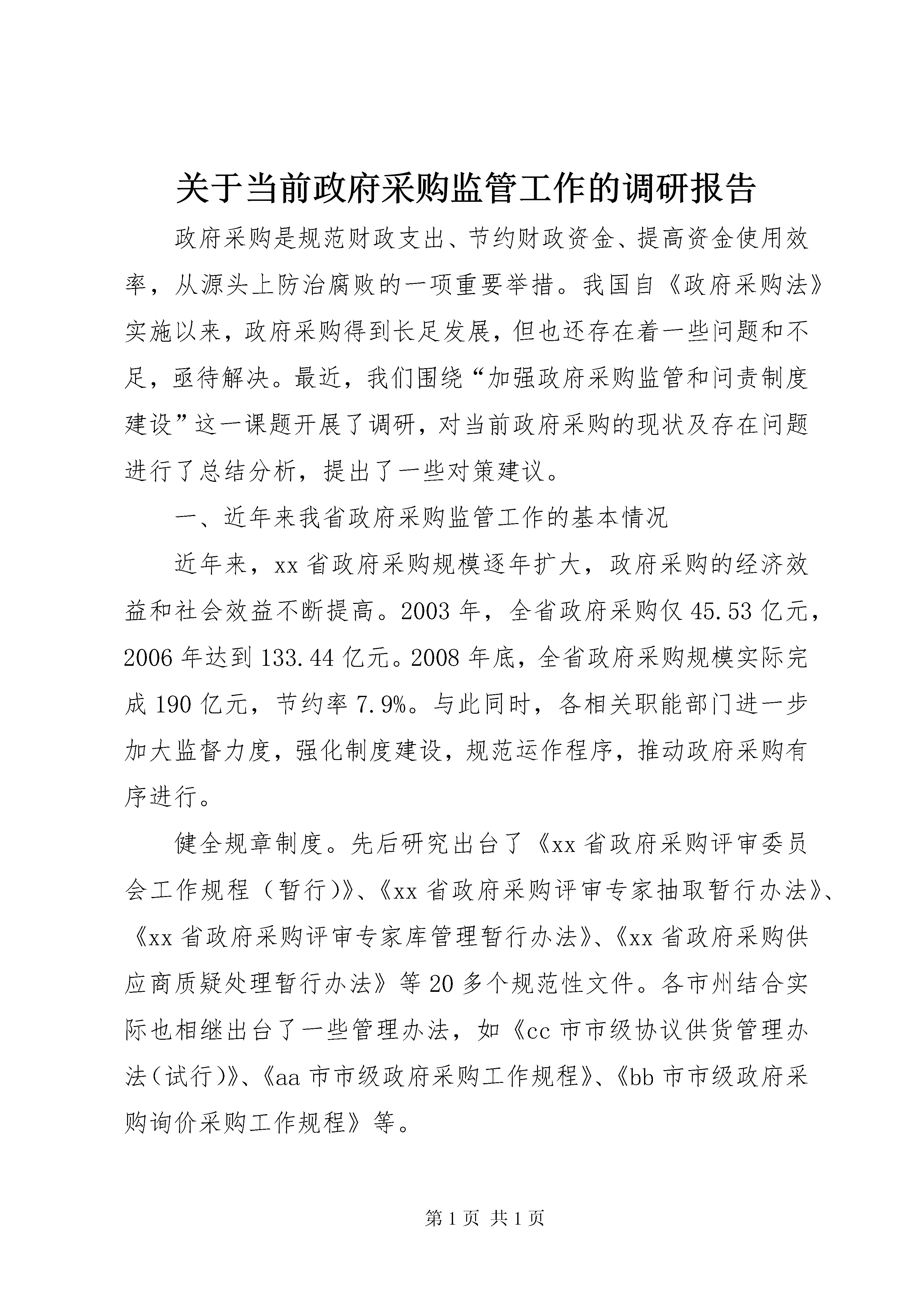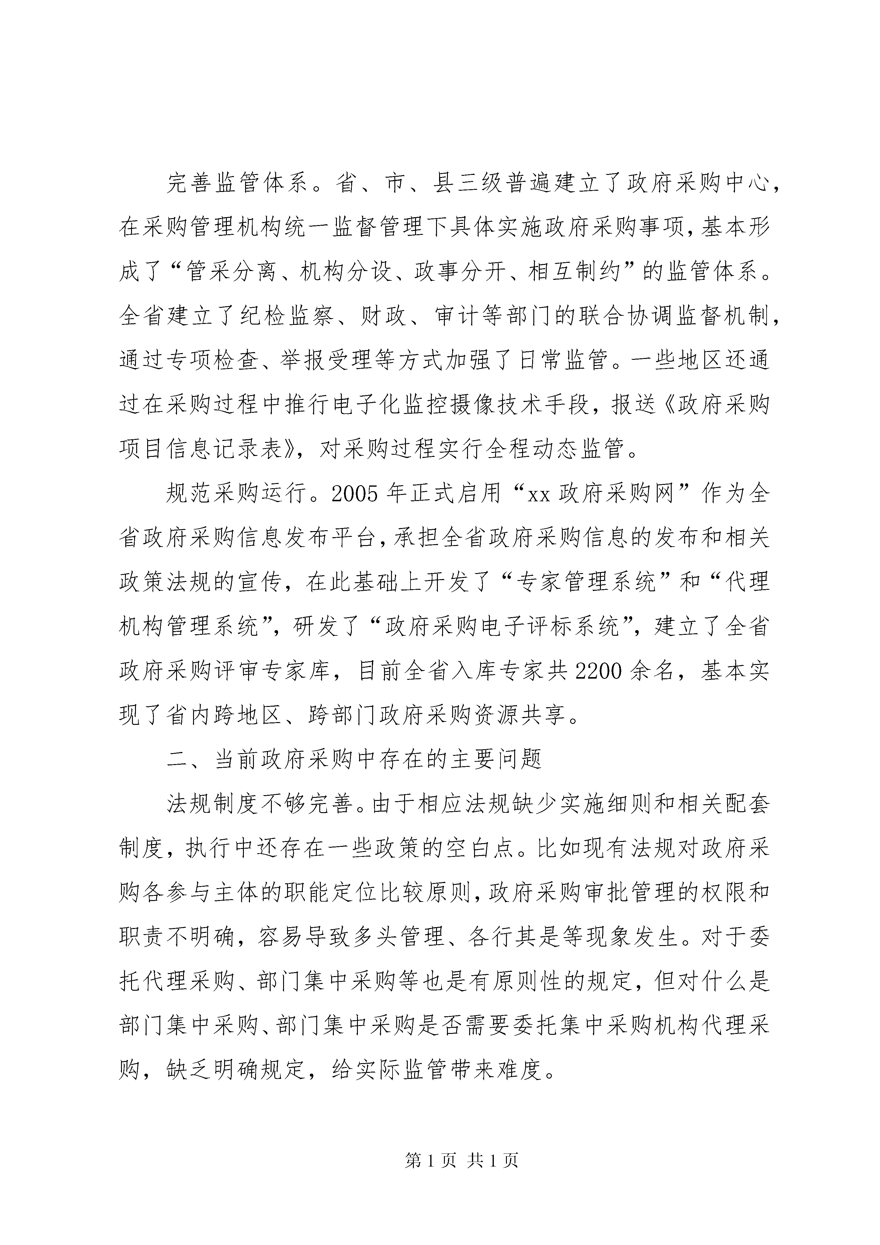 关于当前政府采购监管工作的调研报告政府采购是规范财政支出、节约财政资金、提高资金使用效率,从源头上防治腐败的一项重要举措。我国自《政府采购法》实施以来,政府采购得到长足发展,但也还存在着一些问题和不足,亟待解决。最近,我们围绕“加强政府采购监管和问责制度建设”这一课题开展了调研,对当前政府采购的现状及存在问题进行了总结分析,提出了一些对策建议。一、近年来我省政府采购监管工作的基本情况近年来,xx省政府采购规模逐年扩大,政府采购的经济效益和社会效益不断提高。2003年,全省政府采购仅45.53亿元,2006年达到133.44亿元。2008年底,全省政府采购规模实际完成190亿元,节约率7.9%。与此同时,各相关职能部门进一步加大监督力度,强化制度建设,规范运作程序,推动政府采购有序进行。健全规章制度。先后研究出台了《xx省政府采购评审委员会工作规程(暂行)》、《xx省政府采购评审专家抽取暂行办法》、《xx省政府采购评审专家库管理暂行办法》、《xx省政府采购供应商质疑处理暂行办法》等20多个规范性文件。各市州结合实际也相继出台了一些管理办法,如《cc市市级协议供货管理办法(试行)》、《aa市市级政府采购工作规程》、《bb市市级政府采购询价采购工作规程》等。完善监管体系。省、市、县三级普遍建立了政府采购中心,在采购管理机构统一监督管理下具体实施政府采购事项,基本形成了“管采分离、机构分设、政事分开、相互制约”的监管体系。全省建立了纪检监察、财政、审计等部门的联合协调监督机制,通过专项检查、举报受理等方式加强了日常监管。一些地区还通过在采购过程中推行电子化监控摄像技术手段,报送《政府采购项目信息记录表》,对采购过程实行全程动态监管。规范采购运行。2005年正式启用“xx政府采购网”作为全省政府采购信息发布平台,承担全省政府采购信息的发布和相关政策法规的宣传,在此基础上开发了“专家管理系统”和“代理机构管理系统”,研发了“政府采购电子评标系统”,建立了全省政府采购评审专家库,目前全省入库专家共2200余名,基本实现了省内跨地区、跨部门政府采购资源共享。二、当前政府采购中存在的主要问题法规制度不够完善。由于相应法规缺少实施细则和相关配套制度,执行中还存在一些政策的空白点。比如现有法规对政府采购各参与主体的职能定位比较原则,政府采购审批管理的权限和职责不明确,容易导致多头管理、各行其是等现象发生。对于委托代理采购、部门集中采购等也是有原则性的规定,但对什么是部门集中采购、部门集中采购是否需要委托集中采购机构代理采购,缺乏明确规定,给实际监管带来难度。采购运作不够规范。主要表现在。一是集中采购中心作为一个事业单位由谁管理,对谁负责,缺乏明确规定,一定程度存在“既当裁判员,又当运动员”现象。二是由于政府采购预算约束刚性不足,预算编制支出项目细化不够,通用性的办公用品没有集中统一配置标准,容易造成政府采购随意性较大,每次采购规模小、效率低,节约财政资金的潜力有待深化。三是评审专家库虽已初步建立,但数量少、门类不齐、总体资质水平偏低。尤其市州一级评审专家较为缺乏,有的市州进入政府采购评审专家库的仅20余人。大多数专家为兼职,一些还兼任了企业顾问,一定程度上影响了评标的科学、合理、权威,容易导致专家倾向性评标以及专家评审采购的物品“质次价高”等现象。监督管理不够严密。目前对政府采购的监督比较偏重于事后监督,如何及时有效地发现并解决运作过程中存在的问题有待进一步加强。比如部分供应商采取陪标串标等各种手段影响评审结果,甚至与采购人串通进行“幕后交易”等。采购单位在编制采购技术参数时故意设置不合理条件限制竞争,招标文件明显倾向特定供应商,存在指定性和排他性倾向。相关信息透明度不够高。目前政府采购中还存在信息公开不够,透明度不高,社会公众不知晓,相关当事人不明了等问题,这就可能导致采购人指定品牌、代理机构干预评审、评标专家受利益驱动、供应商相互勾结搞串标陪标、政府官员与企业搞权钱交易等问题的发生。责任追究不够到位。虽然相关的法规规章明确了政府采购中的各种违法行为,但对违法行为的认定、违法的责任、处分的档次等缺乏具体实施细则,可操作性不强。依据现有的相关规定,问责对象主要是针对直接责任人,对主要负责人决策失误,领导不力,管理不到位,不正确履行职责等问题,由于缺乏相应的问责规定,因此较难实施问责。在问责方式方面,对政府采购相关机构中属于公务员的问责方式主要限于行政处分或刑事处罚,很少运用组织处理等措施。