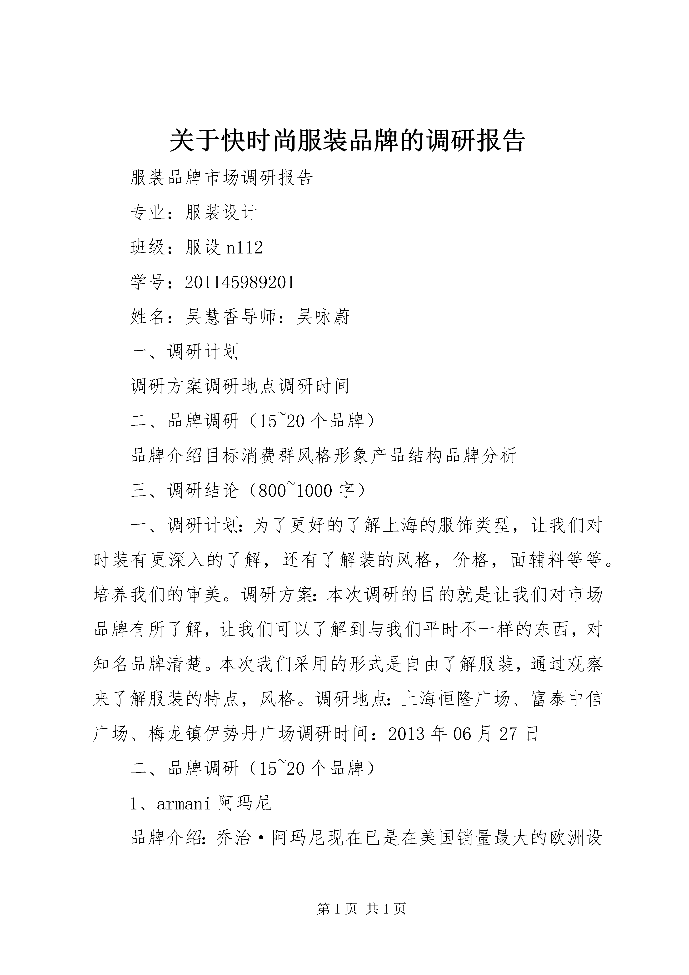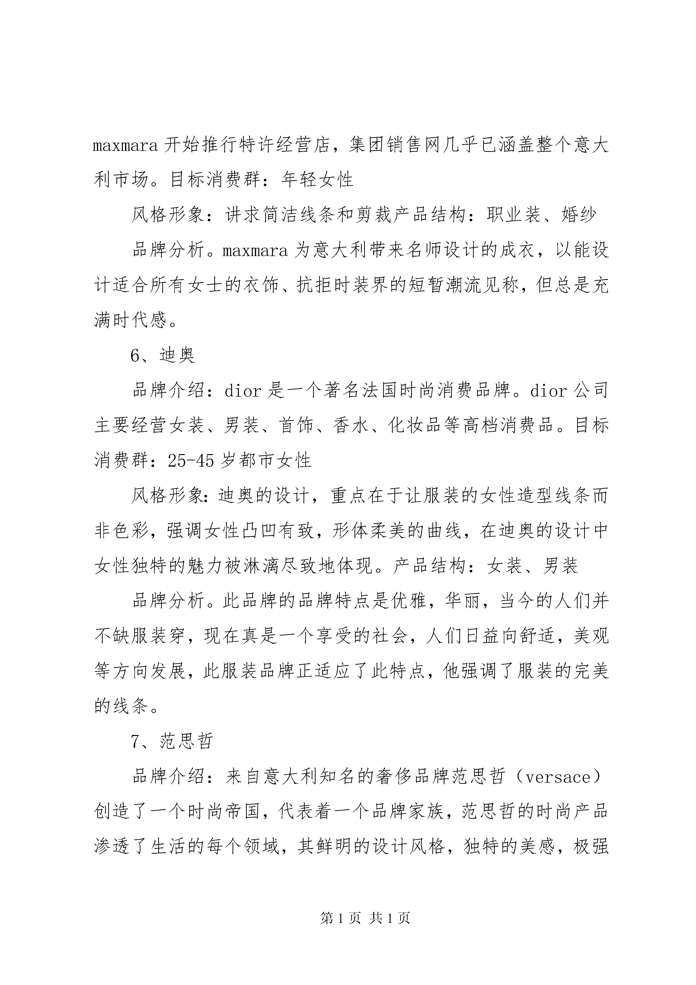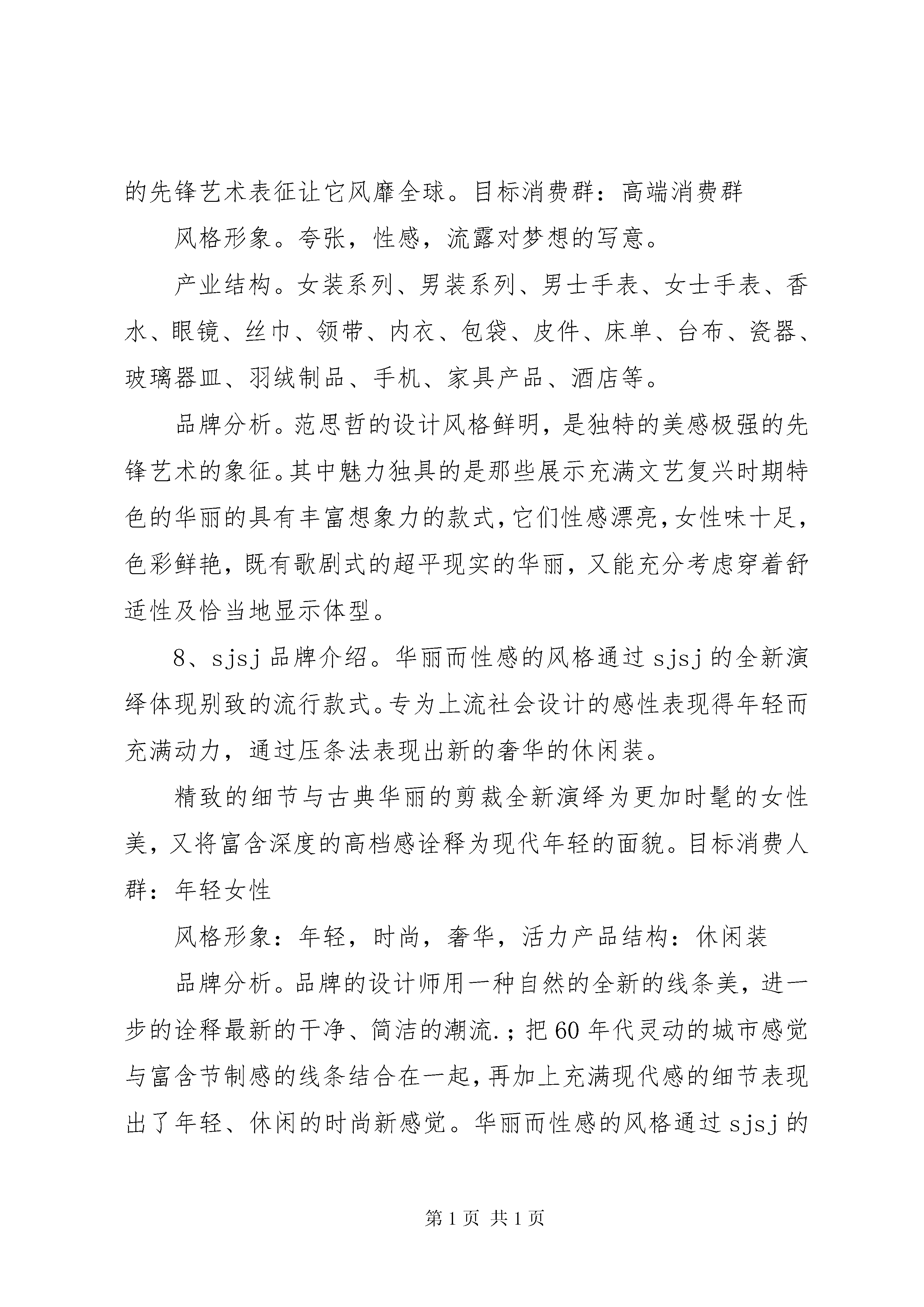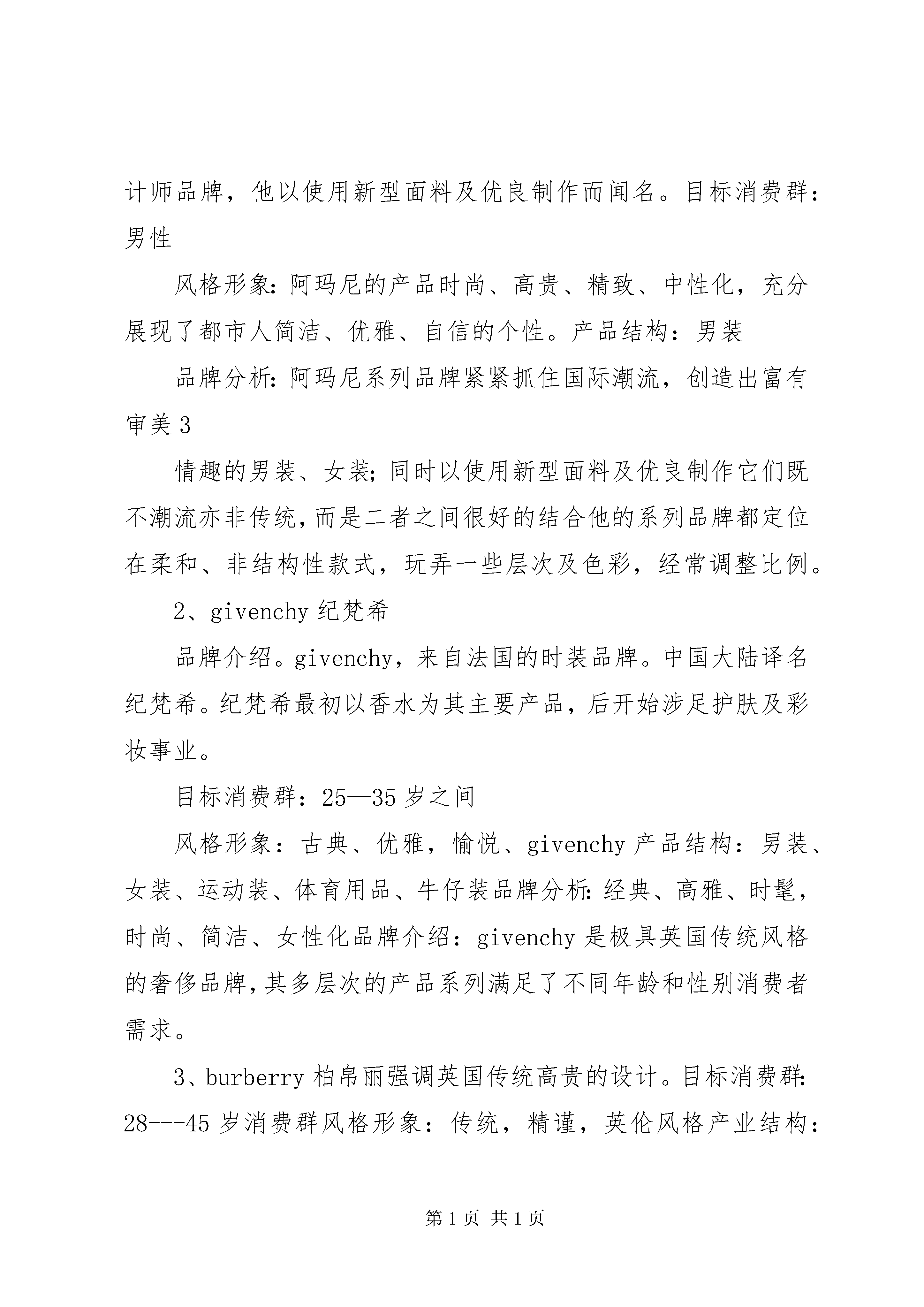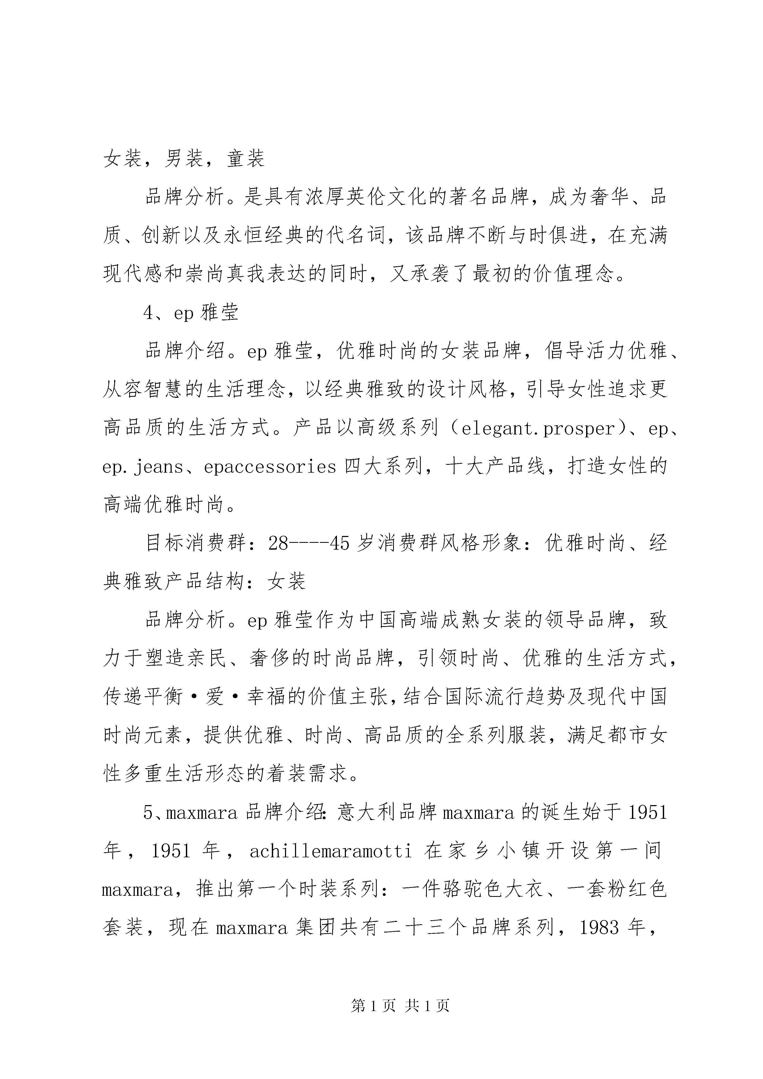关于快时尚服装品牌的调研报告服装品牌市场调研报告专业:服装设计班级:服设n112学号:201145989201姓名:吴慧香导师:吴咏蔚一、调研计划调研方案调研地点调研时间二、品牌调研(15~20个品牌)品牌介绍目标消费群风格形象产品结构品牌分析三、调研结论(800~1000字)一、调研计划:为了更好的了解上海的服饰类型,让我们对时装有更深入的了解,还有了解装的风格,价格,面辅料等等。培养我们的审美。调研方案:本次调研的目的就是让我们对市场品牌有所了解,让我们可以了解到与我们平时不一样的东西,对知名品牌清楚。本次我们采用的形式是自由了解服装,通过观察来了解服装的特点,风格。调研地点:上海恒隆广场、富泰中信广场、梅龙镇伊势丹广场调研时间:2013年06月27日二、品牌调研(15~20个品牌)1、armani阿玛尼品牌介绍:乔治·阿玛尼现在已是在美国销量最大的欧洲设计师品牌,他以使用新型面料及优良制作而闻名。目标消费群:男性风格形象:阿玛尼的产品时尚、高贵、精致、中性化,充分展现了都市人简洁、优雅、自信的个性。产品结构:男装品牌分析:阿玛尼系列品牌紧紧抓住国际潮流,创造出富有审美3情趣的男装、女装;同时以使用新型面料及优良制作它们既不潮流亦非传统,而是二者之间很好的结合他的系列品牌都定位在柔和、非结构性款式,玩弄一些层次及色彩,经常调整比例。2、givenchy纪梵希品牌介绍。givenchy,来自法国的时装品牌。中国大陆译名纪梵希。纪梵希最初以香水为其主要产品,后开始涉足护肤及彩妆事业。目标消费群:25—35岁之间风格形象:古典、优雅,愉悦、givenchy产品结构:男装、女装、运动装、体育用品、牛仔装品牌分析:经典、高雅、时髦,时尚、简洁、女性化品牌介绍:givenchy是极具英国传统风格的奢侈品牌,其多层次的产品系列满足了不同年龄和性别消费者需求。3、burberry柏帛丽强调英国传统高贵的设计。目标消费群:28---45岁消费群风格形象:传统,精谨,英伦风格产业结构:女装,男装,童装品牌分析。是具有浓厚英伦文化的著名品牌,成为奢华、品质、创新以及永恒经典的代名词,该品牌不断与时俱进,在充满现代感和崇尚真我表达的同时,又承袭了最初的价值理念。4、ep雅莹品牌介绍。ep雅莹,优雅时尚的女装品牌,倡导活力优雅、从容智慧的生活理念,以经典雅致的设计风格,引导女性追求更高品质的生活方式。产品以高级系列(elegant.prosper)、ep、ep.jeans、epaccessories四大系列,十大产品线,打造女性的高端优雅时尚。目标消费群:28----45岁消费群风格形象:优雅时尚、经典雅致产品结构:女装品牌分析。ep雅莹作为中国高端成熟女装的领导品牌,致力于塑造亲民、奢侈的时尚品牌,引领时尚、优雅的生活方式,传递平衡·爱·幸福的价值主张,结合国际流行趋势及现代中国时尚元素,提供优雅、时尚、高品质的全系列服装,满足都市女性多重生活形态的着装需求。5、maxmara品牌介绍:意大利品牌maxmara的诞生始于1951年,1951年,achillemaramotti在家乡小镇开设第一间maxmara,推出第一个时装系列:一件骆驼色大衣、一套粉红色套装,现在maxmara集团共有二十三个品牌系列,1983年,maxmara开始推行特许经营店,集团销售网几乎已涵盖整个意大利市场。目标消费群:年轻女性风格形象:讲求简洁线条和剪裁产品结构:职业装、婚纱品牌分析。maxmara为意大利带来名师设计的成衣,以能设计适合所有女士的衣饰、抗拒时装界的短暂潮流见称,但总是充满时代感。6、迪奥品牌介绍:dior是一个著名法国时尚消费品牌。dior公司主要经营女装、男装、首饰、香水、化妆品等高档消费品。目标消费群:25-45岁都市女性风格形象:迪奥的设计,重点在于让服装的女性造型线条而非色彩,强调女性凸凹有致,形体柔美的曲线,在迪奥的设计中女性独特的魅力被淋漓尽致地体现。产品结构:女装、男装品牌分析。此品牌的品牌特点是优雅,华丽,当今的人们并不缺服装穿,现在真是一个享受的社会,人们日益向舒适,美观等方向发展,此服装品牌正适应了此特点,他强调了服装的完美的线条。7、范思哲品牌介绍:来自意大利知名的奢侈品牌范思哲(versace)创造了一个时尚帝国,代表着一个品牌家族,范思哲的时尚产品渗透了生活的每个领域,其鲜明的设计风格,独特的美感,极强的先锋艺术表征让它风靡全球。目标消费群:高端消费群风格形象。夸张,性感,流露对梦想的写意。产业结构。女装系列、男装系列、男士手表、女士手表、香水、眼镜、丝巾、领带、内衣、包袋、皮件、床单、台布、瓷器、玻璃器皿、羽绒制品、手机、家具产品、酒店等。品牌分析。范思哲的设计风格鲜明,是独特的美感极强的先锋艺术