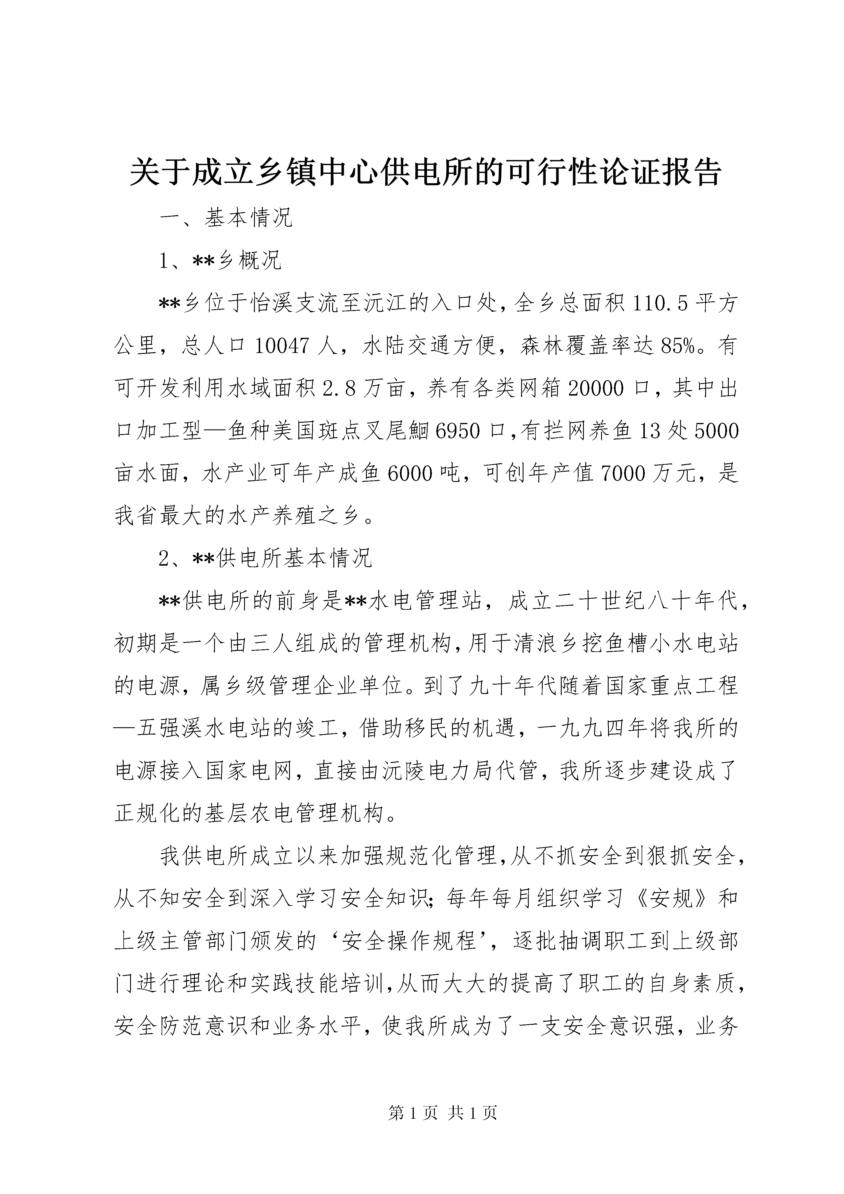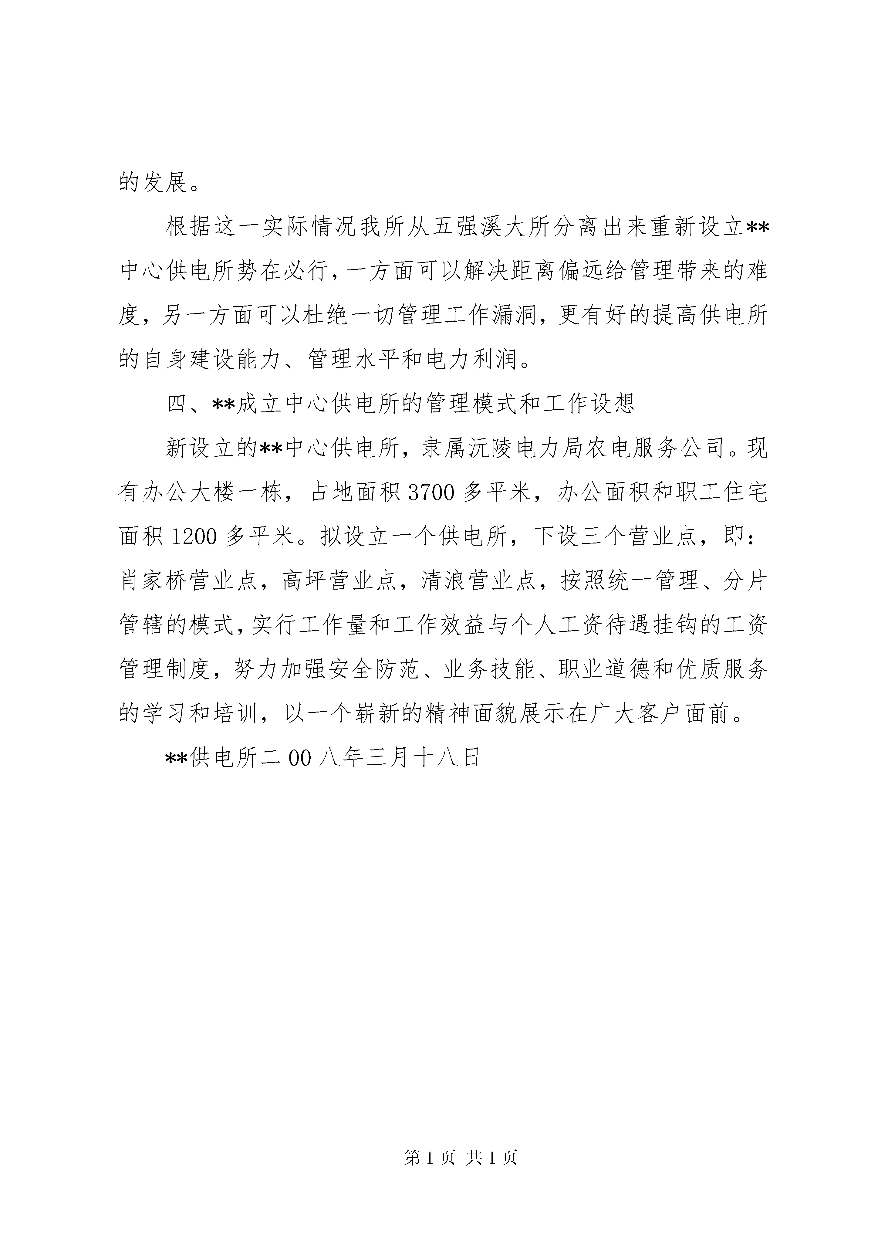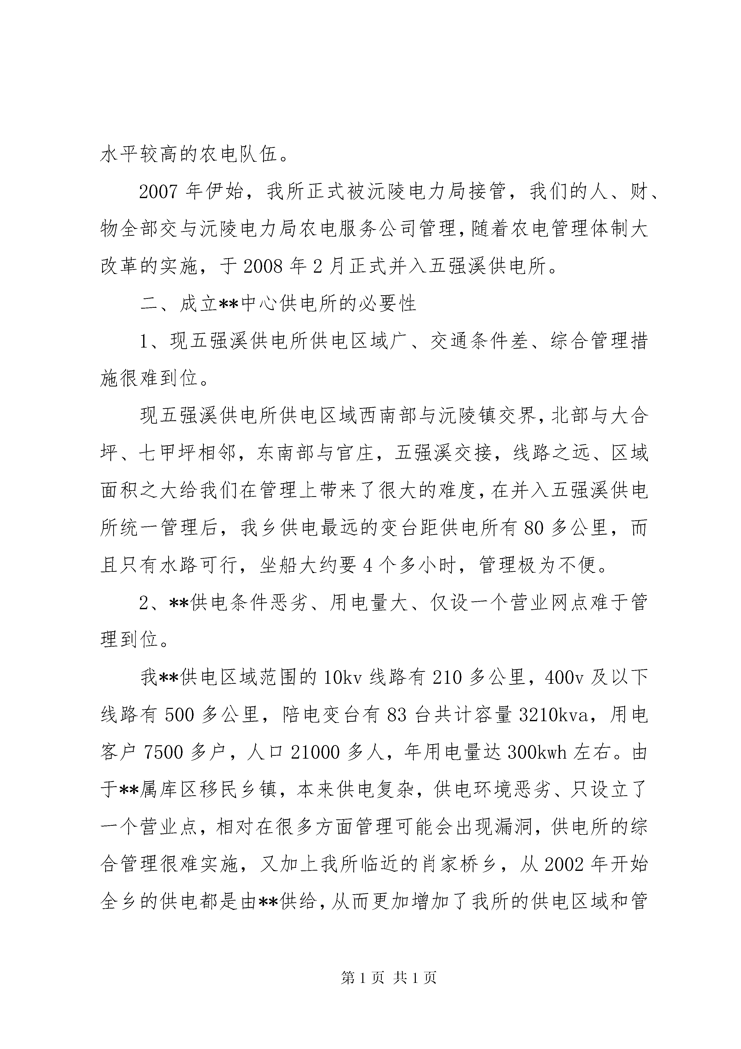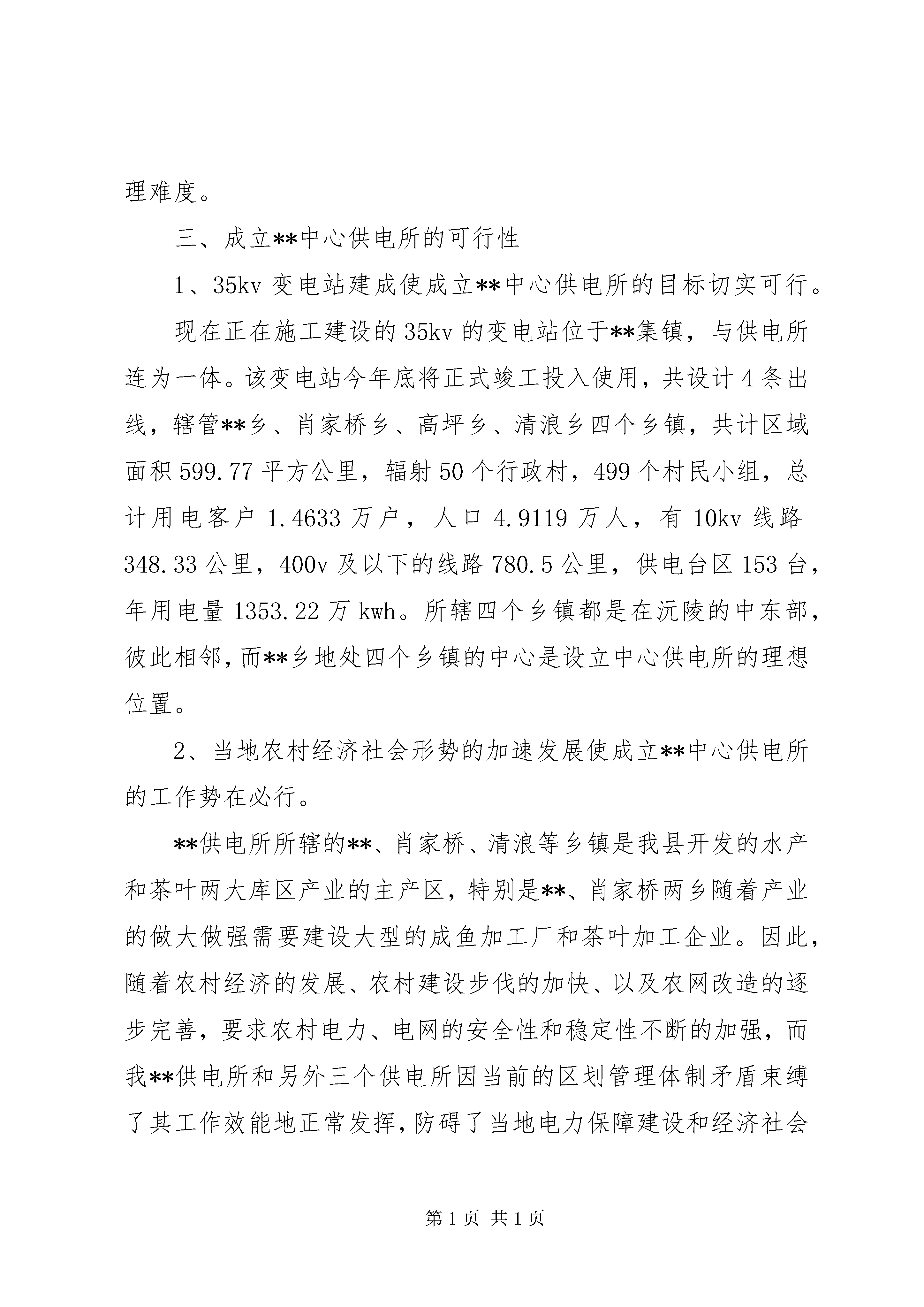 关于成立乡镇中心供电所的可行性论证报告一、基本情况1、**乡概况**乡位于怡溪支流至沅江的入口处,全乡总面积110.5平方公里,总人口10047人,水陆交通方便,森林覆盖率达85%。有可开发利用水域面积2.8万亩,养有各类网箱20000口,其中出口加工型—鱼种美国斑点叉尾鮰6950口,有拦网养鱼13处5000亩水面,水产业可年产成鱼6000吨,可创年产值7000万元,是我省最大的水产养殖之乡。2、**供电所基本情况**供电所的前身是**水电管理站,成立二十世纪八十年代,初期是一个由三人组成的管理机构,用于清浪乡挖鱼槽小水电站的电源,属乡级管理企业单位。到了九十年代随着国家重点工程—五强溪水电站的竣工,借助移民的机遇,一九九四年将我所的电源接入国家电网,直接由沅陵电力局代管,我所逐步建设成了正规化的基层农电管理机构。我供电所成立以来加强规范化管理,从不抓安全到狠抓安全,从不知安全到深入学习安全知识;每年每月组织学习《安规》和上级主管部门颁发的‘安全操作规程’,逐批抽调职工到上级部门进行理论和实践技能培训,从而大大的提高了职工的自身素质,安全防范意识和业务水平,使我所成为了一支安全意识强,业务水平较高的农电队伍。2007年伊始,我所正式被沅陵电力局接管,我们的人、财、物全部交与沅陵电力局农电服务公司管理,随着农电管理体制大改革的实施,于2008年2月正式并入五强溪供电所。二、成立**中心供电所的必要性1、现五强溪供电所供电区域广、交通条件差、综合管理措施很难到位。现五强溪供电所供电区域西南部与沅陵镇交界,北部与大合坪、七甲坪相邻,东南部与官庄,五强溪交接,线路之远、区域面积之大给我们在管理上带来了很大的难度,在并入五强溪供电所统一管理后,我乡供电最远的变台距供电所有80多公里,而且只有水路可行,坐船大约要4个多小时,管理极为不便。2、**供电条件恶劣、用电量大、仅设一个营业网点难于管理到位。我**供电区域范围的10kv线路有210多公里,400v及以下线路有500多公里,陪电变台有83台共计容量3210kva,用电客户7500多户,人口21000多人,年用电量达300kwh左右。由于**属库区移民乡镇,本来供电复杂,供电环境恶劣、只设立了一个营业点,相对在很多方面管理可能会出现漏洞,供电所的综合管理很难实施,又加上我所临近的肖家桥乡,从2002年开始全乡的供电都是由**供给,从而更加增加了我所的供电区域和管理难度。三、成立**中心供电所的可行性1、35kv变电站建成使成立**中心供电所的目标切实可行。现在正在施工建设的35kv的变电站位于**集镇,与供电所连为一体。该变电站今年底将正式竣工投入使用,共设计4条出线,辖管**乡、肖家桥乡、高坪乡、清浪乡四个乡镇,共计区域面积599.77平方公里,辐射50个行政村,499个村民小组,总计用电客户1.4633万户,人口4.9119万人,有10kv线路348.33公里,400v及以下的线路780.5公里,供电台区153台,年用电量1353.22万kwh。所辖四个乡镇都是在沅陵的中东部,彼此相邻,而**乡地处四个乡镇的中心是设立中心供电所的理想位置。2、当地农村经济社会形势的加速发展使成立**中心供电所的工作势在必行。**供电所所辖的**、肖家桥、清浪等乡镇是我县开发的水产和茶叶两大库区产业的主产区,特别是**、肖家桥两乡随着产业的做大做强需要建设大型的成鱼加工厂和茶叶加工企业。因此,随着农村经济的发展、农村建设步伐的加快、以及农网改造的逐步完善,要求农村电力、电网的安全性和稳定性不断的加强,而我**供电所和另外三个供电所因当前的区划管理体制矛盾束缚了其工作效能地正常发挥,防碍了当地电力保障建设和经济社会的发展。根据这一实际情况我所从五强溪大所分离出来重新设立**中心供电所势在必行,一方面可以解决距离偏远给管理带来的难度,另一方面可以杜绝一切管理工作漏洞,更有好的提高供电所的自身建设能力、管理水平和电力利润。四、**成立中心供电所的管理模式和工作设想新设立的**中心供电所,隶属沅陵电力局农电服务公司。现有办公大楼一栋,占地面积3700多平米,办公面积和职工住宅面积1200多平米。拟设立一个供电所,下设三个营业点,即:肖家桥营业点,高坪营业点,清浪营业点,按照统一管理、分片管辖的模式,实行工作量和工作效益与个人工资待遇挂钩的工资管理制度,努力加强安全防范、业务技能、职业道德和优质服务的学习和培训,以一个崭新的精神面貌展示在广大客户面前。**供电所二00八年三月十八日