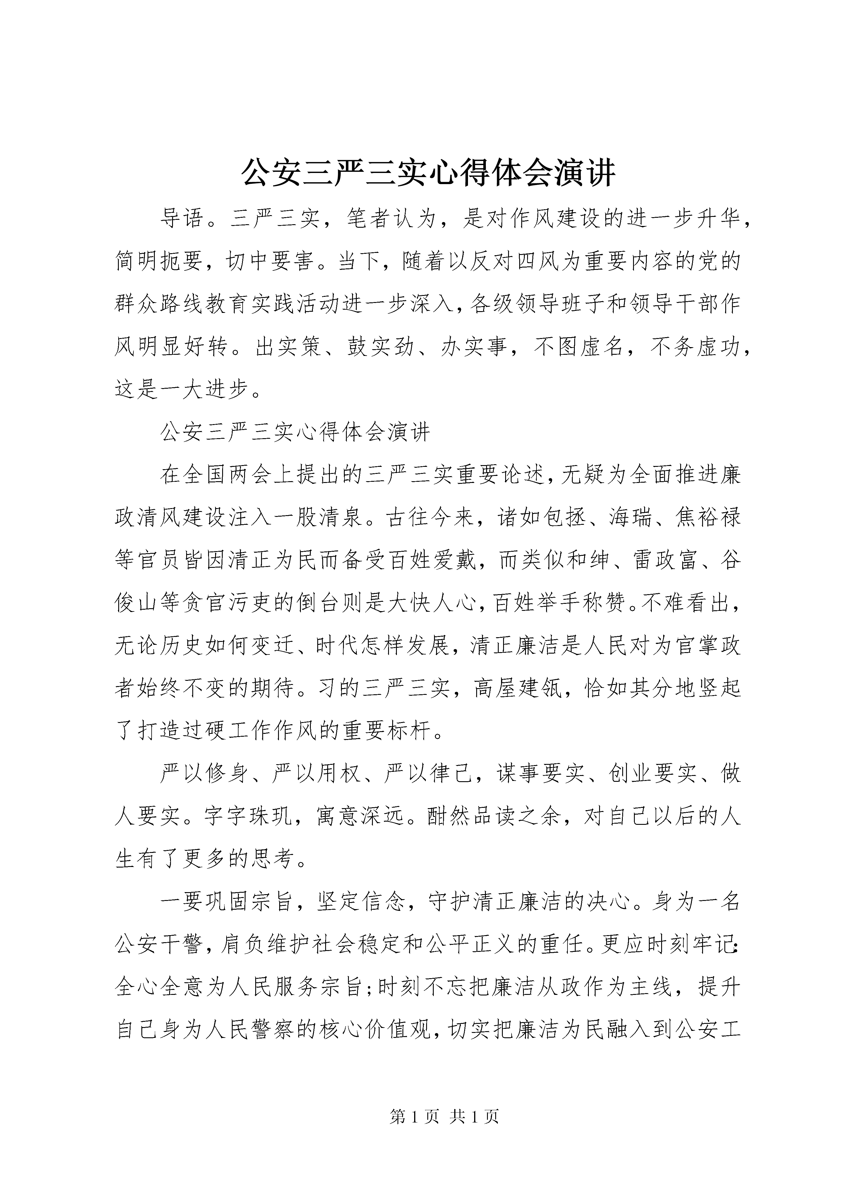 公安三严三实心得体会演讲导语。三严三实,笔者认为,是对作风建设的进一步升华,简明扼要,切中要害。当下,随着以反对四风为重要内容的党的群众路线教育实践活动进一步深入,各级领导班子和领导干部作风明显好转。出实策、鼓实劲、办实事,不图虚名,不务虚功,这是一大进步。公安三严三实心得体会演讲在全国两会上提出的三严三实重要论述,无疑为全面推进廉政清风建设注入一股清泉。古往今来,诸如包拯、海瑞、焦裕禄等官员皆因清正为民而备受百姓爱戴,而类似和绅、雷政富、谷俊山等贪官污吏的倒台则是大快人心,百姓举手称赞。不难看出,无论历史如何变迁、时代怎样发展,清正廉洁是人民对为官掌政者始终不变的期待。习的三严三实,高屋建瓴,恰如其分地竖起了打造过硬工作作风的重要标杆。严以修身、严以用权、严以律己,谋事要实、创业要实、做人要实。字字珠玑,寓意深远。酣然品读之余,对自己以后的人生有了更多的思考。一要巩固宗旨,坚定信念,守护清正廉洁的决心。身为一名公安干警,肩负维护社会稳定和公平正义的重任。更应时刻牢记:全心全意为人民服务宗旨;时刻不忘把廉洁从政作为主线,提升自己身为人民警察的核心价值观,切实把廉洁为民融入到公安工作全过程。要不断地深入学习各类警示教育活动,以先进典型事迹鼓舞士气、弘扬正气,不断坚定自己的理想信念,激发自己不竭的工作热情;以反腐警示录里的典型案例筑牢防线、守住底线,坚决消除不良思想,约束自己的行为,积极营造风清气正、廉荣贪耻的浓厚氛围。不断增强自身理论素养和勤政廉政意识,使拒绝腐败的决心成为一种本能。二要减少应酬,净化三圈,坚定廉洁奉公的信心。身为执法人员,自身形象不再是个人形象,一言一行一举一动,都关乎整个公安队伍的公信力。我们务必要严以律己,慎用手中的权利。明白权为民所赋、利为民而谋。身为公安干警,要率先垂范、以身作则。在减少交际、应酬上带头做表率,自觉净化生活圈、社交圈、娱乐圈,积极倡导健康向上的生活情趣。同时,加强对亲属的监管,申明底线和划清界线,在家庭会议上强调中央八项规定和各大项禁令,坚决不把个人群带关系和私利掺和到工作中去,防止后院起火。三要摒除贪念,修身务实,维护一心为民的恒心。当今社会,物欲横流,我们手中的权利成为居心叵测者眼中发财致富的钥匙。金钱、美色,时刻诱惑着我们。我们务必要严以修身,剔除心中的贪念,始终保持头脑清醒,清廉自守,弘扬正气,抵制歪风,坦坦荡荡做事,堂堂正正做人,清清白白为官,常修为政之德,常思贪欲之害,常怀律己之心。日常工作要经常深入群众、融入社会,了解群众疾苦,体会百姓不易,消除不满足、攀比、从众、侥幸等偏拗心理,求真务实,坚持执政为民、执法为民不动摇。党中央正以刮骨疗伤、猛药去疴的决心和勇气大力推进作风建设,力求营造干部清正、政府清廉、政治清明的和谐社会。这是中央和民意的共振。身为公职人员,借此xx整整衣冠、照照镜子、洗洗澡、看看病,强身健体正当时。
