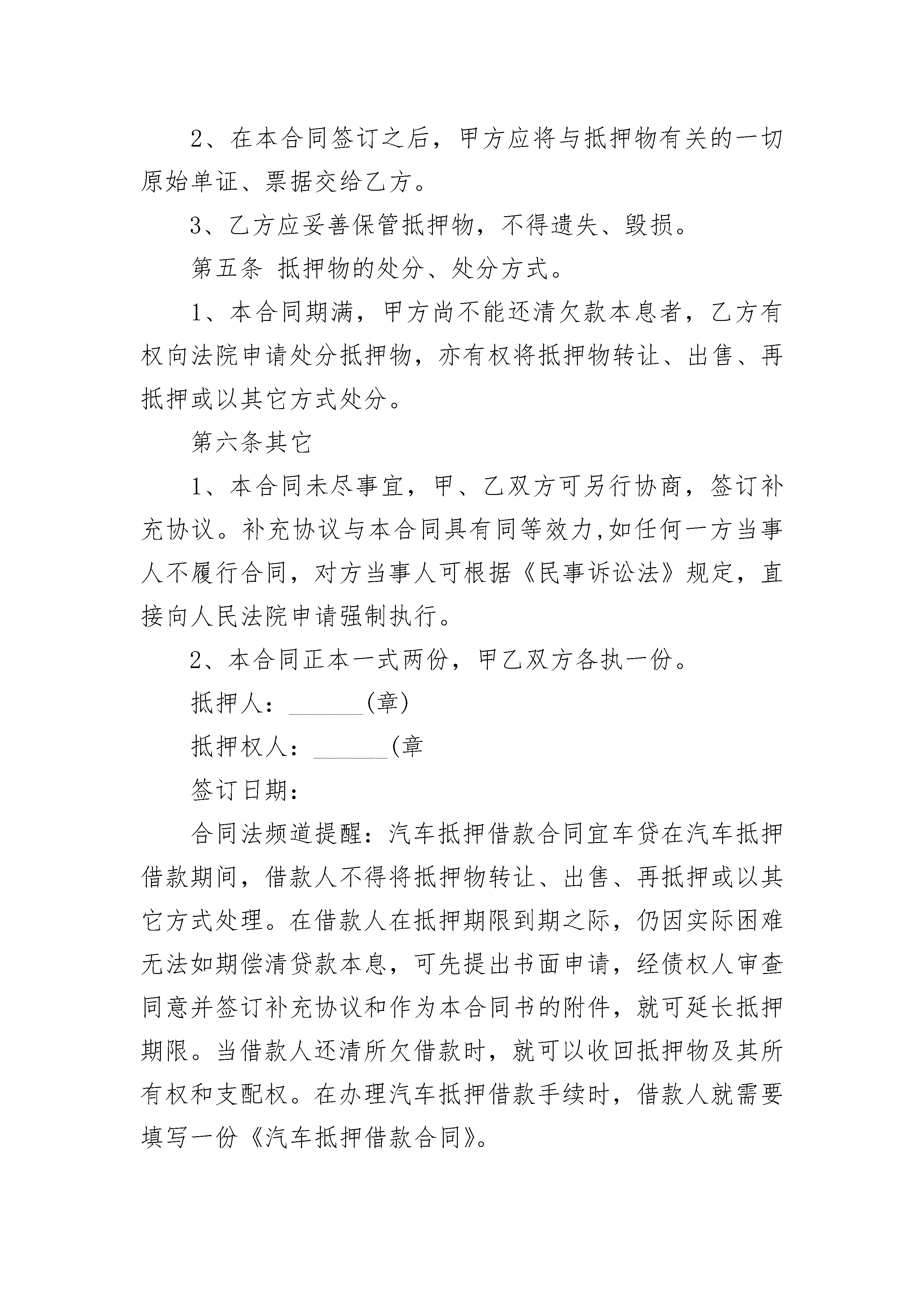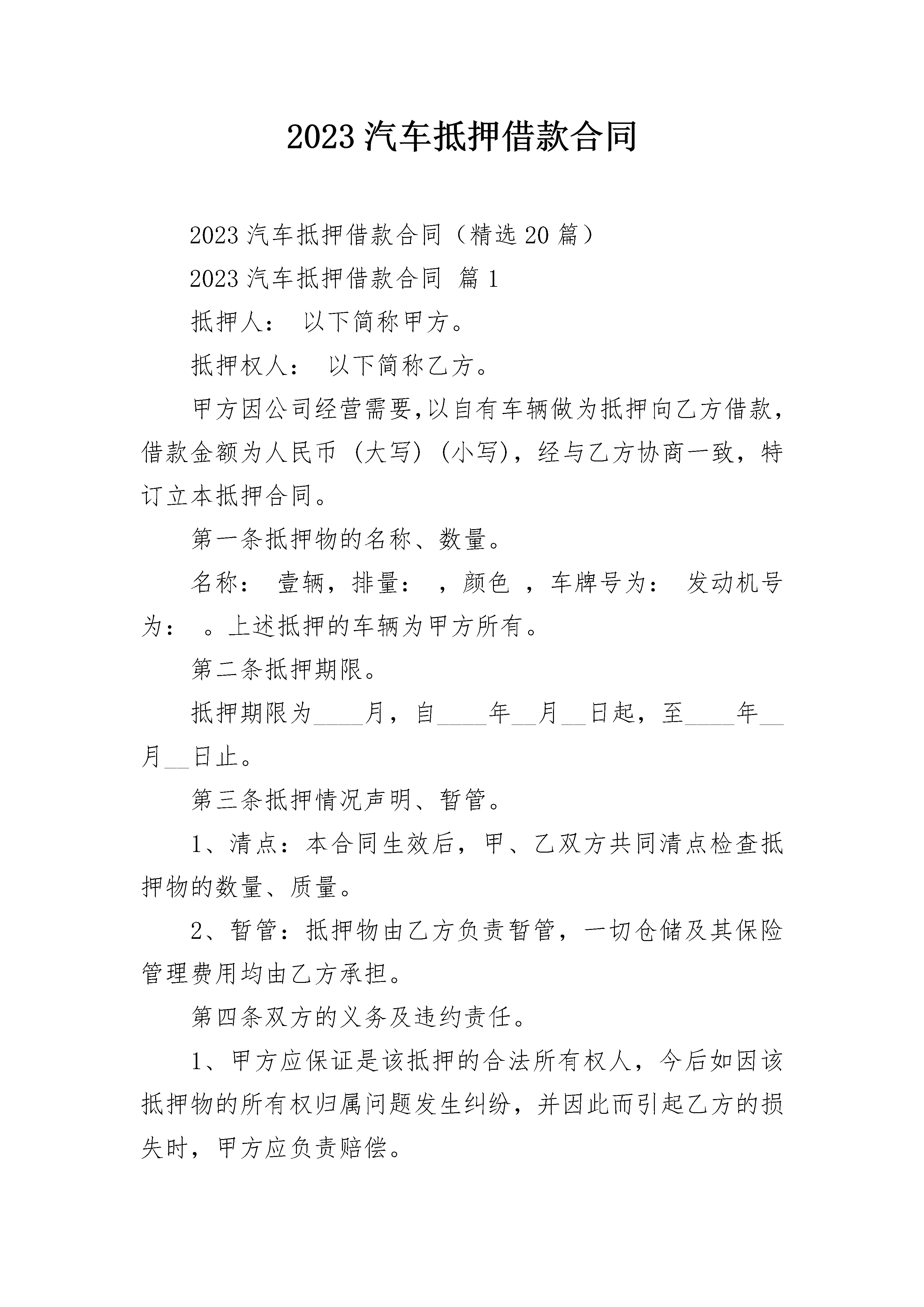 2023汽车抵押借款合同2023汽车抵押借款合同(精选20篇)2023汽车抵押借款合同篇1抵押人:以下简称甲方。抵押权人:以下简称乙方。甲方因公司经营需要,以自有车辆做为抵押向乙方借款,借款金额为人民币(大写)(小写),经与乙方协商一致,特订立本抵押合同。第一条抵押物的名称、数量。名称:壹辆,排量:,颜色,车牌号为:发动机号为:。上述抵押的车辆为甲方所有。第二条抵押期限。抵押期限为____月,自____年__月__日起,至____年__月__日止。第三条抵押情况声明、暂管。1、清点:本合同生效后,甲、乙双方共同清点检查抵押物的数量、质量。2、暂管:抵押物由乙方负责暂管,一切仓储及其保险管理费用均由乙方承担。第四条双方的义务及违约责任。1、甲方应保证是该抵押的合法所有权人,今后如因该抵押物的所有权归属问题发生纠纷,并因此而引起乙方的损失时,甲方应负责赔偿。2、在本合同签订之后,甲方应将与抵押物有关的一切原始单证、票据交给乙方。3、乙方应妥善保管抵押物,不得遗失、毁损。第五条抵押物的处分、处分方式。1、本合同期满,甲方尚不能还清欠款本息者,乙方有权向法院申请处分抵押物,亦有权将抵押物转让、出售、再抵押或以其它方式处分。第六条其它1、本合同未尽事宜,甲、乙双方可另行协商,签订补充协议。补充协议与本合同具有同等效力,如任何一方当事人不履行合同,对方当事人可根据《民事诉讼法》规定,直接向人民法院申请强制执行。2、本合同正本一式两份,甲乙双方各执一份。抵押人:______(章)抵押权人:______(章签订日期:合同法频道提醒:汽车抵押借款合同宜车贷在汽车抵押借款期间,借款人不得将抵押物转让、出售、再抵押或以其它方式处理。在借款人在抵押期限到期之际,仍因实际困难无法如期偿清贷款本息,可先提出书面申请,经债权人审查同意并签订补充协议和作为本合同书的附件,就可延长抵押期限。当借款人还清所欠借款时,就可以收回抵押物及其所有权和支配权。在办理汽车抵押借款手续时,借款人就需要填写一份《汽车抵押借款合同》。2023汽车抵押借款合同篇2甲方:_______________(借款人)性别:_______________身份证号:_______________地址:_______________电话:_______________乙方:_______________(出借人)性别:_______________身份证号:_______________地址:_______________电话:_______________甲方因本人生产或经营需要,向乙方申请借款,并以自有车辆作为抵押物,经当事方协商一致,乙方同意出借并签定本合同内容。第一项借款事项第一条借款内容借款总金额:人民币_____元,大写_______________.借款期限:自年月日起至年月日止,共计_____天。月利息_______.第二条借款的支付及偿还1.借款的支付:借款及抵押手续办妥后,乙方将借款金额一次性支付给甲方或转入甲方账户。2.借款的偿还:本借款在到期日一次性还清本息。3.甲方可以提前还款,但必须提前15天通知乙方。第三条违约责任1.如果甲方到期不能全额偿还本借款,则从逾期之日起,对未偿还部分加收/天的违约金,逾期超过十日的,视为甲方彻底违约,乙方可以解除本借款合同,要求甲方支付合同总借款金额20%的违约金;第二项抵押事项第四条甲方确认抵押资产为其本人所有,一切手续合法、有效,该资产在抵押前无任何经济纠纷和违法责任,否则甲方承担全部法律责任。第五条抵押物事项1.汽车种类及牌号:_______________2.车架号:_______________3.发动机号:_______________第六条抵押物的保管1.抵押物由乙方保管,在抵押期间,乙方无偿使用该车辆,保证该车辆无任何交通事故及违章。若是由于车辆自身原因或自然损坏,不可抗力等因素造成的车辆损失,免除乙方赔偿责任。2.甲方必须连同与抵押车辆相关的钥匙、机动车登记证书、行车证、购车发票、购置税、养路费、保险单据、户口本原件及身份证复印件交由乙方或中间人保管。第七条抵押物的处置1.抵押期间,甲方对抵押车辆做出的任何处置均无效。2.甲方如不能按时还款,自逾期天后,乙方则可以变卖抵押物以挽回损失,甲方同时签署《逾期变卖委托书》。第八条抵押期间,发生下列情形之一,乙方有权提前处置抵押物1.借款人被宣告失踪,而其财产代管人拒绝履行本合同的;2.借款人丧失民事行为能力,而监护人拒绝履行本合同的;3.借款人死亡或宣告死亡而其财产合法继承人拒绝履行本合同的;4.借款人不履行还款义务务或有其他缺乏偿债诚意的行为;5.借款人卷入或将卷入重大的诉讼或仲裁程序及其他法律纠纷,足以影响其偿债能力;6.借款人变更住所。通信地址。联系电话等事项未在5