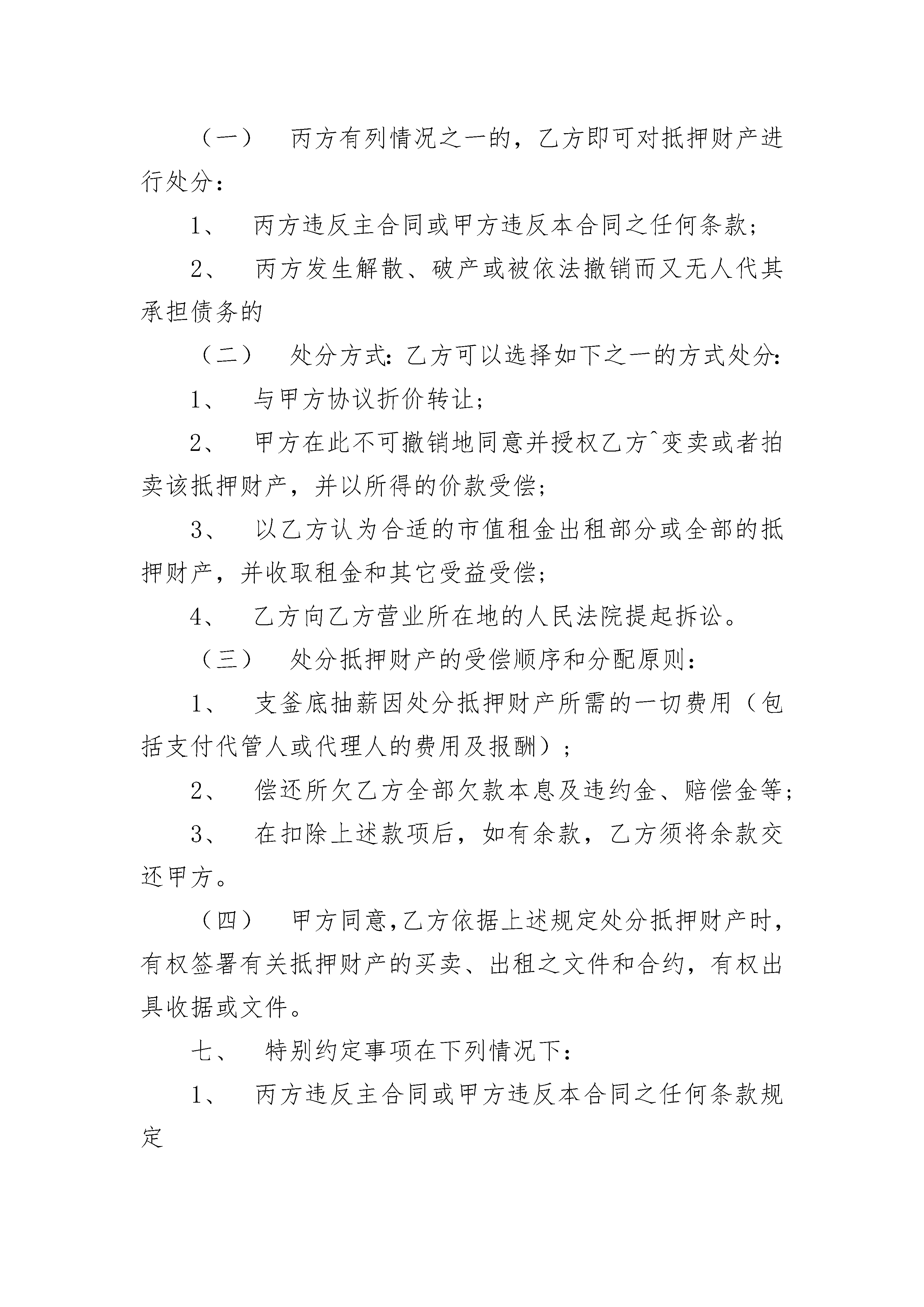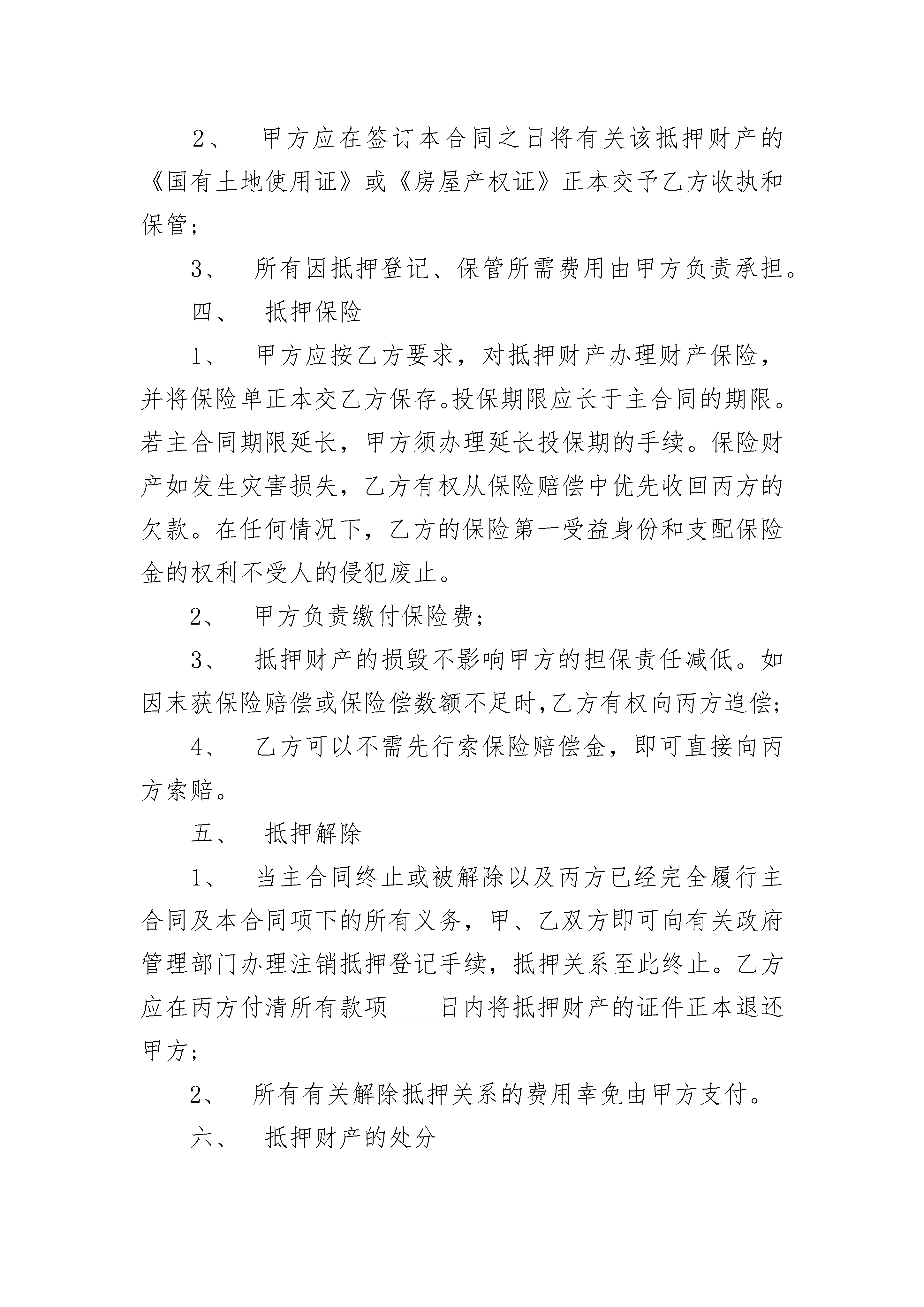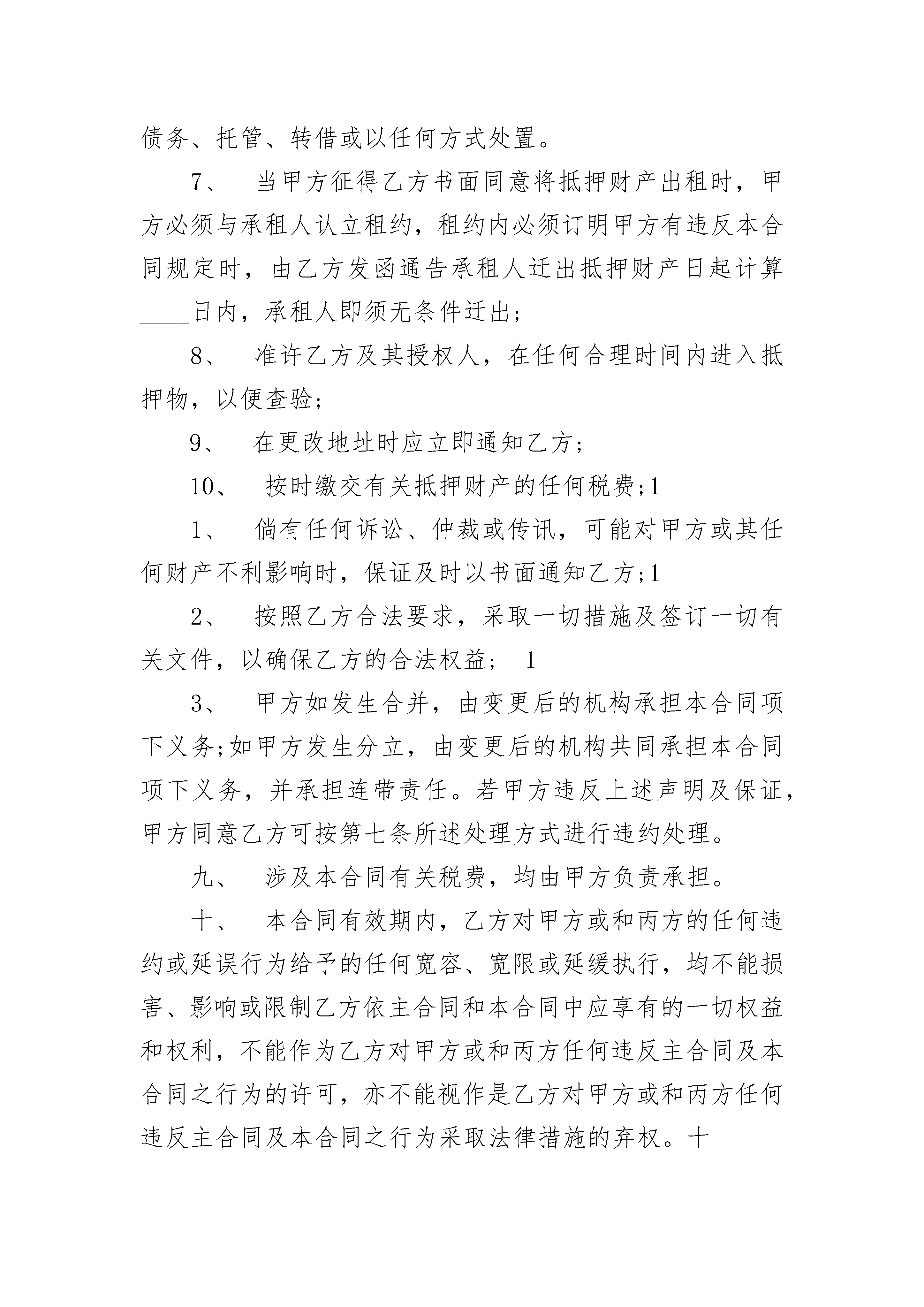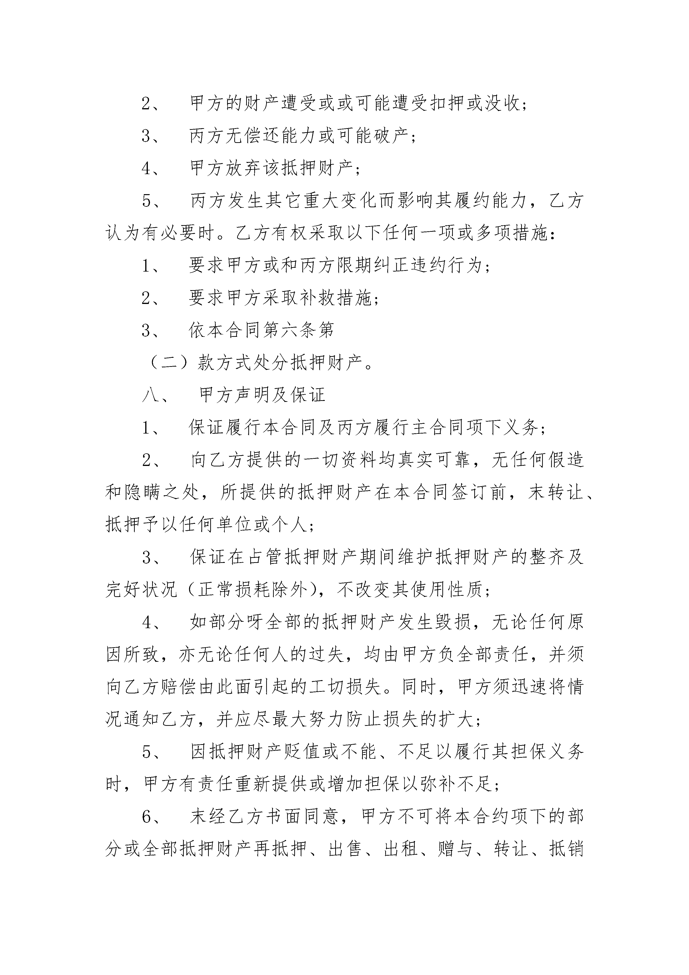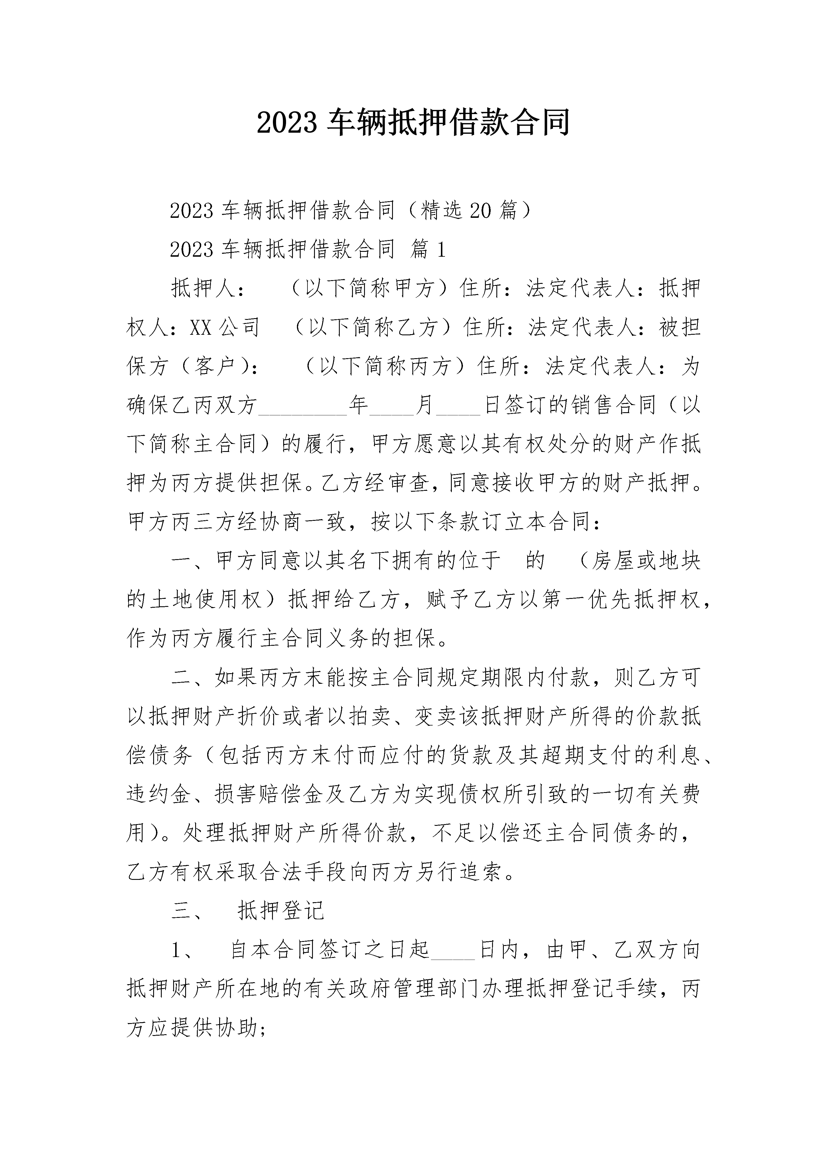 2023车辆抵押借款合同2023车辆抵押借款合同(精选20篇)2023车辆抵押借款合同篇1抵押人:(以下简称甲方)住所:法定代表人:抵押权人:XX公司(以下简称乙方)住所:法定代表人:被担保方(客户):(以下简称丙方)住所:法定代表人:为确保乙丙双方________年____月____日签订的销售合同(以下简称主合同)的履行,甲方愿意以其有权处分的财产作抵押为丙方提供担保。乙方经审查,同意接收甲方的财产抵押。甲方丙三方经协商一致,按以下条款订立本合同:一、甲方同意以其名下拥有的位于的(房屋或地块的土地使用权)抵押给乙方,赋予乙方以第一优先抵押权,作为丙方履行主合同义务的担保。二、如果丙方末能按主合同规定期限内付款,则乙方可以抵押财产折价或者以拍卖、变卖该抵押财产所得的价款抵偿债务(包括丙方末付而应付的货款及其超期支付的利息、违约金、损害赔偿金及乙方为实现债权所引致的一切有关费用)。处理抵押财产所得价款,不足以偿还主合同债务的,乙方有权采取合法手段向丙方另行追索。三、抵押登记1、自本合同签订之日起____日内,由甲、乙双方向抵押财产所在地的有关政府管理部门办理抵押登记手续,丙方应提供协助;2、甲方应在签订本合同之日将有关该抵押财产的《国有土地使用证》或《房屋产权证》正本交予乙方收执和保管;3、所有因抵押登记、保管所需费用由甲方负责承担。四、抵押保险1、甲方应按乙方要求,对抵押财产办理财产保险,并将保险单正本交乙方保存。投保期限应长于主合同的期限。若主合同期限延长,甲方须办理延长投保期的手续。保险财产如发生灾害损失,乙方有权从保险赔偿中优先收回丙方的欠款。在任何情况下,乙方的保险第一受益身份和支配保险金的权利不受人的侵犯废止。2、甲方负责缴付保险费;3、抵押财产的损毁不影响甲方的担保责任减低。如因末获保险赔偿或保险偿数额不足时,乙方有权向丙方追偿;4、乙方可以不需先行索保险赔偿金,即可直接向丙方索赔。五、抵押解除1、当主合同终止或被解除以及丙方已经完全履行主合同及本合同项下的所有义务,甲、乙双方即可向有关政府管理部门办理注销抵押登记手续,抵押关系至此终止。乙方应在丙方付清所有款项____日内将抵押财产的证件正本退还甲方;2、所有有关解除抵押关系的费用幸免由甲方支付。六、抵押财产的处分(一)丙方有列情况之一的,乙方即可对抵押财产进行处分:1、丙方违反主合同或甲方违反本合同之任何条款;2、丙方发生解散、破产或被依法撤销而又无人代其承担债务的(二)处分方式:乙方可以选择如下之一的方式处分:1、与甲方协议折价转让;2、甲方在此不可撤销地同意并授权乙方^变卖或者拍卖该抵押财产,并以所得的价款受偿;3、以乙方认为合适的市值租金出租部分或全部的抵押财产,并收取租金和其它受益受偿;4、乙方向乙方营业所在地的人民法院提起拆讼。(三)处分抵押财产的受偿顺序和分配原则:1、支釜底抽薪因处分抵押财产所需的一切费用(包括支付代管人或代理人的费用及报酬);2、偿还所欠乙方全部欠款本息及违约金、赔偿金等;3、在扣除上述款项后,如有余款,乙方须将余款交还甲方。(四)甲方同意,乙方依据上述规定处分抵押财产时,有权签署有关抵押财产的买卖、出租之文件和合约,有权出具收据或文件。七、特别约定事项在下列情况下:1、丙方违反主合同或甲方违反本合同之任何条款规定2、甲方的财产遭受或或可能遭受扣押或没收;3、丙方无偿还能力或可能破产;4、甲方放弃该抵押财产;5、丙方发生其它重大变化而影响其履约能力,乙方认为有必要时。乙方有权采取以下任何一项或多项措施:1、要求甲方或和丙方限期纠正违约行为;2、要求甲方采取补救措施;3、依本合同第六条第(二)款方式处分抵押财产。八、甲方声明及保证1、保证履行本合同及丙方履行主合同项下义务;2、向乙方提供的一切资料均真实可靠,无任何假造和隐瞒之处,所提供的抵押财产在本合同签订前,末转让、抵押予以任何单位或个人;3、保证在占管抵押财产期间维护抵押财产的整齐及完好状况(正常损耗除外),不改变其使用性质;4、如部分呀全部的抵押财产发生毁损,无论任何原因所致,亦无论任何人的过失,均由甲方负全部责任,并须向乙方赔偿由此面引起的工切损失。同时,甲方须迅速将情况通知乙方,并应尽最大努力防止损失的扩大;5、因抵押财产贬值或不能、不足以履行其担保义务时,甲方有责任重新提供或增加担保以弥补不足;6、末经乙方书面同意,甲方不可将本合约项下的部分或全部抵押财产再抵押、出售、出租、赠与、转让、抵销债务、托管、转借或以任何方式处置。7、当甲方征得乙方书面同意将抵押财产出租时,甲方必须与承租人认立租约,租约内必须订明甲方有违反本合同规定时,由乙方发函通告承租人迁出抵押财产日起计算
