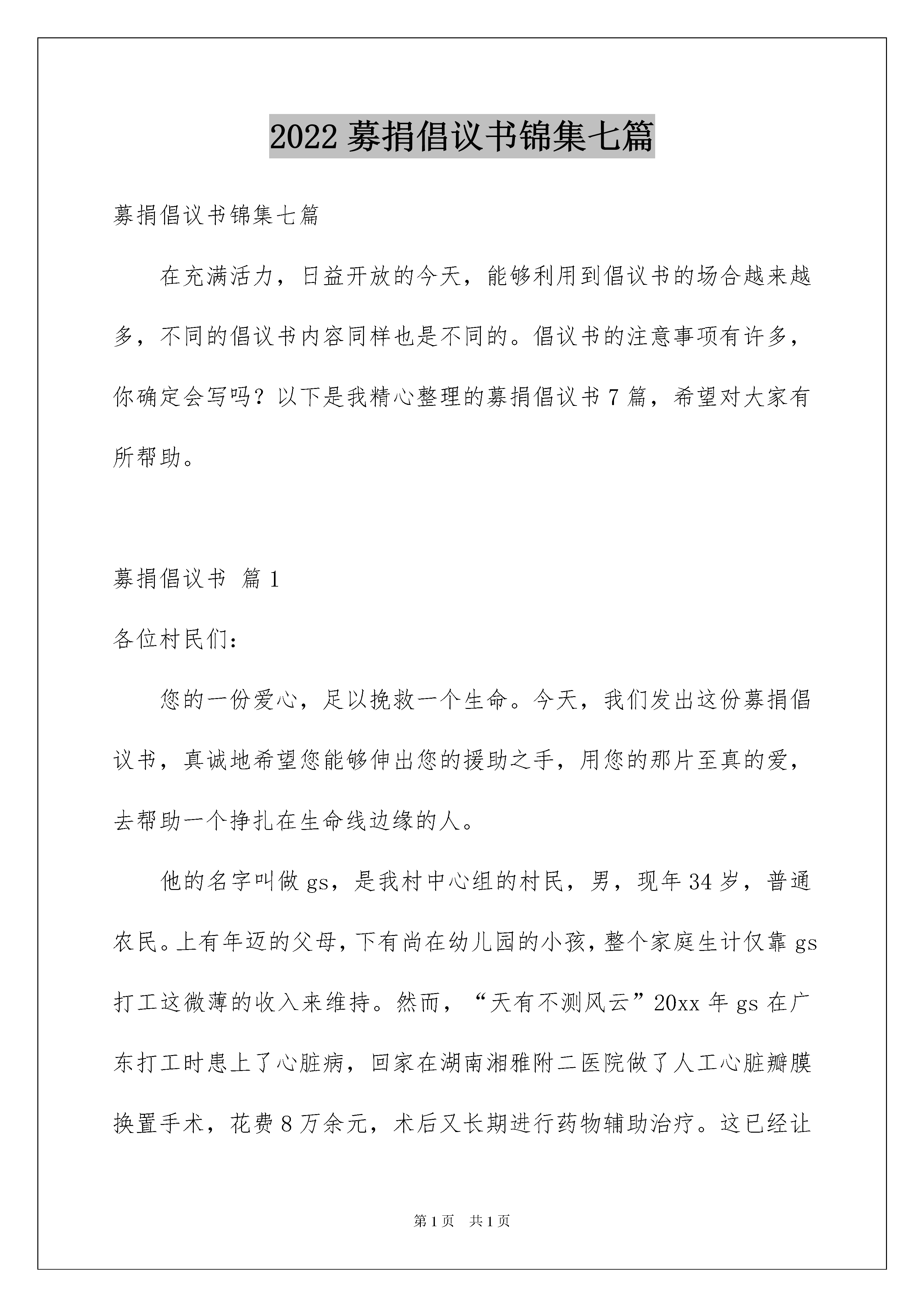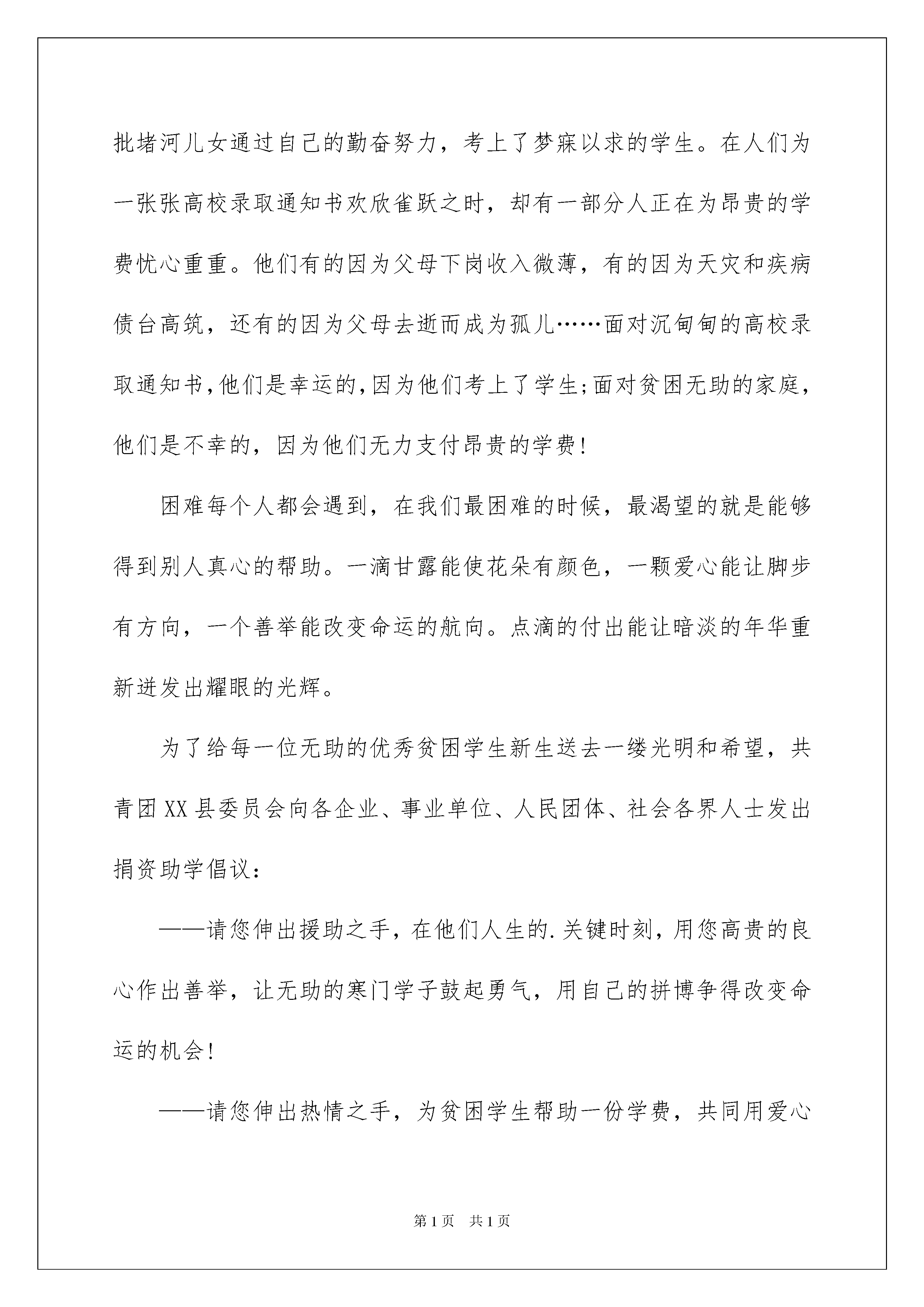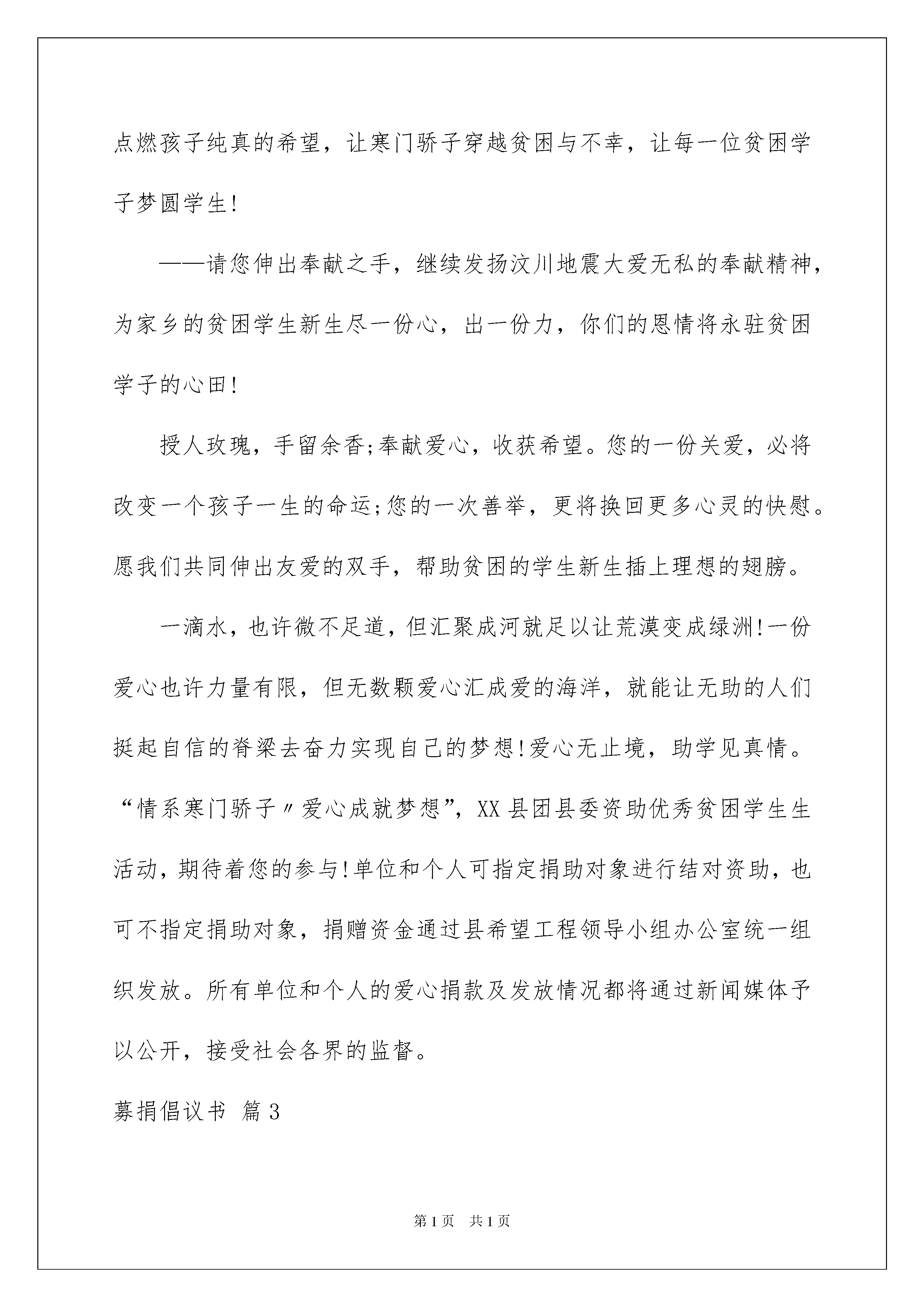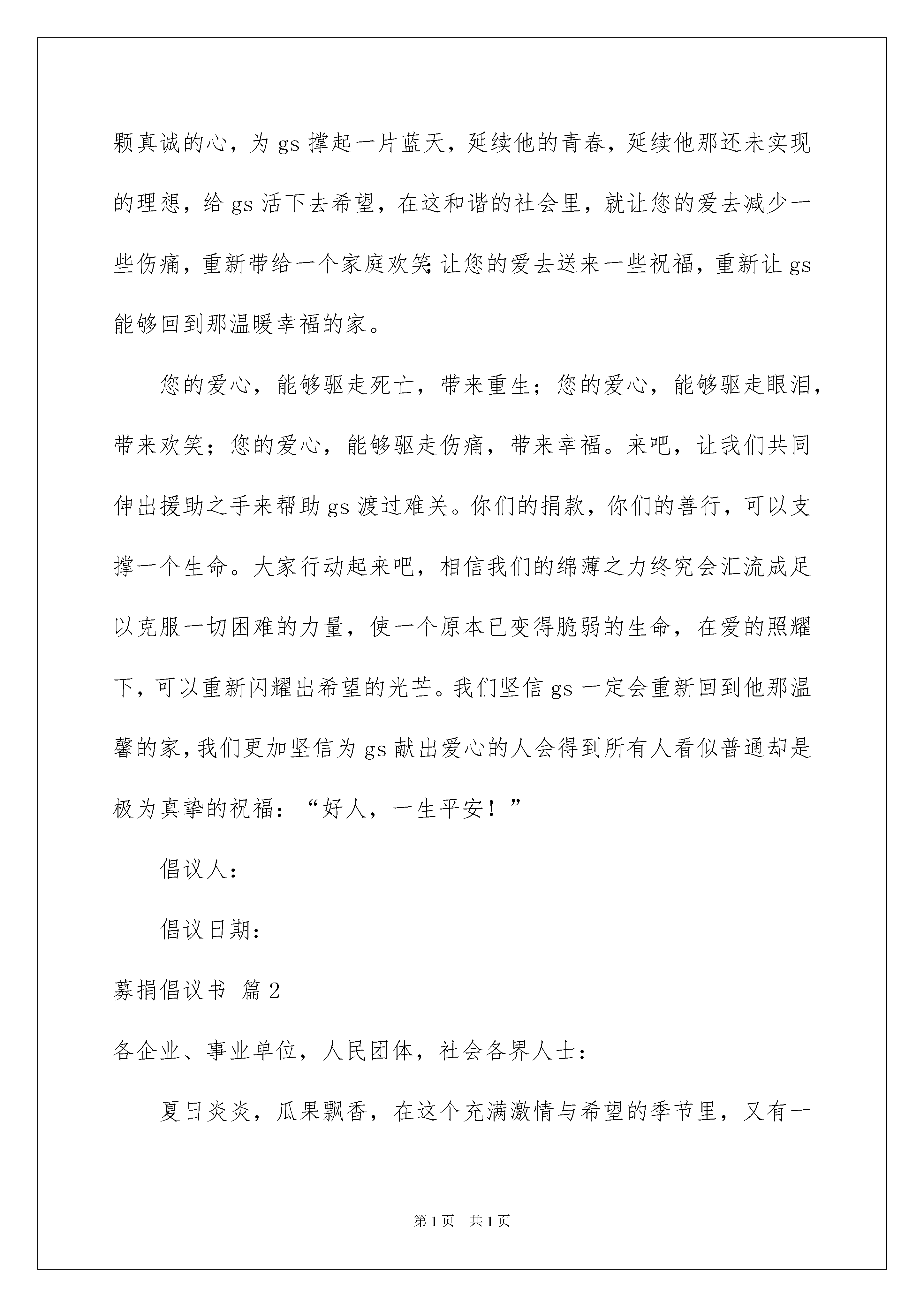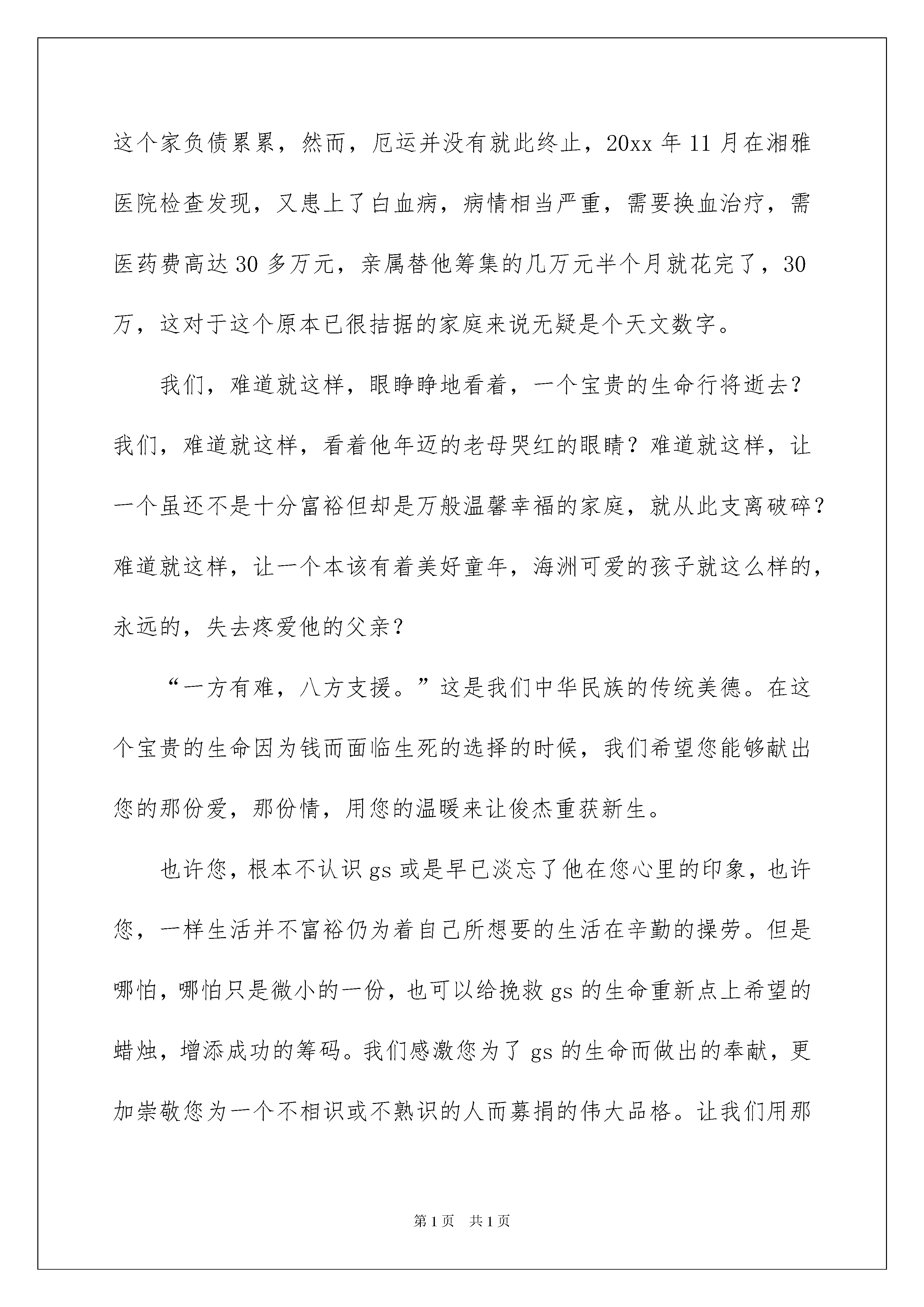 2022募捐倡议书锦集七篇募捐倡议书锦集七篇在充满活力,日益开放的今天,能够利用到倡议书的场合越来越多,不同的倡议书内容同样也是不同的。倡议书的注意事项有许多,你确定会写吗?以下是我精心整理的募捐倡议书7篇,希望对大家有所帮助。募捐倡议书篇1各位村民们:您的一份爱心,足以挽救一个生命。今天,我们发出这份募捐倡议书,真诚地希望您能够伸出您的援助之手,用您的那片至真的爱,去帮助一个挣扎在生命线边缘的人。他的名字叫做gs,是我村中心组的村民,男,现年34岁,普通农民。上有年迈的父母,下有尚在幼儿园的小孩,整个家庭生计仅靠gs打工这微薄的收入来维持。然而,“天有不测风云”20xx年gs在广东打工时患上了心脏病,回家在湖南湘雅附二医院做了人工心脏瓣膜换置手术,花费8万余元,术后又长期进行药物辅助治疗。这已经让这个家负债累累,然而,厄运并没有就此终止,20xx年11月在湘雅医院检查发现,又患上了白血病,病情相当严重,需要换血治疗,需医药费高达30多万元,亲属替他筹集的几万元半个月就花完了,30万,这对于这个原本已很拮据的家庭来说无疑是个天文数字。我们,难道就这样,眼睁睁地看着,一个宝贵的生命行将逝去?我们,难道就这样,看着他年迈的老母哭红的眼睛?难道就这样,让一个虽还不是十分富裕但却是万般温馨幸福的家庭,就从此支离破碎?难道就这样,让一个本该有着美好童年,海洲可爱的孩子就这么样的,永远的,失去疼爱他的父亲?“一方有难,八方支援。”这是我们中华民族的传统美德。在这个宝贵的生命因为钱而面临生死的选择的时候,我们希望您能够献出您的那份爱,那份情,用您的温暖来让俊杰重获新生。也许您,根本不认识gs或是早已淡忘了他在您心里的印象,也许您,一样生活并不富裕仍为着自己所想要的生活在辛勤的操劳。但是哪怕,哪怕只是微小的一份,也可以给挽救gs的生命重新点上希望的蜡烛,增添成功的筹码。我们感激您为了gs的生命而做出的奉献,更加崇敬您为一个不相识或不熟识的人而募捐的伟大品格。让我们用那颗真诚的心,为gs撑起一片蓝天,延续他的青春,延续他那还未实现的理想,给gs活下去希望,在这和谐的社会里,就让您的爱去减少一些伤痛,重新带给一个家庭欢笑;让您的爱去送来一些祝福,重新让gs能够回到那温暖幸福的家。您的爱心,能够驱走死亡,带来重生;您的爱心,能够驱走眼泪,带来欢笑;您的爱心,能够驱走伤痛,带来幸福。来吧,让我们共同伸出援助之手来帮助gs渡过难关。你们的捐款,你们的善行,可以支撑一个生命。大家行动起来吧,相信我们的绵薄之力终究会汇流成足以克服一切困难的力量,使一个原本已变得脆弱的生命,在爱的照耀下,可以重新闪耀出希望的光芒。我们坚信gs一定会重新回到他那温馨的家,我们更加坚信为gs献出爱心的人会得到所有人看似普通却是极为真挚的祝福:“好人,一生平安!”倡议人:倡议日期:募捐倡议书篇2各企业、事业单位,人民团体,社会各界人士:夏日炎炎,瓜果飘香,在这个充满激情与希望的季节里,又有一批堵河儿女通过自己的勤奋努力,考上了梦寐以求的学生。在人们为一张张高校录取通知书欢欣雀跃之时,却有一部分人正在为昂贵的学费忧心重重。他们有的因为父母下岗收入微薄,有的因为天灾和疾病债台高筑,还有的因为父母去逝而成为孤儿……面对沉甸甸的高校录取通知书,他们是幸运的,因为他们考上了学生;面对贫困无助的家庭,他们是不幸的,因为他们无力支付昂贵的学费!困难每个人都会遇到,在我们最困难的时候,最渴望的就是能够得到别人真心的帮助。一滴甘露能使花朵有颜色,一颗爱心能让脚步有方向,一个善举能改变命运的航向。点滴的付出能让暗淡的年华重新迸发出耀眼的光辉。为了给每一位无助的优秀贫困学生新生送去一缕光明和希望,共青团XX县委员会向各企业、事业单位、人民团体、社会各界人士发出捐资助学倡议:——请您伸出援助之手,在他们人生的.关键时刻,用您高贵的良心作出善举,让无助的寒门学子鼓起勇气,用自己的拼博争得改变命运的机会!——请您伸出热情之手,为贫困学生帮助一份学费,共同用爱心点燃孩子纯真的希望,让寒门骄子穿越贫困与不幸,让每一位贫困学子梦圆学生!——请您伸出奉献之手,继续发扬汶川地震大爱无私的奉献精神,为家乡的贫困学生新生尽一份心,出一份力,你们的恩情将永驻贫困学子的心田!授人玫瑰,手留余香;奉献爱心,收获希望。您的一份关爱,必将改变一个孩子一生的命运;您的一次善举,更将换回更多心灵的快慰。愿我们共同伸出友爱的双手,帮助贫困的学生新生插上理想的翅膀。一滴水,也许微不足道,但汇聚成河就足以让荒漠变成绿洲!一份爱心也许力量有限,但无数颗爱心汇成爱的海洋,就能让无助的人们挺