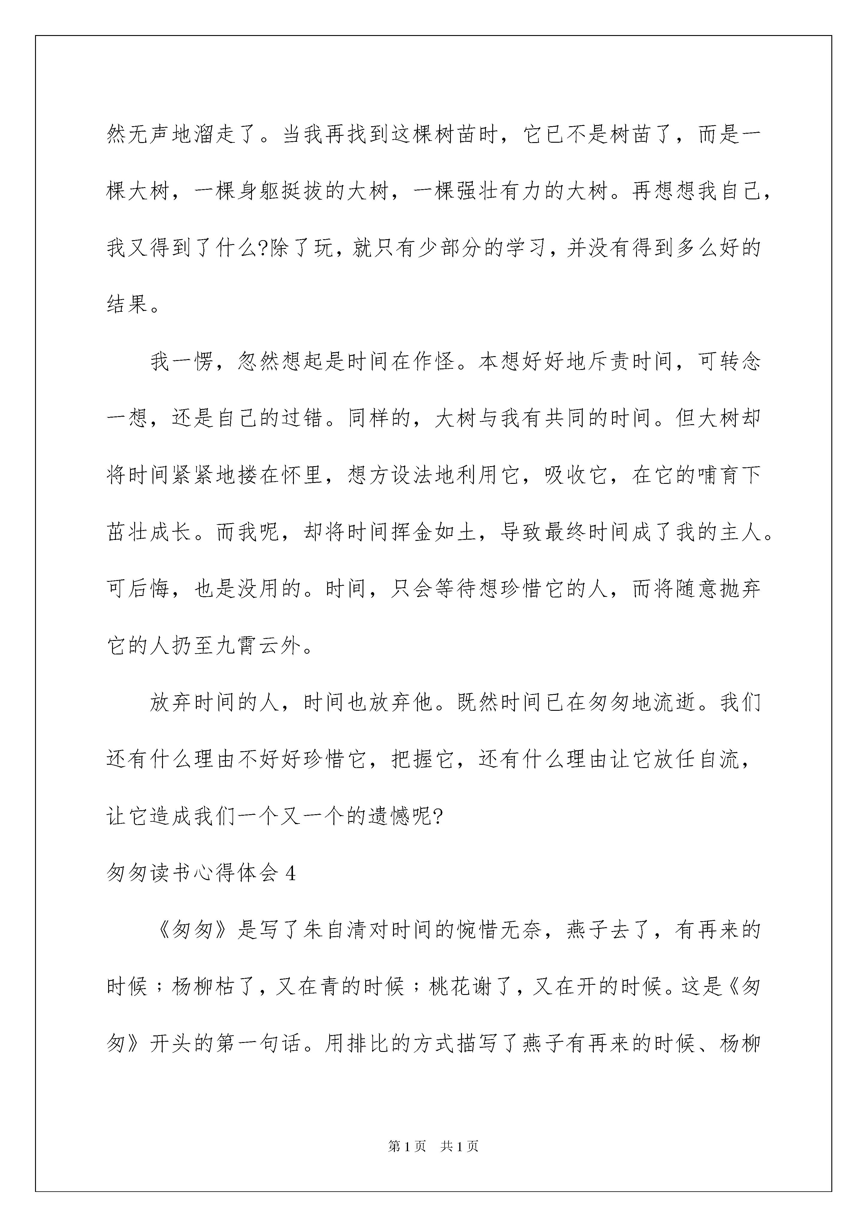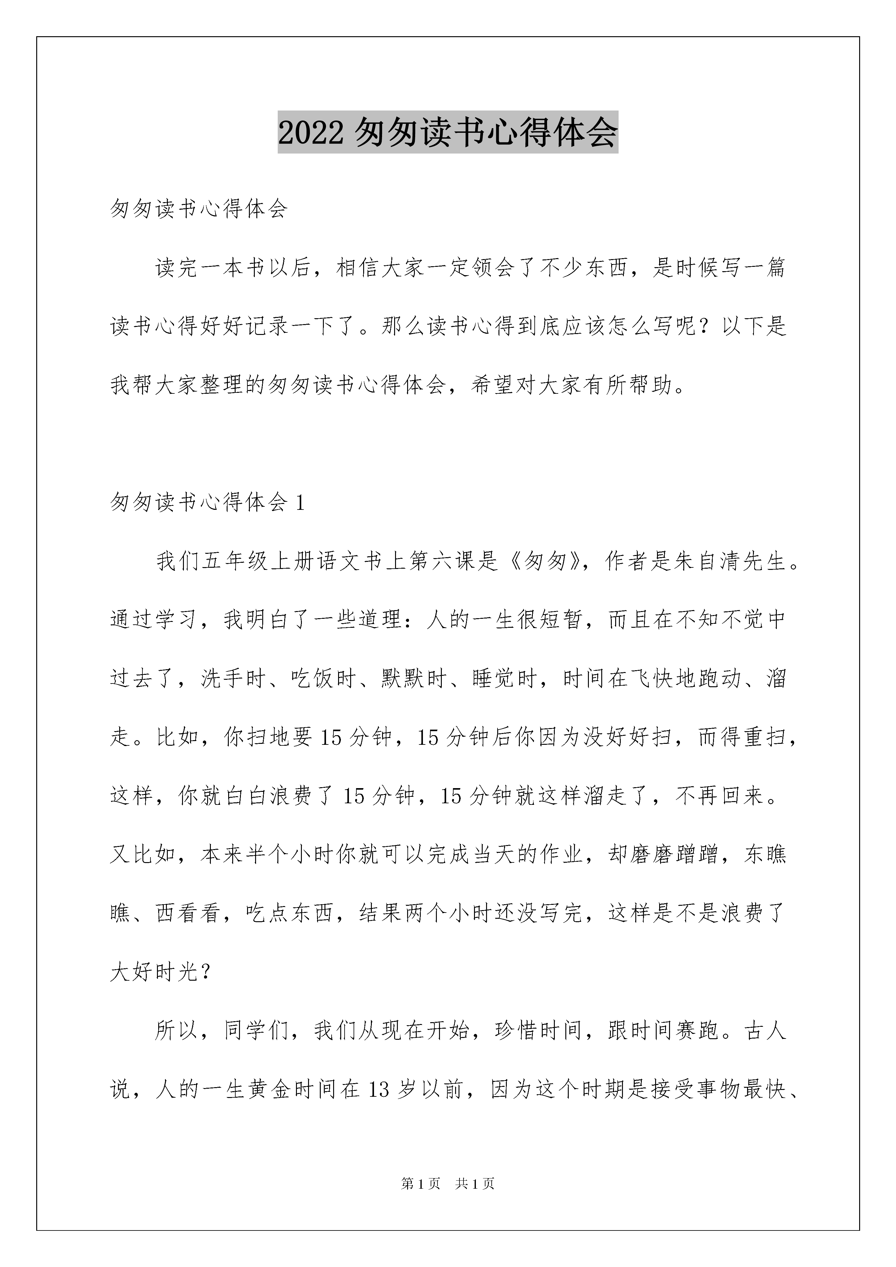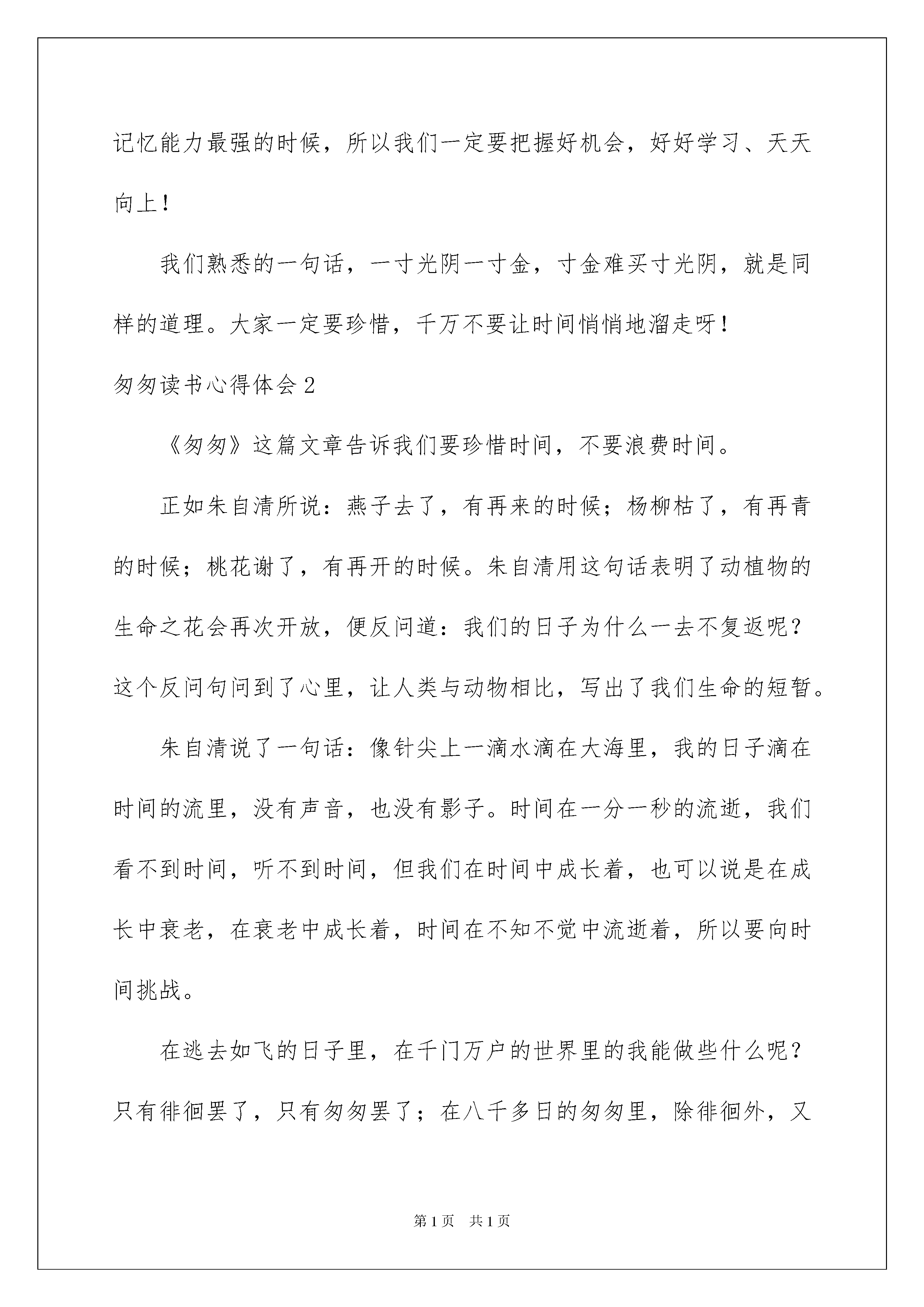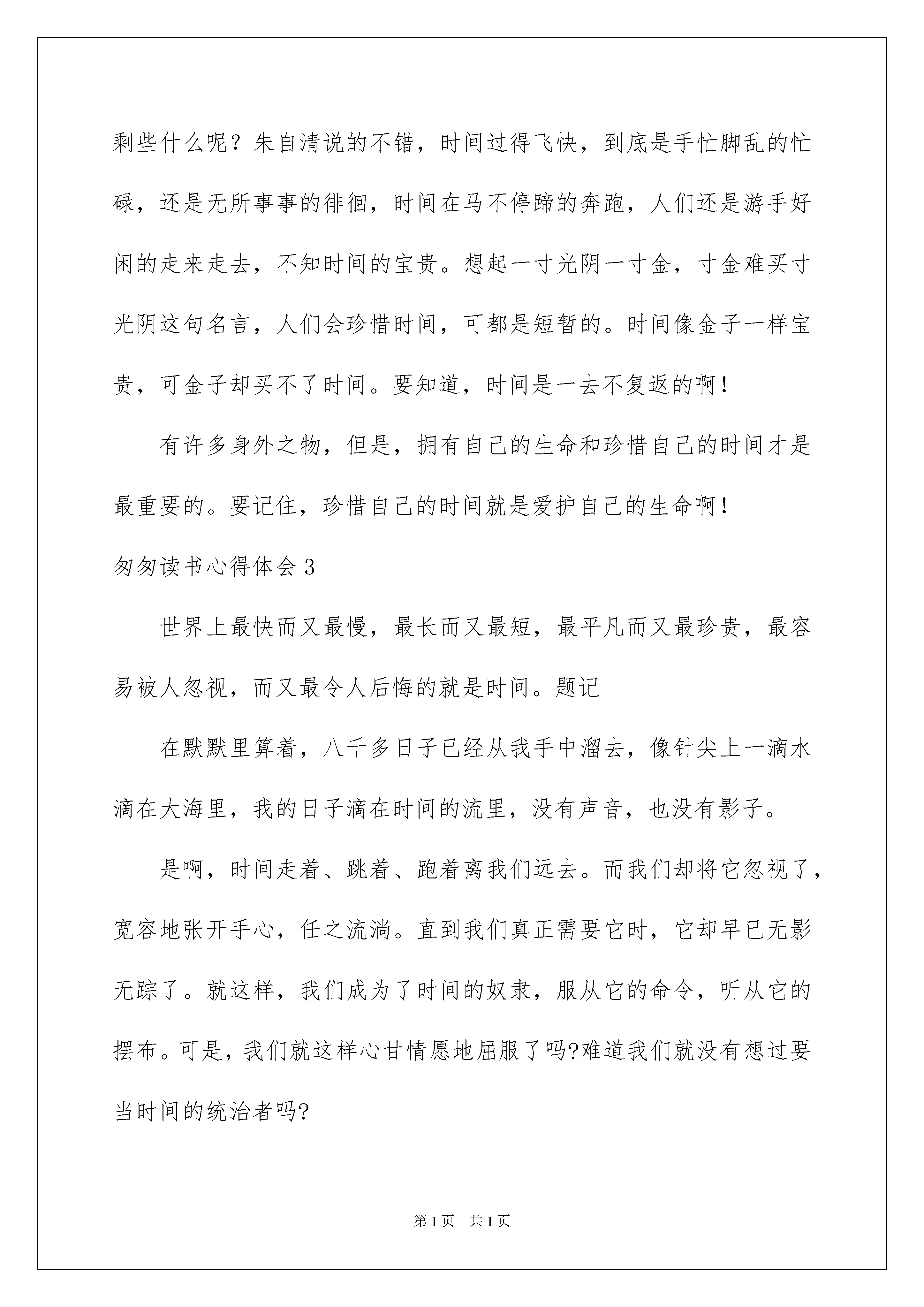 2022匆匆读书心得体会匆匆读书心得体会读完一本书以后,相信大家一定领会了不少东西,是时候写一篇读书心得好好记录一下了。那么读书心得到底应该怎么写呢?以下是我帮大家整理的匆匆读书心得体会,希望对大家有所帮助。匆匆读书心得体会1我们五年级上册语文书上第六课是《匆匆》,作者是朱自清先生。通过学习,我明白了一些道理:人的一生很短暂,而且在不知不觉中过去了,洗手时、吃饭时、默默时、睡觉时,时间在飞快地跑动、溜走。比如,你扫地要15分钟,15分钟后你因为没好好扫,而得重扫,这样,你就白白浪费了15分钟,15分钟就这样溜走了,不再回来。又比如,本来半个小时你就可以完成当天的作业,却磨磨蹭蹭,东瞧瞧、西看看,吃点东西,结果两个小时还没写完,这样是不是浪费了大好时光?所以,同学们,我们从现在开始,珍惜时间,跟时间赛跑。古人说,人的一生黄金时间在13岁以前,因为这个时期是接受事物最快、记忆能力最强的时候,所以我们一定要把握好机会,好好学习、天天向上!我们熟悉的一句话,一寸光阴一寸金,寸金难买寸光阴,就是同样的道理。大家一定要珍惜,千万不要让时间悄悄地溜走呀!匆匆读书心得体会2《匆匆》这篇文章告诉我们要珍惜时间,不要浪费时间。正如朱自清所说:燕子去了,有再来的时候;杨柳枯了,有再青的时候;桃花谢了,有再开的时候。朱自清用这句话表明了动植物的生命之花会再次开放,便反问道:我们的日子为什么一去不复返呢?这个反问句问到了心里,让人类与动物相比,写出了我们生命的短暂。朱自清说了一句话:像针尖上一滴水滴在大海里,我的日子滴在时间的流里,没有声音,也没有影子。时间在一分一秒的流逝,我们看不到时间,听不到时间,但我们在时间中成长着,也可以说是在成长中衰老,在衰老中成长着,时间在不知不觉中流逝着,所以要向时间挑战。在逃去如飞的日子里,在千门万户的世界里的我能做些什么呢?只有徘徊罢了,只有匆匆罢了;在八千多日的匆匆里,除徘徊外,又剩些什么呢?朱自清说的不错,时间过得飞快,到底是手忙脚乱的忙碌,还是无所事事的徘徊,时间在马不停蹄的奔跑,人们还是游手好闲的走来走去,不知时间的宝贵。想起一寸光阴一寸金,寸金难买寸光阴这句名言,人们会珍惜时间,可都是短暂的。时间像金子一样宝贵,可金子却买不了时间。要知道,时间是一去不复返的啊!有许多身外之物,但是,拥有自己的生命和珍惜自己的时间才是最重要的。要记住,珍惜自己的时间就是爱护自己的生命啊!匆匆读书心得体会3世界上最快而又最慢,最长而又最短,最平凡而又最珍贵,最容易被人忽视,而又最令人后悔的就是时间。题记在默默里算着,八千多日子已经从我手中溜去,像针尖上一滴水滴在大海里,我的日子滴在时间的流里,没有声音,也没有影子。是啊,时间走着、跳着、跑着离我们远去。而我们却将它忽视了,宽容地张开手心,任之流淌。直到我们真正需要它时,它却早已无影无踪了。就这样,我们成为了时间的奴隶,服从它的命令,听从它的摆布。可是,我们就这样心甘情愿地屈服了吗?难道我们就没有想过要当时间的统治者吗?麦金西曾感慨道时间是世界上一切成就的土壤。时间给空想者痛苦,给创造者幸福。难道不是吗?你看,木匠皇帝明熹宗,随心所欲,不务正业,浪费时间在木匠活上,终究误了治国大事。你再看,爱迪生的助手没有用好的办法,快速地找出结果,差点导致实验被延迟这都是多么可悲又令人惋惜的事例啊!而造成这些后果的一切,还不是没有好好珍惜时间,好好利用时间!但是,时间也不是一个恶魔。它并不会亏待好好珍惜它的人。你瞧,美国作家杰克伦敦为了争分夺秒,在他家许多地方挂上珍惜时间的提示语。你瞧,居里夫人为了不使来访者拖延拜访的时间,会客室里从来不放坐椅,钋和镭便在这些省下来的时间中被发现。你再瞧,鲁迅剪头发时,从来不计较剪得好不好看,他要的只是速度快,由此他便有了更多的时间投入写作当中这一切又说明了什么?只要好好珍惜时间并好好利用时间,它一定不会辜负你的期望,给你的惊喜或巨大、或渺小、或珍贵、或平凡。还记得小时候,我曾在楼下找到了一棵小树苗。这棵小树苗可瘦小了:嫩嫩的枝叶,柔弱的身躯,有气无力地站在土地上。而我呢,却乐此不疲地玩着,从未想过要好好地珍惜时间。十年光阴就这样悄然无声地溜走了。当我再找到这棵树苗时,它已不是树苗了,而是一棵大树,一棵身躯挺拔的大树,一棵强壮有力的大树。再想想我自己,我又得到了什么?除了玩,就只有少部分的学习,并没有得到多么好的结果。我一愣,忽然想起是时间在作怪。本想好好地斥责时间,可转念一想,还是自己的过错。同样的,大树与我有共同的时间。但大树却将时间紧紧地搂在怀里,想方设法地利用它,吸收它,在它的哺育下茁壮成长。而我