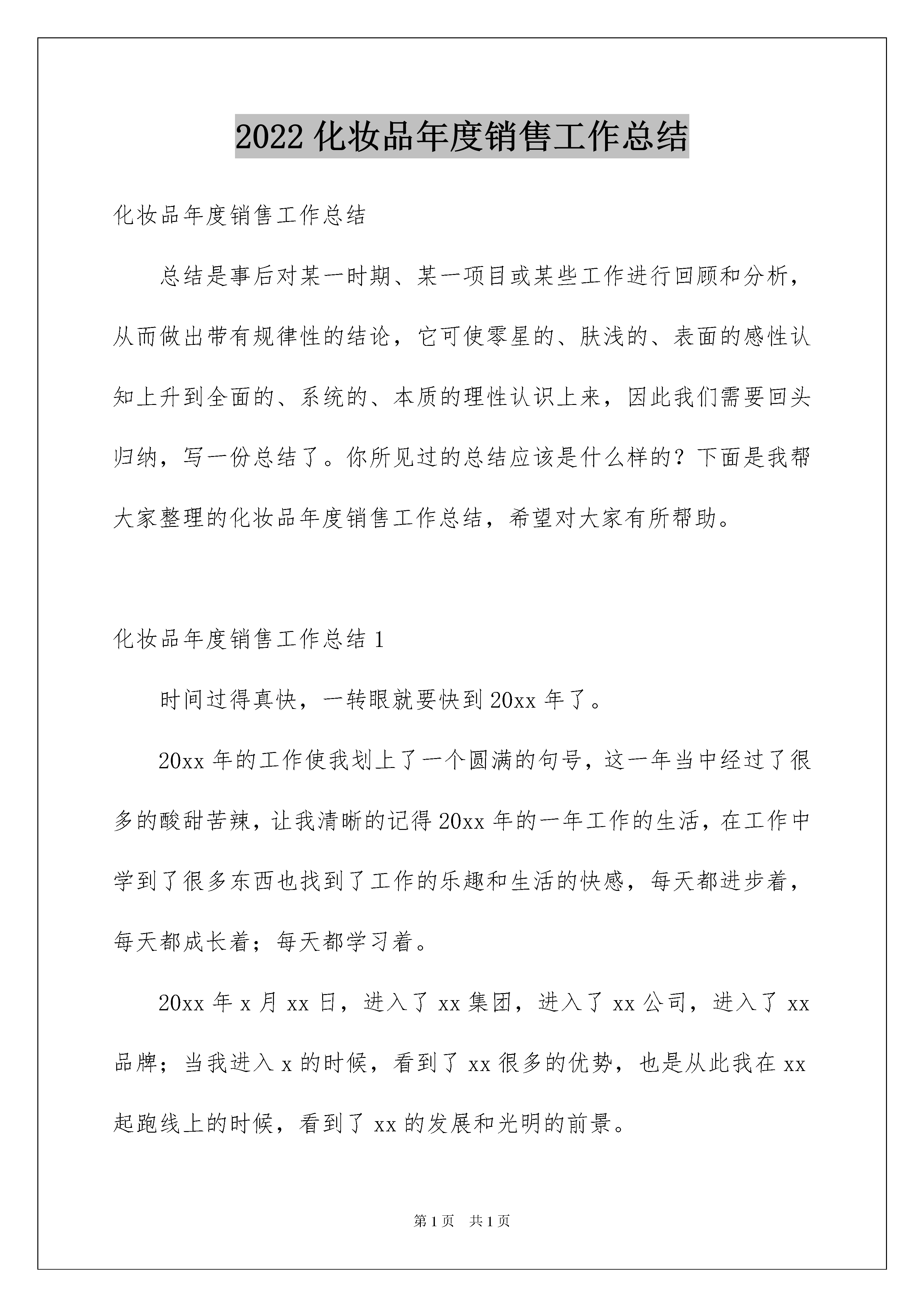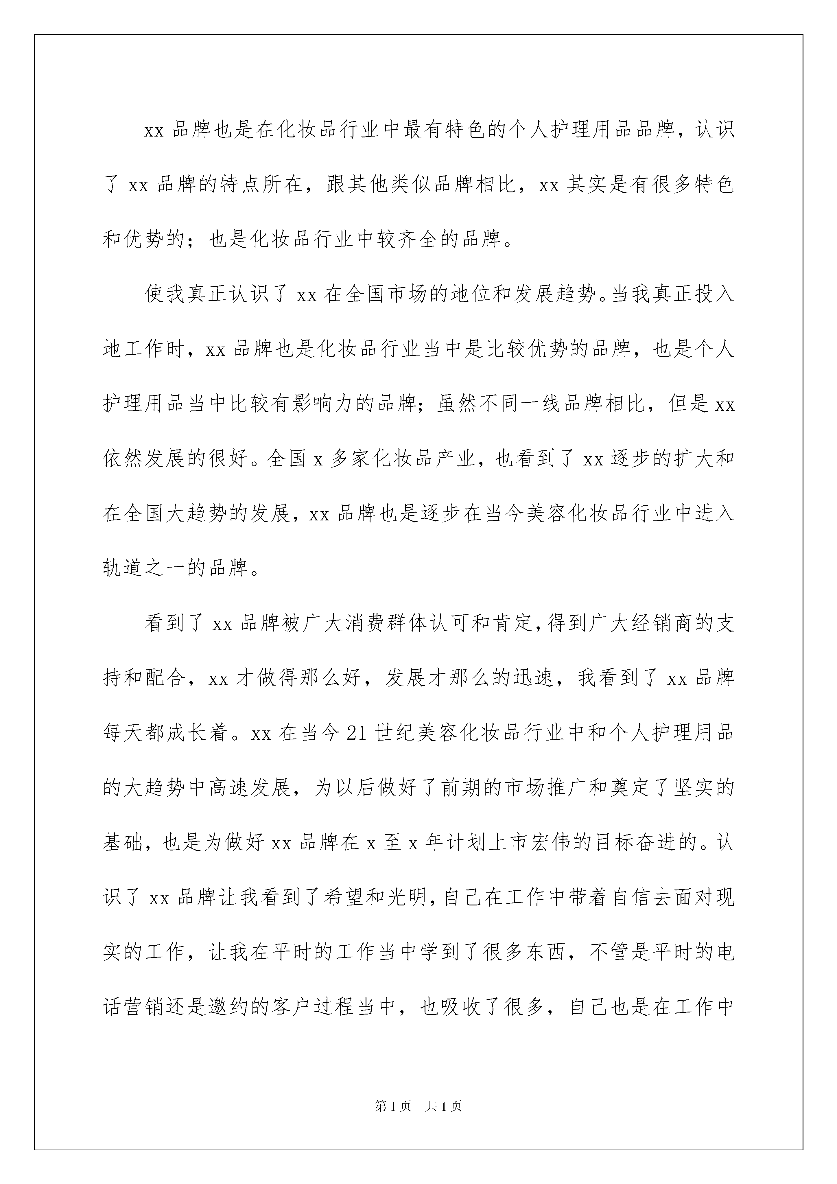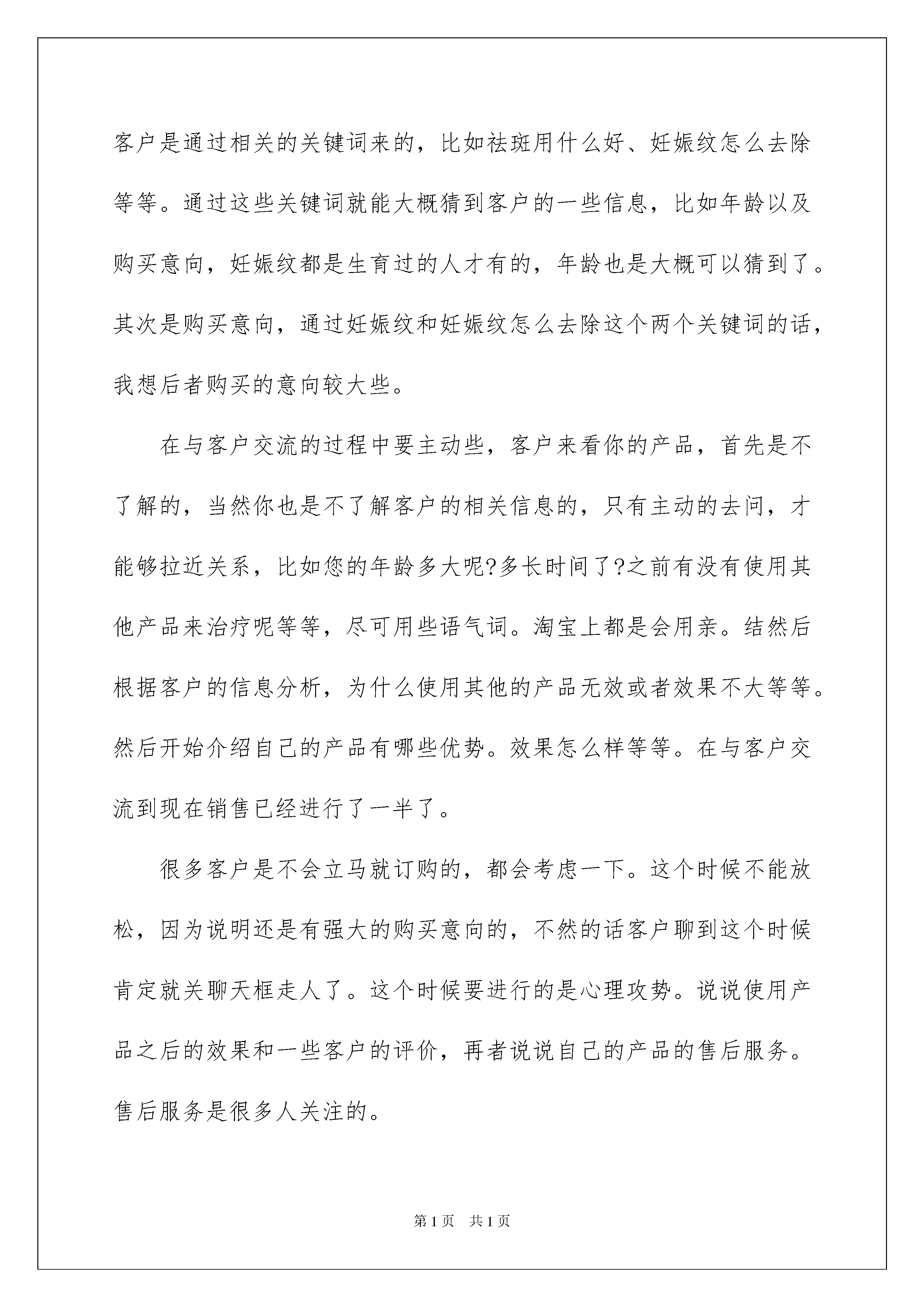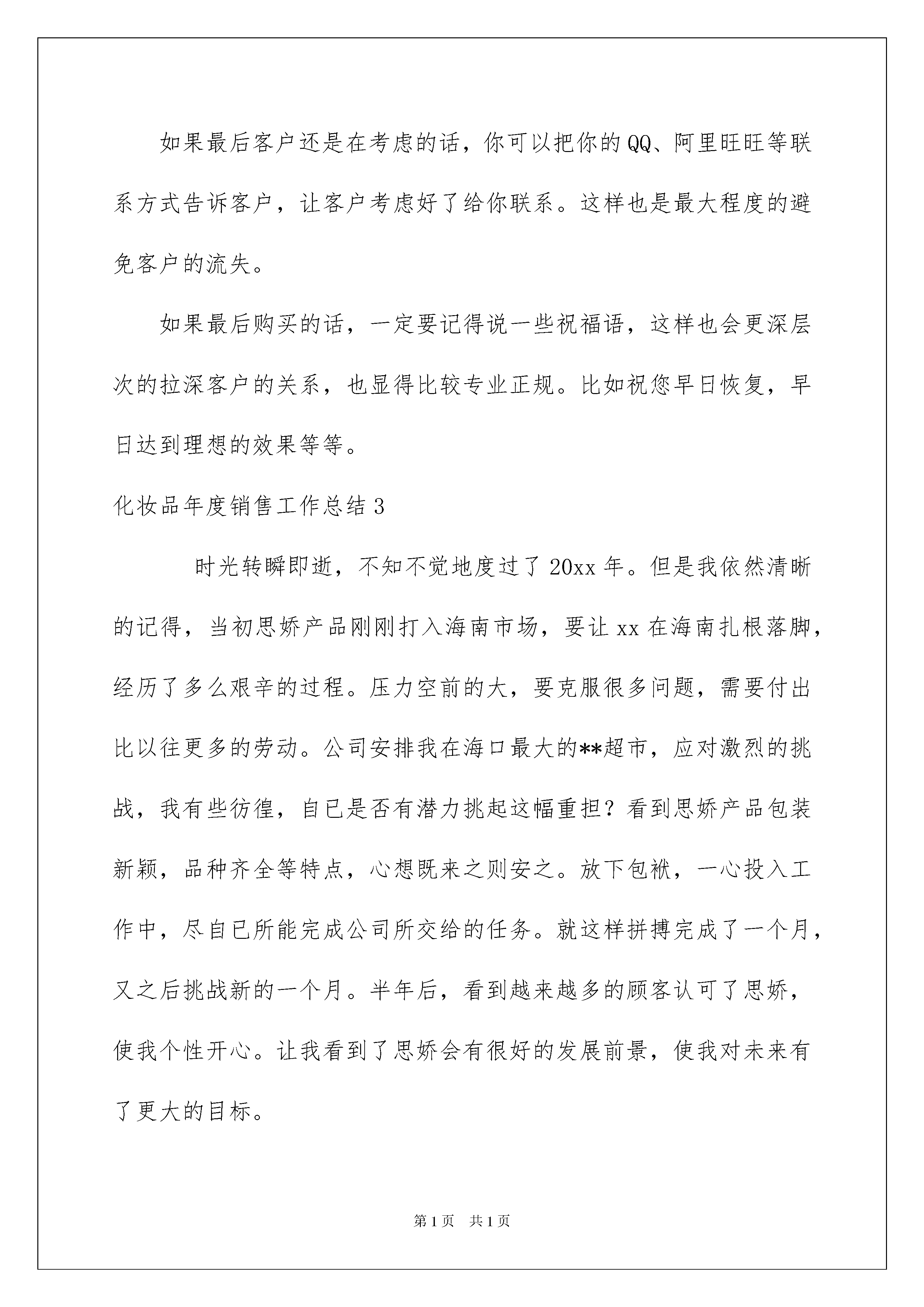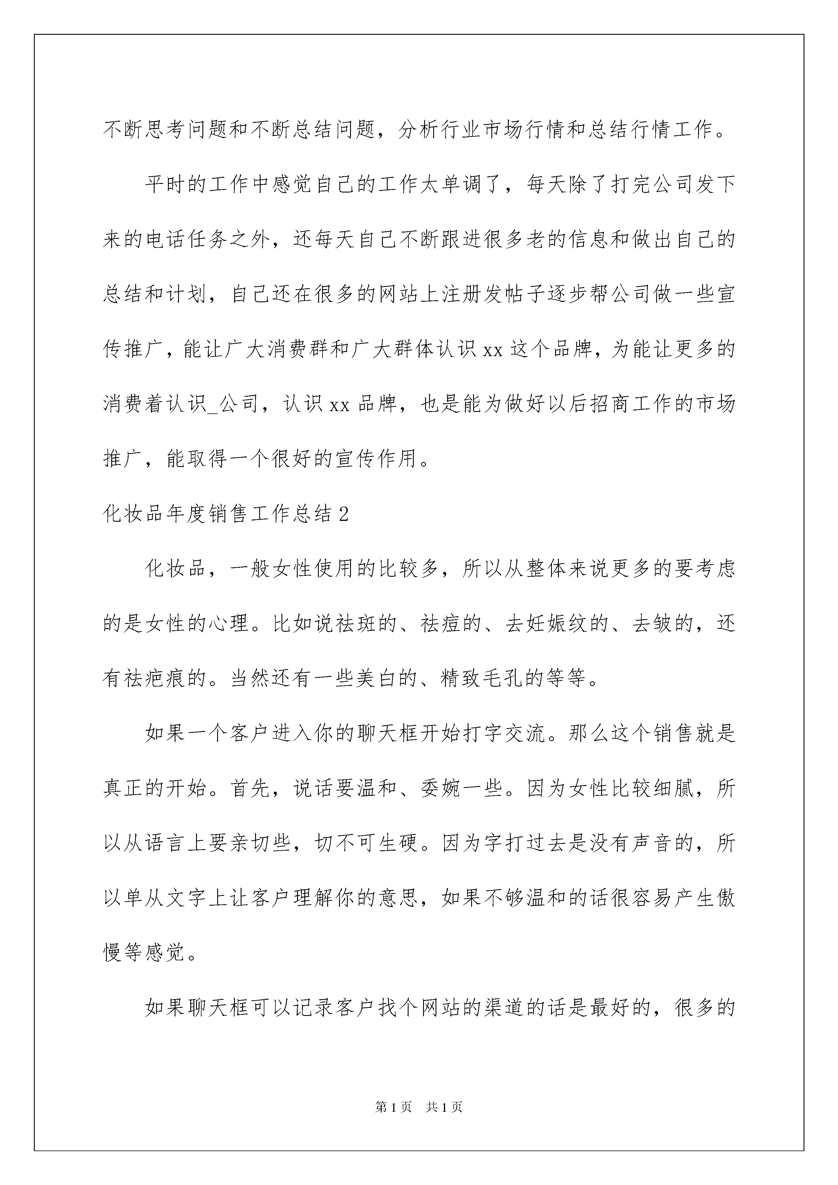 2022化妆品年度销售工作总结化妆品年度销售工作总结总结是事后对某一时期、某一项目或某些工作进行回顾和分析,从而做出带有规律性的结论,它可使零星的、肤浅的、表面的感性认知上升到全面的、系统的、本质的理性认识上来,因此我们需要回头归纳,写一份总结了。你所见过的总结应该是什么样的?下面是我帮大家整理的化妆品年度销售工作总结,希望对大家有所帮助。化妆品年度销售工作总结1时间过得真快,一转眼就要快到20xx年了。20xx年的工作使我划上了一个圆满的句号,这一年当中经过了很多的酸甜苦辣,让我清晰的记得20xx年的一年工作的生活,在工作中学到了很多东西也找到了工作的乐趣和生活的快感,每天都进步着,每天都成长着;每天都学习着。20xx年x月xx日,进入了xx集团,进入了xx公司,进入了xx品牌;当我进入x的时候,看到了xx很多的优势,也是从此我在xx起跑线上的时候,看到了xx的发展和光明的前景。xx品牌也是在化妆品行业中最有特色的个人护理用品品牌,认识了xx品牌的特点所在,跟其他类似品牌相比,xx其实是有很多特色和优势的;也是化妆品行业中较齐全的品牌。使我真正认识了xx在全国市场的地位和发展趋势。当我真正投入地工作时,xx品牌也是化妆品行业当中是比较优势的品牌,也是个人护理用品当中比较有影响力的品牌;虽然不同一线品牌相比,但是xx依然发展的很好。全国x多家化妆品产业,也看到了xx逐步的扩大和在全国大趋势的发展,xx品牌也是逐步在当今美容化妆品行业中进入轨道之一的品牌。看到了xx品牌被广大消费群体认可和肯定,得到广大经销商的支持和配合,xx才做得那么好,发展才那么的迅速,我看到了xx品牌每天都成长着。xx在当今21世纪美容化妆品行业中和个人护理用品的大趋势中高速发展,为以后做好了前期的市场推广和奠定了坚实的基础,也是为做好xx品牌在x至x年计划上市宏伟的目标奋进的。认识了xx品牌让我看到了希望和光明,自己在工作中带着自信去面对现实的工作,让我在平时的工作当中学到了很多东西,不管是平时的电话营销还是邀约的客户过程当中,也吸收了很多,自己也是在工作中不断思考问题和不断总结问题,分析行业市场行情和总结行情工作。平时的工作中感觉自己的工作太单调了,每天除了打完公司发下来的电话任务之外,还每天自己不断跟进很多老的信息和做出自己的总结和计划,自己还在很多的网站上注册发帖子逐步帮公司做一些宣传推广,能让广大消费群和广大群体认识xx这个品牌,为能让更多的消费着认识_公司,认识xx品牌,也是能为做好以后招商工作的市场推广,能取得一个很好的宣传作用。化妆品年度销售工作总结2化妆品,一般女性使用的比较多,所以从整体来说更多的要考虑的是女性的心理。比如说祛斑的、祛痘的、去妊娠纹的、去皱的,还有祛疤痕的。当然还有一些美白的、精致毛孔的等等。如果一个客户进入你的聊天框开始打字交流。那么这个销售就是真正的开始。首先,说话要温和、委婉一些。因为女性比较细腻,所以从语言上要亲切些,切不可生硬。因为字打过去是没有声音的,所以单从文字上让客户理解你的意思,如果不够温和的话很容易产生傲慢等感觉。如果聊天框可以记录客户找个网站的渠道的话是最好的,很多的客户是通过相关的关键词来的,比如祛斑用什么好、妊娠纹怎么去除等等。通过这些关键词就能大概猜到客户的一些信息,比如年龄以及购买意向,妊娠纹都是生育过的人才有的,年龄也是大概可以猜到了。其次是购买意向,通过妊娠纹和妊娠纹怎么去除这个两个关键词的话,我想后者购买的意向较大些。在与客户交流的过程中要主动些,客户来看你的产品,首先是不了解的,当然你也是不了解客户的相关信息的,只有主动的去问,才能够拉近关系,比如您的年龄多大呢?多长时间了?之前有没有使用其他产品来治疗呢等等,尽可用些语气词。淘宝上都是会用亲。结然后根据客户的信息分析,为什么使用其他的产品无效或者效果不大等等。然后开始介绍自己的产品有哪些优势。效果怎么样等等。在与客户交流到现在销售已经进行了一半了。很多客户是不会立马就订购的,都会考虑一下。这个时候不能放松,因为说明还是有强大的购买意向的,不然的话客户聊到这个时候肯定就关聊天框走人了。这个时候要进行的是心理攻势。说说使用产品之后的效果和一些客户的评价,再者说说自己的产品的售后服务。售后服务是很多人关注的。如果最后客户还是在考虑的话,你可以把你的QQ、阿里旺旺等联系方式告诉客户,让客户考虑好了给你联系。这样也是最大程度的避免客户的流失。如果最后购买的话,一定要记得说一些祝福语,这样也会更深层次的拉深客户的关系,也显得比较专业正规。比如祝您早日恢复,早日达到理想的效果等等。化妆品年度