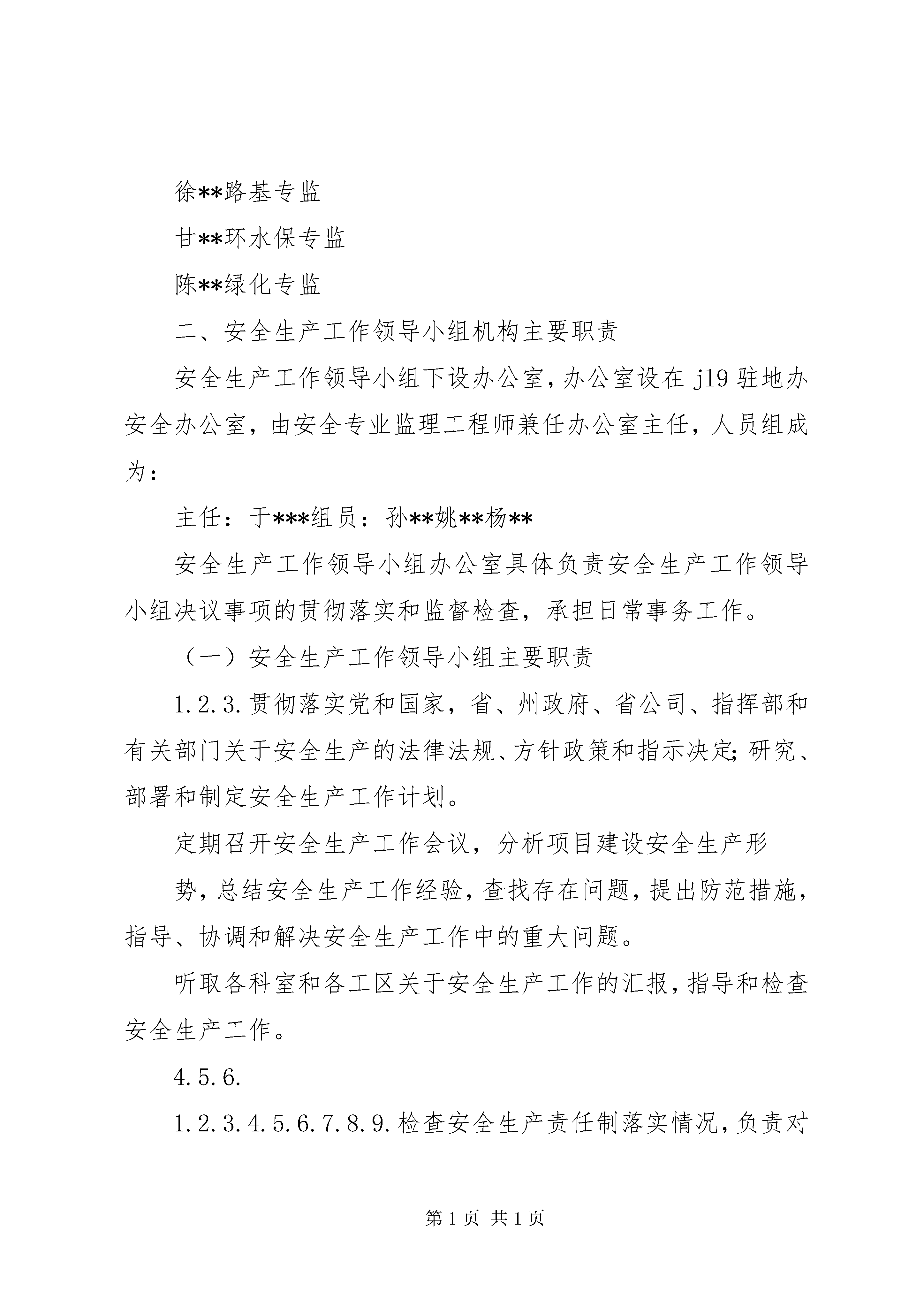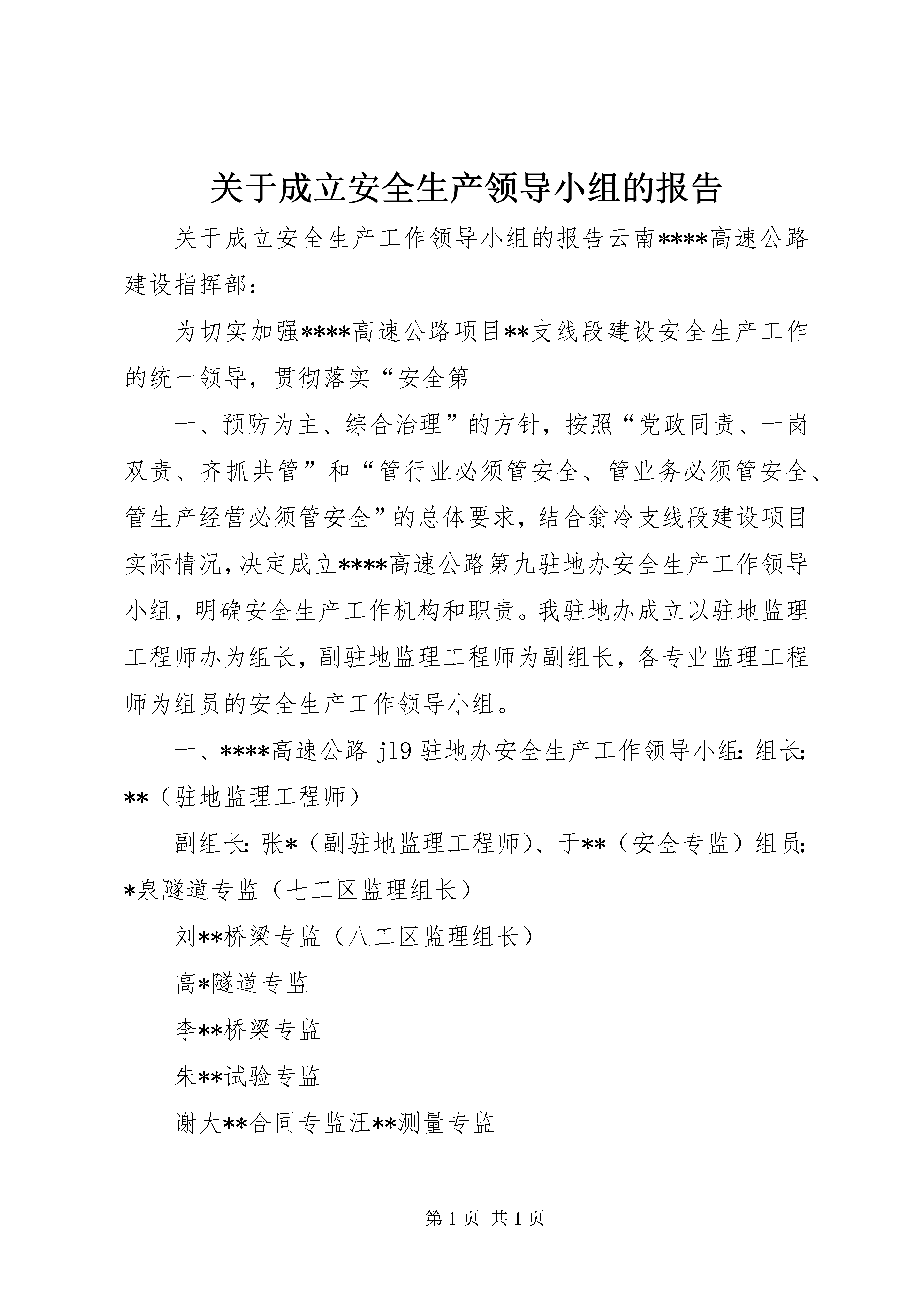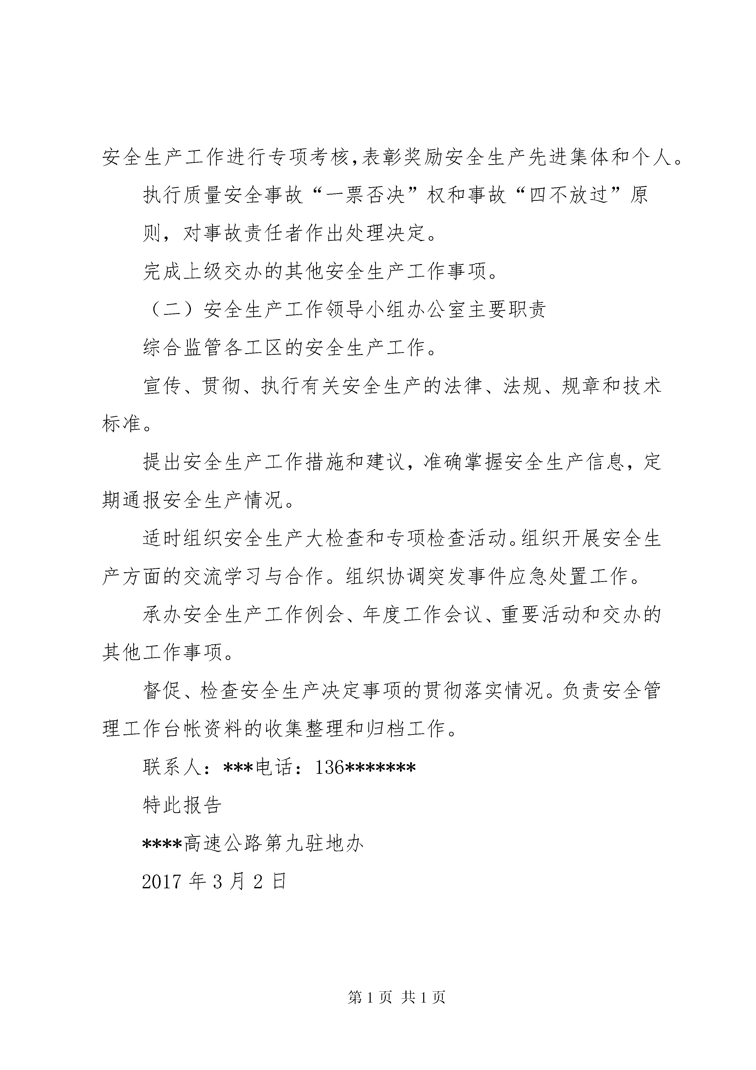 关于成立安全生产领导小组的报告关于成立安全生产工作领导小组的报告云南****高速公路建设指挥部:为切实加强****高速公路项目**支线段建设安全生产工作的统一领导,贯彻落实“安全第一、预防为主、综合治理”的方针,按照“党政同责、一岗双责、齐抓共管”和“管行业必须管安全、管业务必须管安全、管生产经营必须管安全”的总体要求,结合翁冷支线段建设项目实际情况,决定成立****高速公路第九驻地办安全生产工作领导小组,明确安全生产工作机构和职责。我驻地办成立以驻地监理工程师办为组长,副驻地监理工程师为副组长,各专业监理工程师为组员的安全生产工作领导小组。一、****高速公路jl9驻地办安全生产工作领导小组:组长:**(驻地监理工程师)副组长:张*(副驻地监理工程师)、于**(安全专监)组员:*泉隧道专监(七工区监理组长)刘**桥梁专监(八工区监理组长)高*隧道专监李**桥梁专监朱**试验专监谢大**合同专监汪**测量专监徐**路基专监甘**环水保专监陈**绿化专监二、安全生产工作领导小组机构主要职责安全生产工作领导小组下设办公室,办公室设在jl9驻地办安全办公室,由安全专业监理工程师兼任办公室主任,人员组成为:主任:于***组员:孙**姚**杨**安全生产工作领导小组办公室具体负责安全生产工作领导小组决议事项的贯彻落实和监督检查,承担日常事务工作。(一)安全生产工作领导小组主要职责1.2.3.贯彻落实党和国家,省、州政府、省公司、指挥部和有关部门关于安全生产的法律法规、方针政策和指示决定;研究、部署和制定安全生产工作计划。定期召开安全生产工作会议,分析项目建设安全生产形势,总结安全生产工作经验,查找存在问题,提出防范措施,指导、协调和解决安全生产工作中的重大问题。听取各科室和各工区关于安全生产工作的汇报,指导和检查安全生产工作。4.5.6.1.2.3.4.5.6.7.8.9.检查安全生产责任制落实情况,负责对安全生产工作进行专项考核,表彰奖励安全生产先进集体和个人。执行质量安全事故“一票否决”权和事故“四不放过”原则,对事故责任者作出处理决定。完成上级交办的其他安全生产工作事项。(二)安全生产工作领导小组办公室主要职责综合监管各工区的安全生产工作。宣传、贯彻、执行有关安全生产的法律、法规、规章和技术标准。提出安全生产工作措施和建议,准确掌握安全生产信息,定期通报安全生产情况。适时组织安全生产大检查和专项检查活动。组织开展安全生产方面的交流学习与合作。组织协调突发事件应急处置工作。承办安全生产工作例会、年度工作会议、重要活动和交办的其他工作事项。督促、检查安全生产决定事项的贯彻落实情况。负责安全管理工作台帐资料的收集整理和归档工作。联系人:***电话:136*******特此报告****高速公路第九驻地办2017年3月2日