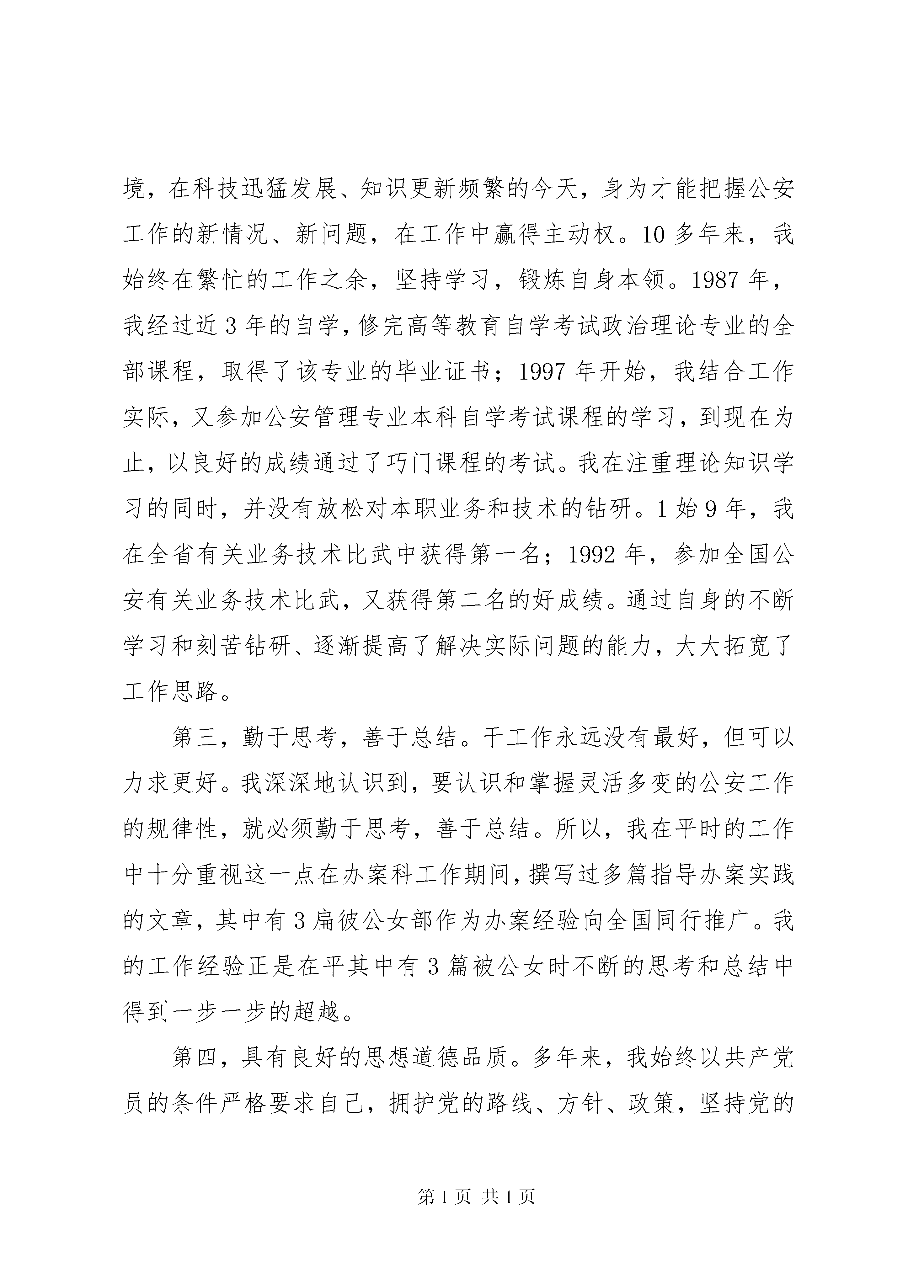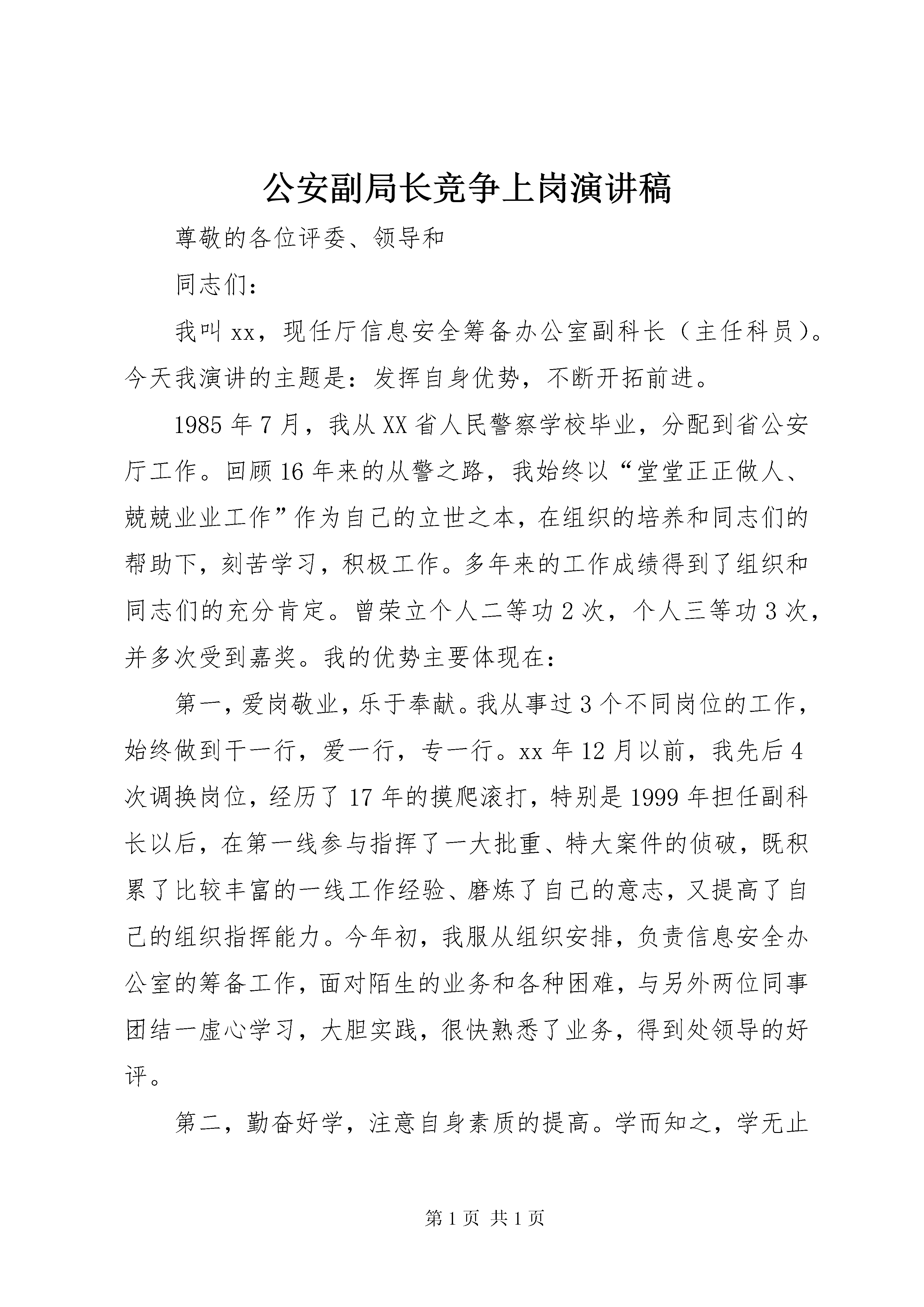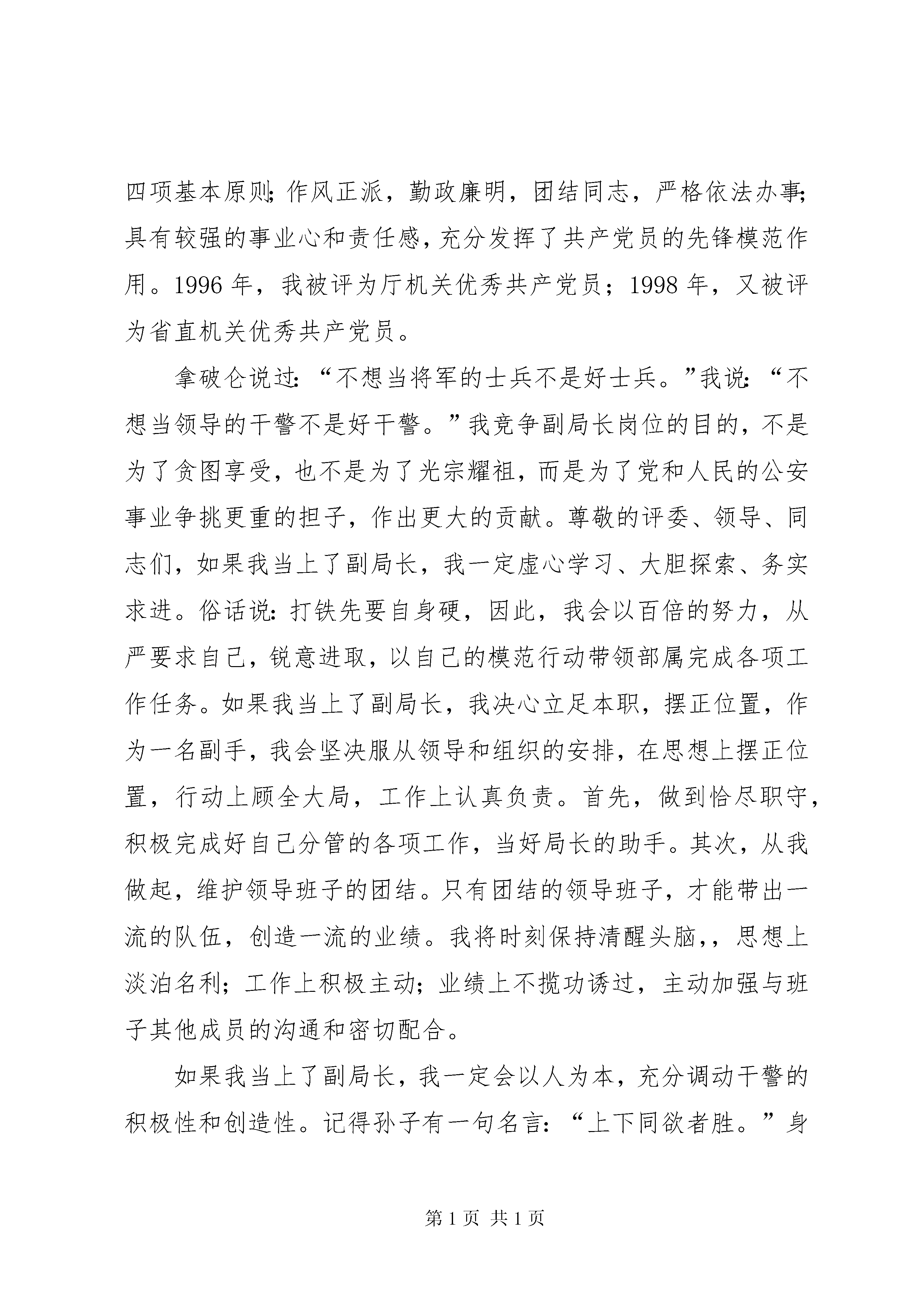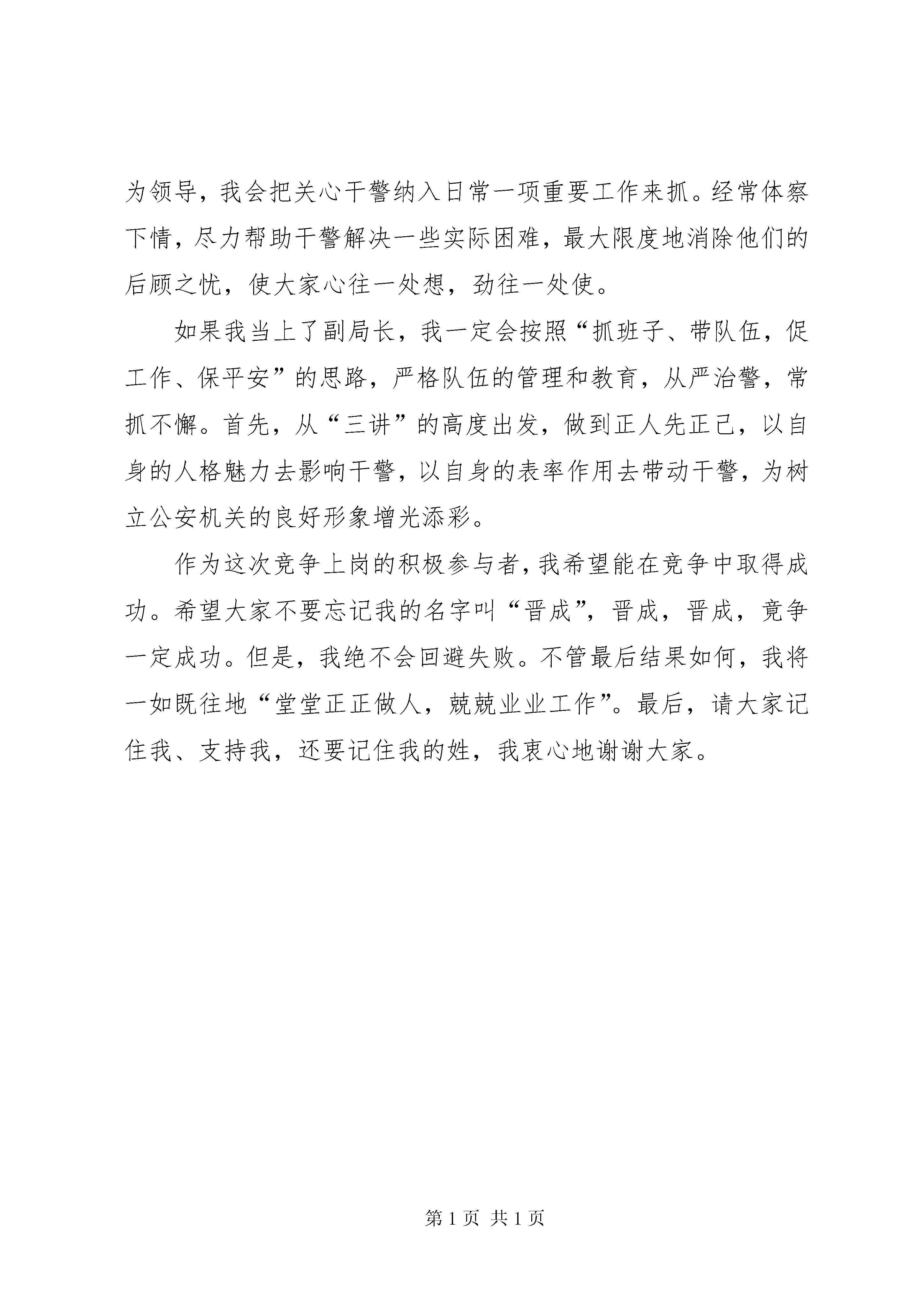 公安副局长竞争上岗演讲稿尊敬的各位评委、领导和同志们:我叫xx,现任厅信息安全筹备办公室副科长(主任科员)。今天我演讲的主题是:发挥自身优势,不断开拓前进。1985年7月,我从XX省人民警察学校毕业,分配到省公安厅工作。回顾16年来的从警之路,我始终以“堂堂正正做人、兢兢业业工作”作为自己的立世之本,在组织的培养和同志们的帮助下,刻苦学习,积极工作。多年来的工作成绩得到了组织和同志们的充分肯定。曾荣立个人二等功2次,个人三等功3次,并多次受到嘉奖。我的优势主要体现在:第一,爱岗敬业,乐于奉献。我从事过3个不同岗位的工作,始终做到干一行,爱一行,专一行。xx年12月以前,我先后4次调换岗位,经历了17年的摸爬滚打,特别是1999年担任副科长以后,在第一线参与指挥了一大批重、特大案件的侦破,既积累了比较丰富的一线工作经验、磨炼了自己的意志,又提高了自己的组织指挥能力。今年初,我服从组织安排,负责信息安全办公室的筹备工作,面对陌生的业务和各种困难,与另外两位同事团结一虚心学习,大胆实践,很快熟悉了业务,得到处领导的好评。第二,勤奋好学,注意自身素质的提高。学而知之,学无止境,在科技迅猛发展、知识更新频繁的今天,身为才能把握公安工作的新情况、新问题,在工作中赢得主动权。10多年来,我始终在繁忙的工作之余,坚持学习,锻炼自身本领。1987年,我经过近3年的自学,修完高等教育自学考试政治理论专业的全部课程,取得了该专业的毕业证书;1997年开始,我结合工作实际,又参加公安管理专业本科自学考试课程的学习,到现在为止,以良好的成绩通过了巧门课程的考试。我在注重理论知识学习的同时,并没有放松对本职业务和技术的钻研。1始9年,我在全省有关业务技术比武中获得第一名;1992年,参加全国公安有关业务技术比武,又获得第二名的好成绩。通过自身的不断学习和刻苦钻研、逐渐提高了解决实际问题的能力,大大拓宽了工作思路。第三,勤于思考,善于总结。干工作永远没有最好,但可以力求更好。我深深地认识到,要认识和掌握灵活多变的公安工作的规律性,就必须勤于思考,善于总结。所以,我在平时的工作中十分重视这一点在办案科工作期间,撰写过多篇指导办案实践的文章,其中有3扁彼公女部作为办案经验向全国同行推广。我的工作经验正是在平其中有3篇被公女时不断的思考和总结中得到一步一步的超越。第四,具有良好的思想道德品质。多年来,我始终以共产党员的条件严格要求自己,拥护党的路线、方针、政策,坚持党的四项基本原则;作风正派,勤政廉明,团结同志,严格依法办事;具有较强的事业心和责任感,充分发挥了共产党员的先锋模范作用。1996年,我被评为厅机关优秀共产党员;1998年,又被评为省直机关优秀共产党员。拿破仑说过:“不想当将军的士兵不是好士兵。”我说:“不想当领导的干警不是好干警。”我竞争副局长岗位的目的,不是为了贪图享受,也不是为了光宗耀祖,而是为了党和人民的公安事业争挑更重的担子,作出更大的贡献。尊敬的评委、领导、同志们,如果我当上了副局长,我一定虚心学习、大胆探索、务实求进。俗话说:打铁先要自身硬,因此,我会以百倍的努力,从严要求自己,锐意进取,以自己的模范行动带领部属完成各项工作任务。如果我当上了副局长,我决心立足本职,摆正位置,作为一名副手,我会坚决服从领导和组织的安排,在思想上摆正位置,行动上顾全大局,工作上认真负责。首先,做到恰尽职守,积极完成好自己分管的各项工作,当好局长的助手。其次,从我做起,维护领导班子的团结。只有团结的领导班子,才能带出一流的队伍,创造一流的业绩。我将时刻保持清醒头脑,,思想上淡泊名利;工作上积极主动;业绩上不揽功诱过,主动加强与班子其他成员的沟通和密切配合。如果我当上了副局长,我一定会以人为本,充分调动干警的积极性和创造性。记得孙子有一句名言:“上下同欲者胜。”身为领导,我会把关心干警纳入日常一项重要工作来抓。经常体察下情,尽力帮助干警解决一些实际困难,最大限度地消除他们的后顾之忧,使大家心往一处想,劲往一处使。如果我当上了副局长,我一定会按照“抓班子、带队伍,促工作、保平安”的思路,严格队伍的管理和教育,从严治警,常抓不懈。首先,从“三讲”的高度出发,做到正人先正己,以自身的人格魅力去影响干警,以自身的表率作用去带动干警,为树立公安机关的良好形象增光添彩。作为这次竞争上岗的积极参与者,我希望能在竞争中取得成功。希望大家不要忘记我的名字叫“晋成”,晋成,晋成,竟争一定成功。但是,我绝不会回避失败。不管最后结果如何,我将一如既往地“堂堂正正做人,兢兢业业工作”。最后,请大家记住我、支持我,还要记住我的姓,我衷心地谢谢大家。