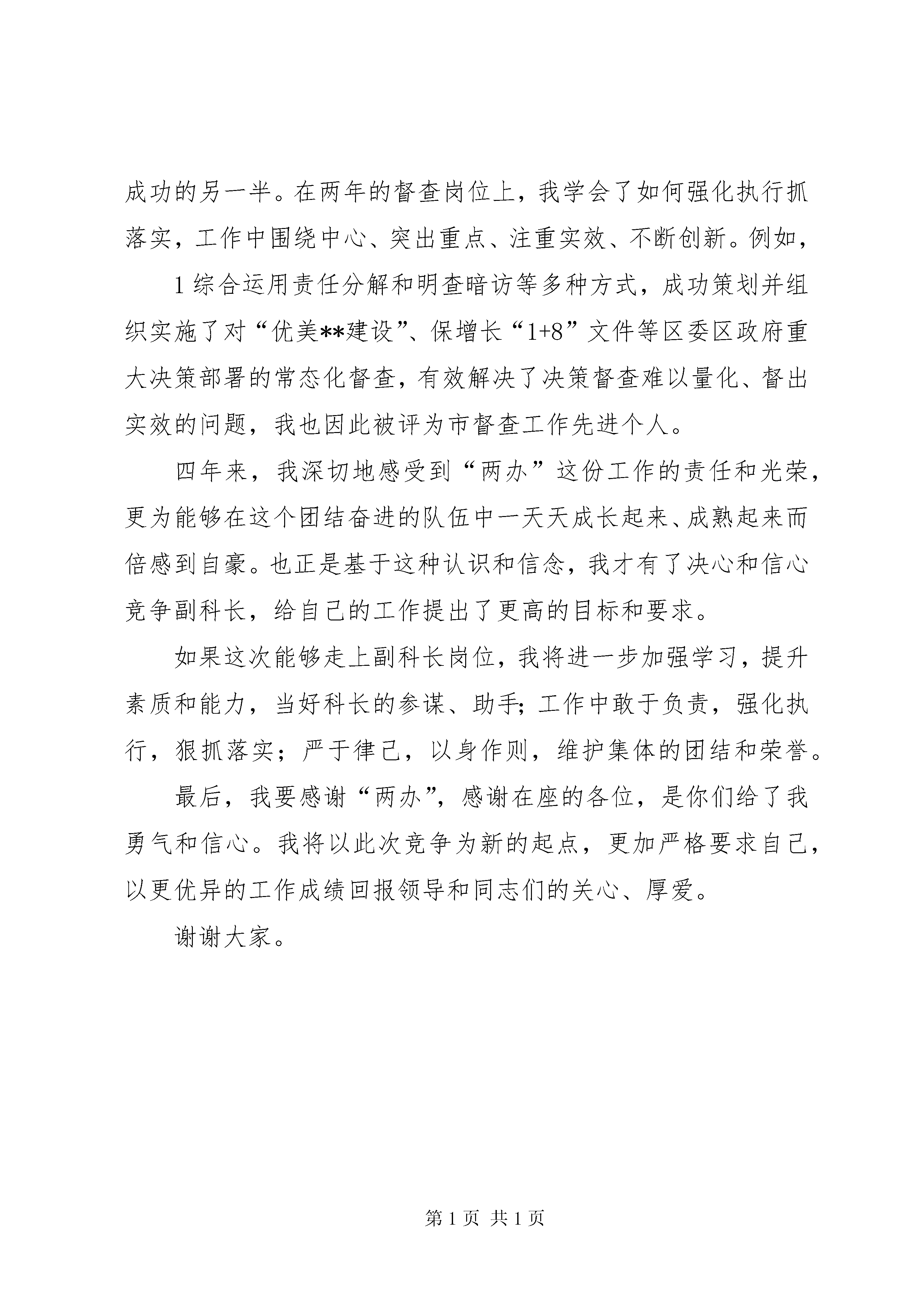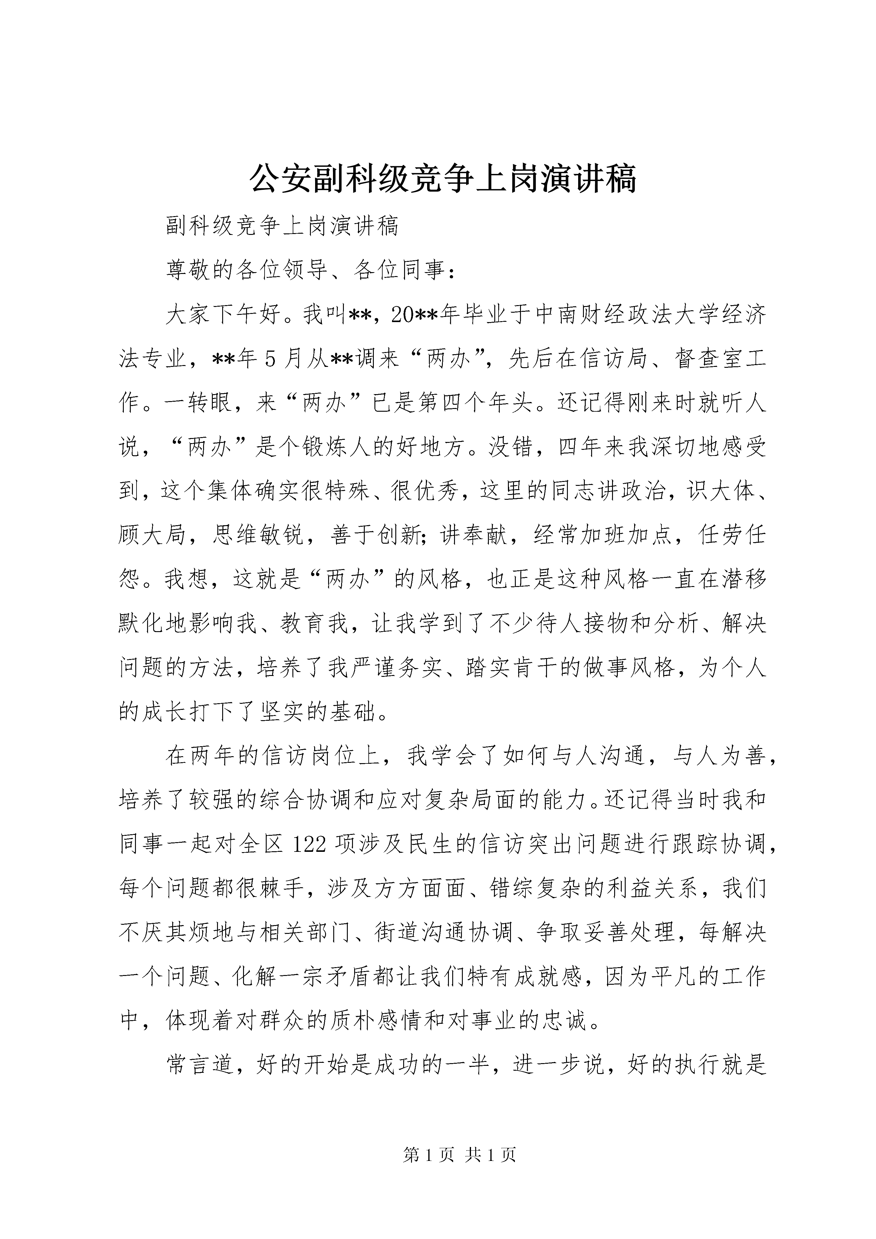 公安副科级竞争上岗演讲稿副科级竞争上岗演讲稿尊敬的各位领导、各位同事:大家下午好。我叫**,20**年毕业于中南财经政法大学经济法专业,**年5月从**调来“两办”,先后在信访局、督查室工作。一转眼,来“两办”已是第四个年头。还记得刚来时就听人说,“两办”是个锻炼人的好地方。没错,四年来我深切地感受到,这个集体确实很特殊、很优秀,这里的同志讲政治,识大体、顾大局,思维敏锐,善于创新;讲奉献,经常加班加点,任劳任怨。我想,这就是“两办”的风格,也正是这种风格一直在潜移默化地影响我、教育我,让我学到了不少待人接物和分析、解决问题的方法,培养了我严谨务实、踏实肯干的做事风格,为个人的成长打下了坚实的基础。在两年的信访岗位上,我学会了如何与人沟通,与人为善,培养了较强的综合协调和应对复杂局面的能力。还记得当时我和同事一起对全区122项涉及民生的信访突出问题进行跟踪协调,每个问题都很棘手,涉及方方面面、错综复杂的利益关系,我们不厌其烦地与相关部门、街道沟通协调、争取妥善处理,每解决一个问题、化解一宗矛盾都让我们特有成就感,因为平凡的工作中,体现着对群众的质朴感情和对事业的忠诚。常言道,好的开始是成功的一半,进一步说,好的执行就是成功的另一半。在两年的督查岗位上,我学会了如何强化执行抓落实,工作中围绕中心、突出重点、注重实效、不断创新。例如,1综合运用责任分解和明查暗访等多种方式,成功策划并组织实施了对“优美**建设”、保增长“1+8”文件等区委区政府重大决策部署的常态化督查,有效解决了决策督查难以量化、督出实效的问题,我也因此被评为市督查工作先进个人。四年来,我深切地感受到“两办”这份工作的责任和光荣,更为能够在这个团结奋进的队伍中一天天成长起来、成熟起来而倍感到自豪。也正是基于这种认识和信念,我才有了决心和信心竞争副科长,给自己的工作提出了更高的目标和要求。如果这次能够走上副科长岗位,我将进一步加强学习,提升素质和能力,当好科长的参谋、助手;工作中敢于负责,强化执行,狠抓落实;严于律己,以身作则,维护集体的团结和荣誉。最后,我要感谢“两办”,感谢在座的各位,是你们给了我勇气和信心。我将以此次竞争为新的起点,更加严格要求自己,以更优异的工作成绩回报领导和同志们的关心、厚爱。谢谢大家。