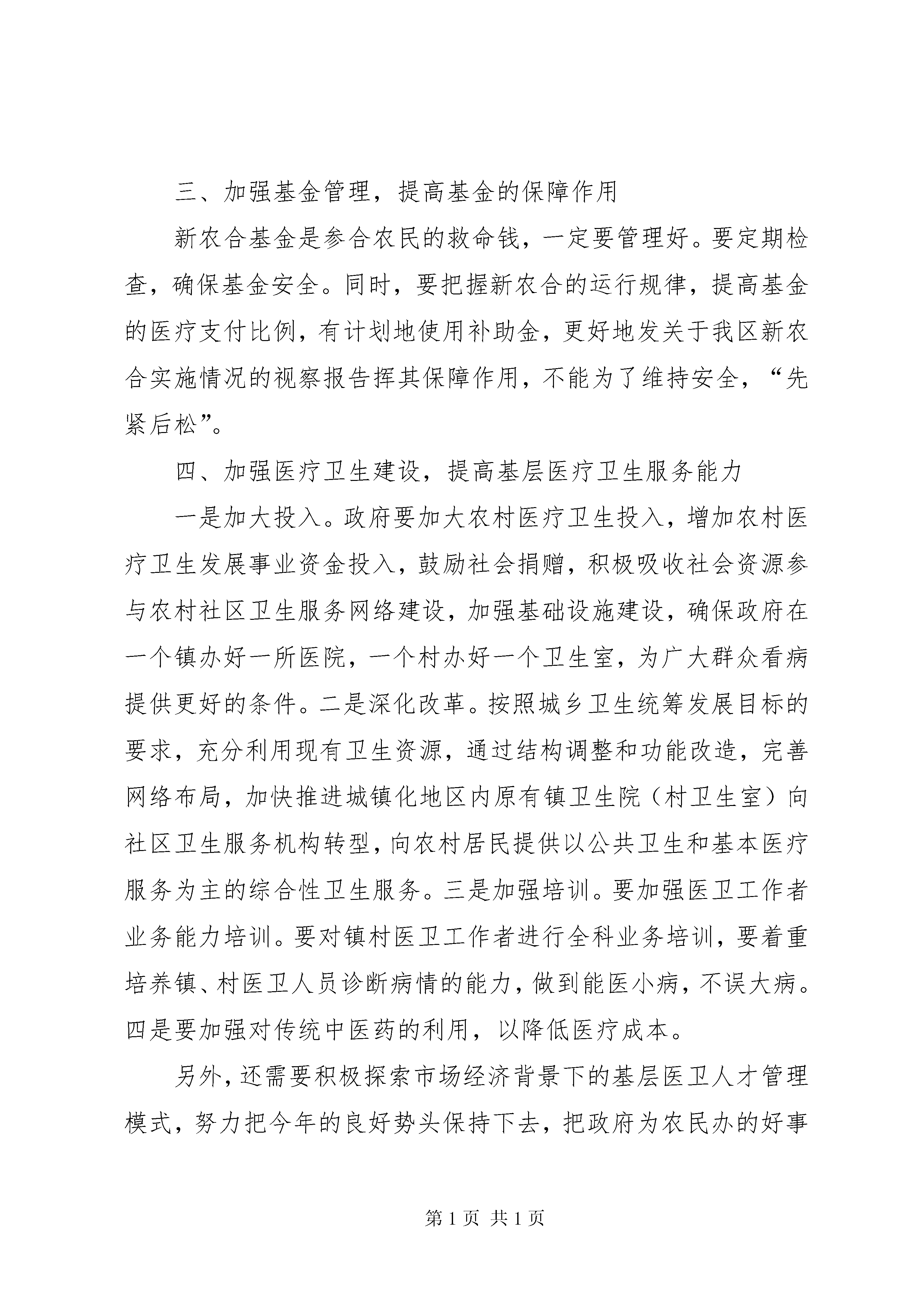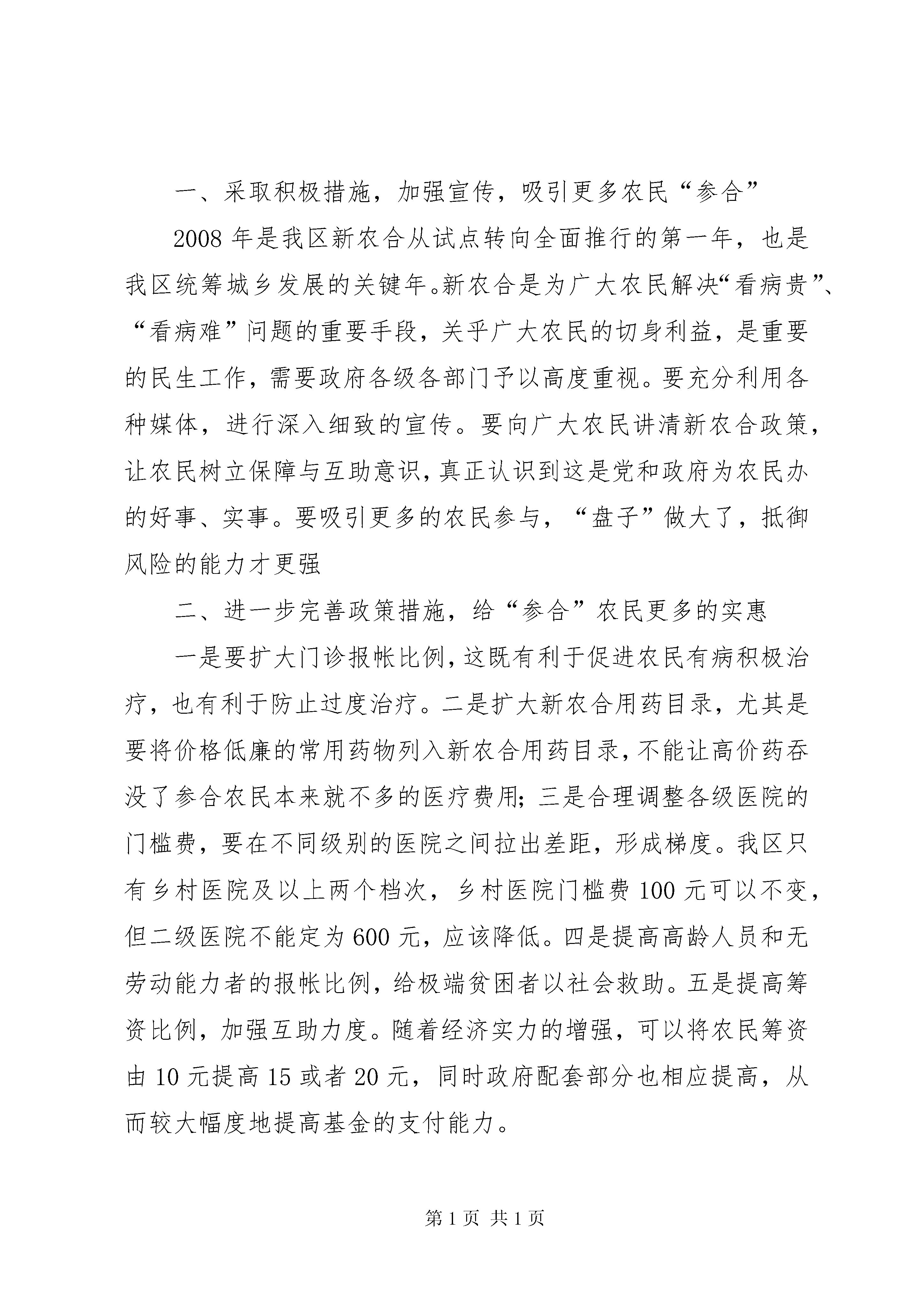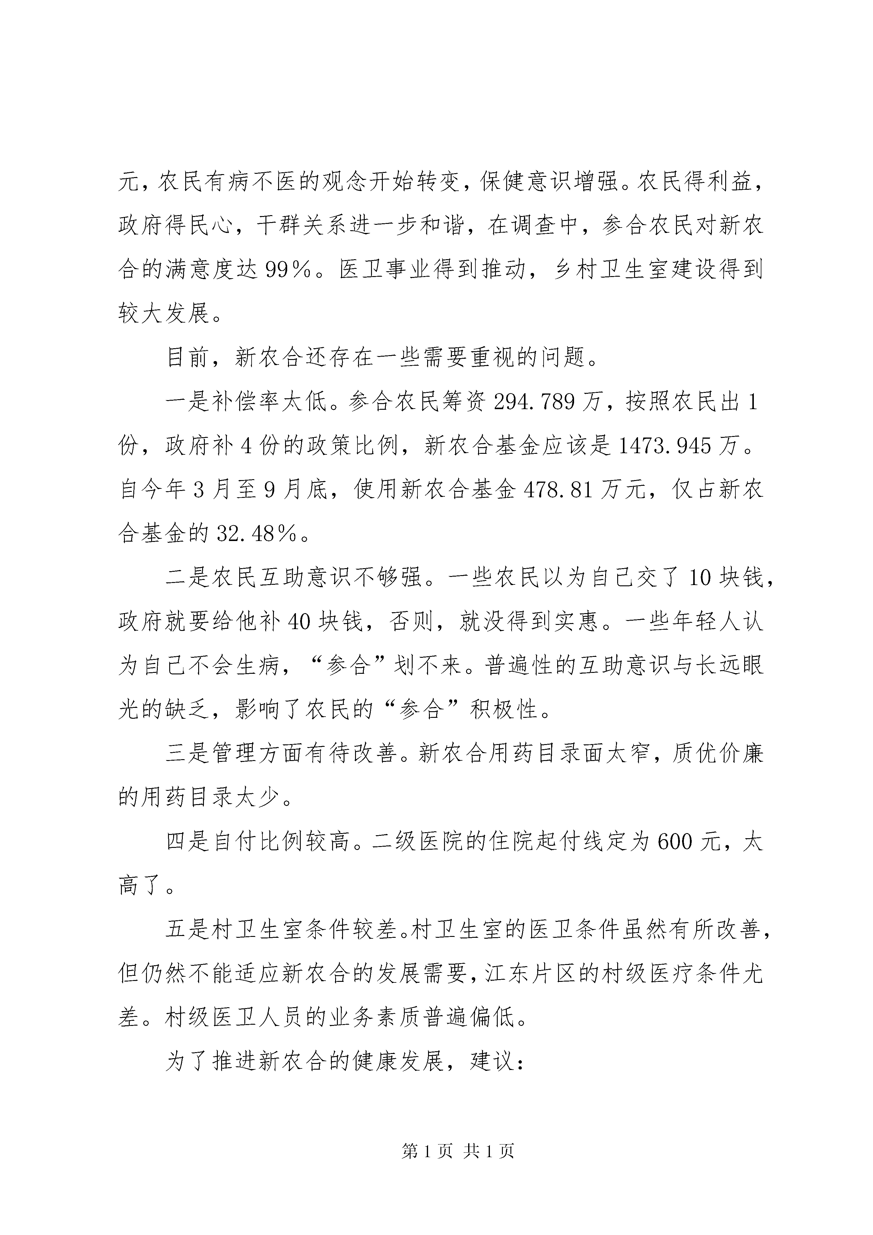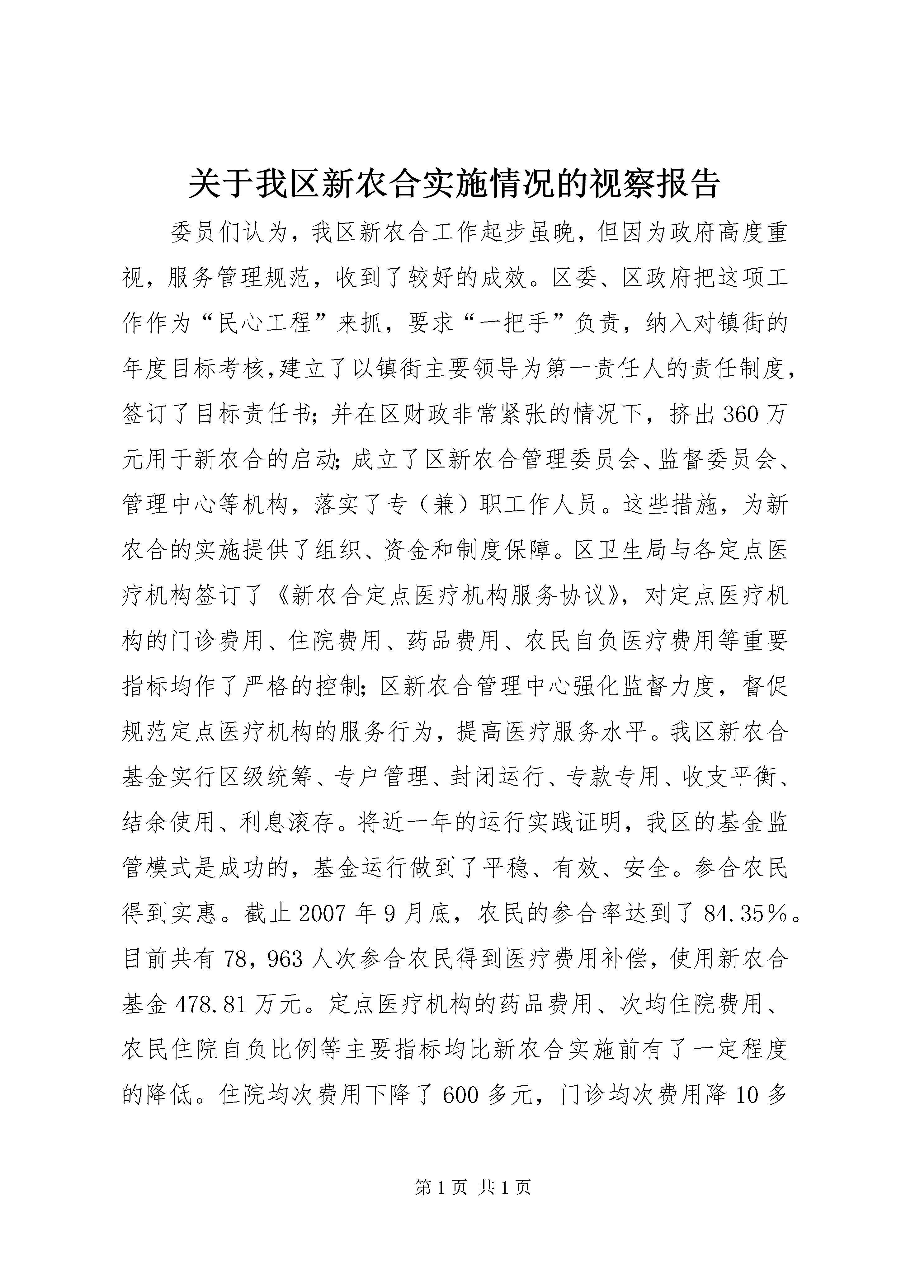 关于我区新农合实施情况的视察报告委员们认为,我区新农合工作起步虽晚,但因为政府高度重视,服务管理规范,收到了较好的成效。区委、区政府把这项工作作为“民心工程”来抓,要求“一把手”负责,纳入对镇街的年度目标考核,建立了以镇街主要领导为第一责任人的责任制度,签订了目标责任书;并在区财政非常紧张的情况下,挤出360万元用于新农合的启动;成立了区新农合管理委员会、监督委员会、管理中心等机构,落实了专(兼)职工作人员。这些措施,为新农合的实施提供了组织、资金和制度保障。区卫生局与各定点医疗机构签订了《新农合定点医疗机构服务协议》,对定点医疗机构的门诊费用、住院费用、药品费用、农民自负医疗费用等重要指标均作了严格的控制;区新农合管理中心强化监督力度,督促规范定点医疗机构的服务行为,提高医疗服务水平。我区新农合基金实行区级统筹、专户管理、封闭运行、专款专用、收支平衡、结余使用、利息滚存。将近一年的运行实践证明,我区的基金监管模式是成功的,基金运行做到了平稳、有效、安全。参合农民得到实惠。截止2007年9月底,农民的参合率达到了84.35%。目前共有78,963人次参合农民得到医疗费用补偿,使用新农合基金478.81万元。定点医疗机构的药品费用、次均住院费用、农民住院自负比例等主要指标均比新农合实施前有了一定程度的降低。住院均次费用下降了600多元,门诊均次费用降10多元,农民有病不医的观念开始转变,保健意识增强。农民得利益,政府得民心,干群关系进一步和谐,在调查中,参合农民对新农合的满意度达99%。医卫事业得到推动,乡村卫生室建设得到较大发展。目前,新农合还存在一些需要重视的问题。一是补偿率太低。参合农民筹资294.789万,按照农民出1份,政府补4份的政策比例,新农合基金应该是1473.945万。自今年3月至9月底,使用新农合基金478.81万元,仅占新农合基金的32.48%。二是农民互助意识不够强。一些农民以为自己交了10块钱,政府就要给他补40块钱,否则,就没得到实惠。一些年轻人认为自己不会生病,“参合”划不来。普遍性的互助意识与长远眼光的缺乏,影响了农民的“参合”积极性。三是管理方面有待改善。新农合用药目录面太窄,质优价廉的用药目录太少。四是自付比例较高。二级医院的住院起付线定为600元,太高了。五是村卫生室条件较差。村卫生室的医卫条件虽然有所改善,但仍然不能适应新农合的发展需要,江东片区的村级医疗条件尤差。村级医卫人员的业务素质普遍偏低。为了推进新农合的健康发展,建议:一、采取积极措施,加强宣传,吸引更多农民“参合”2008年是我区新农合从试点转向全面推行的第一年,也是我区统筹城乡发展的关键年。新农合是为广大农民解决“看病贵”、“看病难”问题的重要手段,关乎广大农民的切身利益,是重要的民生工作,需要政府各级各部门予以高度重视。要充分利用各种媒体,进行深入细致的宣传。要向广大农民讲清新农合政策,让农民树立保障与互助意识,真正认识到这是党和政府为农民办的好事、实事。要吸引更多的农民参与,“盘子”做大了,抵御风险的能力才更强二、进一步完善政策措施,给“参合”农民更多的实惠一是要扩大门诊报帐比例,这既有利于促进农民有病积极治疗,也有利于防止过度治疗。二是扩大新农合用药目录,尤其是要将价格低廉的常用药物列入新农合用药目录,不能让高价药吞没了参合农民本来就不多的医疗费用;三是合理调整各级医院的门槛费,要在不同级别的医院之间拉出差距,形成梯度。我区只有乡村医院及以上两个档次,乡村医院门槛费100元可以不变,但二级医院不能定为600元,应该降低。四是提高高龄人员和无劳动能力者的报帐比例,给极端贫困者以社会救助。五是提高筹资比例,加强互助力度。随着经济实力的增强,可以将农民筹资由10元提高15或者20元,同时政府配套部分也相应提高,从而较大幅度地提高基金的支付能力。三、加强基金管理,提高基金的保障作用新农合基金是参合农民的救命钱,一定要管理好。要定期检查,确保基金安全。同时,要把握新农合的运行规律,提高基金的医疗支付比例,有计划地使用补助金,更好地发关于我区新农合实施情况的视察报告挥其保障作用,不能为了维持安全,“先紧后松”。四、加强医疗卫生建设,提高基层医疗卫生服务能力一是加大投入。政府要加大农村医疗卫生投入,增加农村医疗卫生发展事业资金投入,鼓励社会捐赠,积极吸收社会资源参与农村社区卫生服务网络建设,加强基础设施建设,确保政府在一个镇办好一所医院,一个村办好一个卫生室,为广大群众看病提供更好的条件。二是深化改革。按照城乡卫生统筹发展目标的要求,充分利用现有卫生资源,通过结构调整和功能改造,完善网络布局,加快推进城镇化地区内原有镇卫生院(村卫生室)向社区卫生服务机构转型,向农村居民提供以公共卫生和基本医疗服务为主的综合性