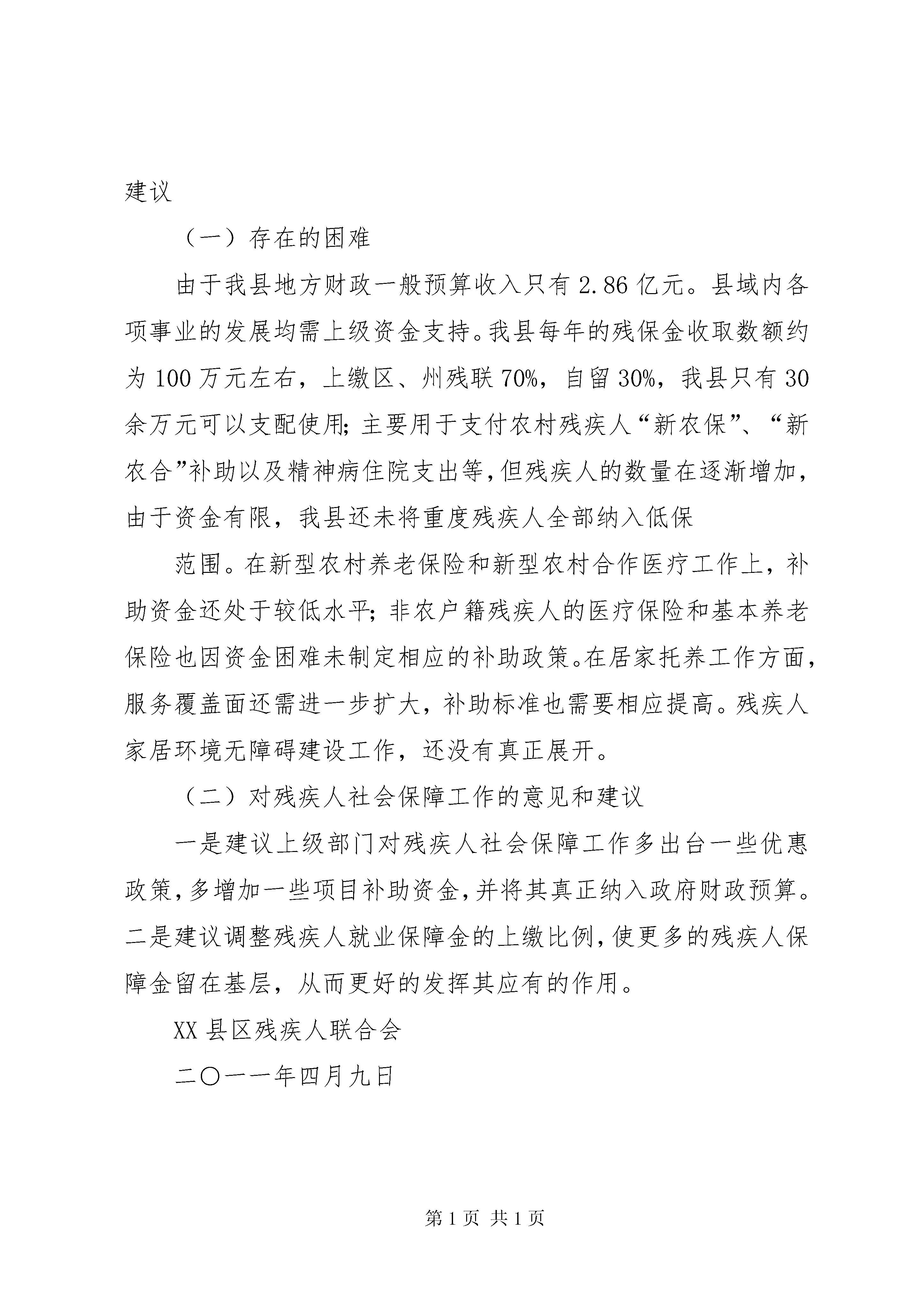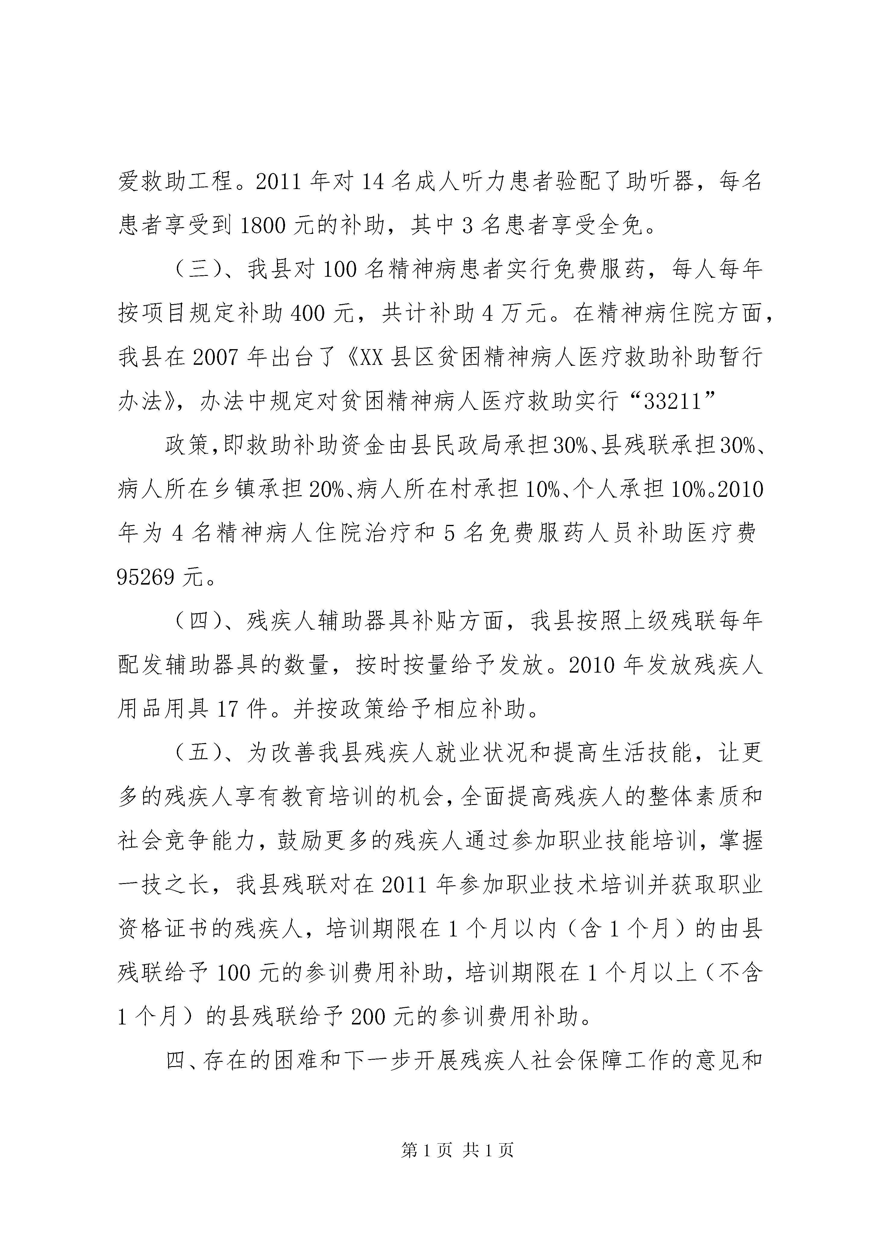 关于我区社会保障工作情况的调研报告XX县区残疾人社会保障基本情况调研报告XX县区位于新疆维吾尔自治区XX市境内,天山北坡经济带中部,总面积9721平方公里;县辖六镇一乡;总人口21.76万人,其中地方人口13.92万人,驻县团场人口7.84万人。2010年实现地区生产总值80.7亿元,地方财政一般预算收入2.86亿元。XX县区共有各类残疾人8806人,占全县地方总人口的6.33%。持有残疾人证的残疾人有2124人。按照残疾类别划分:视力残疾234人、听力残疾129人、言语残疾20人、肢体残疾1118人、智力残疾297人、精神残疾219人、多重残疾102人。按照等级划分:一级残疾421人、二级残疾457人、三级残疾670人、四级残疾571人。一、残疾人最低生活保障对家庭人均收入低于低保标准的残疾人,由县民政局全部纳入了低保范围,给予最低生活保障。二、残疾人社会保险(一)、XX县区2010年被国家列入首批新型农村养老保险试点县。按照《国务院关于开展农村社会养老保险试点的指导意见》和自治区“新农保方案”要求,我县对一、二级残疾人参加“新农保”个人缴费由县残联给予100元补贴,对三、四级残疾人参加“新农保”个人缴费由县残联给予50元补贴。2010年为符合条件的874名农村残疾人购买“新农保”,补助资1金68050元。(二)、我县对农村残疾人参加新型农村合作医疗实行每人30元的补助。2010年对611名残疾人进行全额补助,补助资金18330元。2011年对797名残疾人进行全额补助,补助资金23910元。三、残疾人社会福利(一)、为加快推进智力、精神和重度残疾人托养服务工作,使残疾人托养服务工作能够有效的开展和实施,XX县区按照上级残联任务分配,有组织有计划的为智力、精神和重度困难残疾人提供居家生活服务,2010年完成40名智力、精神和重度残疾人托养服务工作,其中:城镇10人、农村30人,补助标准为:城镇2000元/年〃人,农村1000元/年〃人。共为托养对象支付资金5万元。2011年确定完成居家托养对象75人,其中:城镇10人、农牧区65人,补助标准为:城镇1500元/年〃人,农村1000元/年〃人。今年将为托养对象支付资金8万元。(二)、对听力患者验配助听器给予不同程度的补助,2010年对23名成人听力患者配戴了助听器,有5名听力患者享受关爱救助工程。2011年对14名成人听力患者验配了助听器,每名患者享受到1800元的补助,其中3名患者享受全免。(三)、我县对100名精神病患者实行免费服药,每人每年按项目规定补助400元,共计补助4万元。在精神病住院方面,我县在2007年出台了《XX县区贫困精神病人医疗救助补助暂行办法》,办法中规定对贫困精神病人医疗救助实行“33211”政策,即救助补助资金由县民政局承担30%、县残联承担30%、病人所在乡镇承担20%、病人所在村承担10%、个人承担10%。2010年为4名精神病人住院治疗和5名免费服药人员补助医疗费95269元。(四)、残疾人辅助器具补贴方面,我县按照上级残联每年配发辅助器具的数量,按时按量给予发放。2010年发放残疾人用品用具17件。并按政策给予相应补助。(五)、为改善我县残疾人就业状况和提高生活技能,让更多的残疾人享有教育培训的机会,全面提高残疾人的整体素质和社会竞争能力,鼓励更多的残疾人通过参加职业技能培训,掌握一技之长,我县残联对在2011年参加职业技术培训并获取职业资格证书的残疾人,培训期限在1个月以内(含1个月)的由县残联给予100元的参训费用补助,培训期限在1个月以上(不含1个月)的县残联给予200元的参训费用补助。四、存在的困难和下一步开展残疾人社会保障工作的意见和建议(一)存在的困难由于我县地方财政一般预算收入只有2.86亿元。县域内各项事业的发展均需上级资金支持。我县每年的残保金收取数额约为100万元左右,上缴区、州残联70%,自留30%,我县只有30余万元可以支配使用;主要用于支付农村残疾人“新农保”、“新农合”补助以及精神病住院支出等,但残疾人的数量在逐渐增加,由于资金有限,我县还未将重度残疾人全部纳入低保范围。在新型农村养老保险和新型农村合作医疗工作上,补助资金还处于较低水平;非农户籍残疾人的医疗保险和基本养老保险也因资金困难未制定相应的补助政策。在居家托养工作方面,服务覆盖面还需进一步扩大,补助标准也需要相应提高。残疾人家居环境无障碍建设工作,还没有真正展开。(二)对残疾人社会保障工作的意见和建议一是建议上级部门对残疾人社会保障工作多出台一些优惠政策,多增加一些项目补助资金,并将其真正纳入政府财政预算。二是建议调整残疾人就业保障金的上缴比例,使更多的残疾人保障金留在基层,从而更好的发挥其应有的作用。XX县区残疾人联合会二○一一