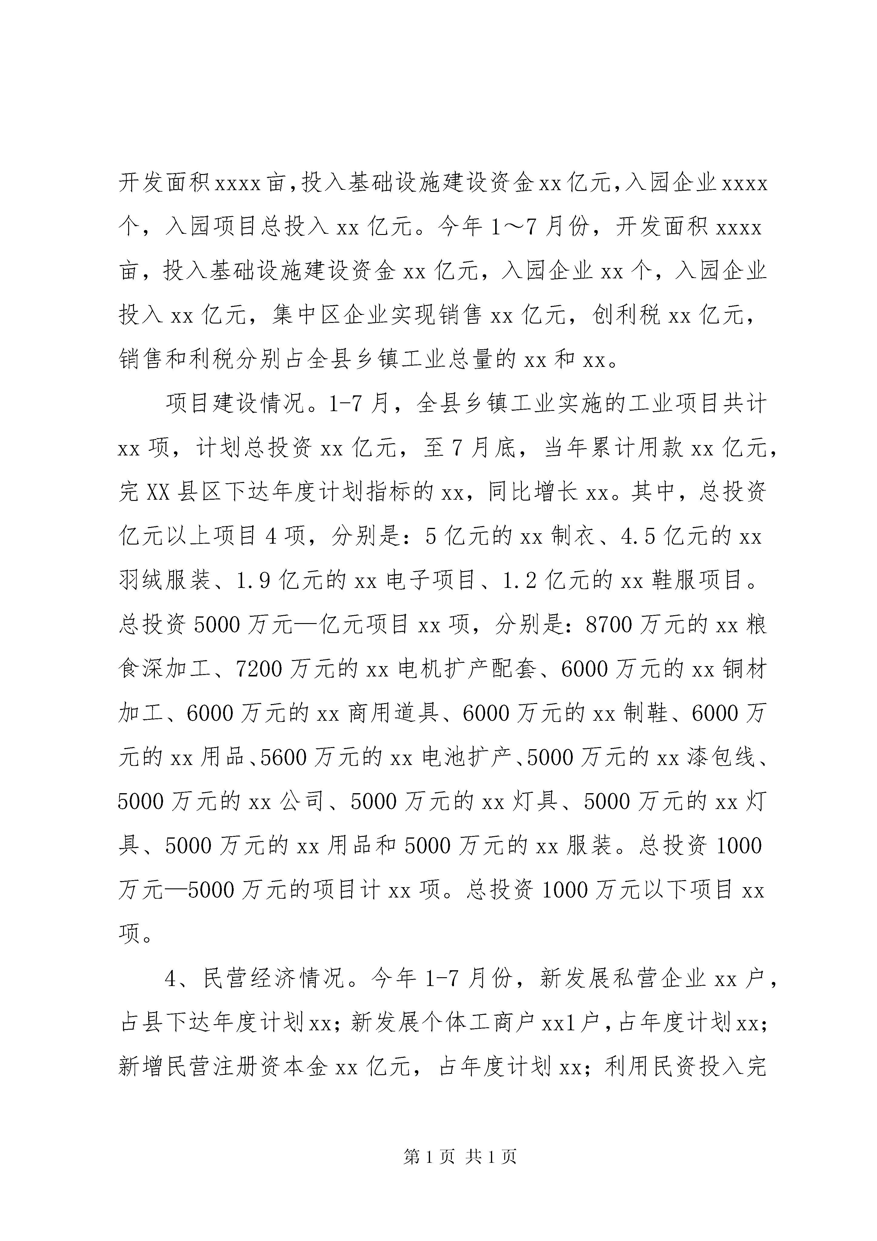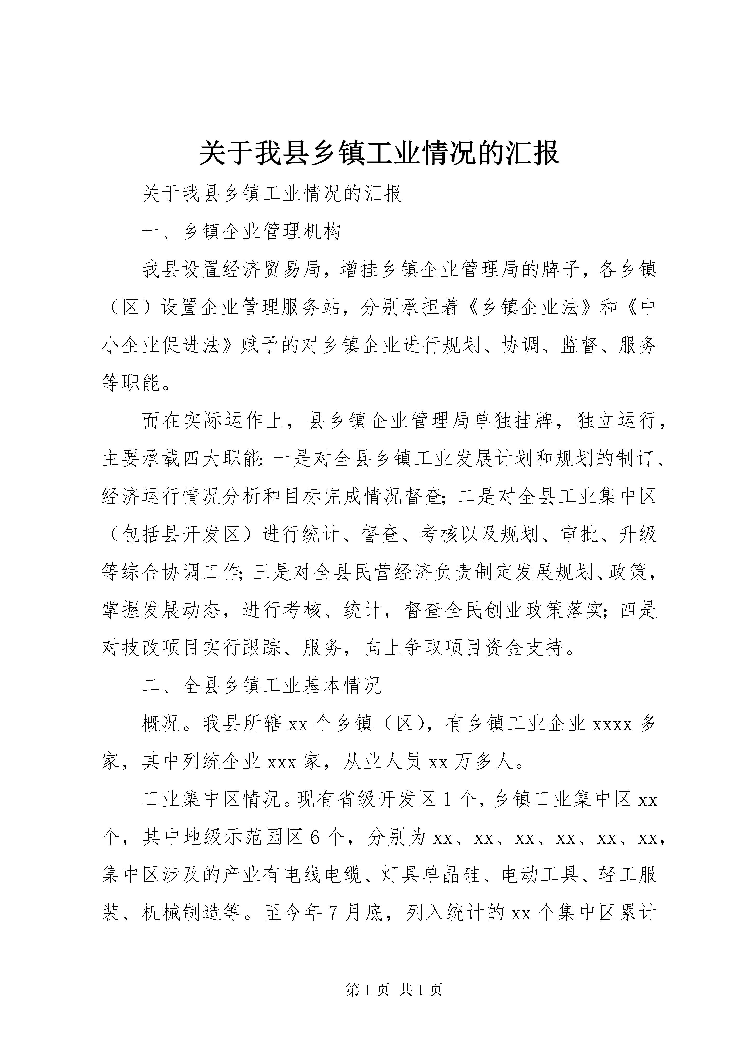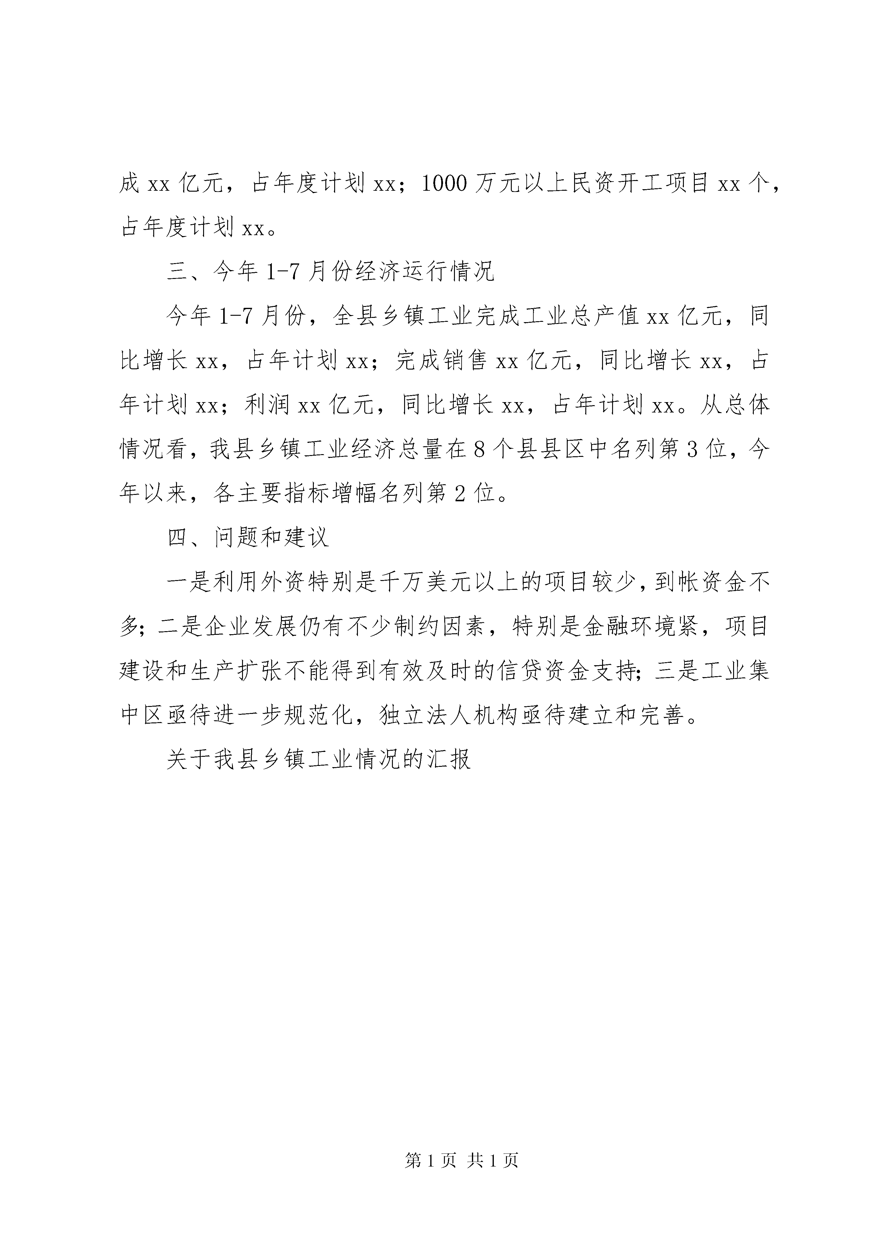 关于我县乡镇工业情况的汇报关于我县乡镇工业情况的汇报一、乡镇企业管理机构我县设置经济贸易局,增挂乡镇企业管理局的牌子,各乡镇(区)设置企业管理服务站,分别承担着《乡镇企业法》和《中小企业促进法》赋予的对乡镇企业进行规划、协调、监督、服务等职能。而在实际运作上,县乡镇企业管理局单独挂牌,独立运行,主要承载四大职能:一是对全县乡镇工业发展计划和规划的制订、经济运行情况分析和目标完成情况督查;二是对全县工业集中区(包括县开发区)进行统计、督查、考核以及规划、审批、升级等综合协调工作;三是对全县民营经济负责制定发展规划、政策,掌握发展动态,进行考核、统计,督查全民创业政策落实;四是对技改项目实行跟踪、服务,向上争取项目资金支持。二、全县乡镇工业基本情况概况。我县所辖xx个乡镇(区),有乡镇工业企业xxxx多家,其中列统企业xxx家,从业人员xx万多人。工业集中区情况。现有省级开发区1个,乡镇工业集中区xx个,其中地级示范园区6个,分别为xx、xx、xx、xx、xx、xx,集中区涉及的产业有电线电缆、灯具单晶硅、电动工具、轻工服装、机械制造等。至今年7月底,列入统计的xx个集中区累计开发面积xxxx亩,投入基础设施建设资金xx亿元,入园企业xxxx个,入园项目总投入xx亿元。今年1~7月份,开发面积xxxx亩,投入基础设施建设资金xx亿元,入园企业xx个,入园企业投入xx亿元,集中区企业实现销售xx亿元,创利税xx亿元,销售和利税分别占全县乡镇工业总量的xx和xx。项目建设情况。1-7月,全县乡镇工业实施的工业项目共计xx项,计划总投资xx亿元,至7月底,当年累计用款xx亿元,完XX县区下达年度计划指标的xx,同比增长xx。其中,总投资亿元以上项目4项,分别是:5亿元的xx制衣、4.5亿元的xx羽绒服装、1.9亿元的xx电子项目、1.2亿元的xx鞋服项目。总投资5000万元—亿元项目xx项,分别是:8700万元的xx粮食深加工、7200万元的xx电机扩产配套、6000万元的xx铜材加工、6000万元的xx商用道具、6000万元的xx制鞋、6000万元的xx用品、5600万元的xx电池扩产、5000万元的xx漆包线、5000万元的xx公司、5000万元的xx灯具、5000万元的xx灯具、5000万元的xx用品和5000万元的xx服装。总投资1000万元—5000万元的项目计xx项。总投资1000万元以下项目xx项。4、民营经济情况。今年1-7月份,新发展私营企业xx户,占县下达年度计划xx;新发展个体工商户xx1户,占年度计划xx;新增民营注册资本金xx亿元,占年度计划xx;利用民资投入完成xx亿元,占年度计划xx;1000万元以上民资开工项目xx个,占年度计划xx。三、今年1-7月份经济运行情况今年1-7月份,全县乡镇工业完成工业总产值xx亿元,同比增长xx,占年计划xx;完成销售xx亿元,同比增长xx,占年计划xx;利润xx亿元,同比增长xx,占年计划xx。从总体情况看,我县乡镇工业经济总量在8个县县区中名列第3位,今年以来,各主要指标增幅名列第2位。四、问题和建议一是利用外资特别是千万美元以上的项目较少,到帐资金不多;二是企业发展仍有不少制约因素,特别是金融环境紧,项目建设和生产扩张不能得到有效及时的信贷资金支持;三是工业集中区亟待进一步规范化,独立法人机构亟待建立和完善。关于我县乡镇工业情况的汇报