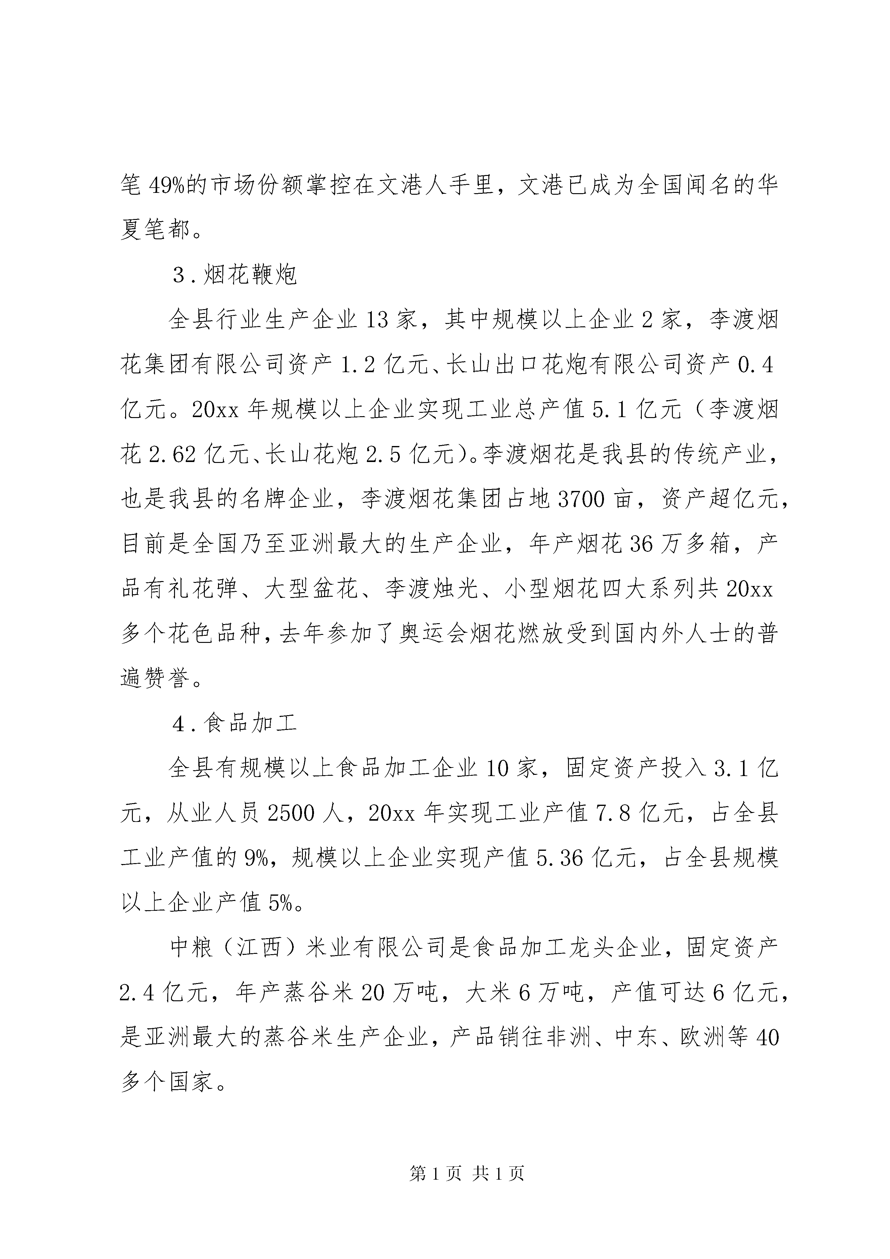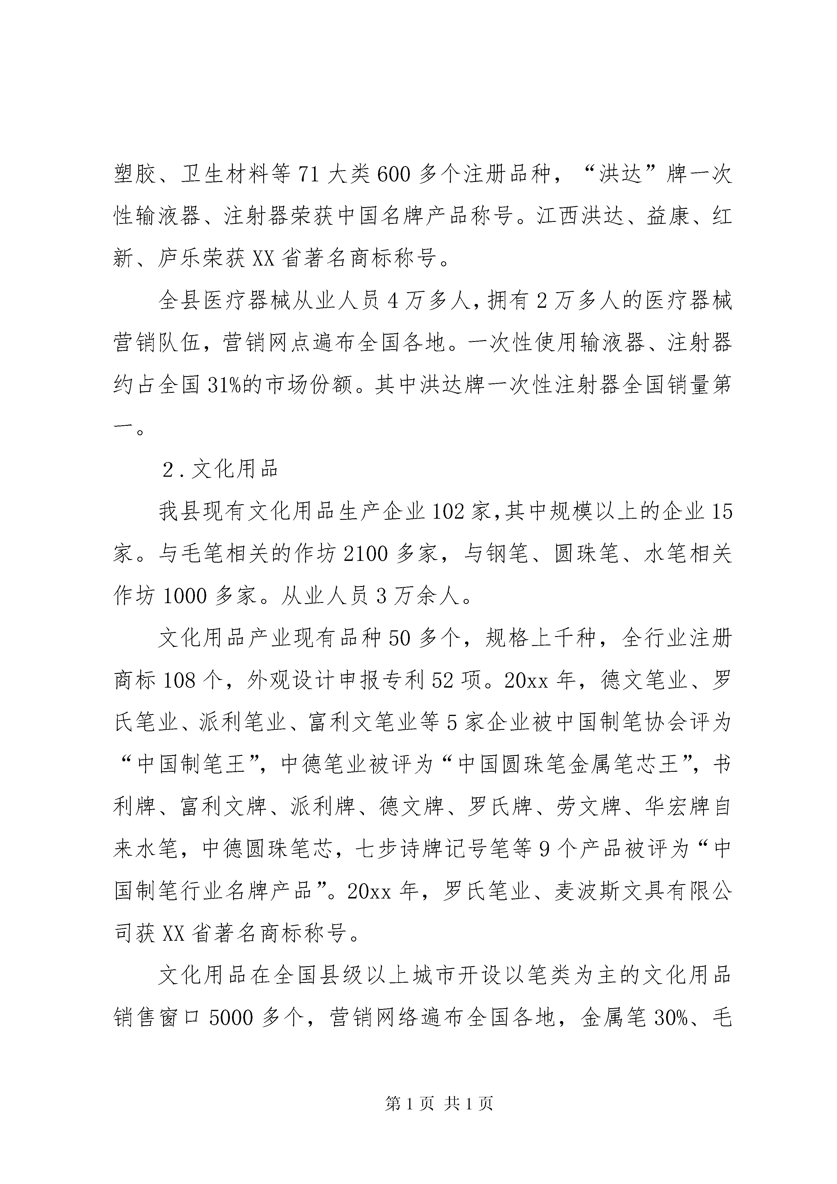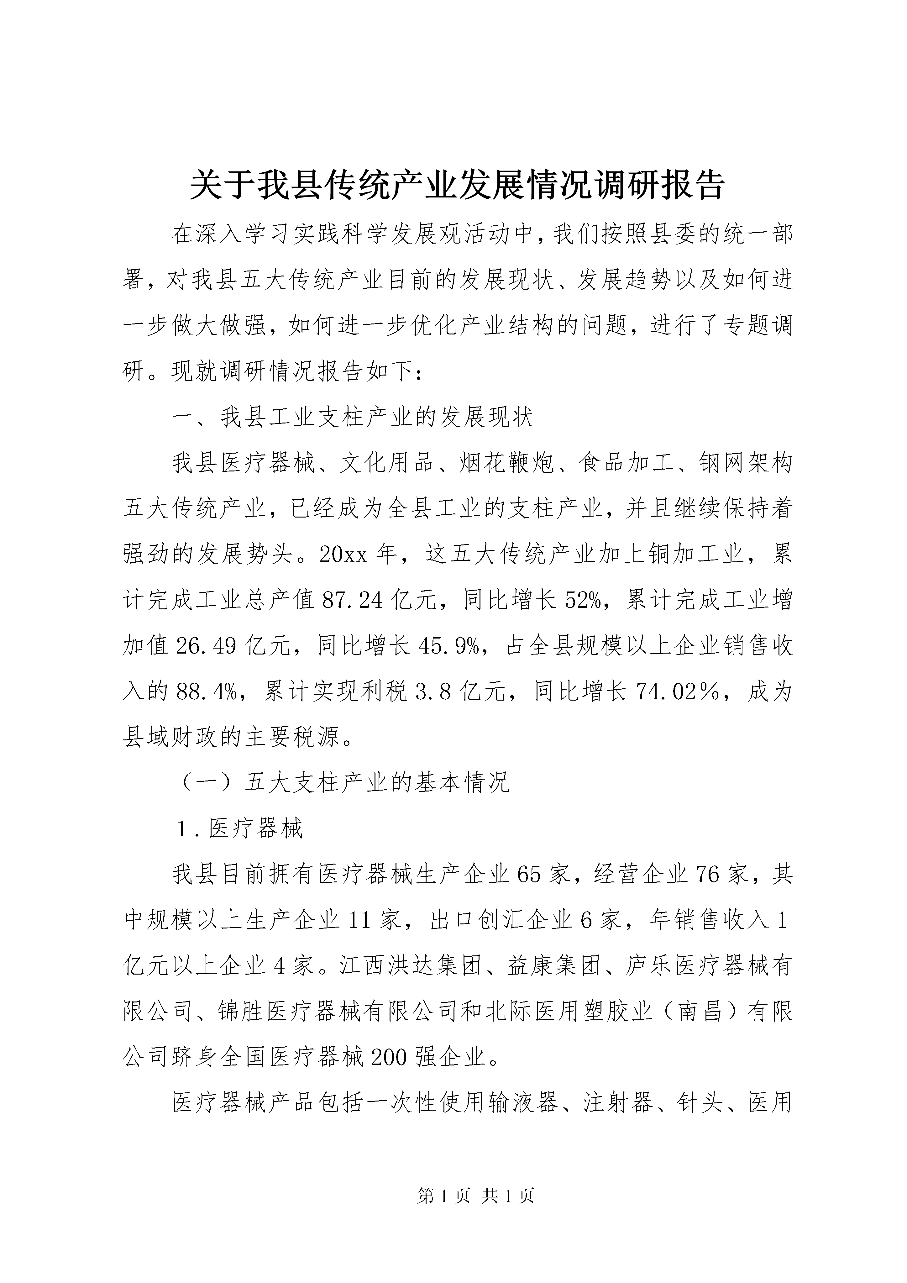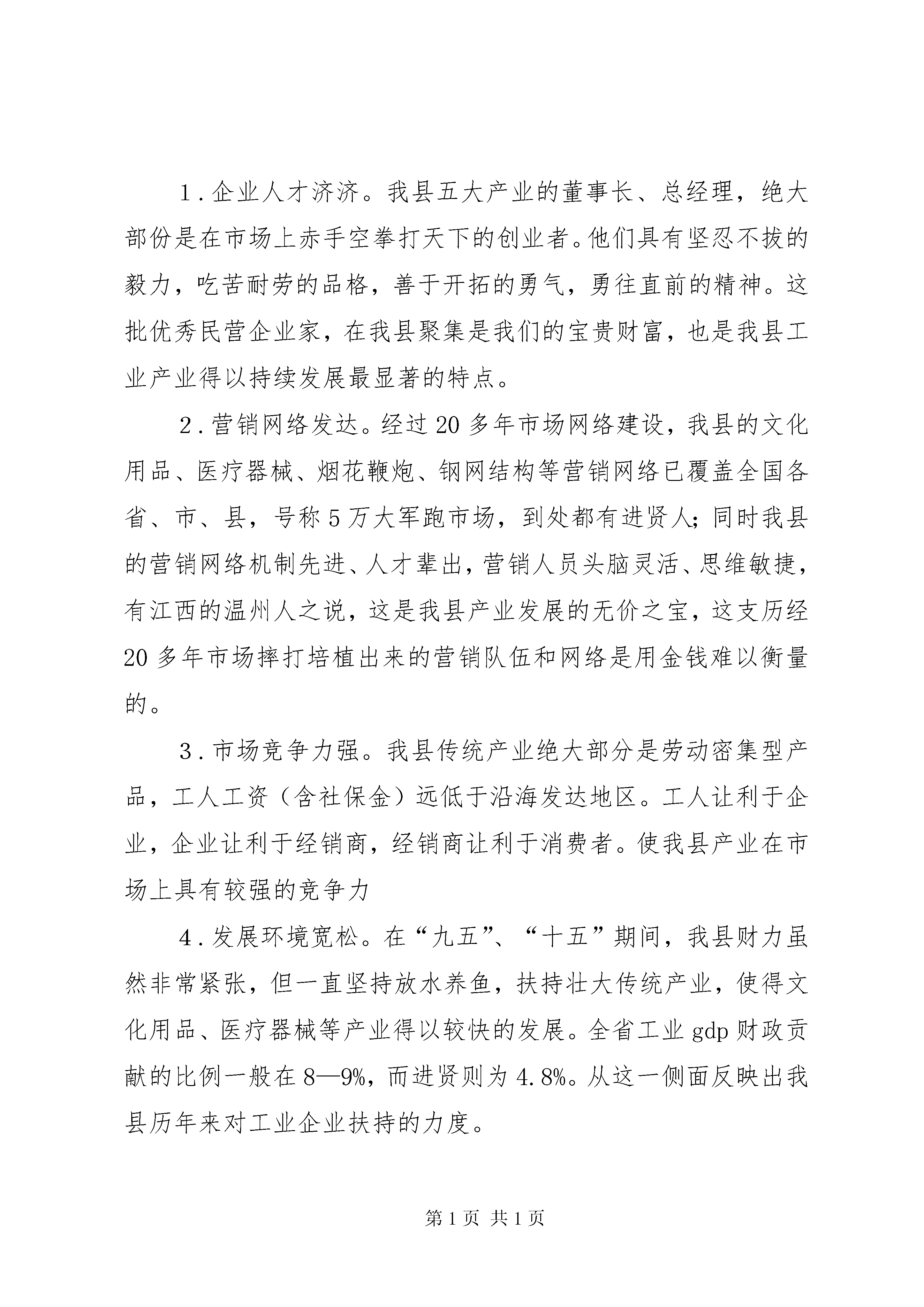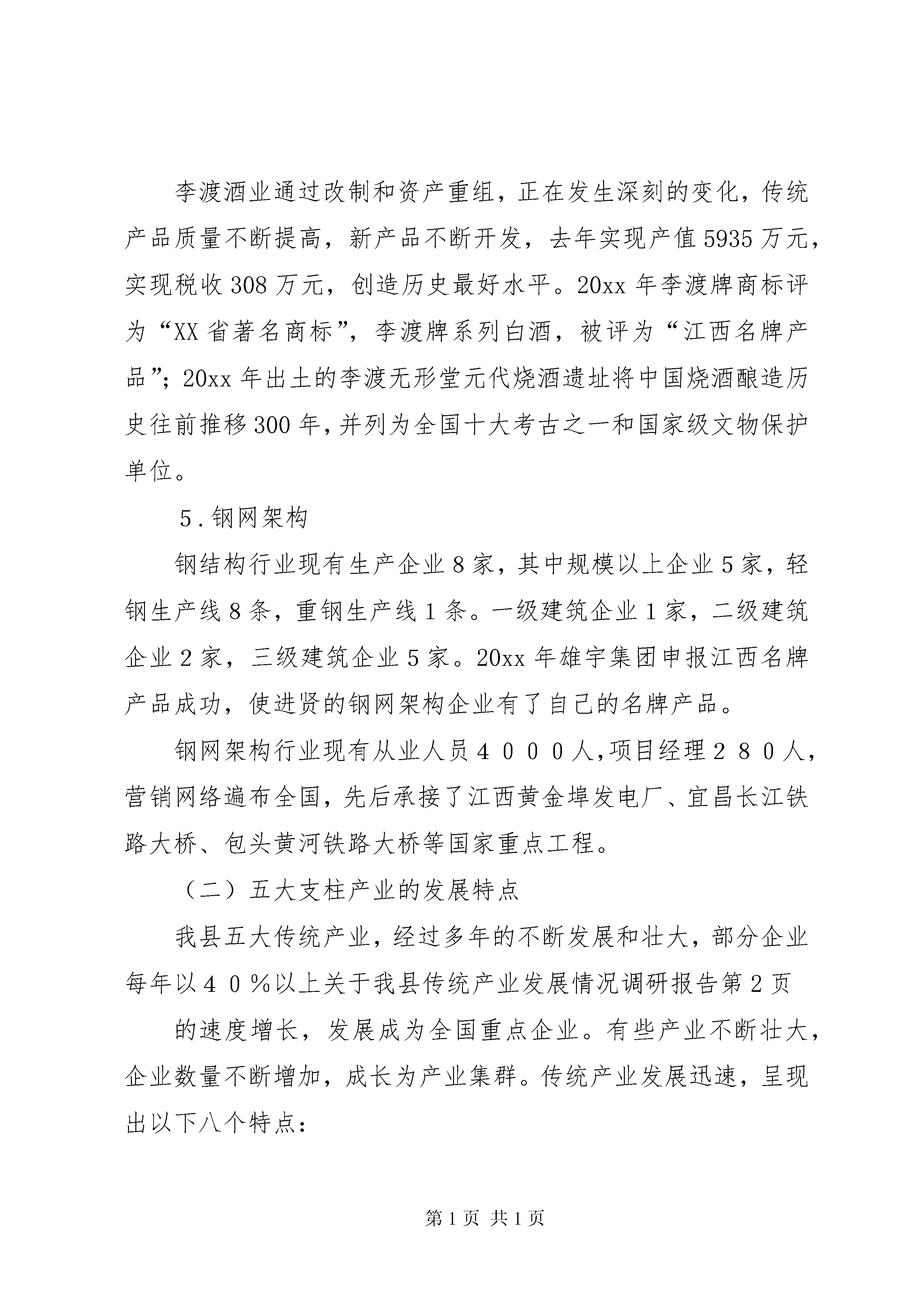 关于我县传统产业发展情况调研报告在深入学习实践科学发展观活动中,我们按照县委的统一部署,对我县五大传统产业目前的发展现状、发展趋势以及如何进一步做大做强,如何进一步优化产业结构的问题,进行了专题调研。现就调研情况报告如下:一、我县工业支柱产业的发展现状我县医疗器械、文化用品、烟花鞭炮、食品加工、钢网架构五大传统产业,已经成为全县工业的支柱产业,并且继续保持着强劲的发展势头。20xx年,这五大传统产业加上铜加工业,累计完成工业总产值87.24亿元,同比增长52%,累计完成工业增加值26.49亿元,同比增长45.9%,占全县规模以上企业销售收入的88.4%,累计实现利税3.8亿元,同比增长74.02%,成为县域财政的主要税源。(一)五大支柱产业的基本情况1.医疗器械我县目前拥有医疗器械生产企业65家,经营企业76家,其中规模以上生产企业11家,出口创汇企业6家,年销售收入1亿元以上企业4家。江西洪达集团、益康集团、庐乐医疗器械有限公司、锦胜医疗器械有限公司和北际医用塑胶业(南昌)有限公司跻身全国医疗器械200强企业。医疗器械产品包括一次性使用输液器、注射器、针头、医用塑胶、卫生材料等71大类600多个注册品种,“洪达”牌一次性输液器、注射器荣获中国名牌产品称号。江西洪达、益康、红新、庐乐荣获XX省著名商标称号。全县医疗器械从业人员4万多人,拥有2万多人的医疗器械营销队伍,营销网点遍布全国各地。一次性使用输液器、注射器约占全国31%的市场份额。其中洪达牌一次性注射器全国销量第一。2.文化用品我县现有文化用品生产企业102家,其中规模以上的企业15家。与毛笔相关的作坊2100多家,与钢笔、圆珠笔、水笔相关作坊1000多家。从业人员3万余人。文化用品产业现有品种50多个,规格上千种,全行业注册商标108个,外观设计申报专利52项。20xx年,德文笔业、罗氏笔业、派利笔业、富利文笔业等5家企业被中国制笔协会评为“中国制笔王”,中德笔业被评为“中国圆珠笔金属笔芯王”,书利牌、富利文牌、派利牌、德文牌、罗氏牌、劳文牌、华宏牌自来水笔,中德圆珠笔芯,七步诗牌记号笔等9个产品被评为“中国制笔行业名牌产品”。20xx年,罗氏笔业、麦波斯文具有限公司获XX省著名商标称号。文化用品在全国县级以上城市开设以笔类为主的文化用品销售窗口5000多个,营销网络遍布全国各地,金属笔30%、毛笔49%的市场份额掌控在文港人手里,文港已成为全国闻名的华夏笔都。3.烟花鞭炮全县行业生产企业13家,其中规模以上企业2家,李渡烟花集团有限公司资产1.2亿元、长山出口花炮有限公司资产0.4亿元。20xx年规模以上企业实现工业总产值5.1亿元(李渡烟花2.62亿元、长山花炮2.5亿元)。李渡烟花是我县的传统产业,也是我县的名牌企业,李渡烟花集团占地3700亩,资产超亿元,目前是全国乃至亚洲最大的生产企业,年产烟花36万多箱,产品有礼花弹、大型盆花、李渡烛光、小型烟花四大系列共20xx多个花色品种,去年参加了奥运会烟花燃放受到国内外人士的普遍赞誉。4.食品加工全县有规模以上食品加工企业10家,固定资产投入3.1亿元,从业人员2500人,20xx年实现工业产值7.8亿元,占全县工业产值的9%,规模以上企业实现产值5.36亿元,占全县规模以上企业产值5%。中粮(江西)米业有限公司是食品加工龙头企业,固定资产2.4亿元,年产蒸谷米20万吨,大米6万吨,产值可达6亿元,是亚洲最大的蒸谷米生产企业,产品销往非洲、中东、欧洲等40多个国家。李渡酒业通过改制和资产重组,正在发生深刻的变化,传统产品质量不断提高,新产品不断开发,去年实现产值5935万元,实现税收308万元,创造历史最好水平。20xx年李渡牌商标评为“XX省著名商标”,李渡牌系列白酒,被评为“江西名牌产品”;20xx年出土的李渡无形堂元代烧酒遗址将中国烧酒酿造历史往前推移300年,并列为全国十大考古之一和国家级文物保护单位。5.钢网架构钢结构行业现有生产企业8家,其中规模以上企业5家,轻钢生产线8条,重钢生产线1条。一级建筑企业1家,二级建筑企业2家,三级建筑企业5家。20xx年雄宇集团申报江西名牌产品成功,使进贤的钢网架构企业有了自己的名牌产品。钢网架构行业现有从业人员4000人,项目经理280人,营销网络遍布全国,先后承接了江西黄金埠发电厂、宜昌长江铁路大桥、包头黄河铁路大桥等国家重点工程。(二)五大支柱产业的发展特点我县五大传统产业,经过多年的不断发展和壮大,部分企业每年以40%以上关于我县传统产业发展情况调研报告的速度增长,发展成为全国重点企业。有些产业不断壮大,企业数量不断增加,成长为产业集群。传统产业发展迅速,呈现出以下八个特点:1.企业人才济济。我县五大产业的董事长、总经理,绝大部份