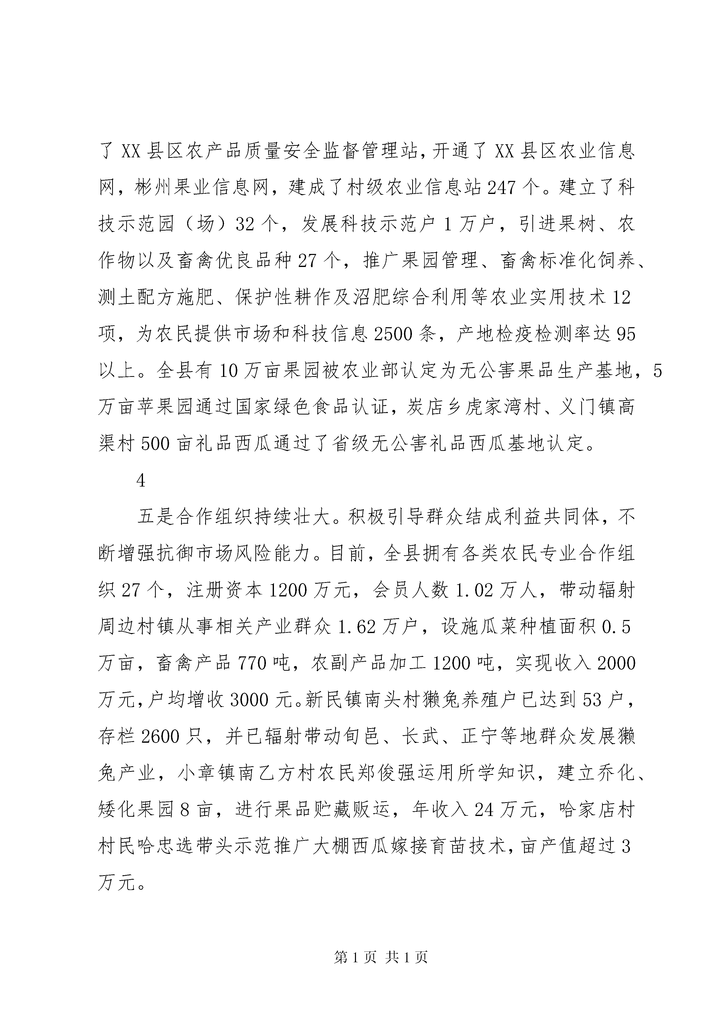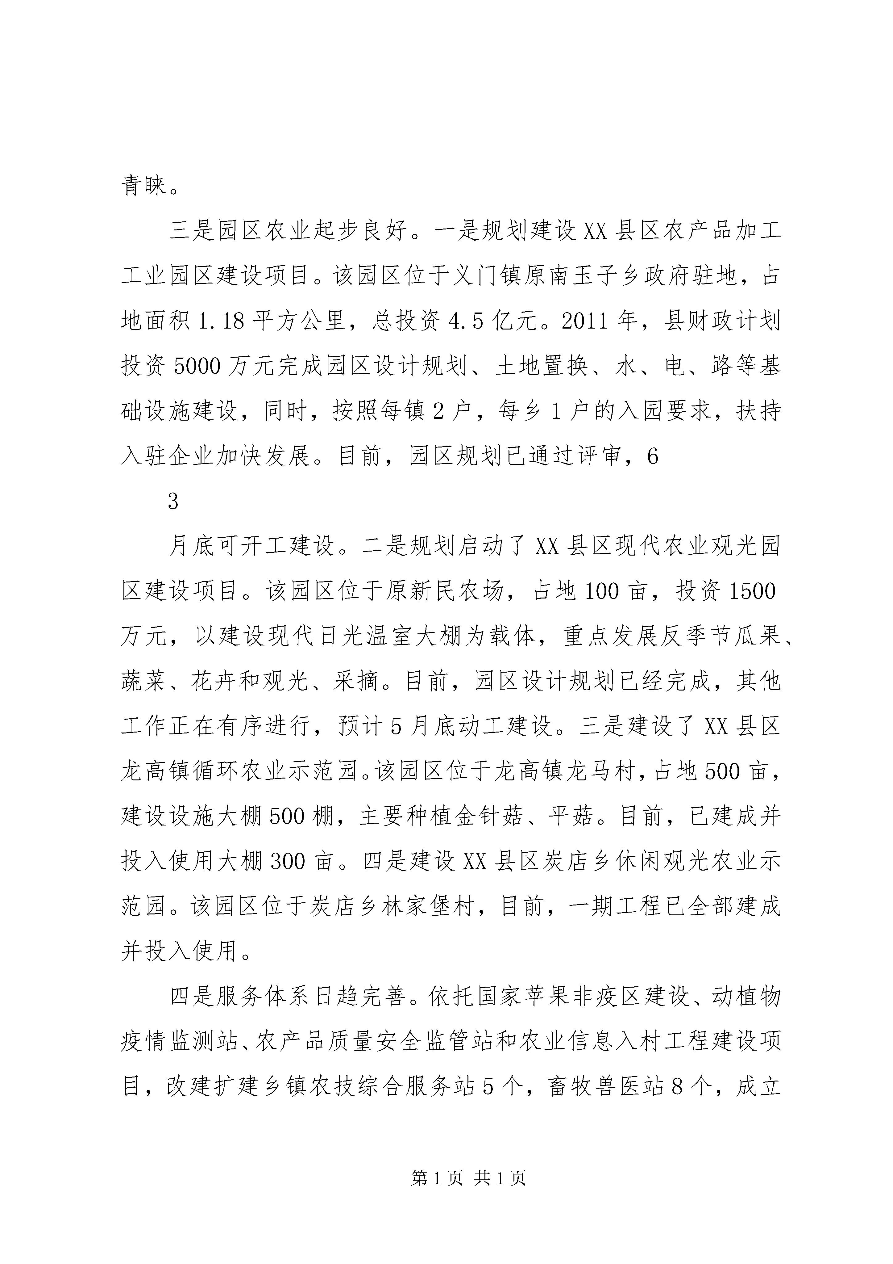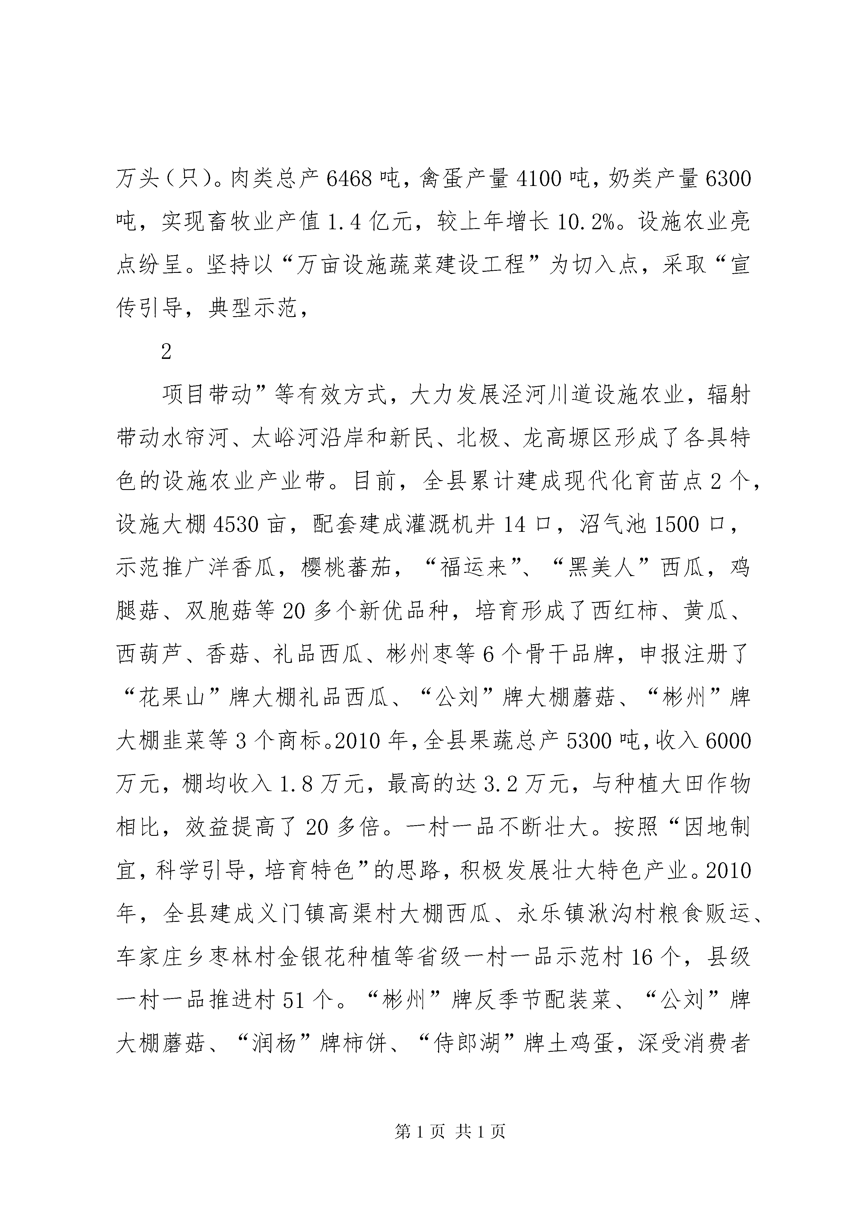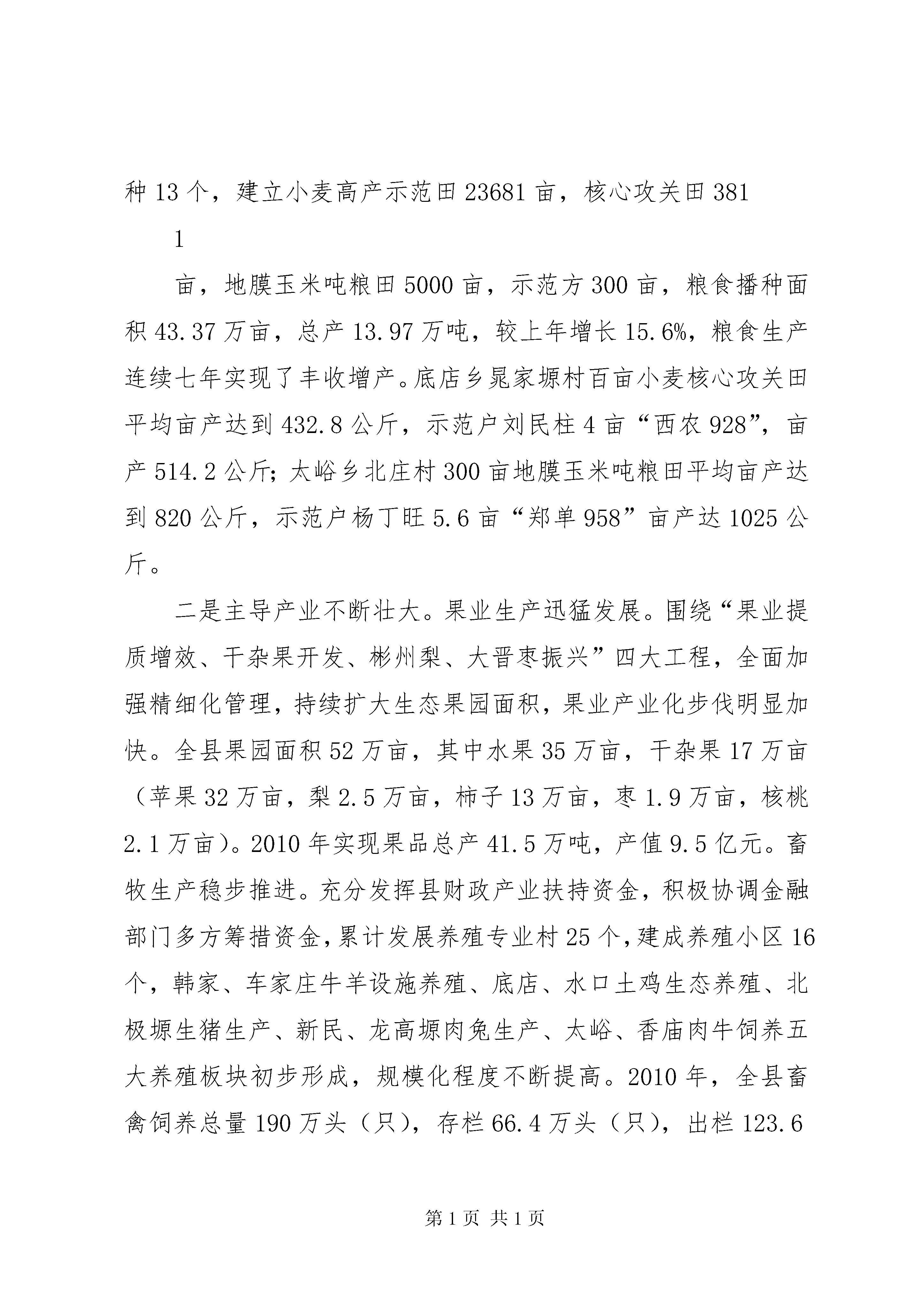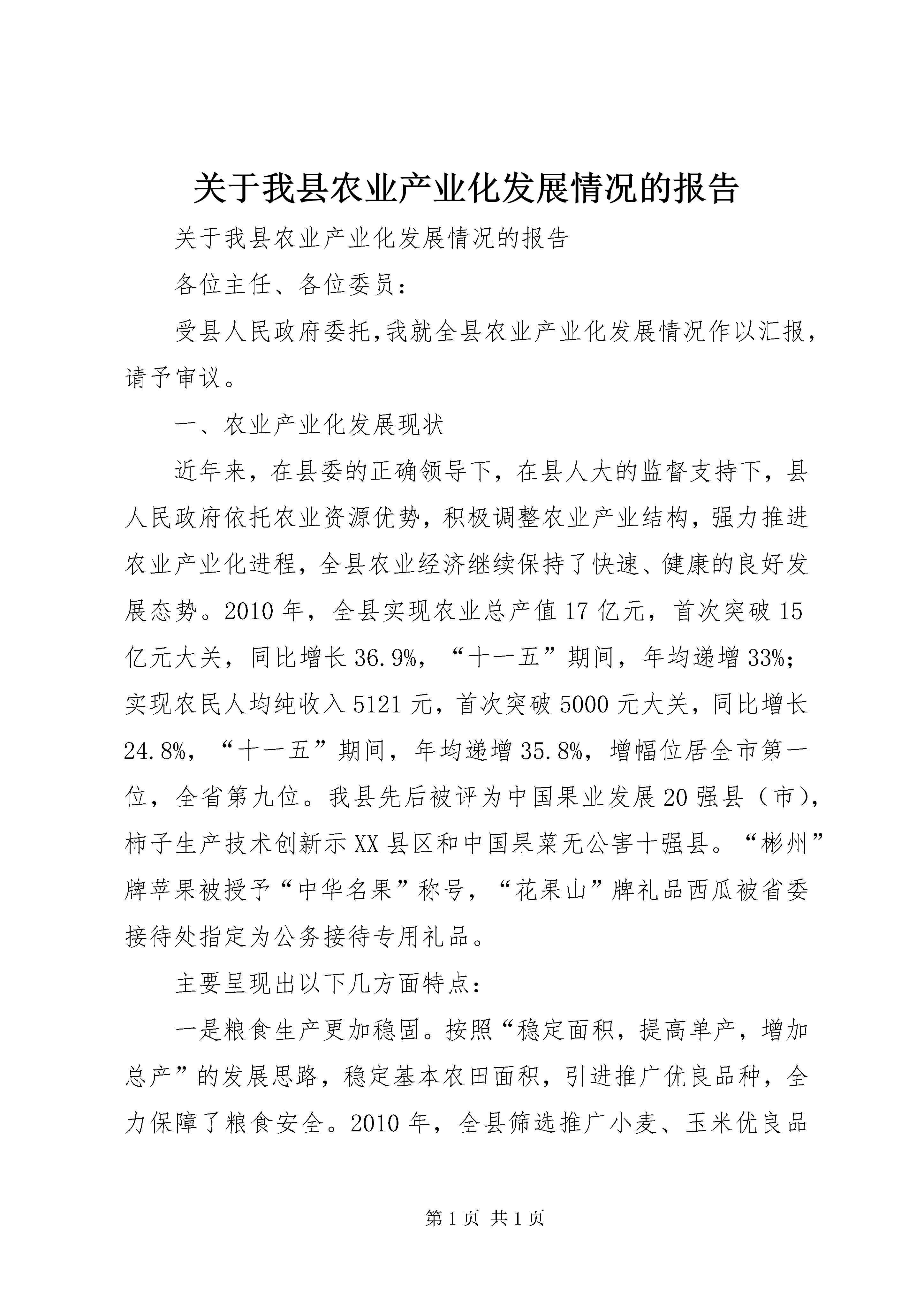 关于我县农业产业化发展情况的报告关于我县农业产业化发展情况的报告各位主任、各位委员:受县人民政府委托,我就全县农业产业化发展情况作以汇报,请予审议。一、农业产业化发展现状近年来,在县委的正确领导下,在县人大的监督支持下,县人民政府依托农业资源优势,积极调整农业产业结构,强力推进农业产业化进程,全县农业经济继续保持了快速、健康的良好发展态势。2010年,全县实现农业总产值17亿元,首次突破15亿元大关,同比增长36.9%,“十一五”期间,年均递增33%;实现农民人均纯收入5121元,首次突破5000元大关,同比增长24.8%,“十一五”期间,年均递增35.8%,增幅位居全市第一位,全省第九位。我县先后被评为中国果业发展20强县(市),柿子生产技术创新示XX县区和中国果菜无公害十强县。“彬州”牌苹果被授予“中华名果”称号,“花果山”牌礼品西瓜被省委接待处指定为公务接待专用礼品。主要呈现出以下几方面特点:一是粮食生产更加稳固。按照“稳定面积,提高单产,增加总产”的发展思路,稳定基本农田面积,引进推广优良品种,全力保障了粮食安全。2010年,全县筛选推广小麦、玉米优良品种13个,建立小麦高产示范田23681亩,核心攻关田3811亩,地膜玉米吨粮田5000亩,示范方300亩,粮食播种面积43.37万亩,总产13.97万吨,较上年增长15.6%,粮食生产连续七年实现了丰收增产。底店乡晁家塬村百亩小麦核心攻关田平均亩产达到432.8公斤,示范户刘民柱4亩“西农928”,亩产514.2公斤;太峪乡北庄村300亩地膜玉米吨粮田平均亩产达到820公斤,示范户杨丁旺5.6亩“郑单958”亩产达1025公斤。二是主导产业不断壮大。果业生产迅猛发展。围绕“果业提质增效、干杂果开发、彬州梨、大晋枣振兴”四大工程,全面加强精细化管理,持续扩大生态果园面积,果业产业化步伐明显加快。全县果园面积52万亩,其中水果35万亩,干杂果17万亩(苹果32万亩,梨2.5万亩,柿子13万亩,枣1.9万亩,核桃2.1万亩)。2010年实现果品总产41.5万吨,产值9.5亿元。畜牧生产稳步推进。充分发挥县财政产业扶持资金,积极协调金融部门多方筹措资金,累计发展养殖专业村25个,建成养殖小区16个,韩家、车家庄牛羊设施养殖、底店、水口土鸡生态养殖、北极塬生猪生产、新民、龙高塬肉兔生产、太峪、香庙肉牛饲养五大养殖板块初步形成,规模化程度不断提高。2010年,全县畜禽饲养总量190万头(只),存栏66.4万头(只),出栏123.6万头(只)。肉类总产6468吨,禽蛋产量4100吨,奶类产量6300吨,实现畜牧业产值1.4亿元,较上年增长10.2%。设施农业亮点纷呈。坚持以“万亩设施蔬菜建设工程”为切入点,采取“宣传引导,典型示范,2项目带动”等有效方式,大力发展泾河川道设施农业,辐射带动水帘河、太峪河沿岸和新民、北极、龙高塬区形成了各具特色的设施农业产业带。目前,全县累计建成现代化育苗点2个,设施大棚4530亩,配套建成灌溉机井14口,沼气池1500口,示范推广洋香瓜,樱桃蕃茄,“福运来”、“黑美人”西瓜,鸡腿菇、双胞菇等20多个新优品种,培育形成了西红柿、黄瓜、西葫芦、香菇、礼品西瓜、彬州枣等6个骨干品牌,申报注册了“花果山”牌大棚礼品西瓜、“公刘”牌大棚蘑菇、“彬州”牌大棚韭菜等3个商标。2010年,全县果蔬总产5300吨,收入6000万元,棚均收入1.8万元,最高的达3.2万元,与种植大田作物相比,效益提高了20多倍。一村一品不断壮大。按照“因地制宜,科学引导,培育特色”的思路,积极发展壮大特色产业。2010年,全县建成义门镇高渠村大棚西瓜、永乐镇湫沟村粮食贩运、车家庄乡枣林村金银花种植等省级一村一品示范村16个,县级一村一品推进村51个。“彬州”牌反季节配装菜、“公刘”牌大棚蘑菇、“润杨”牌柿饼、“侍郎湖”牌土鸡蛋,深受消费者青睐。三是园区农业起步良好。一是规划建设XX县区农产品加工工业园区建设项目。该园区位于义门镇原南玉子乡政府驻地,占地面积1.18平方公里,总投资4.5亿元。2011年,县财政计划投资5000万元完成园区设计规划、土地置换、水、电、路等基础设施建设,同时,按照每镇2户,每乡1户的入园要求,扶持入驻企业加快发展。目前,园区规划已通过评审,63月底可开工建设。二是规划启动了XX县区现代农业观光园区建设项目。该园区位于原新民农场,占地100亩,投资1500万元,以建设现代日光温室大棚为载体,重点发展反季节瓜果、蔬菜、花卉和观光、采摘。目前,园区设计规划已经完成,其他工作正在有序进行,预计5月底动工建设。三是建设了XX县区龙高镇循环农业示范园。该园区位于龙高镇龙马村,占地500亩,建设设施大棚500棚,主要种植金针菇、平菇。目前,已建成