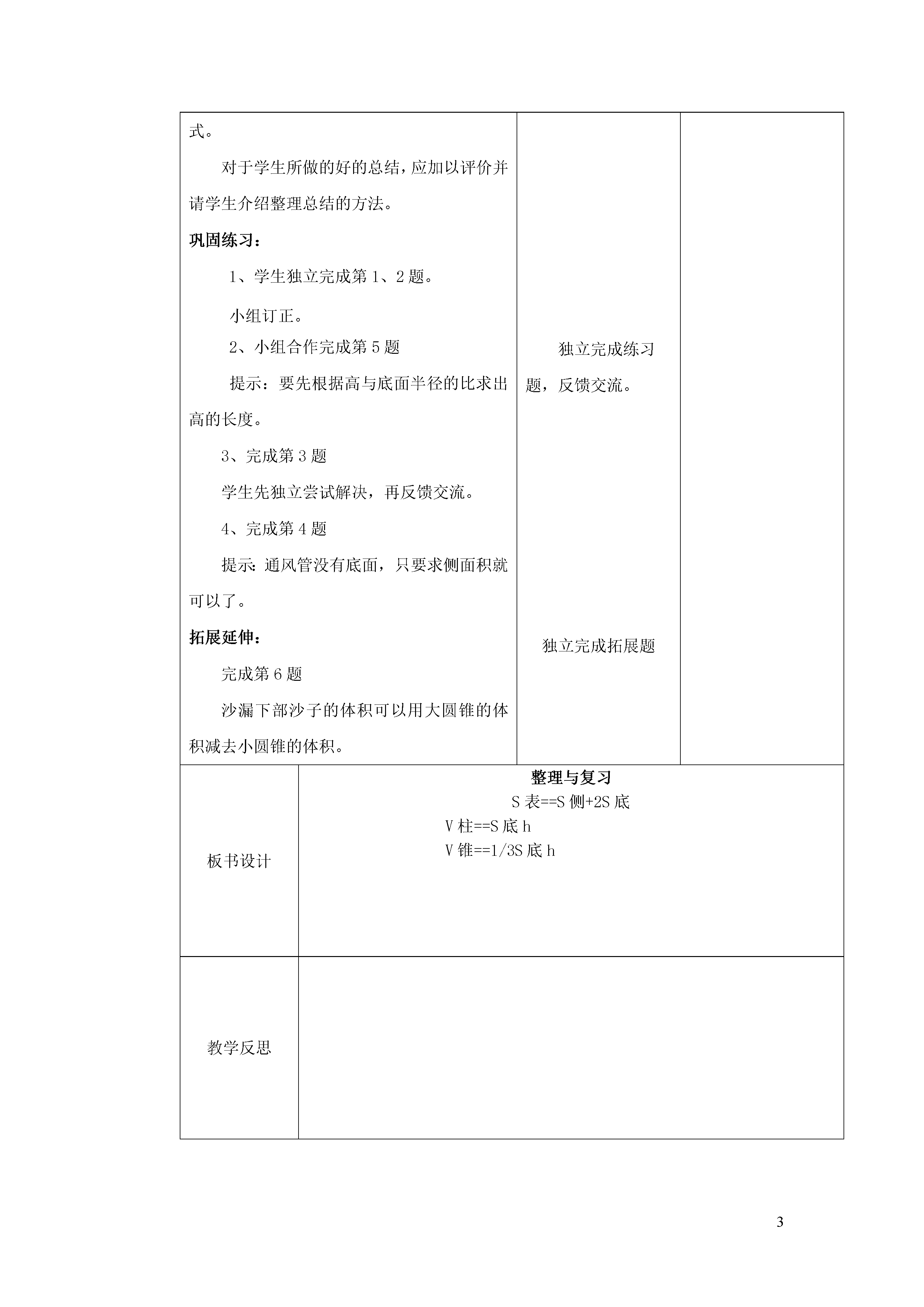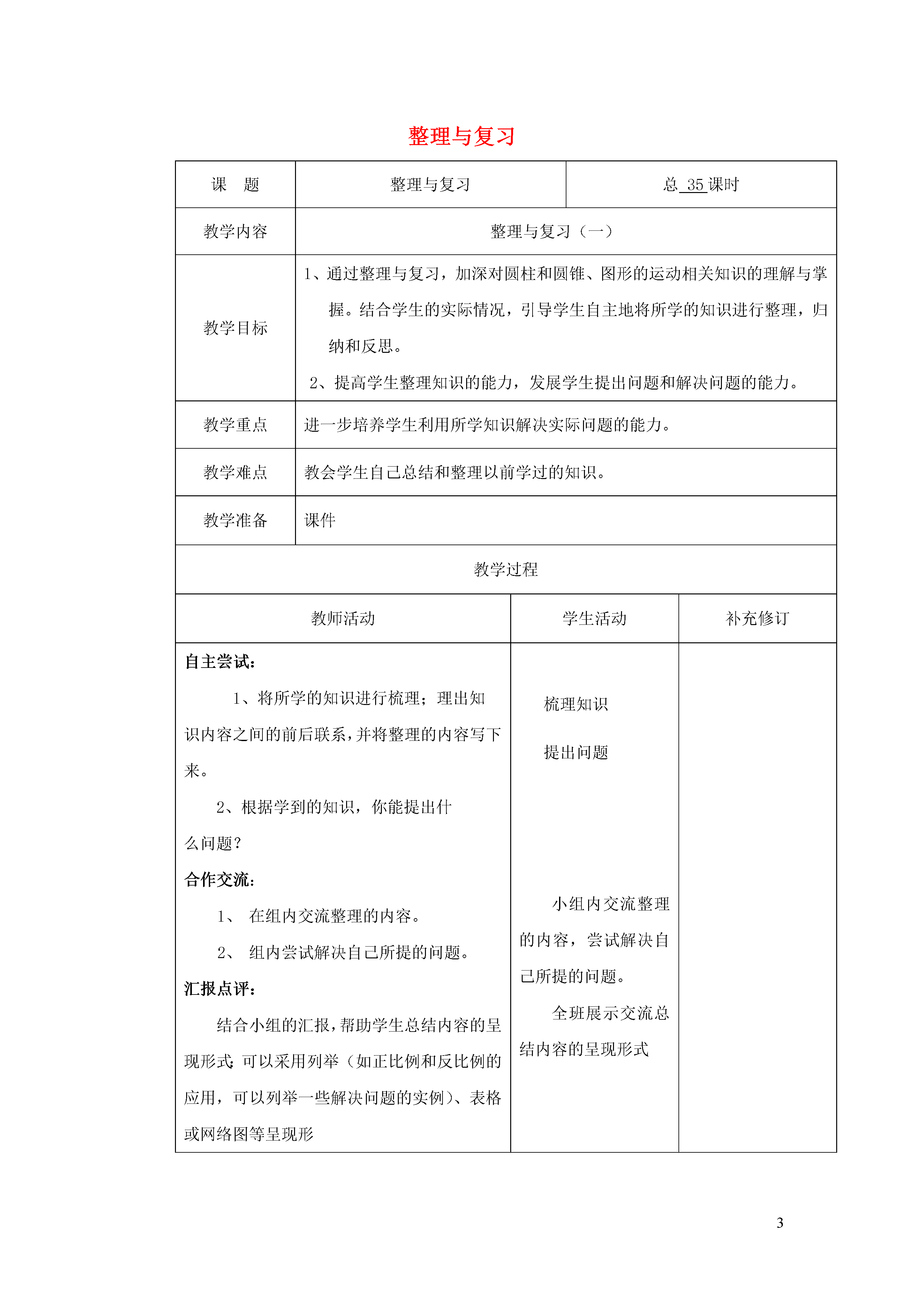 3整理与复习课题整理与复习总35课时教学内容整理与复习(一)教学目标1、通过整理与复习,加深对圆柱和圆锥、图形的运动相关知识的理解与掌握。结合学生的实际情况,引导学生自主地将所学的知识进行整理,归纳和反思。2、提高学生整理知识的能力,发展学生提出问题和解决问题的能力。教学重点进一步培养学生利用所学知识解决实际问题的能力。教学难点教会学生自己总结和整理以前学过的知识。教学准备课件教学过程教师活动学生活动补充修订自主尝试:1、将所学的知识进行梳理;理出知识内容之间的前后联系,并将整理的内容写下来。2、根据学到的知识,你能提出什么问题?合作交流:在组内交流整理的内容。组内尝试解决自己所提的问题。汇报点评:结合小组的汇报,帮助学生总结内容的呈现形式:可以采用列举(如正比例和反比例的应用,可以列举一些解决问题的实例)、表格或网络图等呈现形梳理知识提出问题小组内交流整理的内容,尝试解决自己所提的问题。全班展示交流总结内容的呈现形式式。对于学生所做的好的总结,应加以评价并请学生介绍整理总结的方法。巩固练习:1、学生独立完成第1、2题。小组订正。2、小组合作完成第5题提示:要先根据高与底面半径的比求出高的长度。3、完成第3题学生先独立尝试解决,再反馈交流。4、完成第4题提示:通风管没有底面,只要求侧面积就可以了。拓展延伸:完成第6题沙漏下部沙子的体积可以用大圆锥的体积减去小圆锥的体积。独立完成练习题,反馈交流。独立完成拓展题板书设计整理与复习S表==S侧+2S底V柱==S底hV锥==1/3S底h教学反思