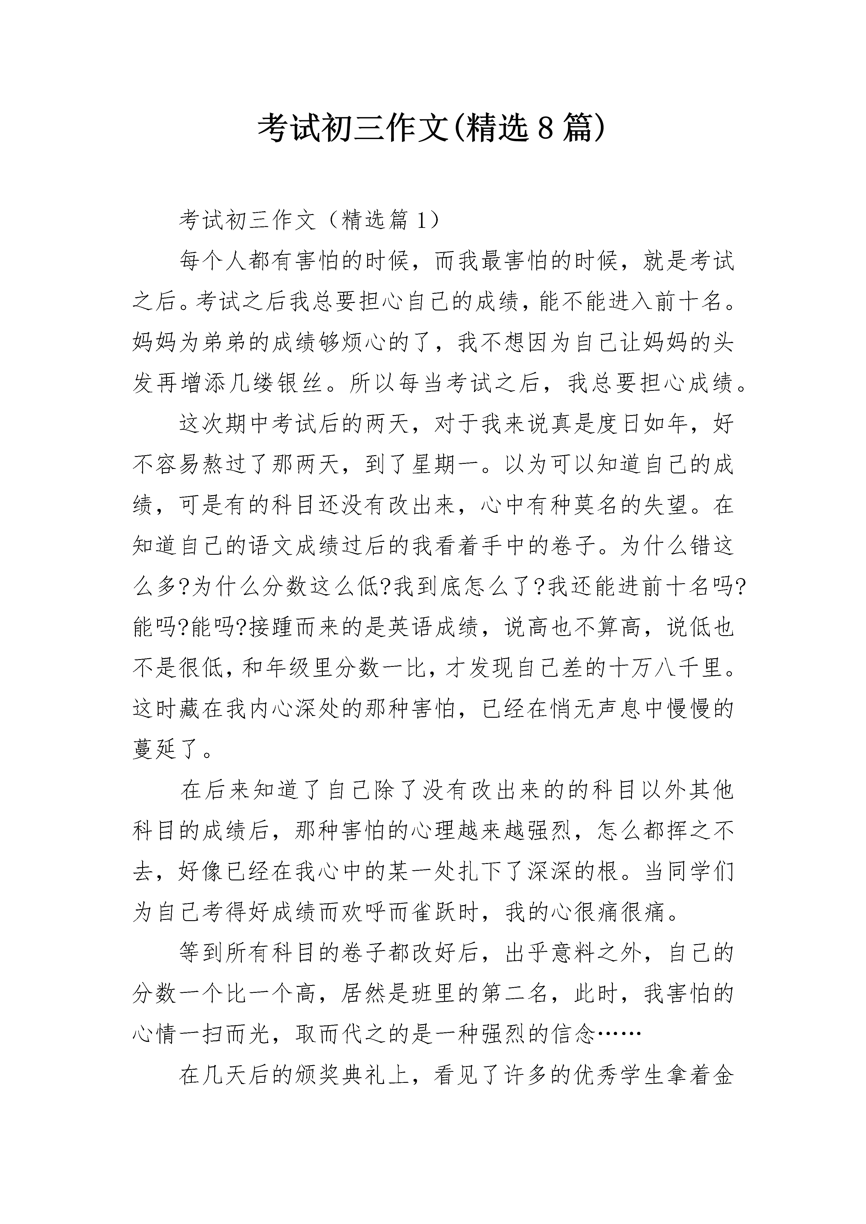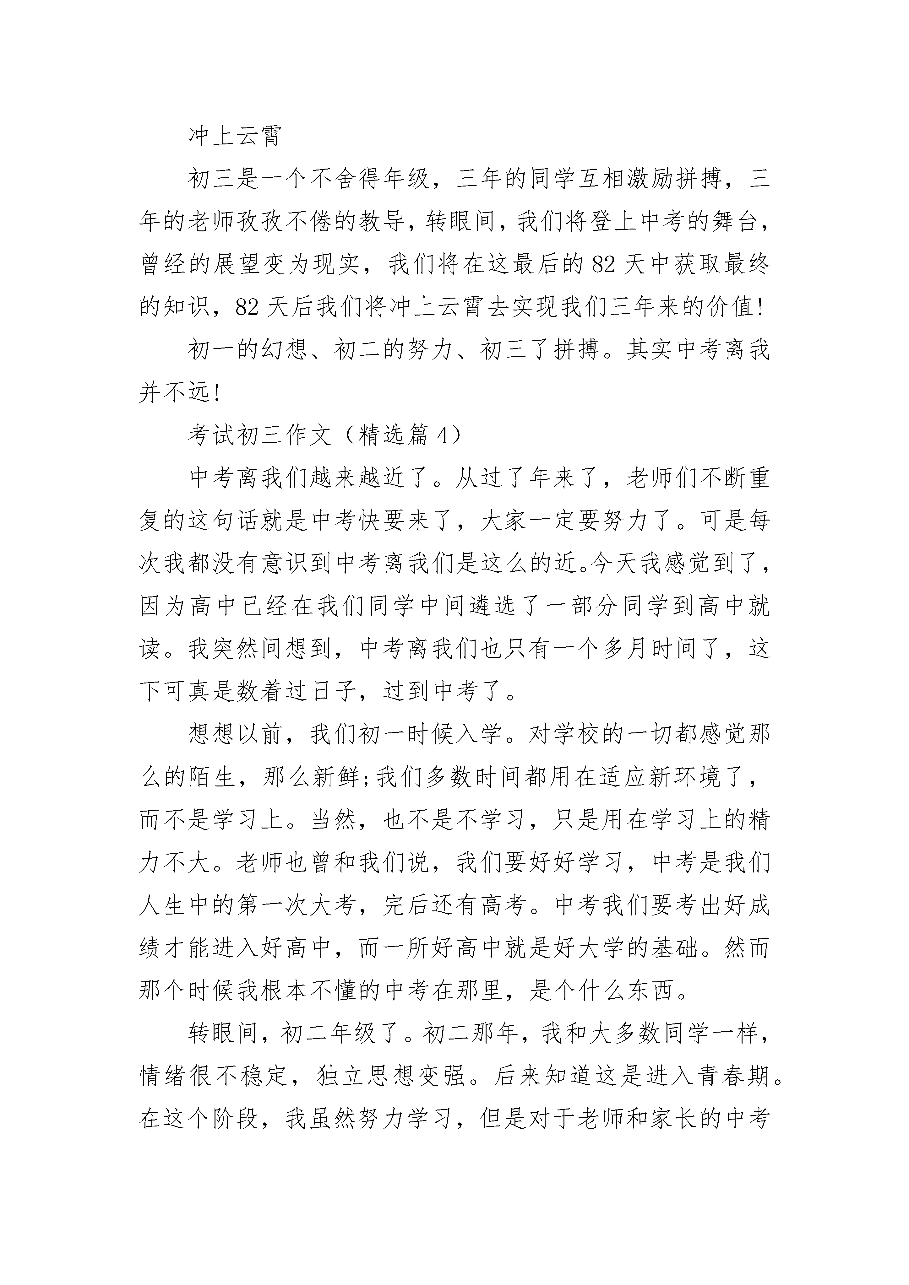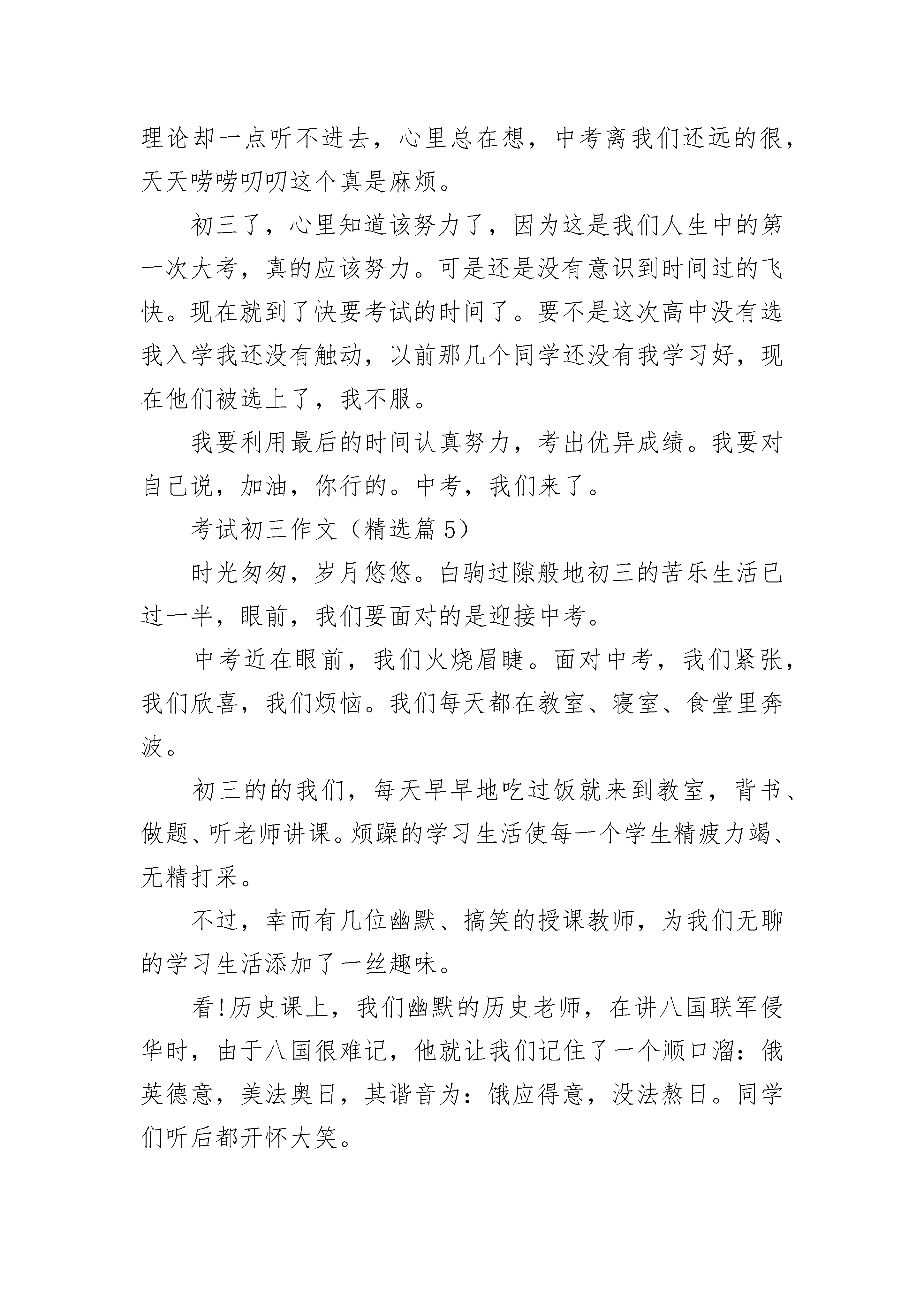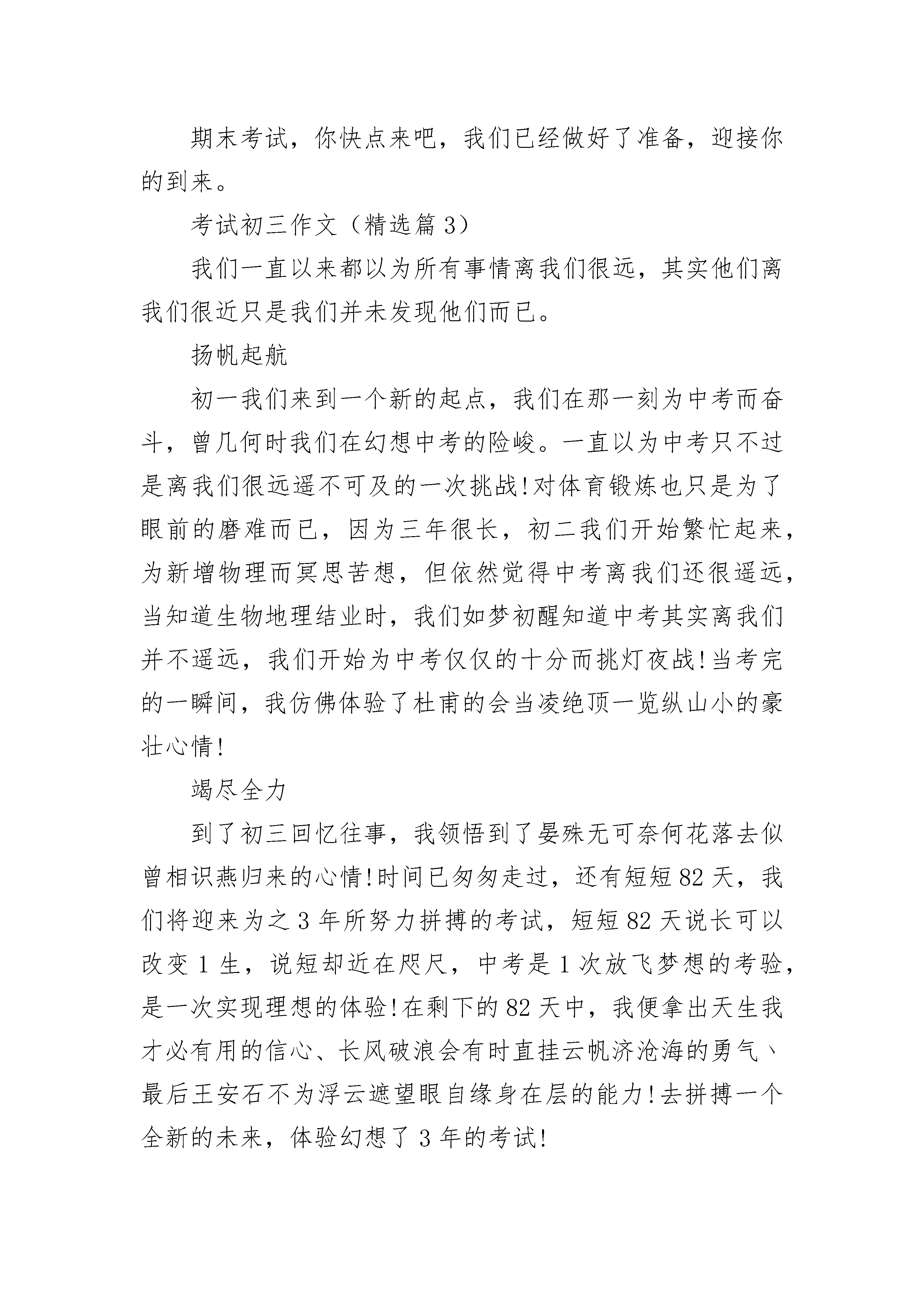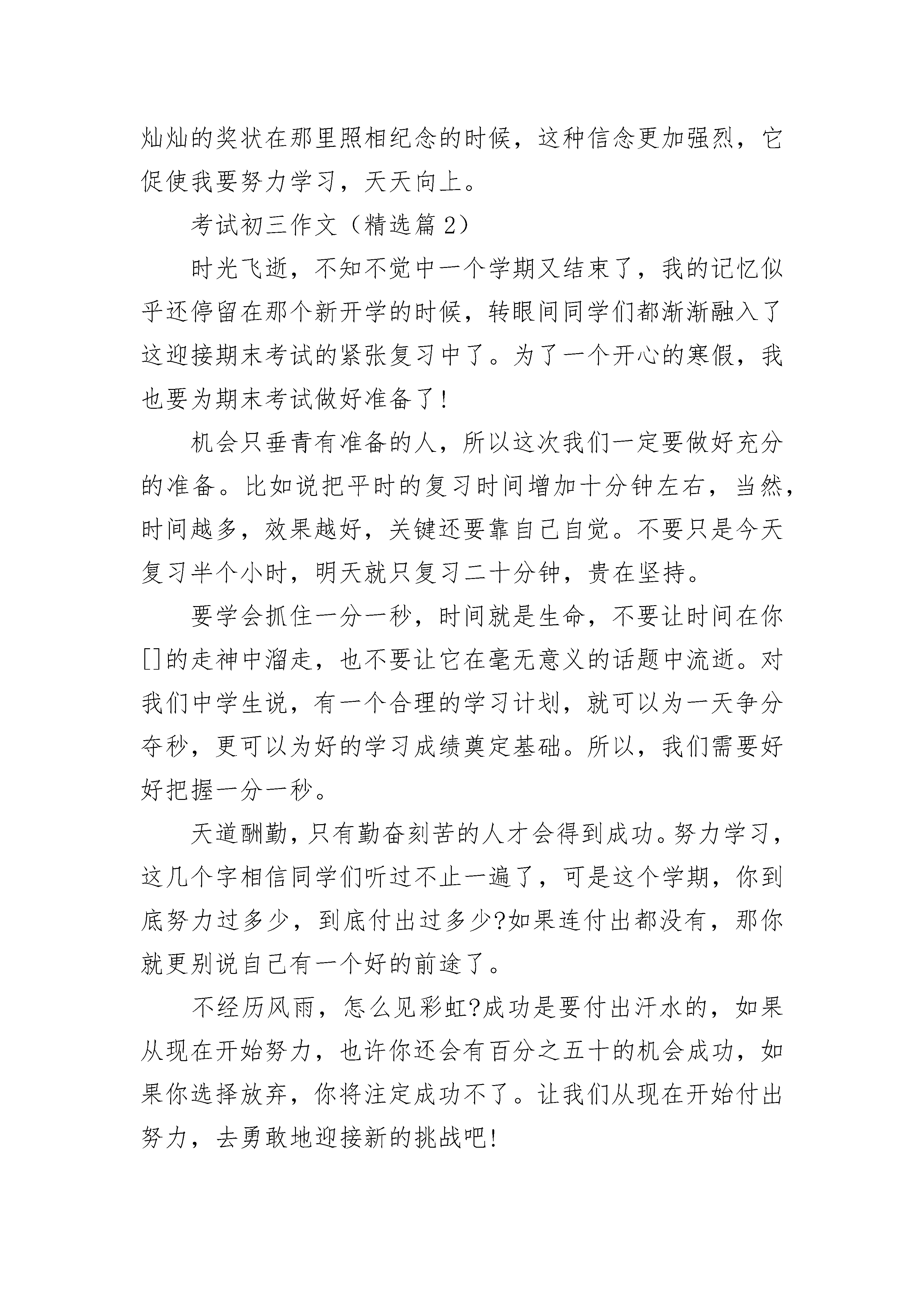 考试初三作文(精选8篇)考试初三作文(精选篇1)每个人都有害怕的时候,而我最害怕的时候,就是考试之后。考试之后我总要担心自己的成绩,能不能进入前十名。妈妈为弟弟的成绩够烦心的了,我不想因为自己让妈妈的头发再增添几缕银丝。所以每当考试之后,我总要担心成绩。这次期中考试后的两天,对于我来说真是度日如年,好不容易熬过了那两天,到了星期一。以为可以知道自己的成绩,可是有的科目还没有改出来,心中有种莫名的失望。在知道自己的语文成绩过后的我看着手中的卷子。为什么错这么多?为什么分数这么低?我到底怎么了?我还能进前十名吗?能吗?能吗?接踵而来的是英语成绩,说高也不算高,说低也不是很低,和年级里分数一比,才发现自己差的十万八千里。这时藏在我内心深处的那种害怕,已经在悄无声息中慢慢的蔓延了。在后来知道了自己除了没有改出来的的科目以外其他科目的成绩后,那种害怕的心理越来越强烈,怎么都挥之不去,好像已经在我心中的某一处扎下了深深的根。当同学们为自己考得好成绩而欢呼而雀跃时,我的心很痛很痛。等到所有科目的卷子都改好后,出乎意料之外,自己的分数一个比一个高,居然是班里的第二名,此时,我害怕的心情一扫而光,取而代之的是一种强烈的信念……在几天后的颁奖典礼上,看见了许多的优秀学生拿着金灿灿的奖状在那里照相纪念的时候,这种信念更加强烈,它促使我要努力学习,天天向上。考试初三作文(精选篇2)时光飞逝,不知不觉中一个学期又结束了,我的记忆似乎还停留在那个新开学的时候,转眼间同学们都渐渐融入了这迎接期末考试的紧张复习中了。为了一个开心的寒假,我也要为期末考试做好准备了!机会只垂青有准备的人,所以这次我们一定要做好充分的准备。比如说把平时的复习时间增加十分钟左右,当然,时间越多,效果越好,关键还要靠自己自觉。不要只是今天复习半个小时,明天就只复习二十分钟,贵在坚持。要学会抓住一分一秒,时间就是生命,不要让时间在你[]的走神中溜走,也不要让它在毫无意义的话题中流逝。对我们中学生说,有一个合理的学习计划,就可以为一天争分夺秒,更可以为好的学习成绩奠定基础。所以,我们需要好好把握一分一秒。天道酬勤,只有勤奋刻苦的人才会得到成功。努力学习,这几个字相信同学们听过不止一遍了,可是这个学期,你到底努力过多少,到底付出过多少?如果连付出都没有,那你就更别说自己有一个好的前途了。不经历风雨,怎么见彩虹?成功是要付出汗水的,如果从现在开始努力,也许你还会有百分之五十的机会成功,如果你选择放弃,你将注定成功不了。让我们从现在开始付出努力,去勇敢地迎接新的挑战吧!期末考试,你快点来吧,我们已经做好了准备,迎接你的到来。考试初三作文(精选篇3)我们一直以来都以为所有事情离我们很远,其实他们离我们很近只是我们并未发现他们而已。扬帆起航初一我们来到一个新的起点,我们在那一刻为中考而奋斗,曾几何时我们在幻想中考的险峻。一直以为中考只不过是离我们很远遥不可及的一次挑战!对体育锻炼也只是为了眼前的磨难而已,因为三年很长,初二我们开始繁忙起来,为新增物理而冥思苦想,但依然觉得中考离我们还很遥远,当知道生物地理结业时,我们如梦初醒知道中考其实离我们并不遥远,我们开始为中考仅仅的十分而挑灯夜战!当考完的一瞬间,我仿佛体验了杜甫的会当凌绝顶一览纵山小的豪壮心情!竭尽全力到了初三回忆往事,我领悟到了晏殊无可奈何花落去似曾相识燕归来的心情!时间已匆匆走过,还有短短82天,我们将迎来为之3年所努力拼搏的考试,短短82天说长可以改变1生,说短却近在咫尺,中考是1次放飞梦想的考验,是一次实现理想的体验!在剩下的82天中,我便拿出天生我才必有用的信心、长风破浪会有时直挂云帆济沧海的勇气丶最后王安石不为浮云遮望眼自缘身在层的能力!去拼搏一个全新的未来,体验幻想了3年的考试!冲上云霄初三是一个不舍得年级,三年的同学互相激励拼搏,三年的老师孜孜不倦的教导,转眼间,我们将登上中考的舞台,曾经的展望变为现实,我们将在这最后的82天中获取最终的知识,82天后我们将冲上云霄去实现我们三年来的价值!初一的幻想、初二的努力、初三了拼搏。其实中考离我并不远!考试初三作文(精选篇4)中考离我们越来越近了。从过了年来了,老师们不断重复的这句话就是中考快要来了,大家一定要努力了。可是每次我都没有意识到中考离我们是这么的近。今天我感觉到了,因为高中已经在我们同学中间遴选了一部分同学到高中就读。我突然间想到,中考离我们也只有一个多月时间了,这下可真是数着过日子,过到中考了。想想以前,我们初一时候入学。对学校的一切都感觉那么的陌生,那么新鲜;我们多数时间都用在适应新环境了,而不是学习上。当然,也不是不学习,只是用在学习上的精力不大。老师也曾和我们说,我们要好好学习,中考是我们人生中的第一次大考,完后还有高考。中考我们要考出好成绩才能进入好高中,而
