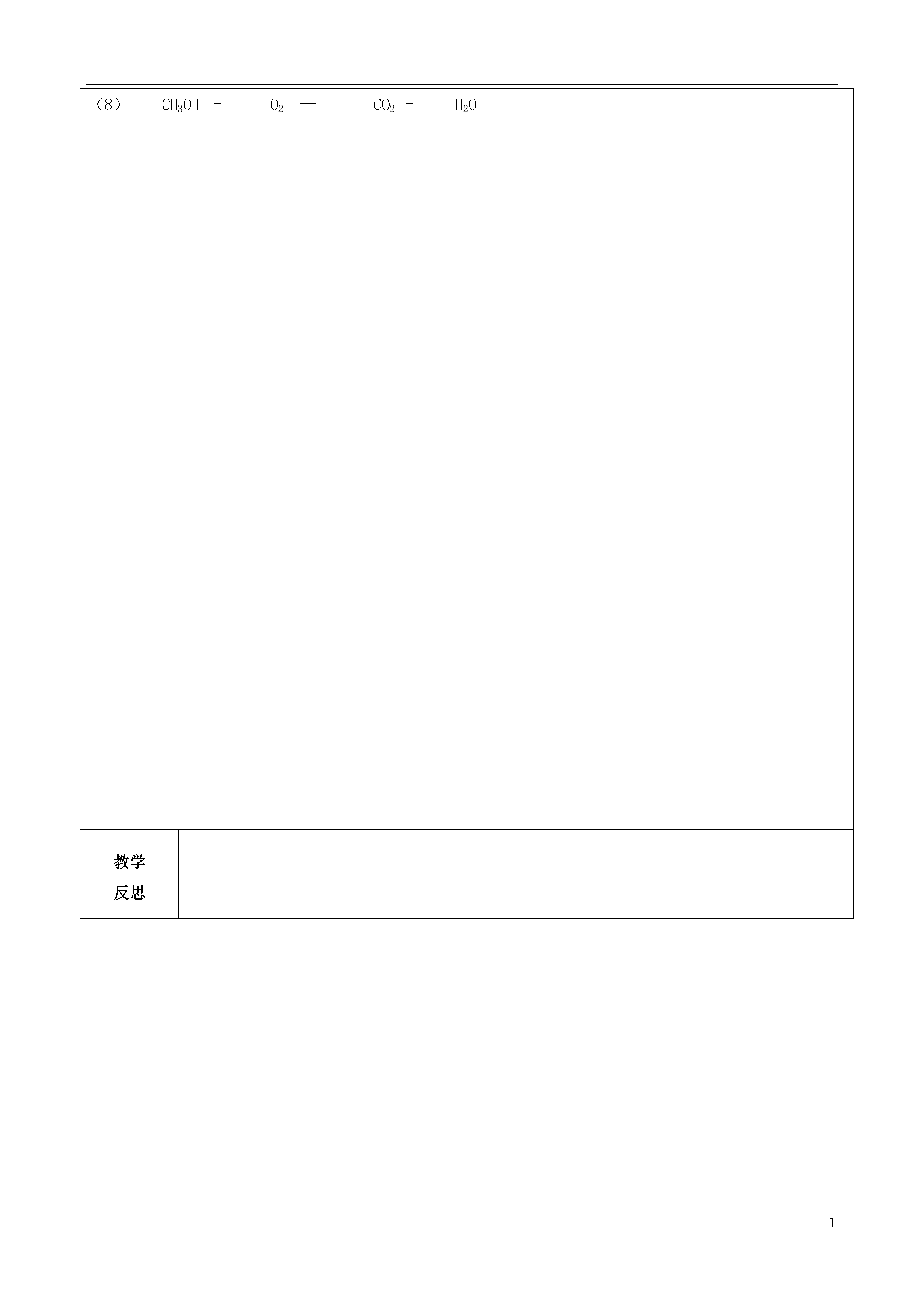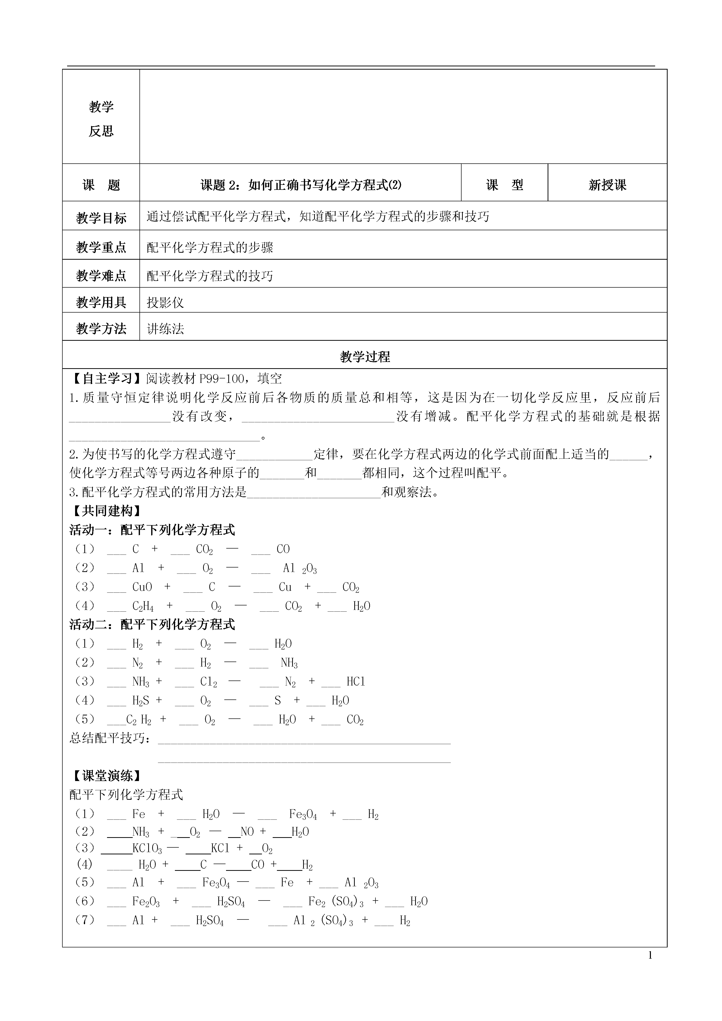 1课题2:如何正确书写化学方程式课题课题2:如何正确书写化学方程式⑴课型新授课教学目标1.理解书写化学方程式要遵循的原则,并尝试书写;2.通过合作讨论、、指错纠错等方法,知道正确书写化学方程式的步骤和注意事项,掌握配平化学方程式的常用方法。教学重点正确书写化学方程式教学难点配平化学方程式的技巧教学用具多媒体课件教学方法讲练法教学过程[复习提问]以“C+O2CO2”为例,说明化学方程式有哪些意义?[讲授新课]一、讲解书写化学方程式应遵守的原则1、要以客观事实为基础;2、要遵守质量守恒定律。如:2H2+O2H2O2H2O2H2↑+O2↑二、讲解书写化学方程式的步骤以磷在空气中燃烧生成五氧化二磷的反应为例。1、写出反应物和生成物的化学式。反应物写在左边,生成物写在右边,反应物和生成物之间划一条短条。P+O2—P2O52、配平化学方程式,使方程式左右两边各种原子的数目相等。4P+5O—2P2O53、标出反应条件和生成物的状态。4P+5O2P2O强调:当反应物中没有气体参加反应,而生成物有气体生成时,在生成的气体化学式的右边标出气体符号“↑”;同样,在溶液中进行的反应,如果反应物没有固体参加反应,而生成物有沉淀生成时,在生成的沉淀物化学式的右边标出沉淀符号“↓”。4、把短线改为等号4P+5O2P2O[课堂小结]书写化学方程式的原则和步骤。教学反思课题课题2:如何正确书写化学方程式⑵课型新授课教学目标通过偿试配平化学方程式,知道配平化学方程式的步骤和技巧教学重点配平化学方程式的步骤教学难点配平化学方程式的技巧教学用具投影仪教学方法讲练法教学过程【自主学习】阅读教材P99-100,填空1.质量守恒定律说明化学反应前后各物质的质量总和相等,这是因为在一切化学反应里,反应前后________________没有改变,________________________没有增减。配平化学方程式的基础就是根据______________________________。2.为使书写的化学方程式遵守____________定律,要在化学方程式两边的化学式前面配上适当的______,使化学方程式等号两边各种原子的_______和_______都相同,这个过程叫配平。3.配平化学方程式的常用方法是_____________________和观察法。【共同建构】活动一:配平下列化学方程式(1)___C+___CO2—___CO(2)___Al+___O2—___Al2O3(3)___CuO+___C—___Cu+___CO2(4)___C2H4+___O2—___CO2+___H2O活动二:配平下列化学方程式(1)___H2+___O2—___H2O(2)___N2+___H2—___NH3(3)___NH3+___Cl2—___N2+___HCl(4)___H2S+___O2—___S+___H2O(5)___C2H2+___O2—___H2O+___CO2总结配平技巧:____________________________________________________________________________________________【课堂演练】配平下列化学方程式(1)___Fe+___H2O—___Fe3O4+___H2(2)_NH3+_O2—NO+H2O(3)_KClO3—KCl+O2(4)____H2O+C—CO+H2(5)___Al+___Fe3O4—___Fe+___Al2O3(6)___Fe2O3+___H2SO4—___Fe2(SO4)3+___H2O(7)___Al+___H2SO4—___Al2(SO4)3+___H2(8)___CH3OH+___O2—___CO2+___H2O教学反思