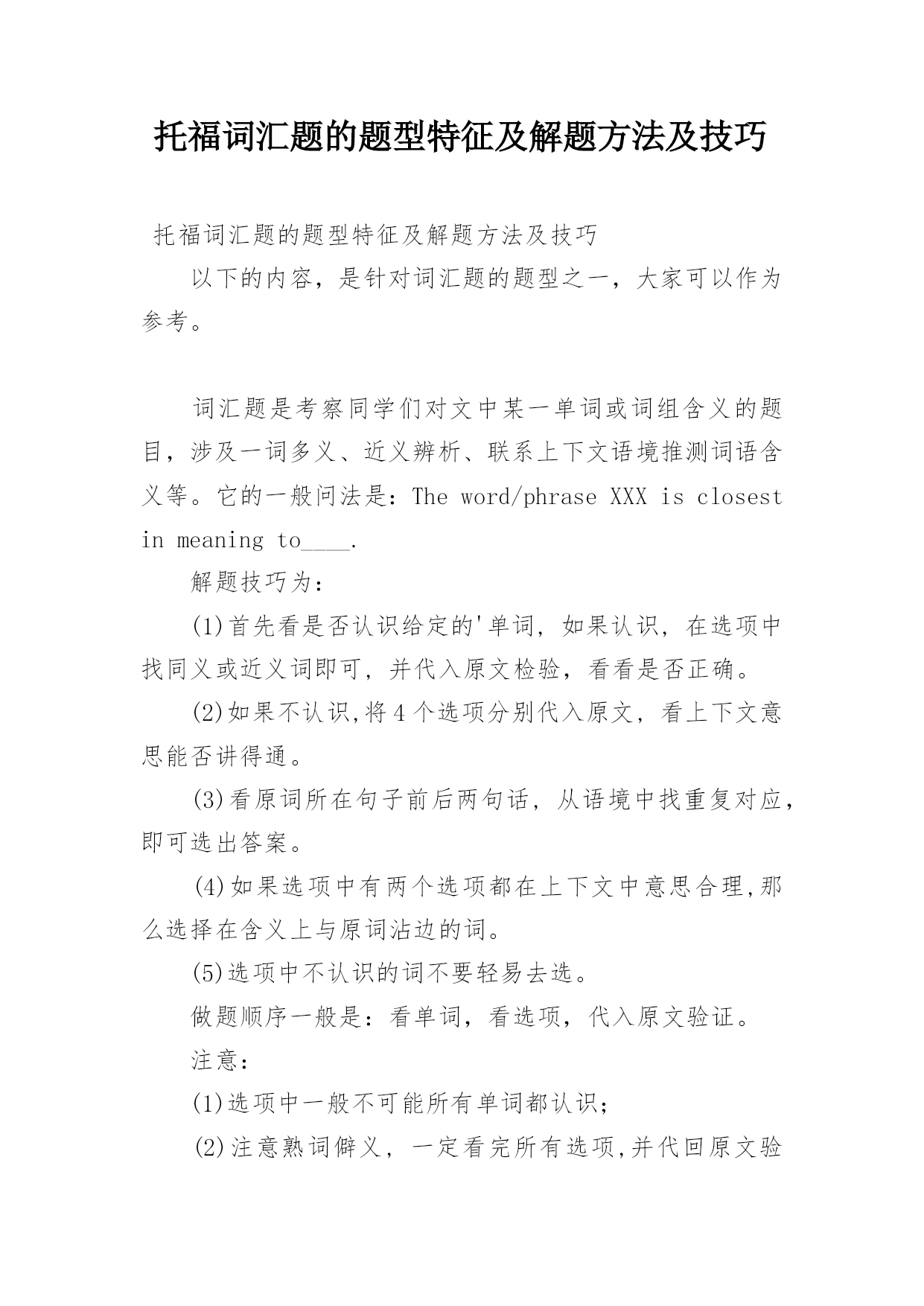 托福词汇题的题型特征及解题方法及技巧托福词汇题的题型特征及解题方法及技巧以下的内容,是针对词汇题的题型之一,大家可以作为参考。词汇题是考察同学们对文中某一单词或词组含义的题目,涉及一词多义、近义辨析、联系上下文语境推测词语含义等。它的一般问法是:Theword/phraseXXXisclosestinmeaningto____.解题技巧为:(1)首先看是否认识给定的'单词,如果认识,在选项中找同义或近义词即可,并代入原文检验,看看是否正确。(2)如果不认识,将4个选项分别代入原文,看上下文意思能否讲得通。