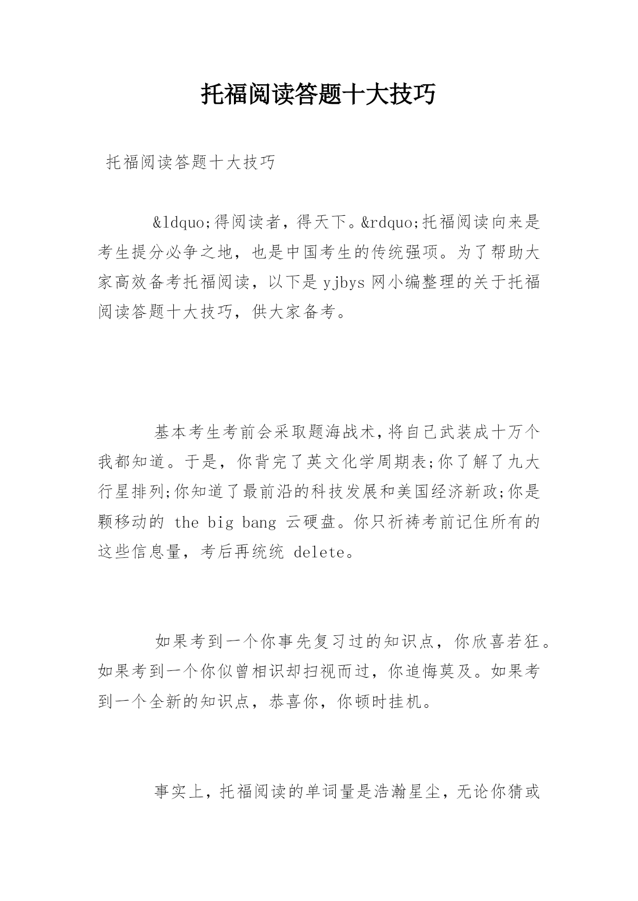 托福阅读答题十大技巧托福阅读答题十大技巧“得阅读者,得天下。”托福阅读向来是考生提分必争之地,也是中国考生的传统强项。为了帮助大家高效备考托福阅读,以下是yjbys网小编整理的关于托福阅读答题十大技巧,供大家备考。基本考生考前会采取题海战术,将自己武装成十万个我都知道。于是,你背完了英文化学周期表;你了解了九大行星排列;你知道了最前沿的科技发展和美国经济新政;你是颗移动的thebigbang云硬盘。你只祈祷考前记住所有的这些信息量,考后再统统delete。如果考到一个你事先复习过的