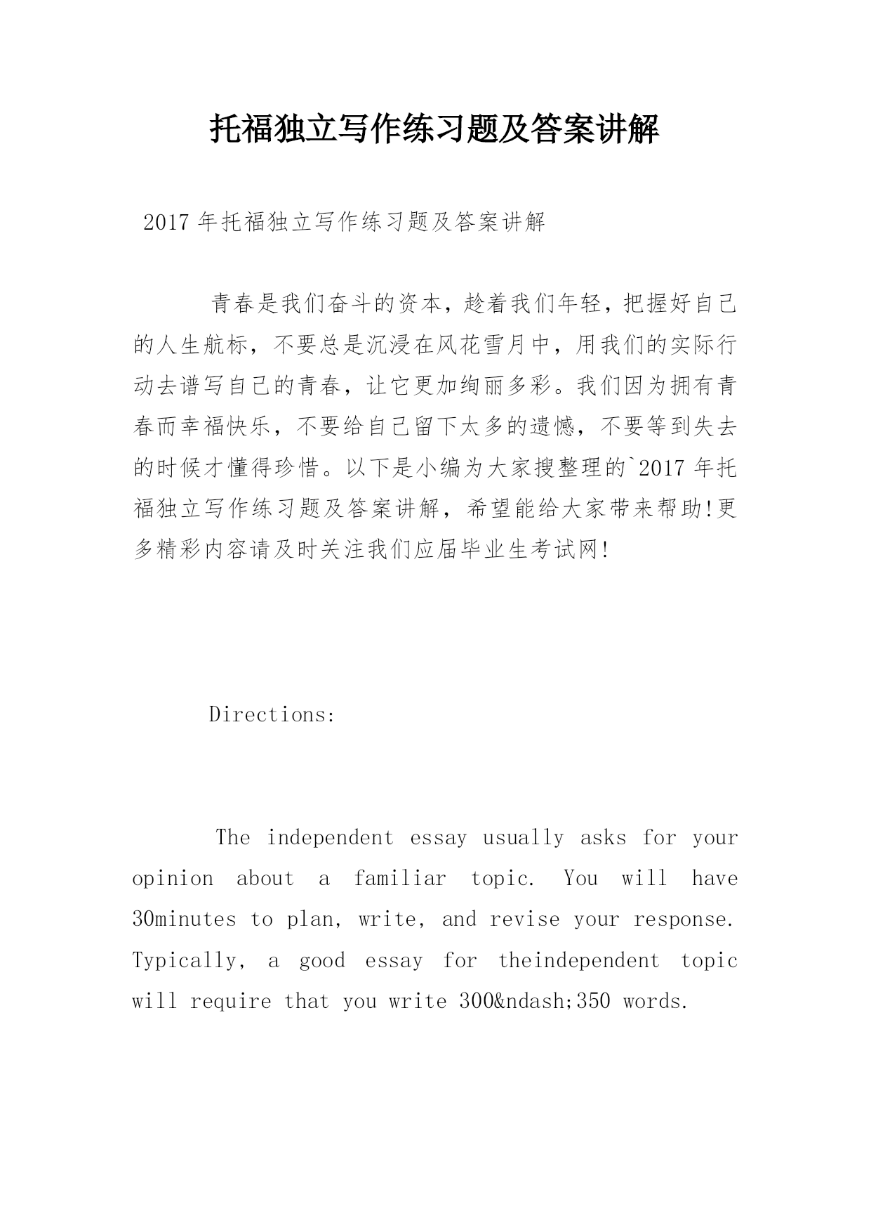托福独立写作练习题及答案讲解2017年托福独立写作练习题及答案讲解青春是我们奋斗的资本,趁着我们年轻,把握好自己的人生航标,不要总是沉浸在风花雪月中,用我们的实际行动去谱写自己的青春,让它更加绚丽多彩。我们因为拥有青春而幸福快乐,不要给自己留下太多的遗憾,不要等到失去的时候才懂得珍惜。以下是小编为大家搜整理的`2017年托福独立写作练习题及答案讲解,希望能给大家带来帮助!更多精彩内容请及时关注我们应届毕业生考试网!Directions:Theindependentessayusuallyasksforyo
